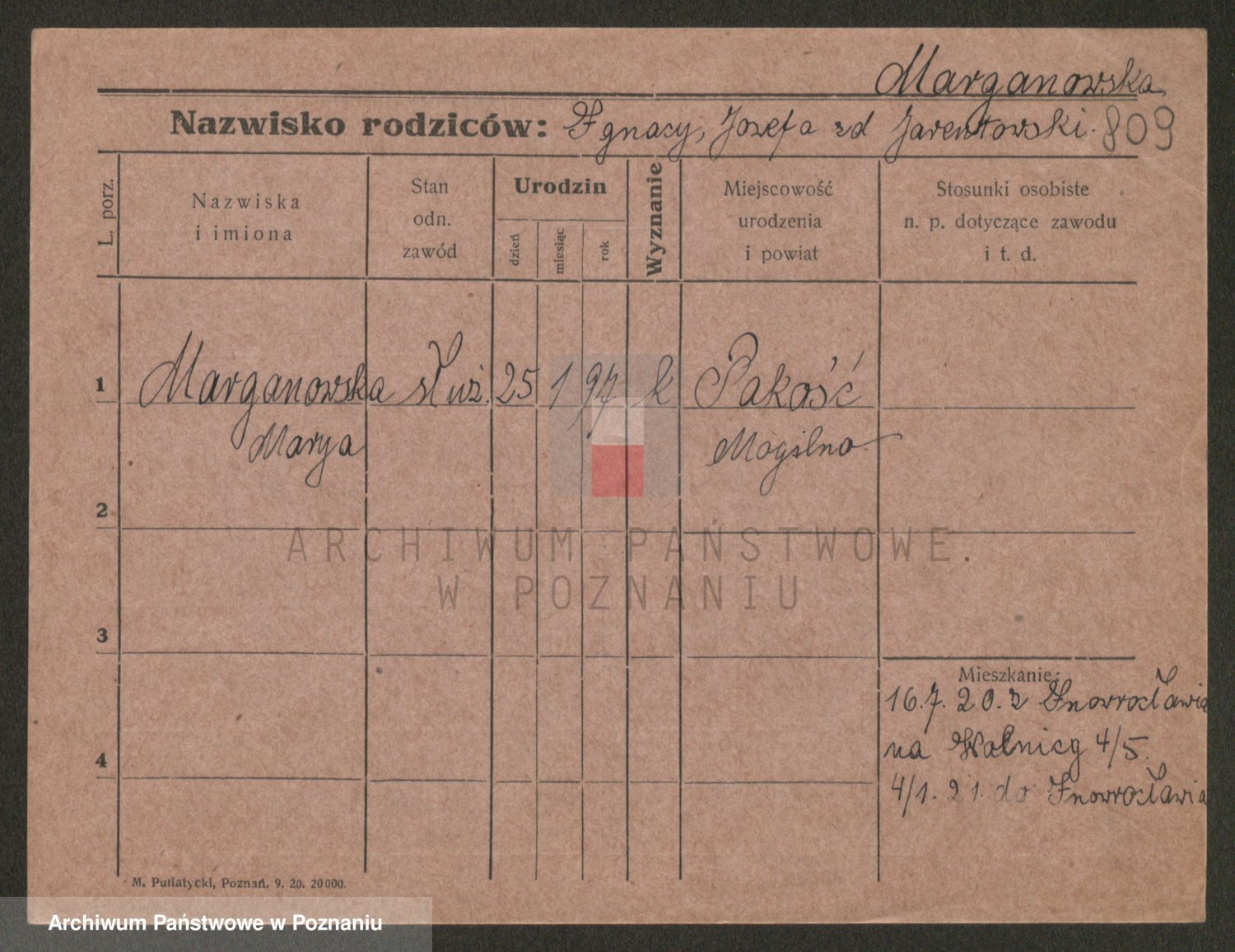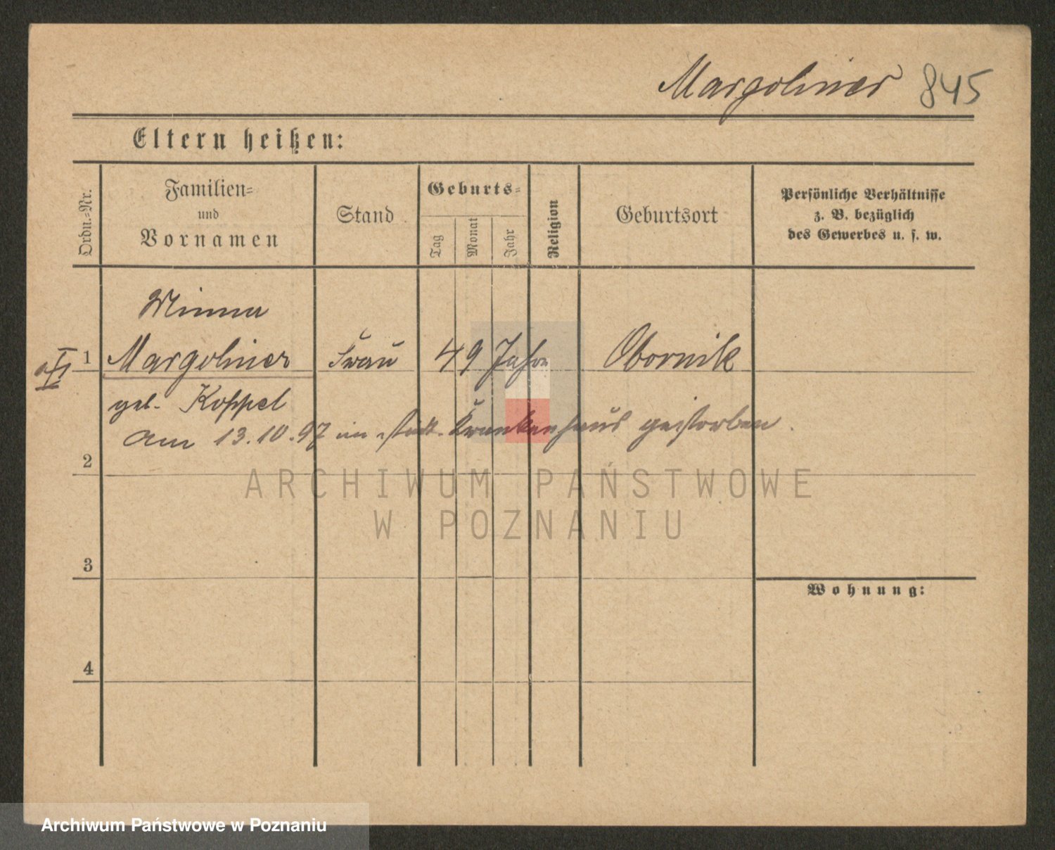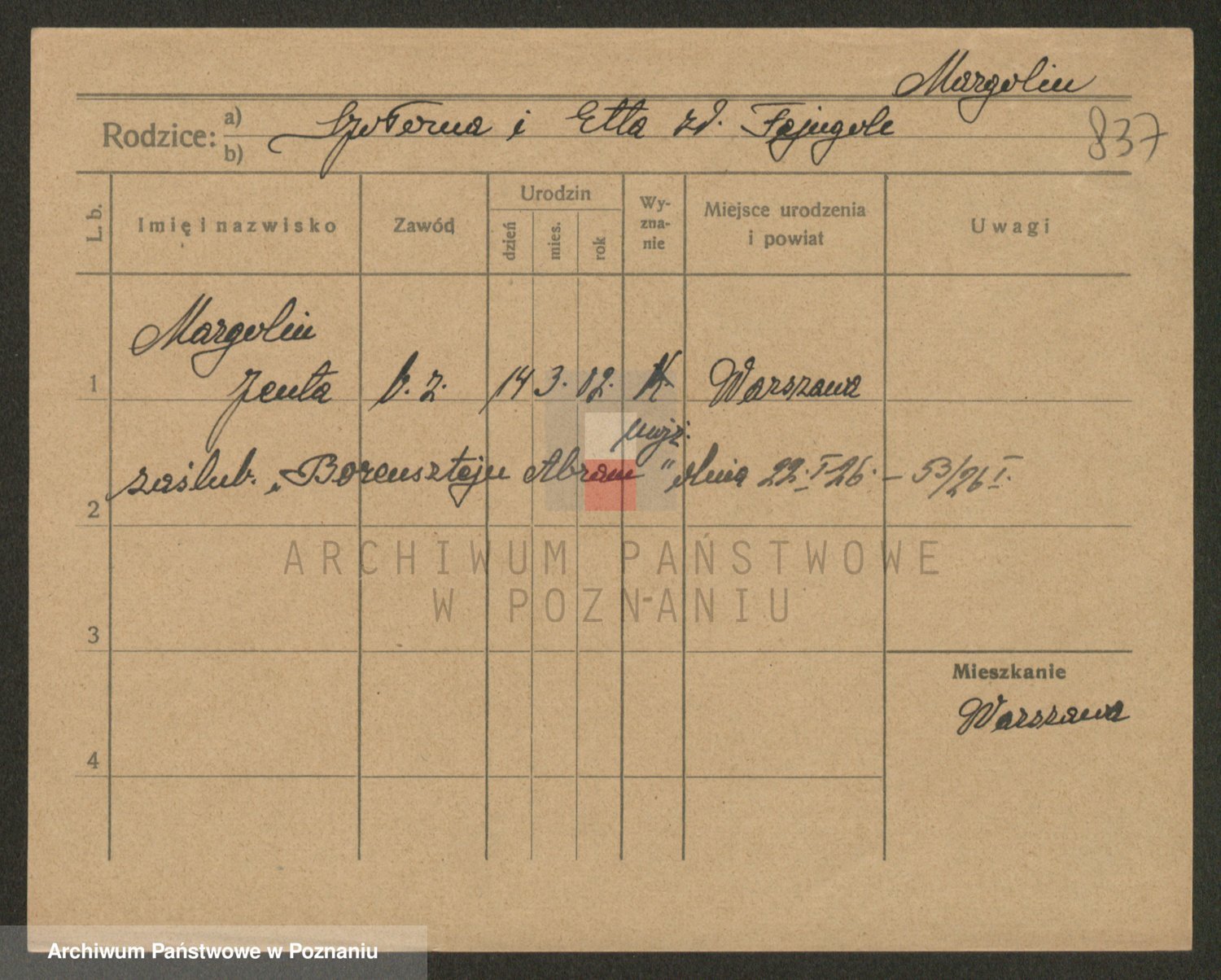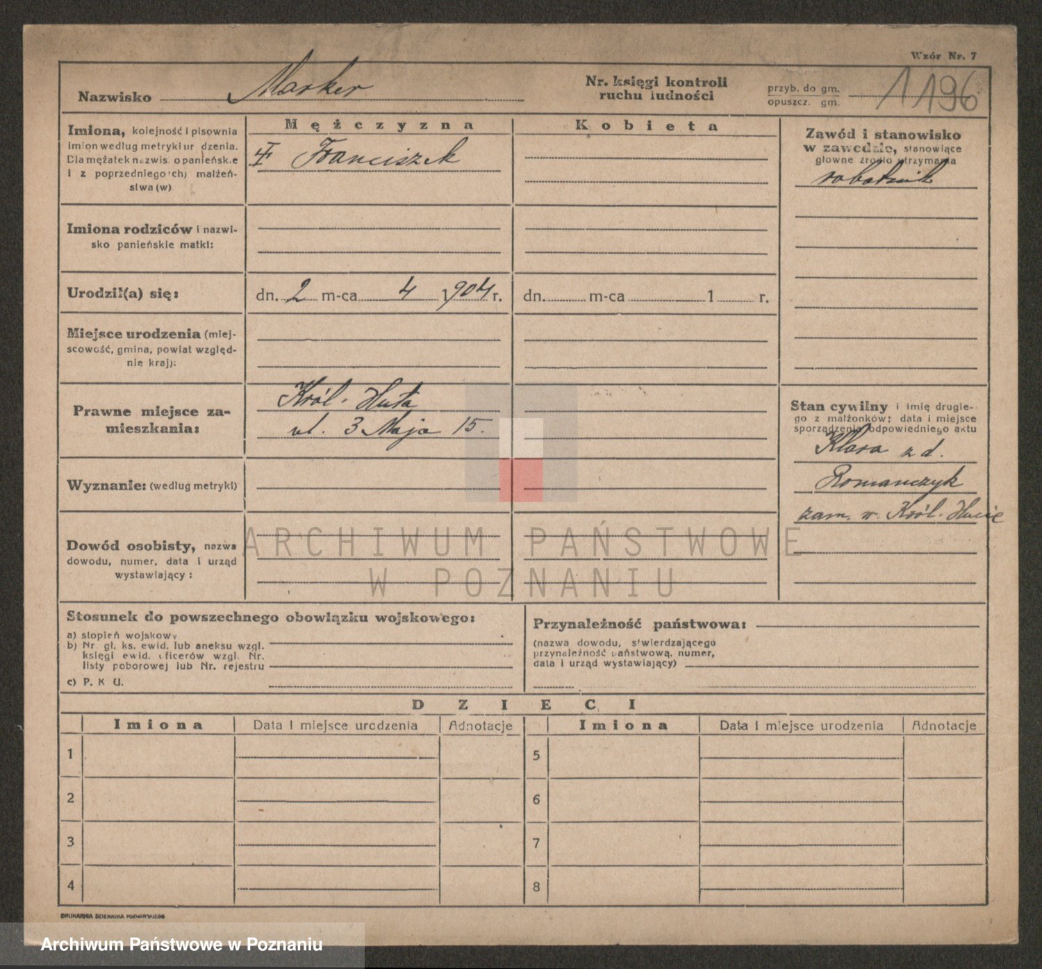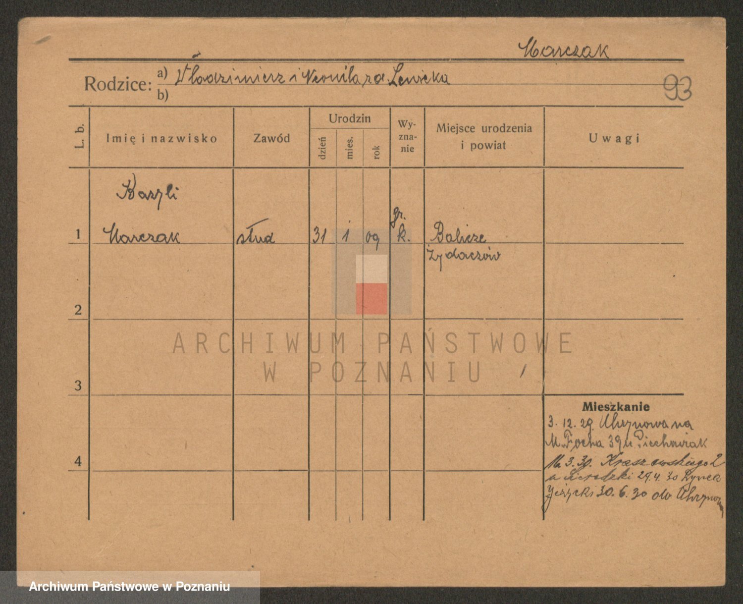 Podgląd karty osobowej dostępny jest po kliknięciu na nazwisko lub ikonkę karty. Można dokonywać powiększenia (ikony na górze) lub przechodzić między kolejnymi skanami (strzałki po bokach).