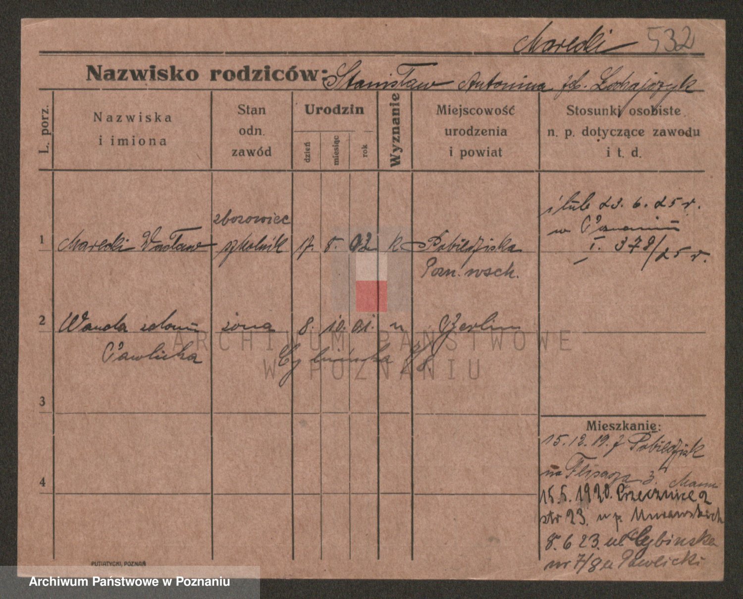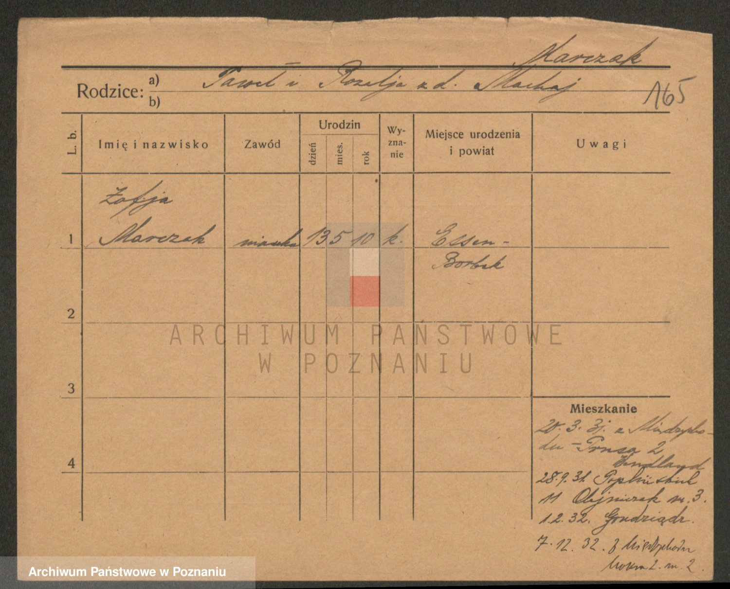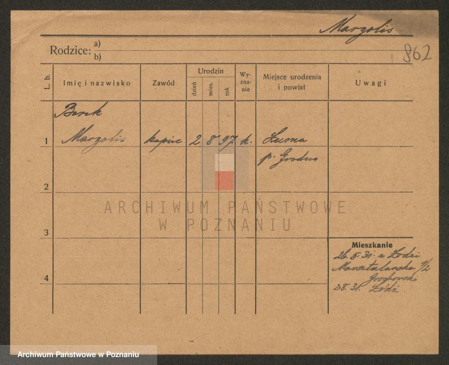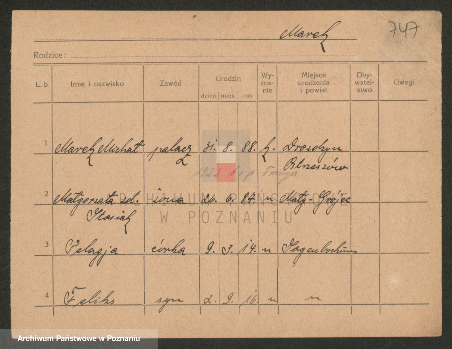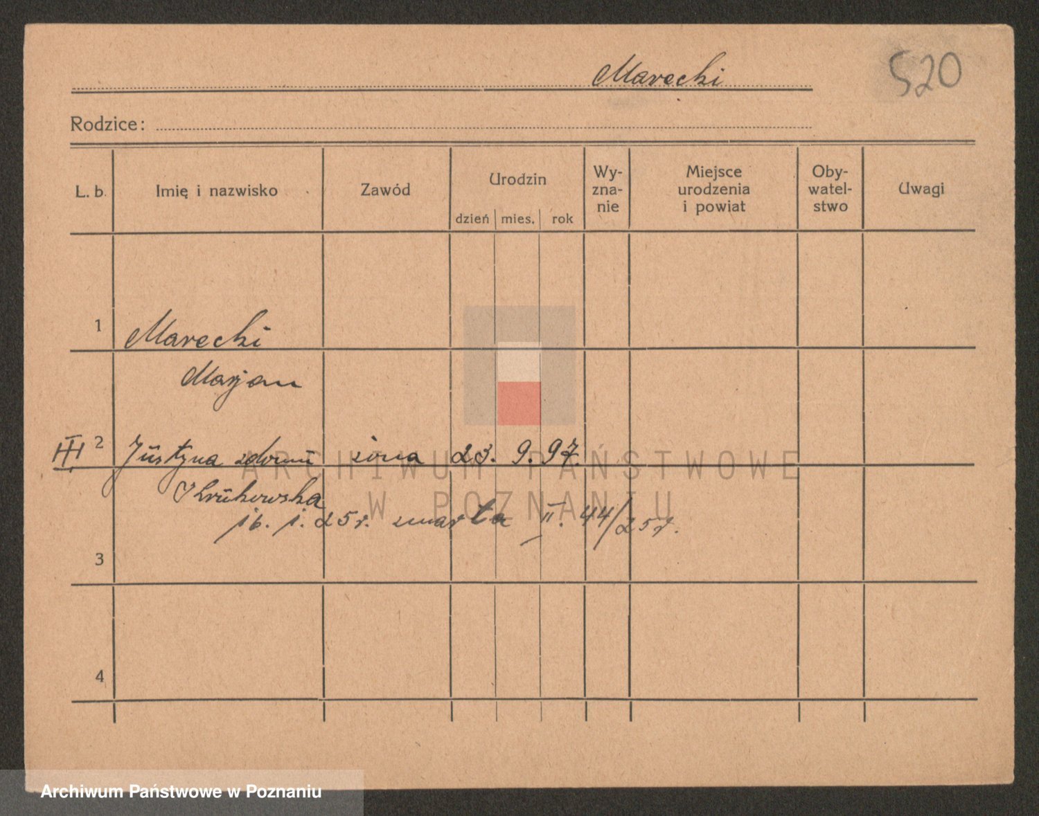 Podgląd karty osobowej dostępny jest po kliknięciu na nazwisko lub ikonkę karty. Można dokonywać powiększenia (ikony na górze) lub przechodzić między kolejnymi skanami (strzałki po bokach).