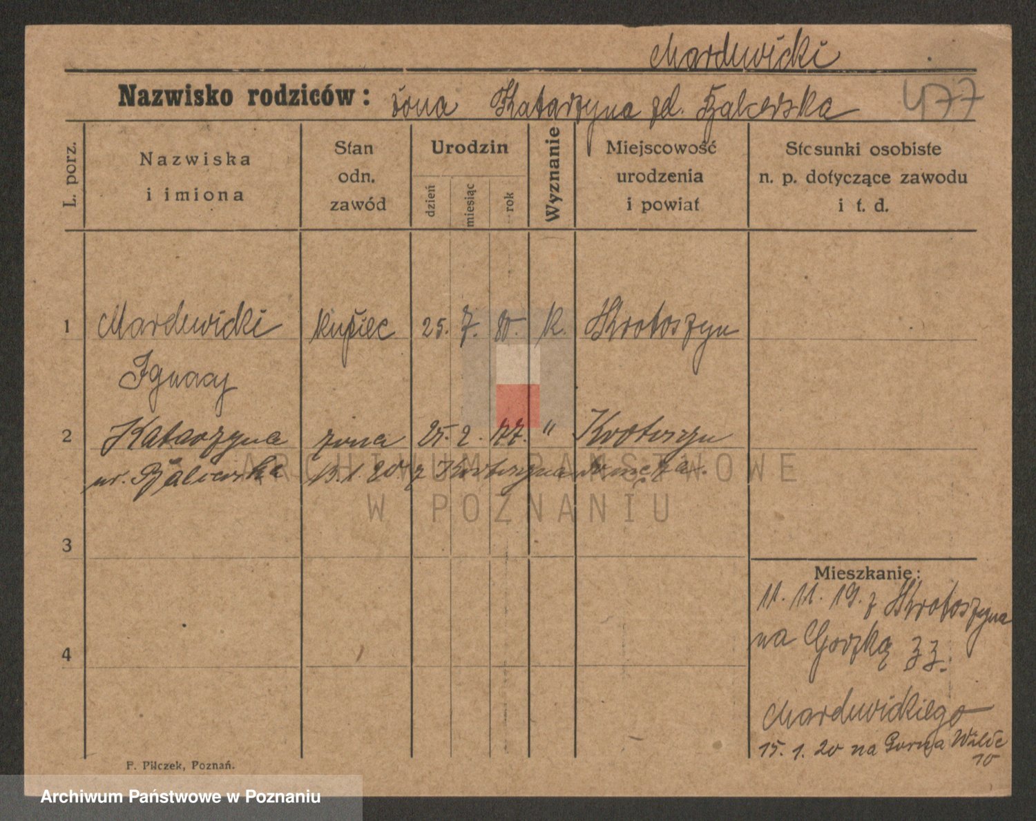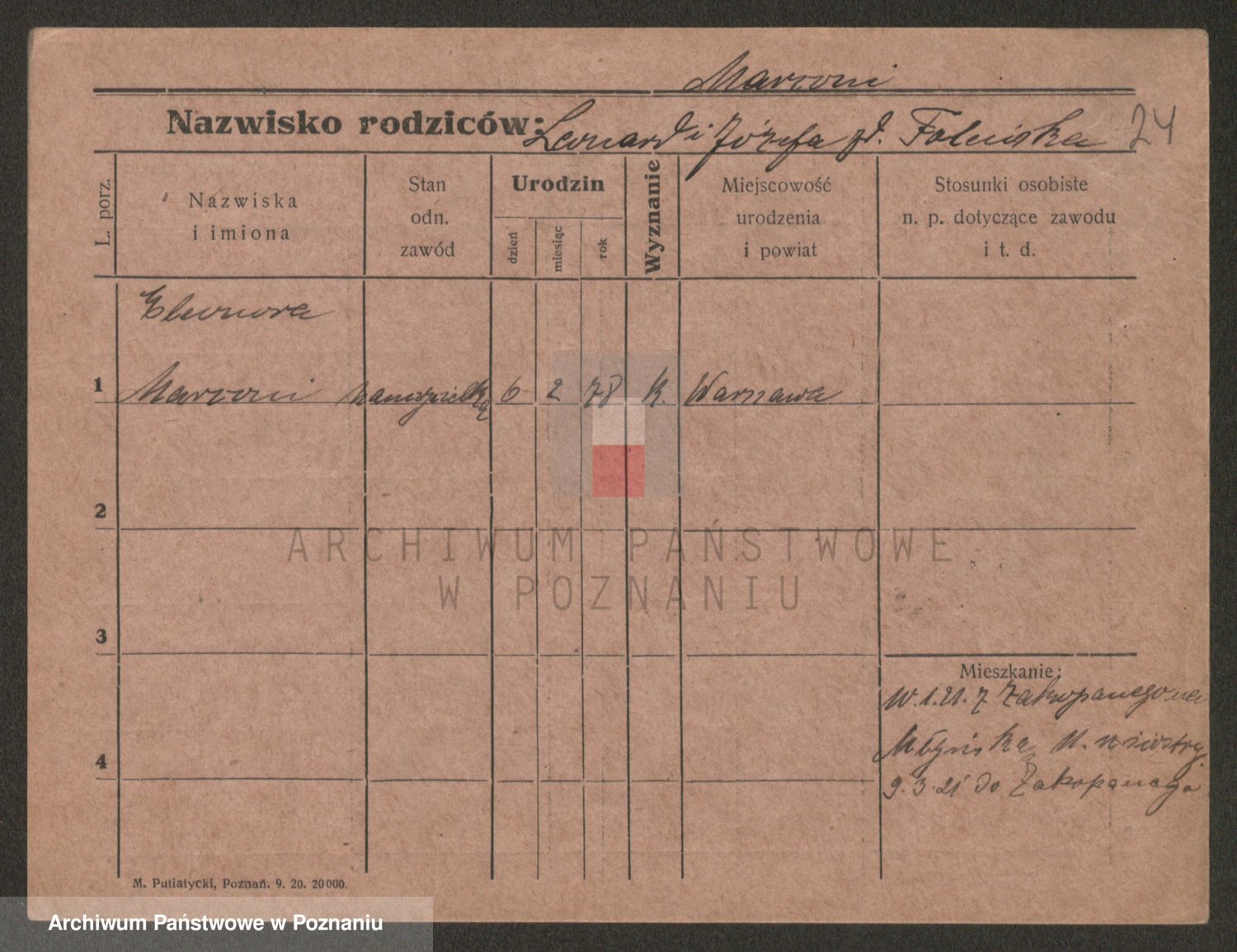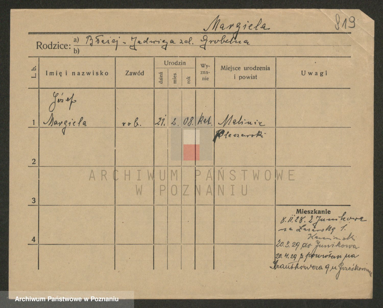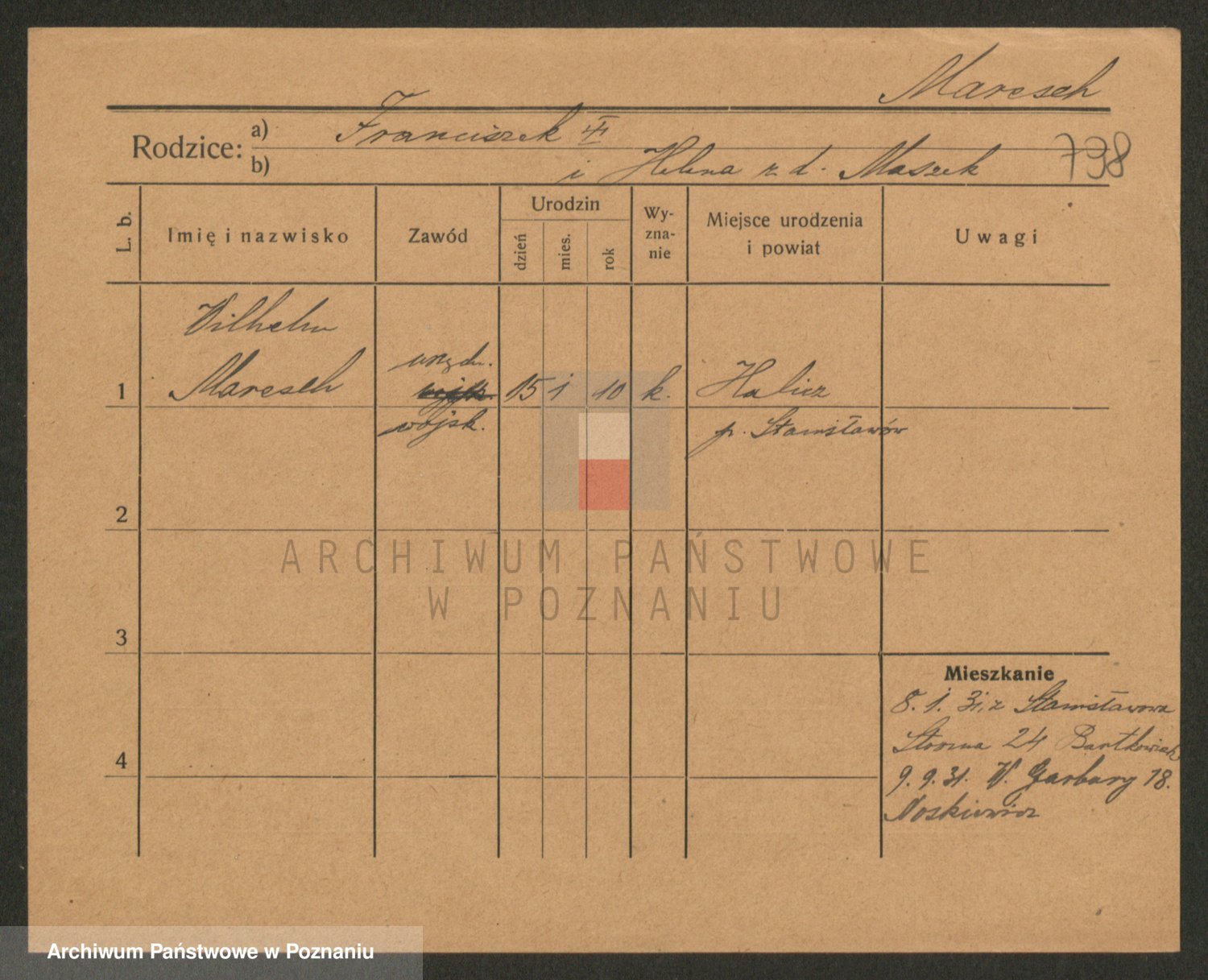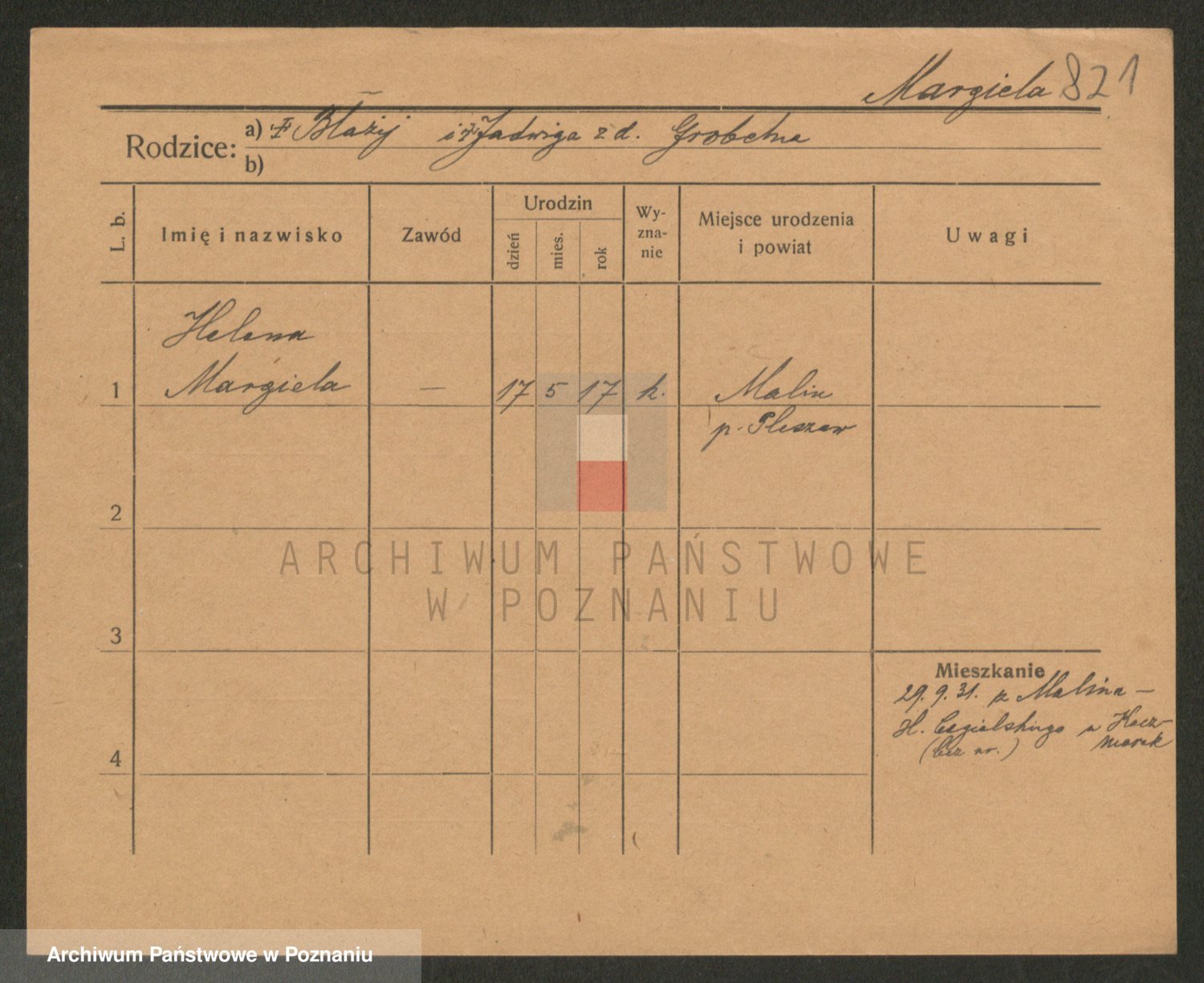 Podgląd karty osobowej dostępny jest po kliknięciu na nazwisko lub ikonkę karty. Można dokonywać powiększenia (ikony na górze) lub przechodzić między kolejnymi skanami (strzałki po bokach).