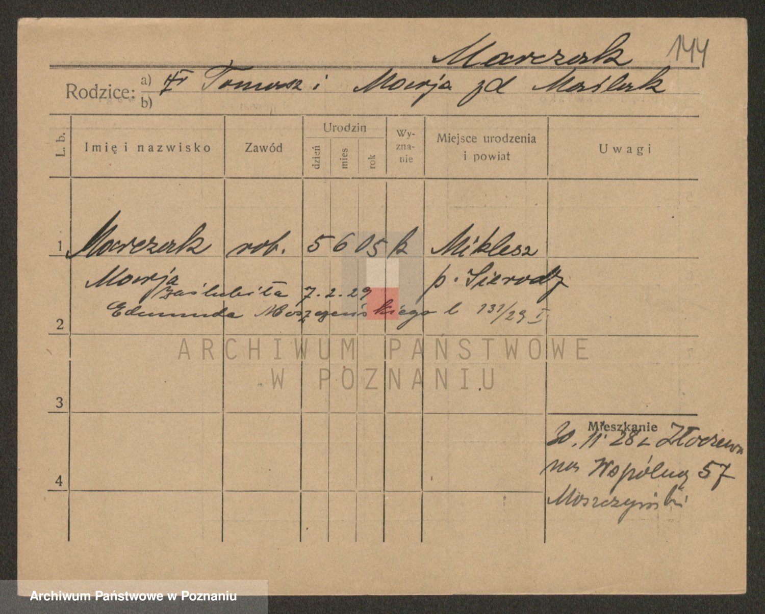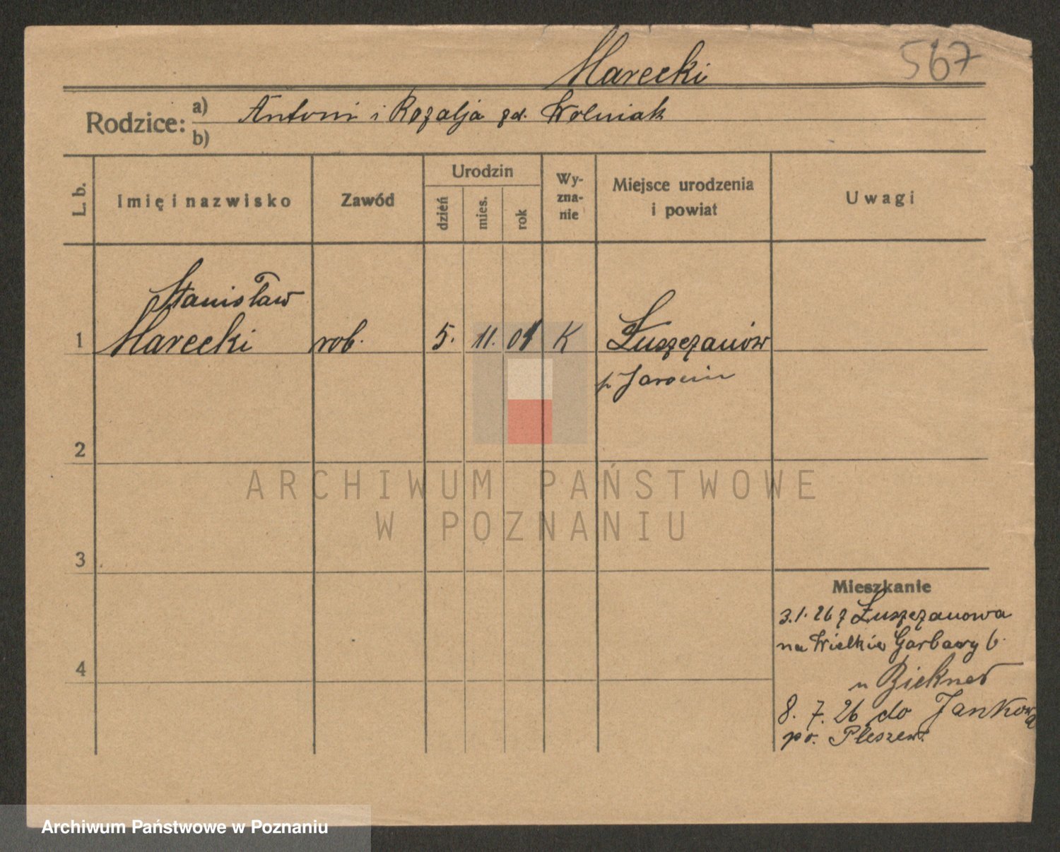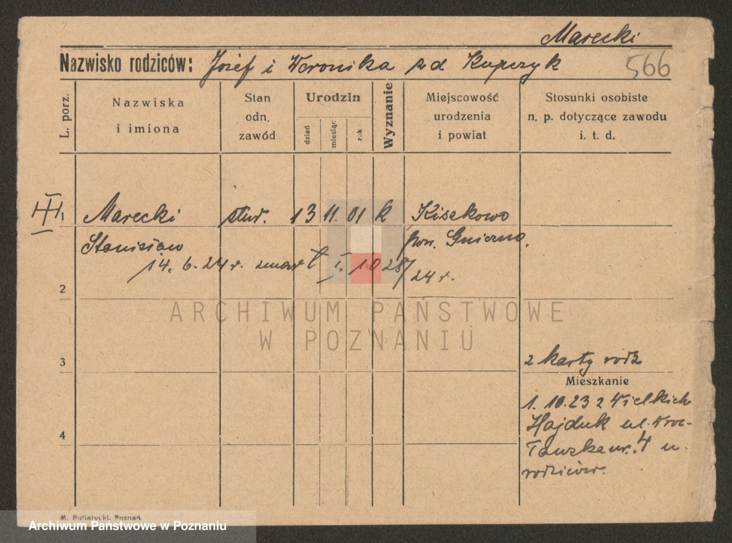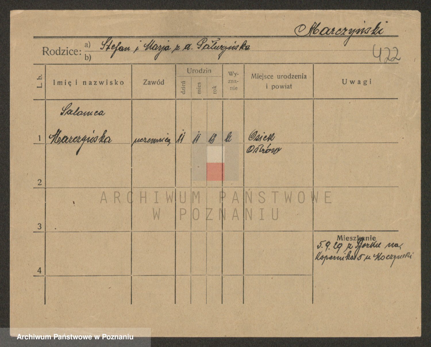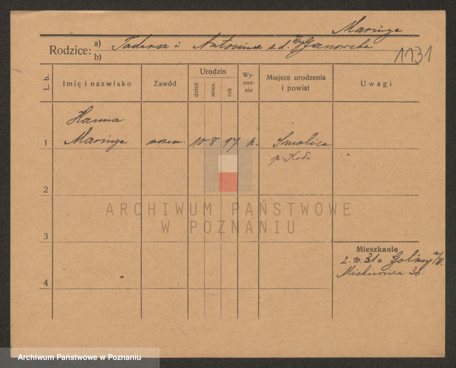 Podgląd karty osobowej dostępny jest po kliknięciu na nazwisko lub ikonkę karty. Można dokonywać powiększenia (ikony na górze) lub przechodzić między kolejnymi skanami (strzałki po bokach).