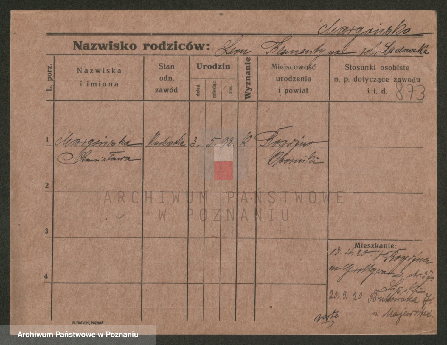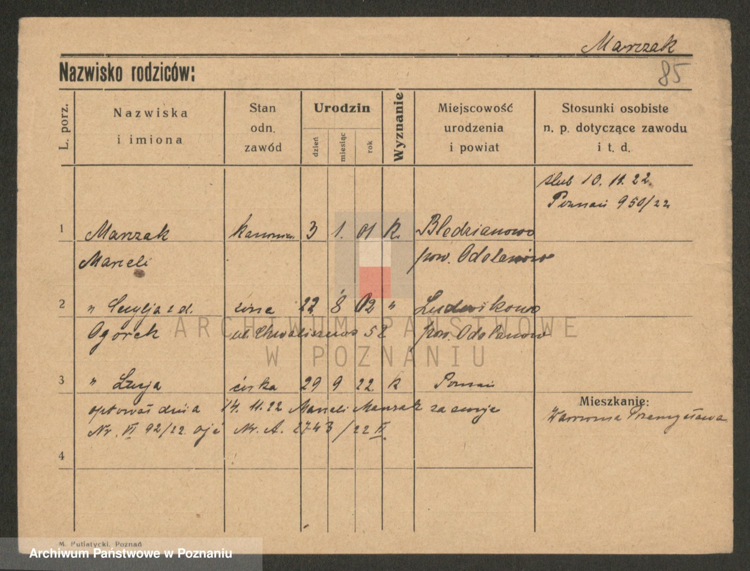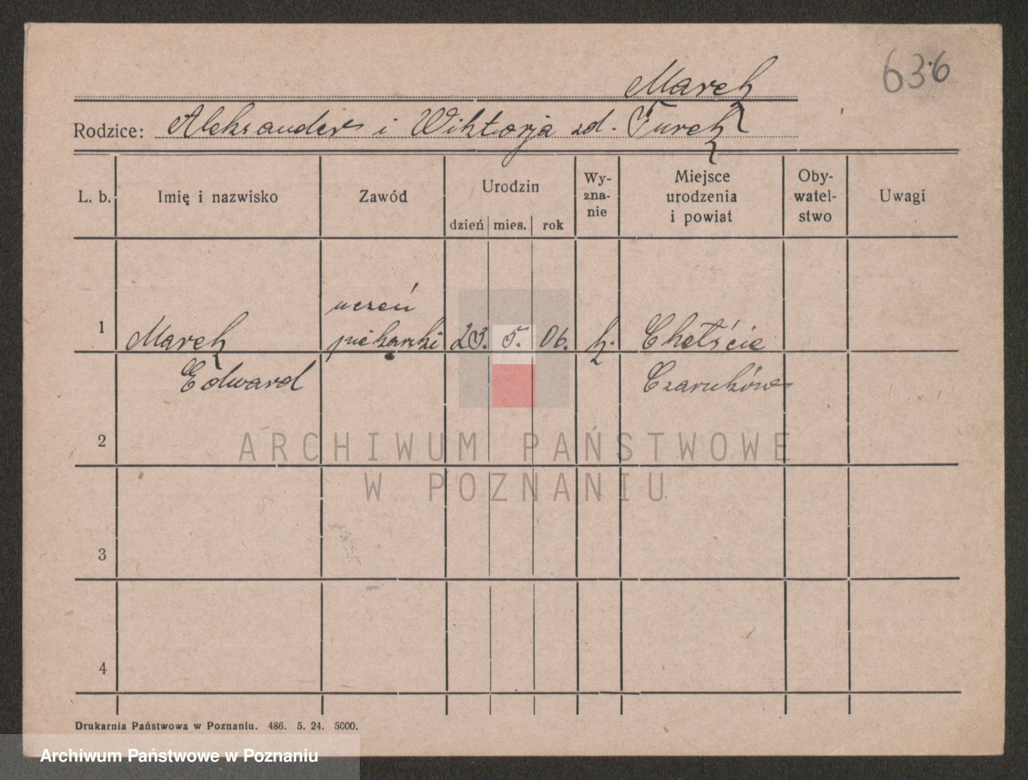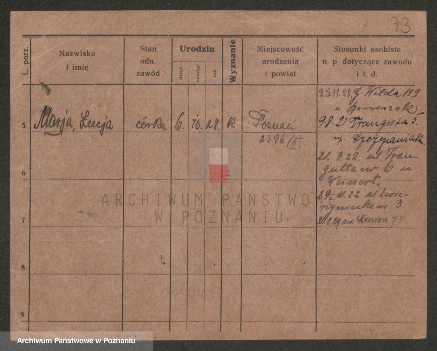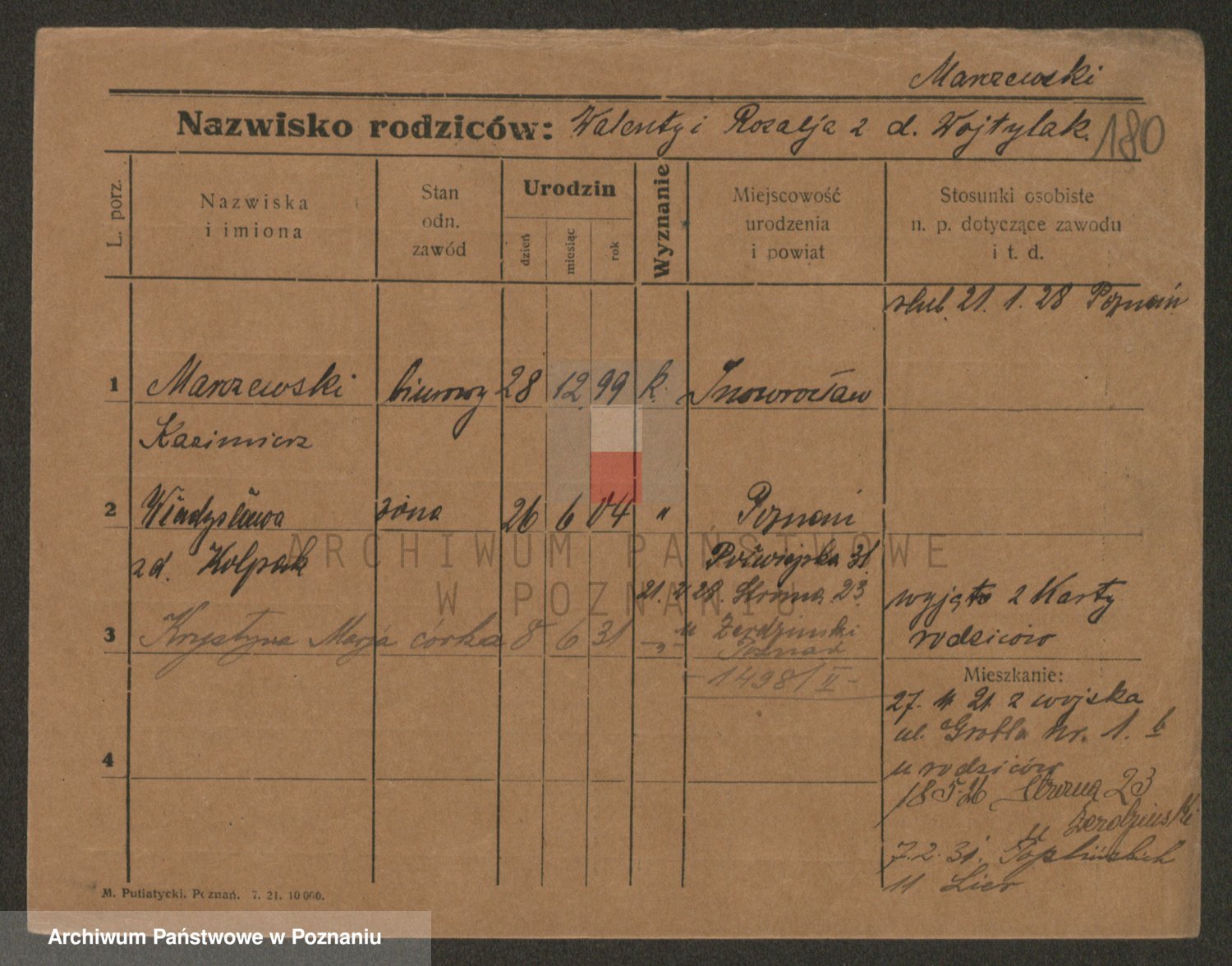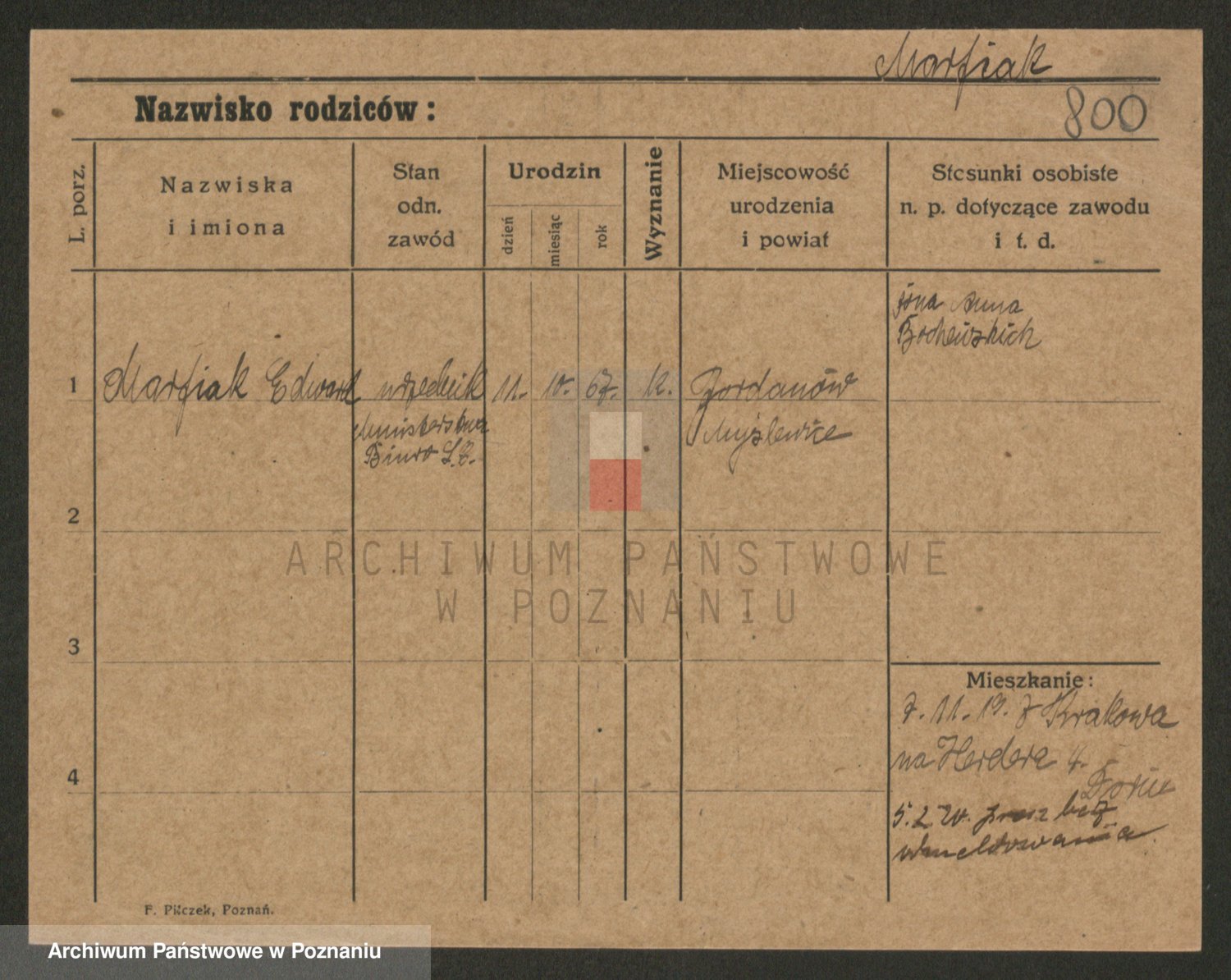 Podgląd karty osobowej dostępny jest po kliknięciu na nazwisko lub ikonkę karty. Można dokonywać powiększenia (ikony na górze) lub przechodzić między kolejnymi skanami (strzałki po bokach).