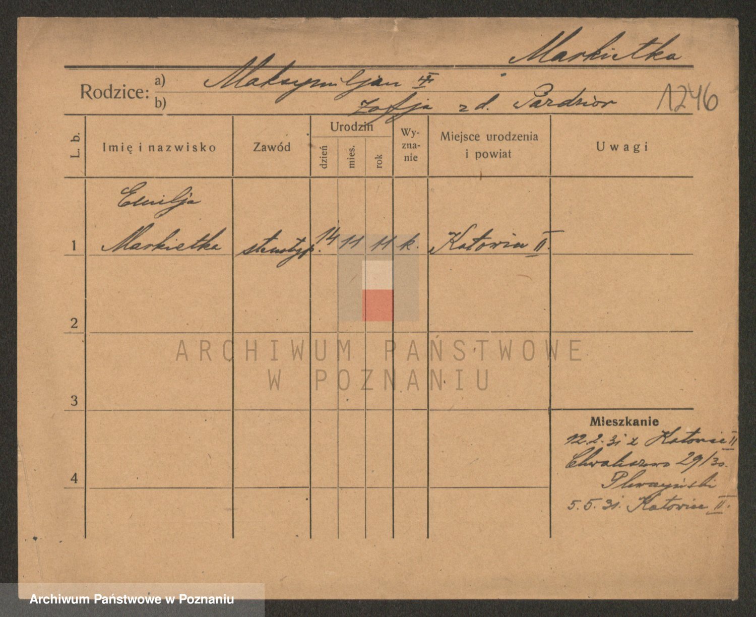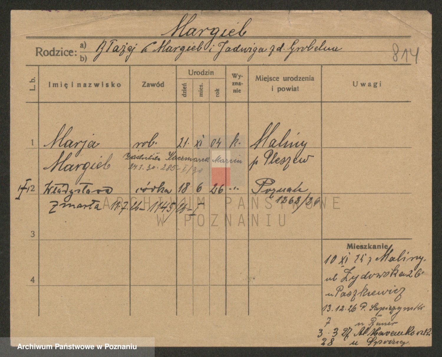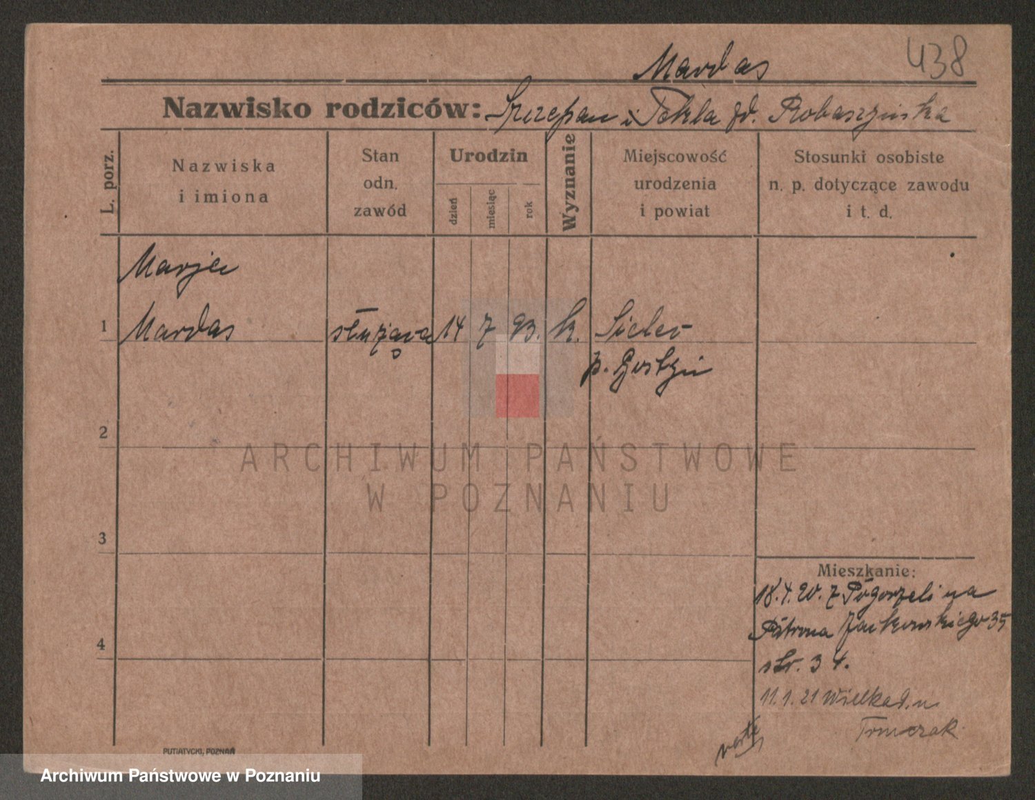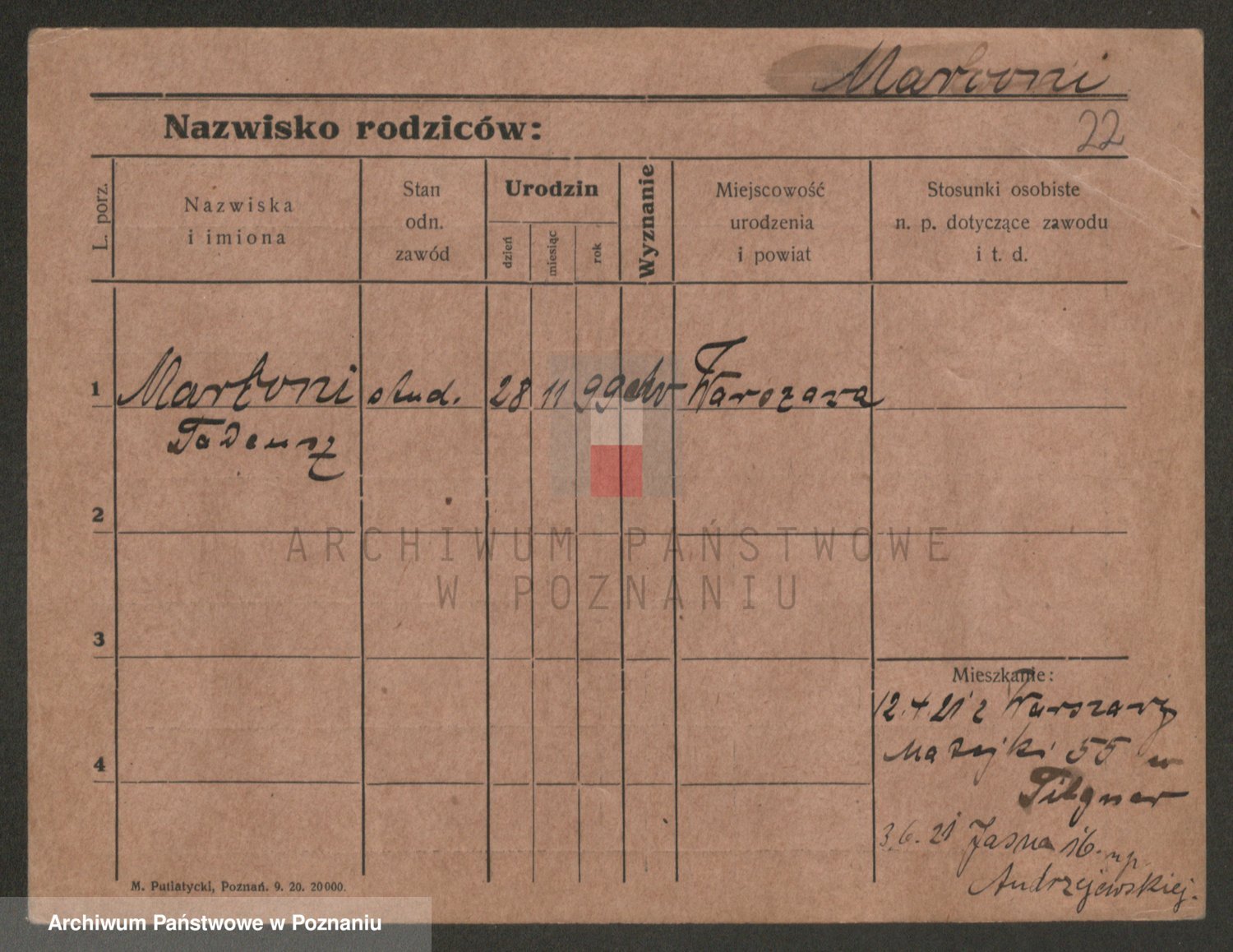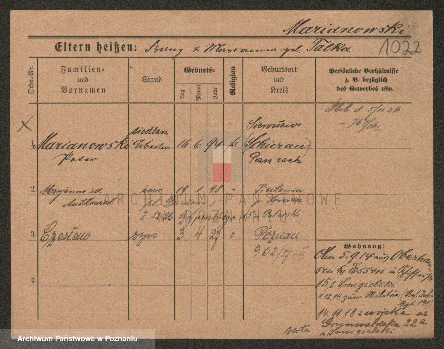 Podgląd karty osobowej dostępny jest po kliknięciu na nazwisko lub ikonkę karty. Można dokonywać powiększenia (ikony na górze) lub przechodzić między kolejnymi skanami (strzałki po bokach).