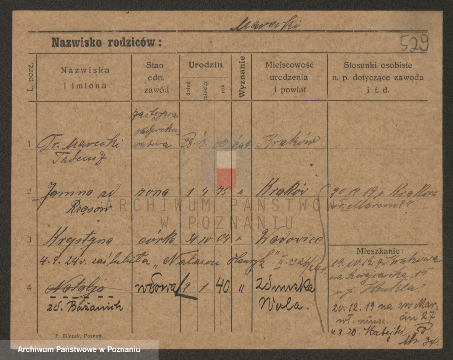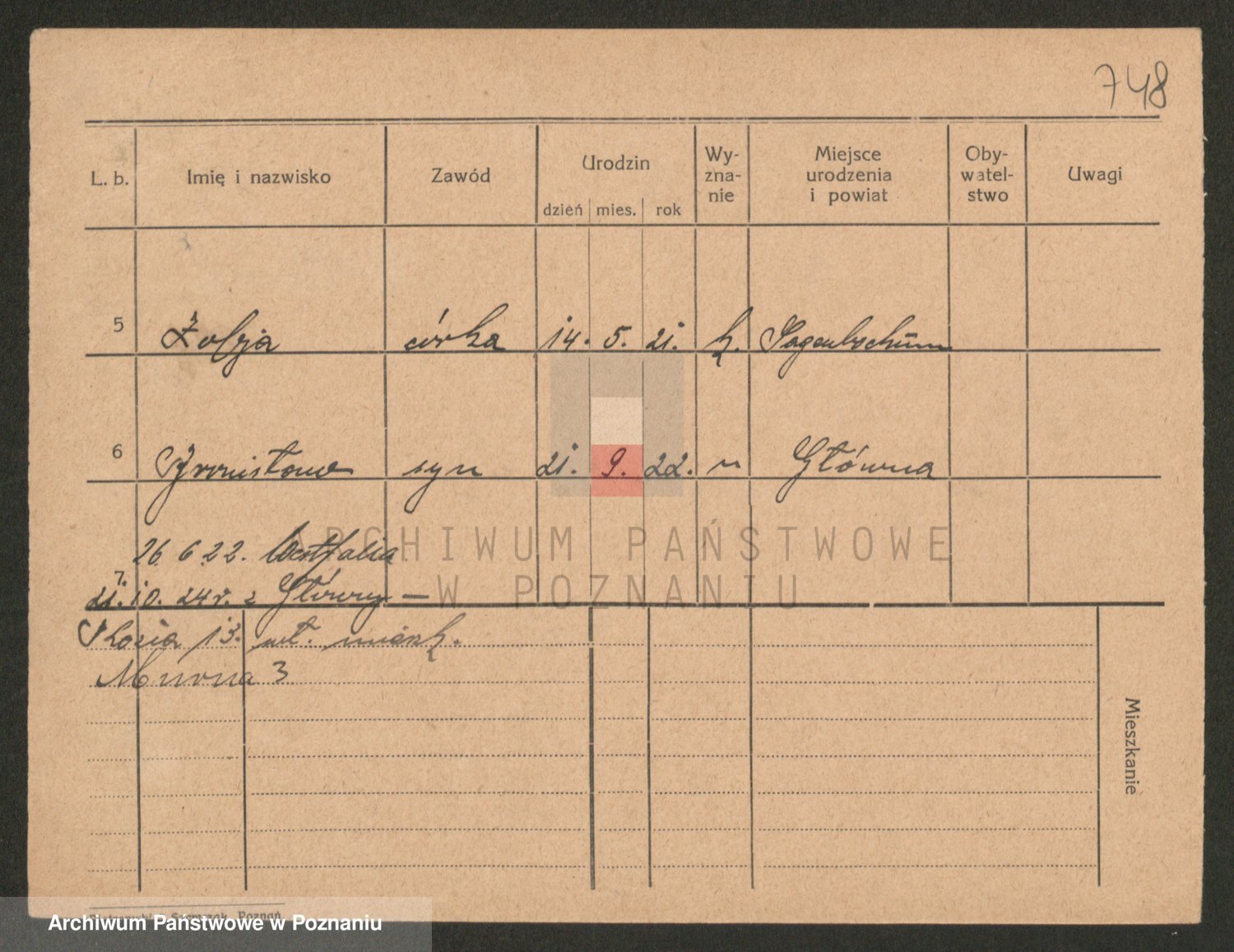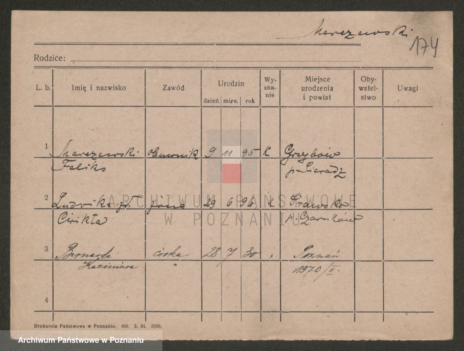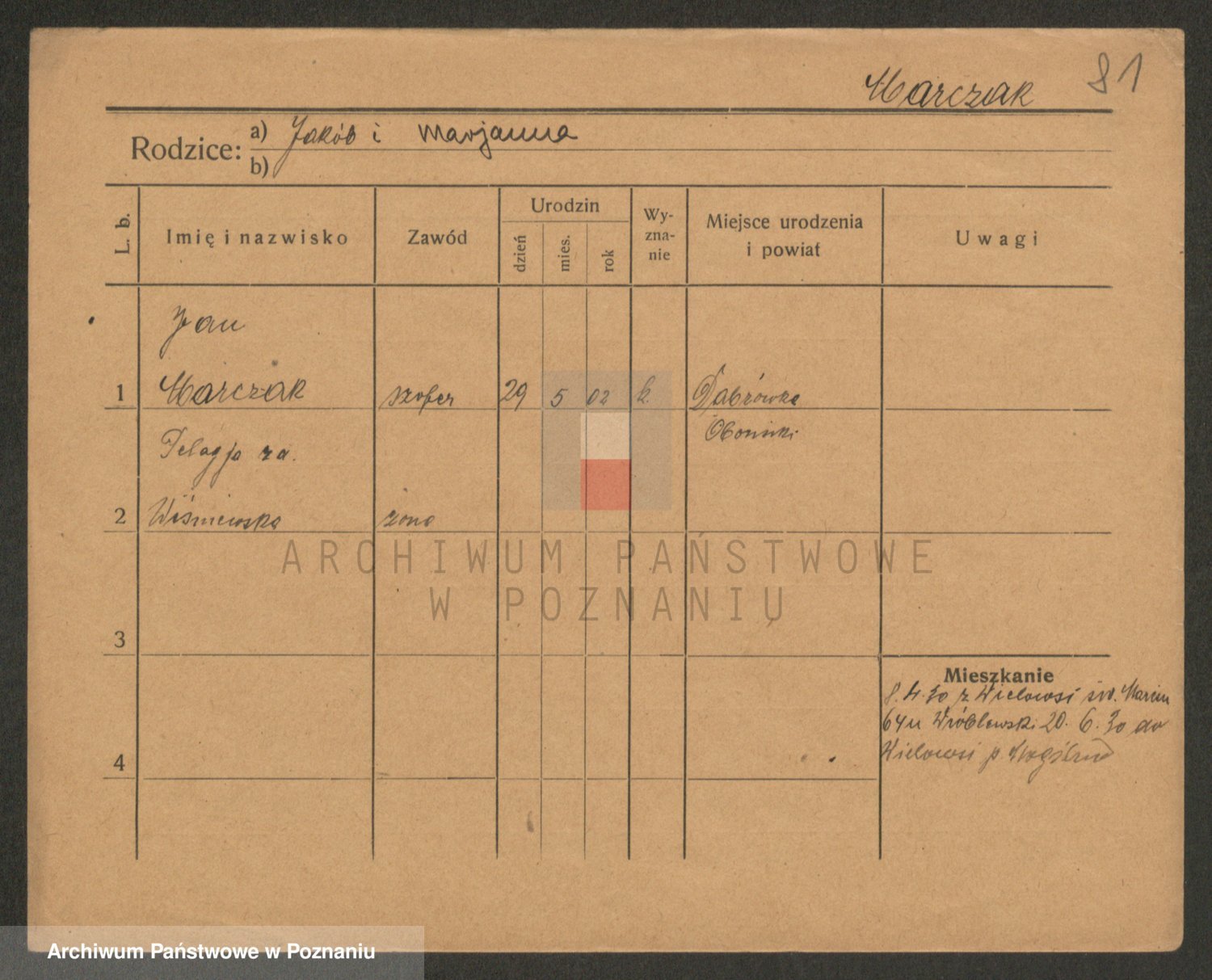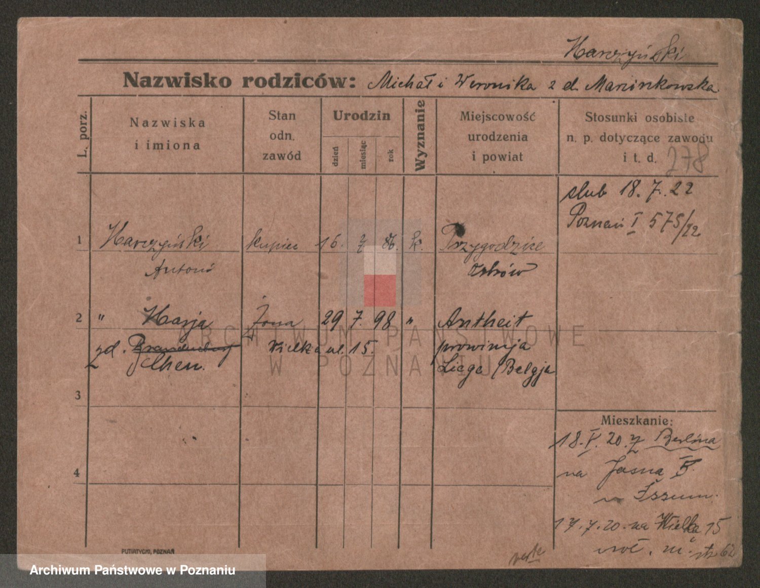 Podgląd karty osobowej dostępny jest po kliknięciu na nazwisko lub ikonkę karty. Można dokonywać powiększenia (ikony na górze) lub przechodzić między kolejnymi skanami (strzałki po bokach).