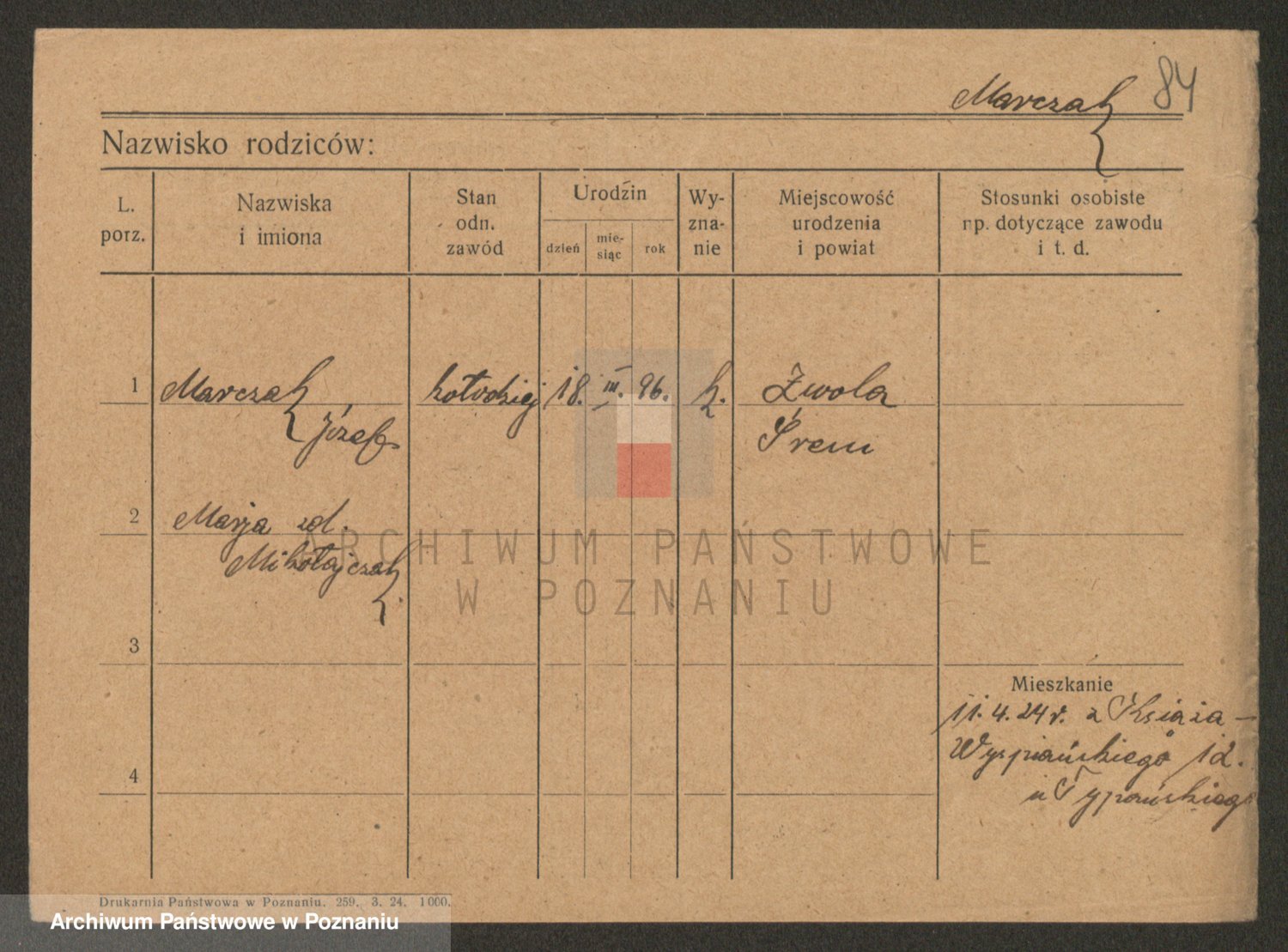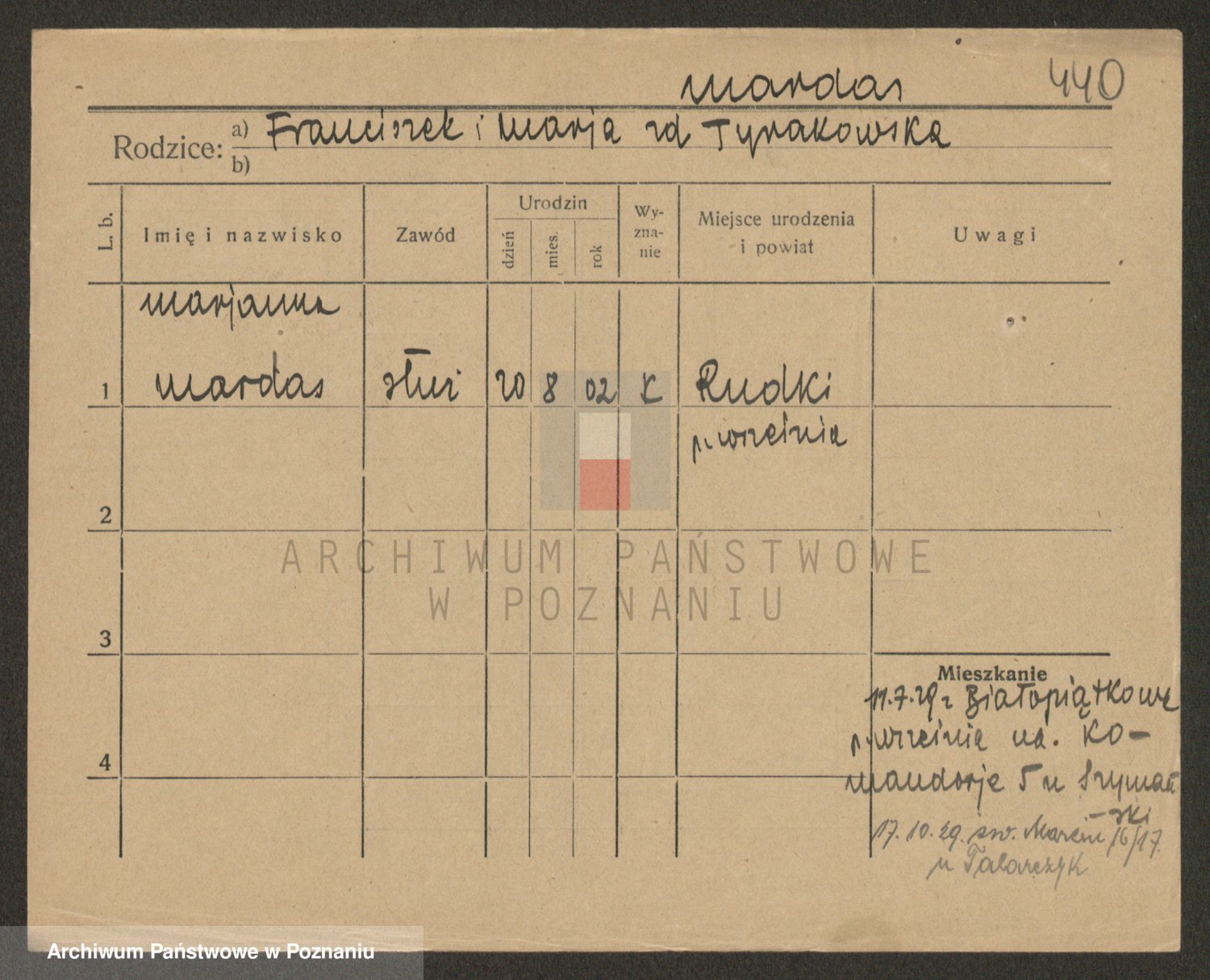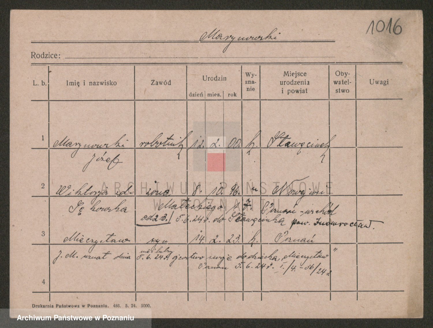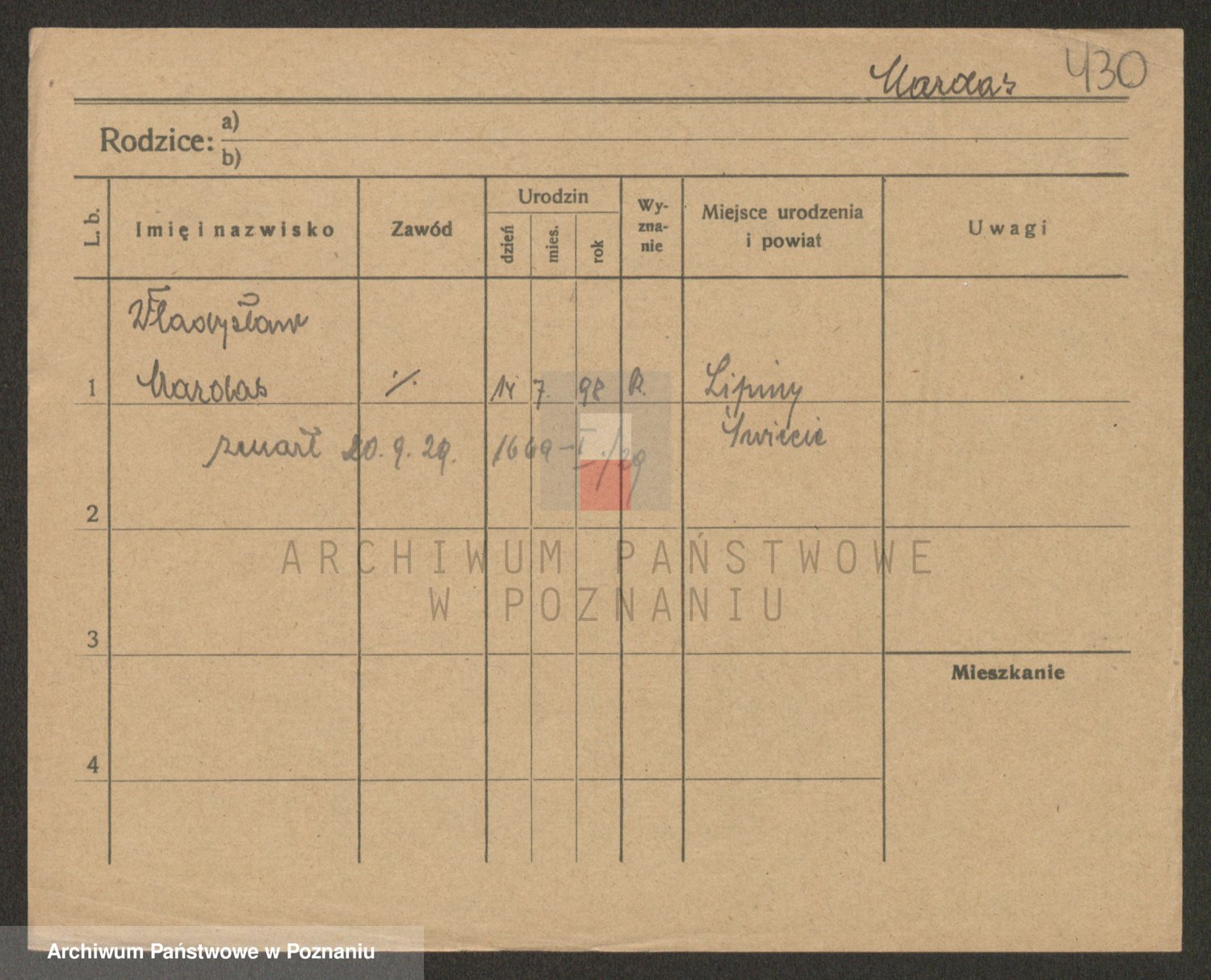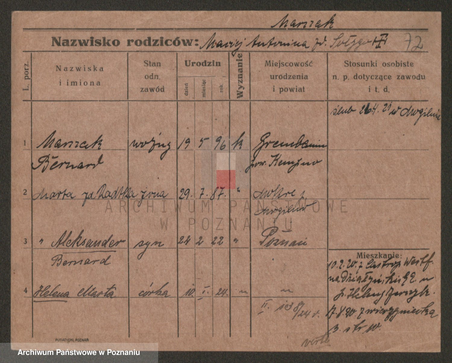 Podgląd karty osobowej dostępny jest po kliknięciu na nazwisko lub ikonkę karty. Można dokonywać powiększenia (ikony na górze) lub przechodzić między kolejnymi skanami (strzałki po bokach).
