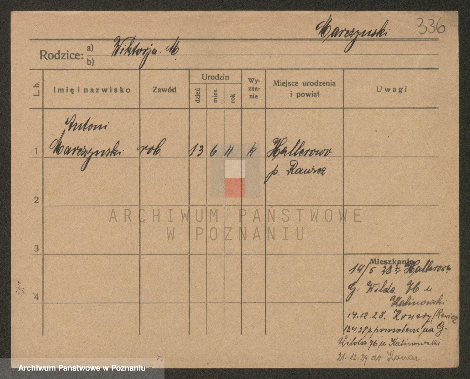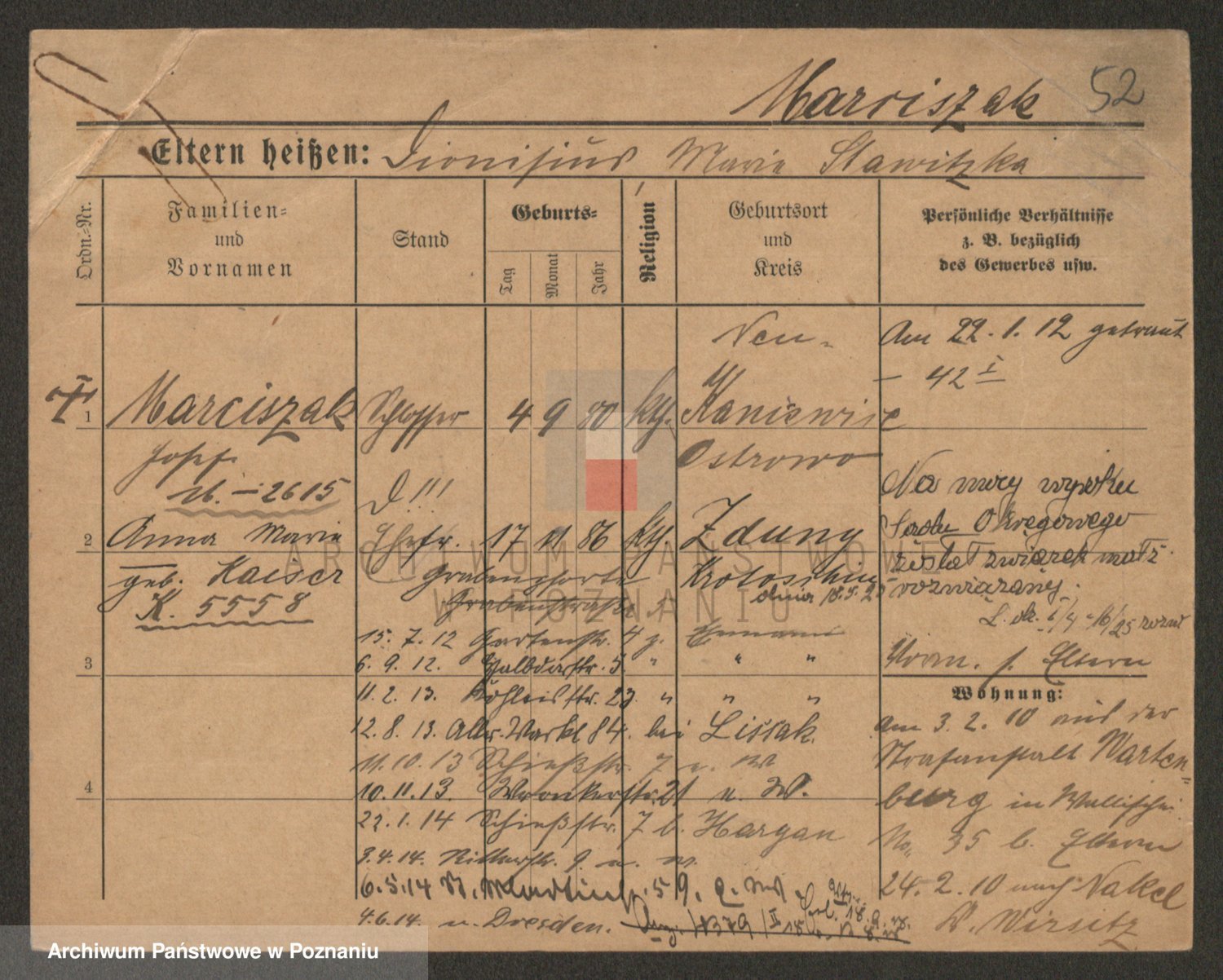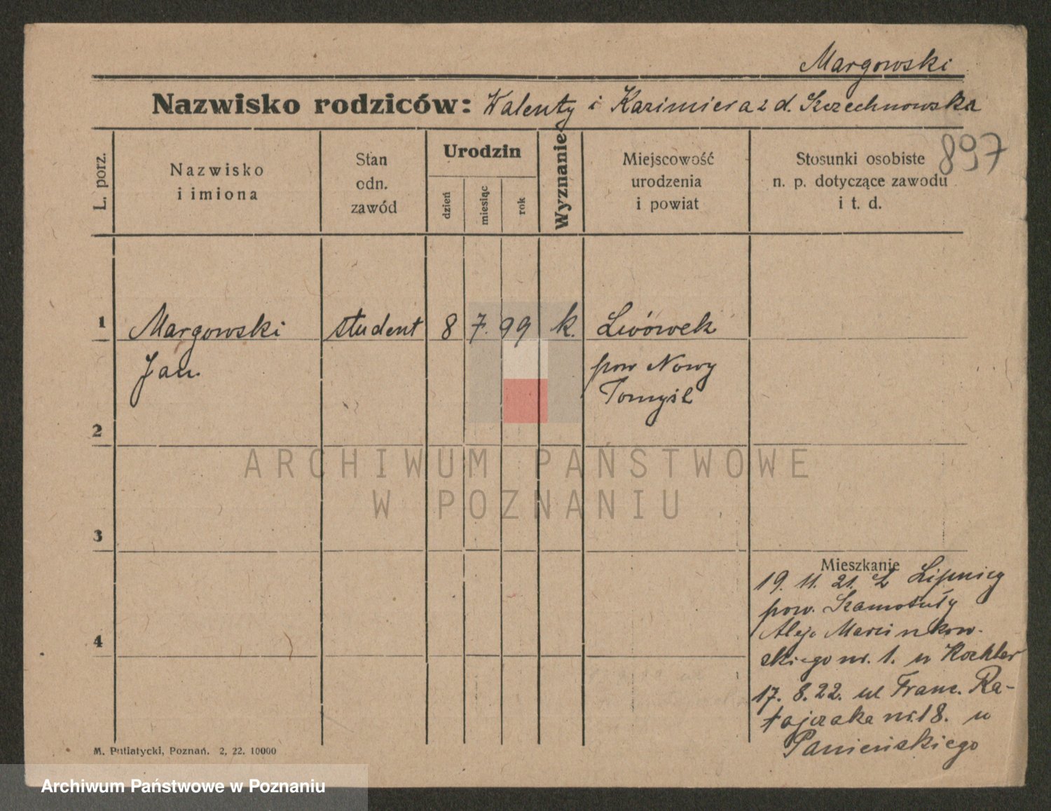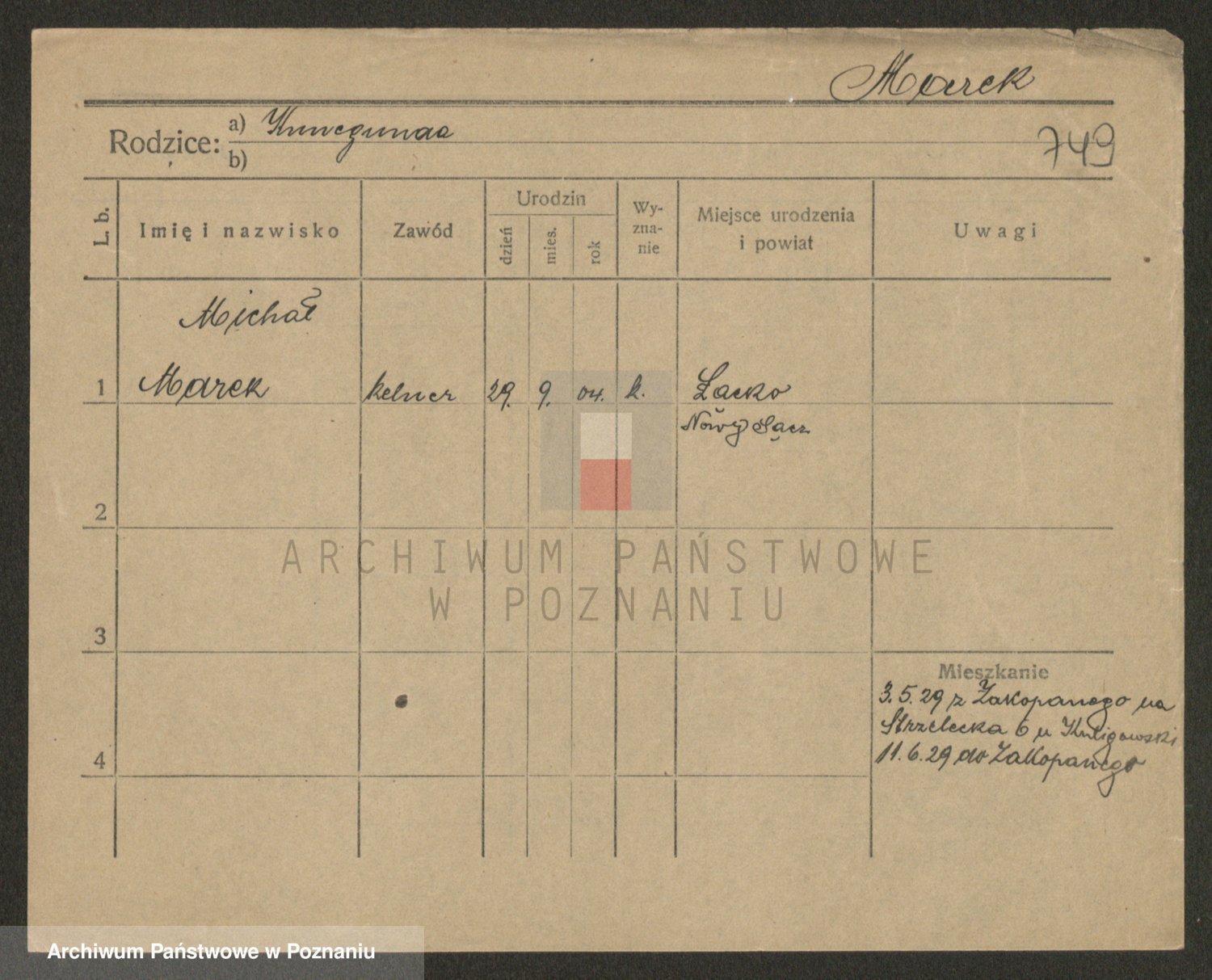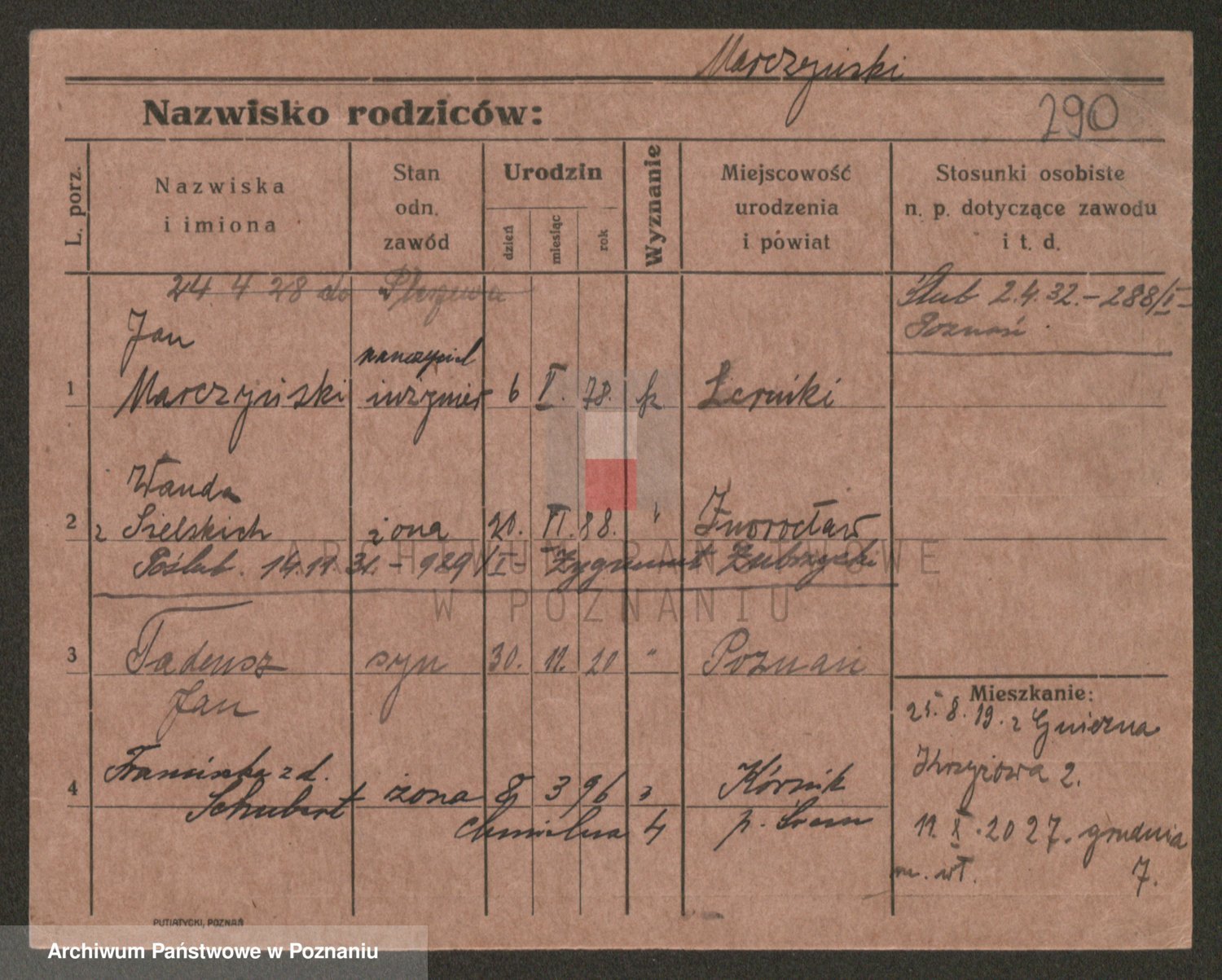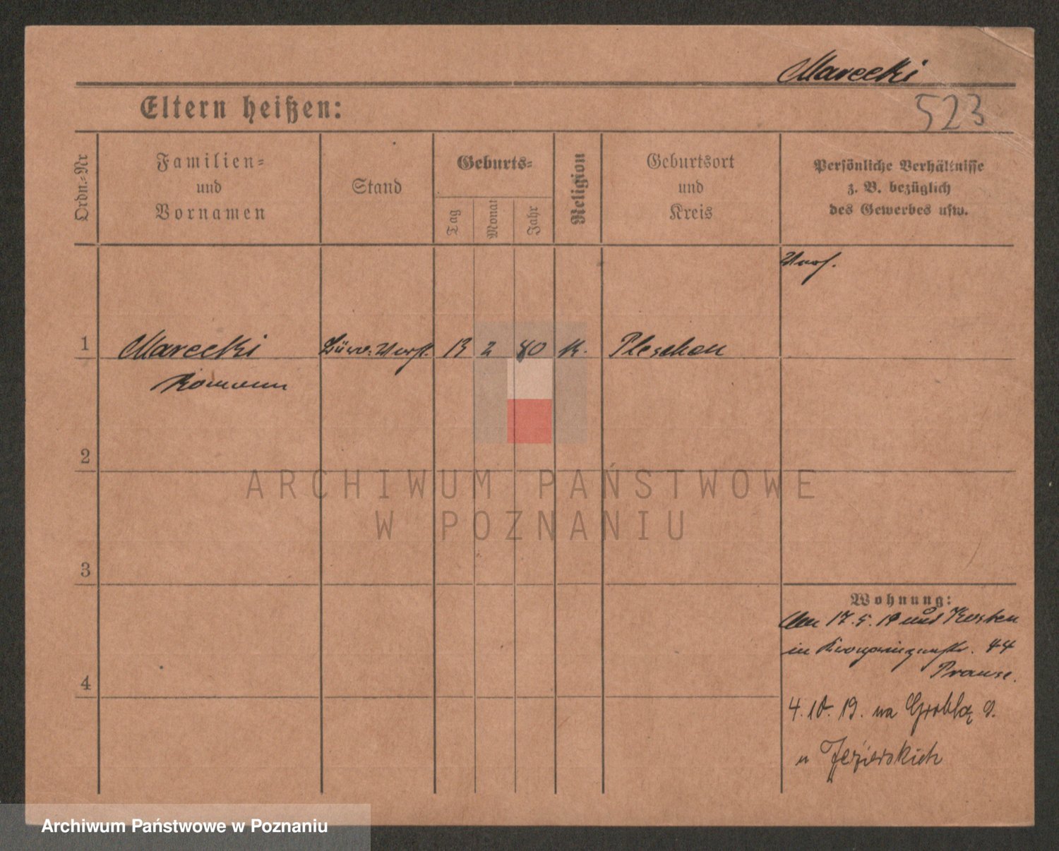 Podgląd karty osobowej dostępny jest po kliknięciu na nazwisko lub ikonkę karty. Można dokonywać powiększenia (ikony na górze) lub przechodzić między kolejnymi skanami (strzałki po bokach).
