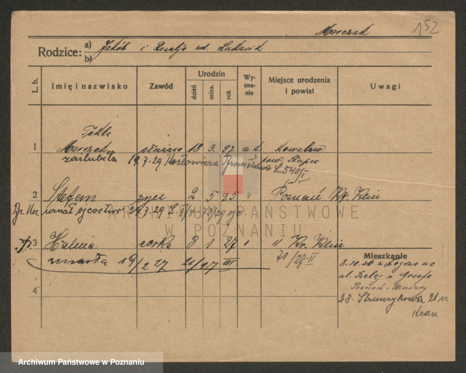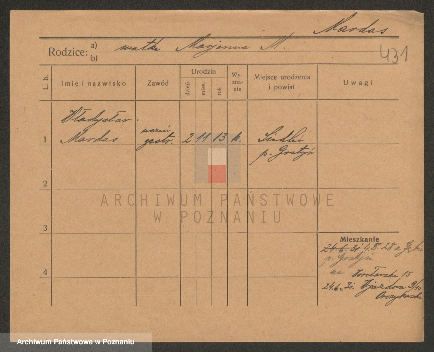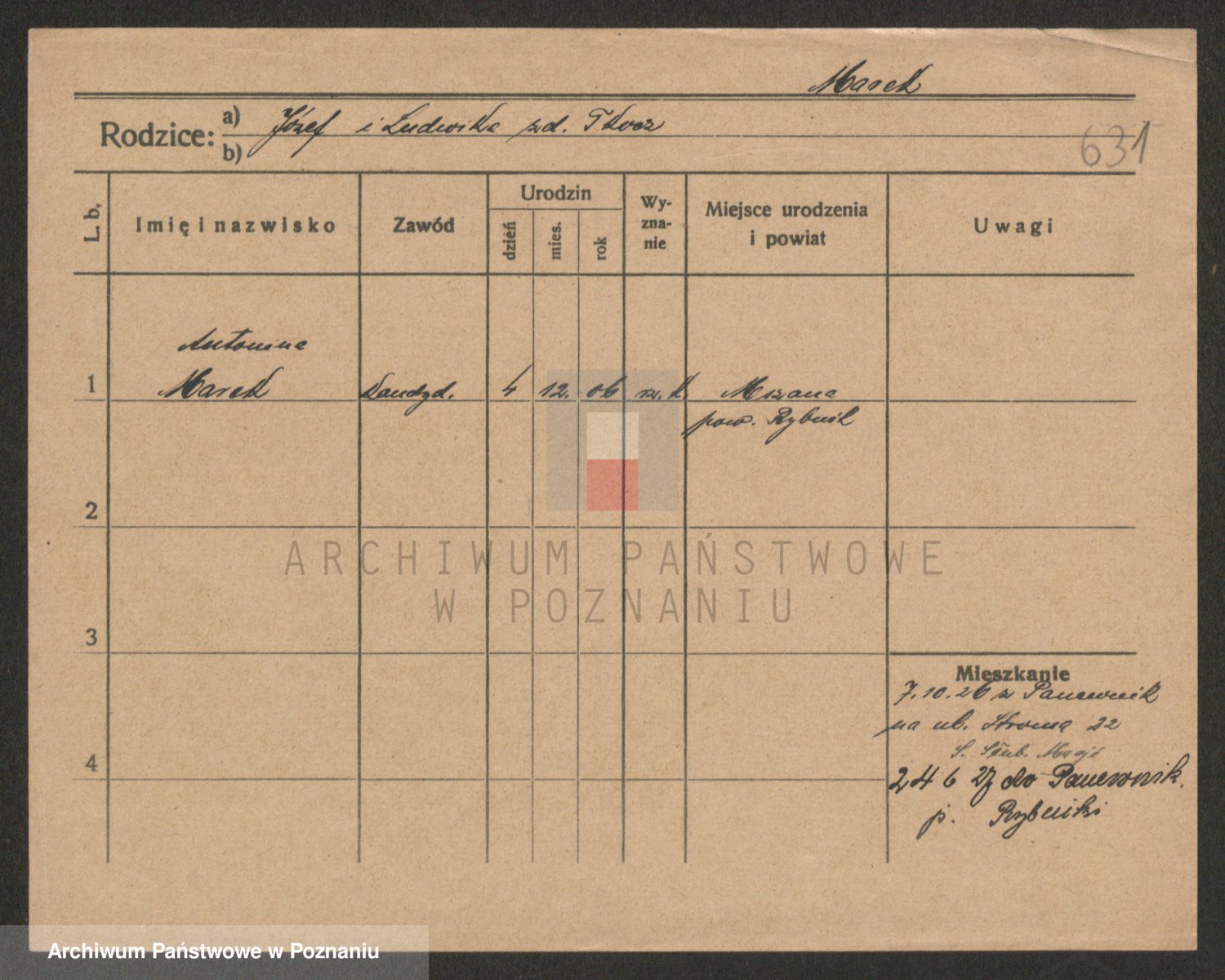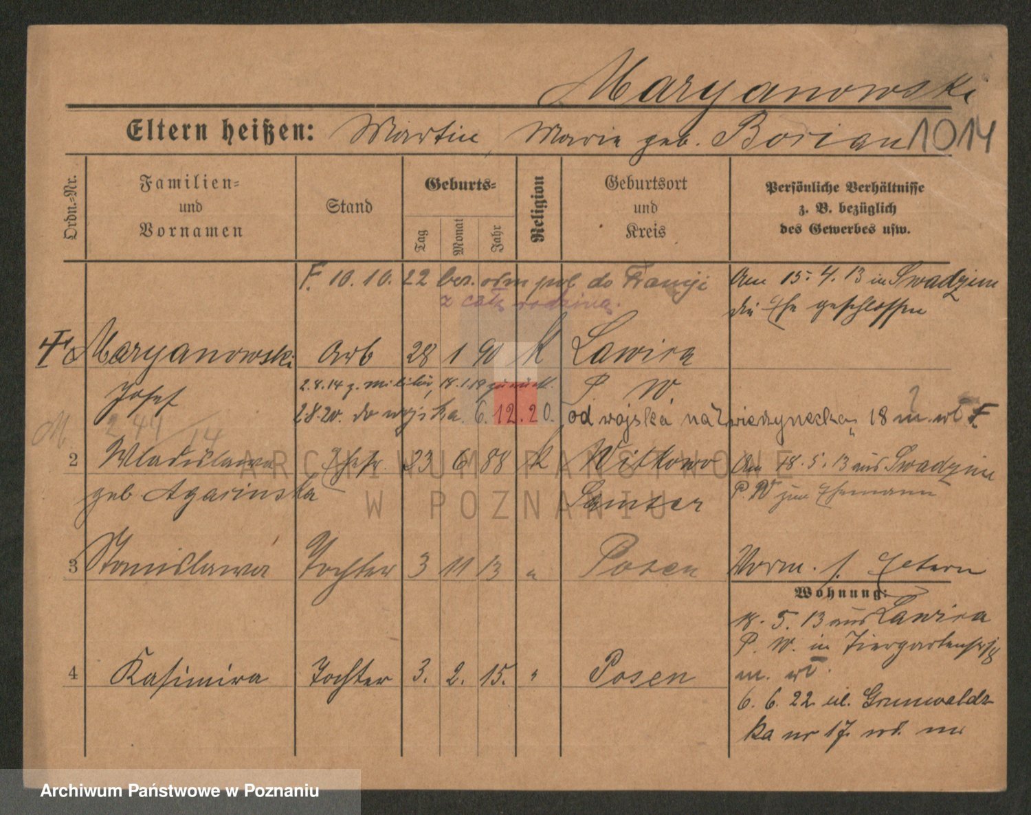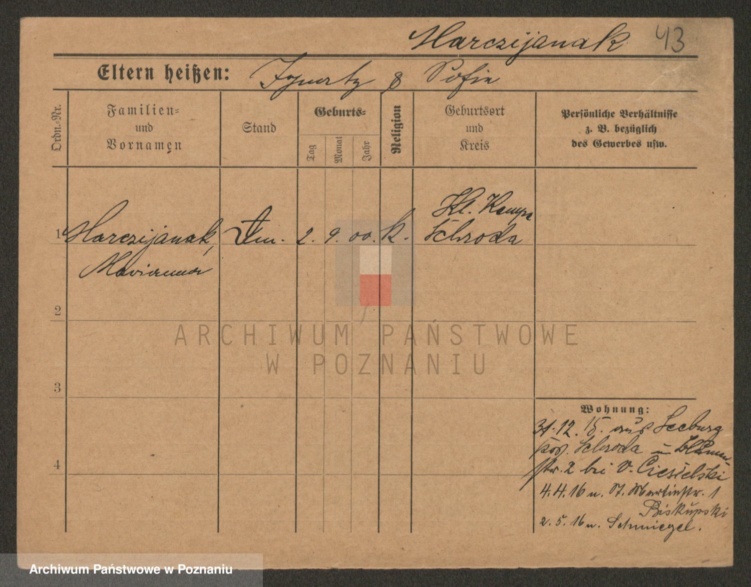 Podgląd karty osobowej dostępny jest po kliknięciu na nazwisko lub ikonkę karty. Można dokonywać powiększenia (ikony na górze) lub przechodzić między kolejnymi skanami (strzałki po bokach).