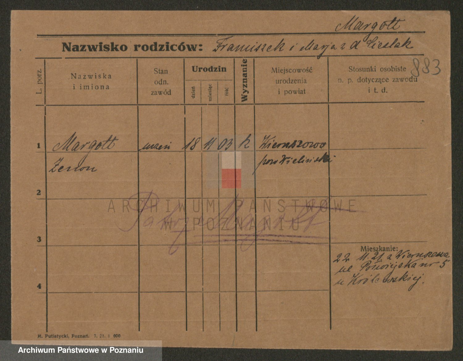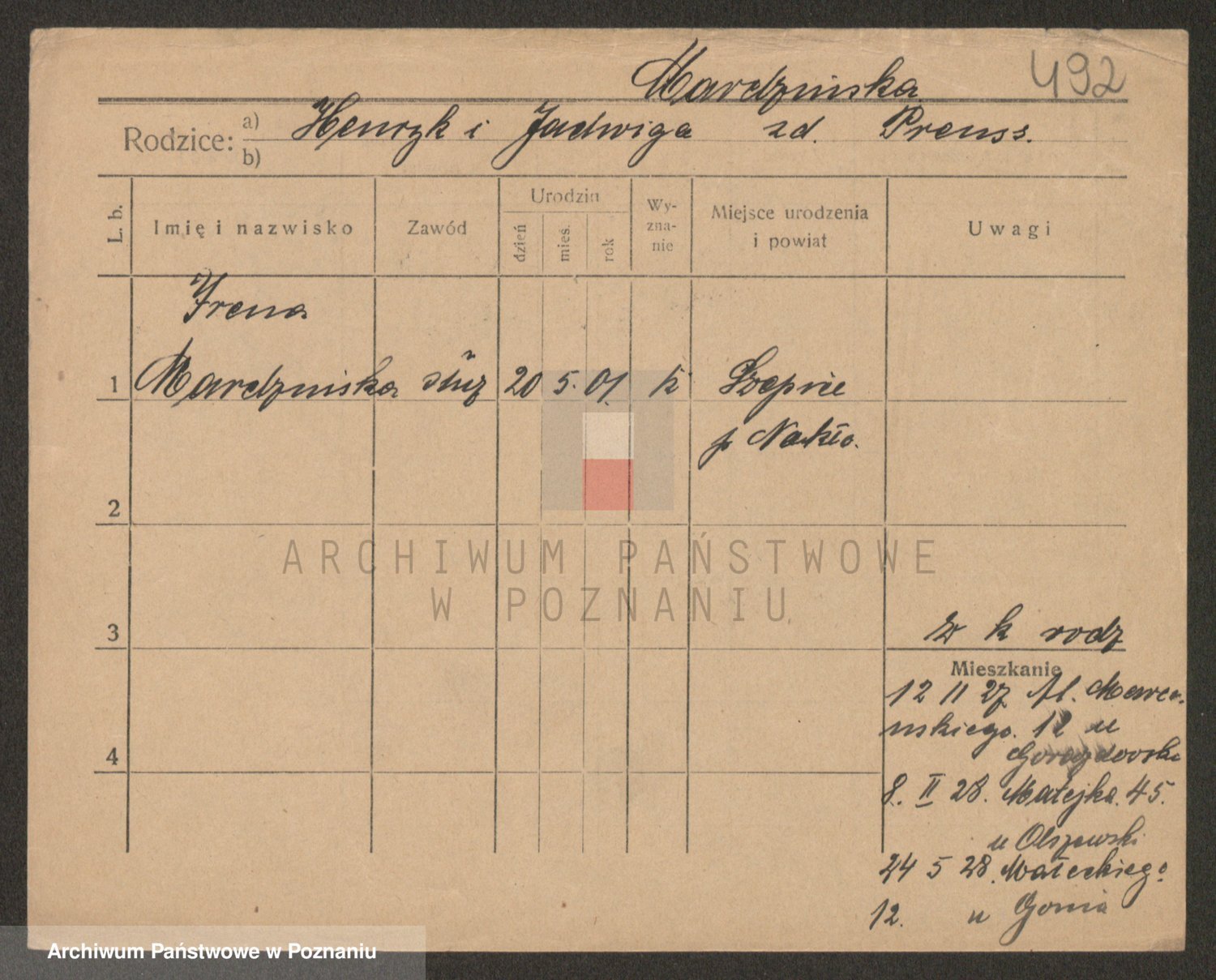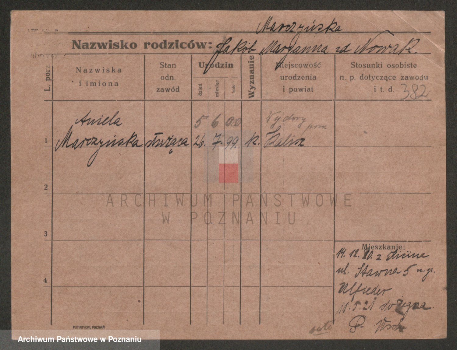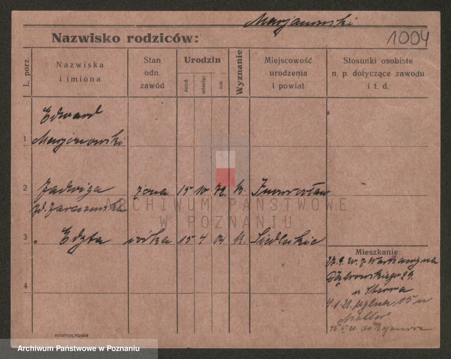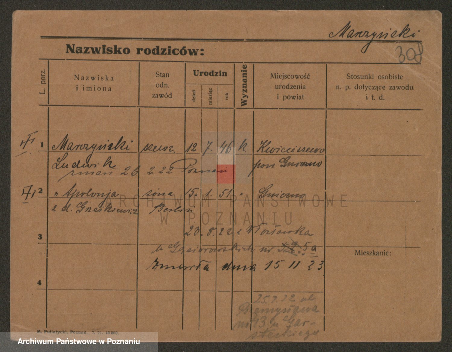 Podgląd karty osobowej dostępny jest po kliknięciu na nazwisko lub ikonkę karty. Można dokonywać powiększenia (ikony na górze) lub przechodzić między kolejnymi skanami (strzałki po bokach).