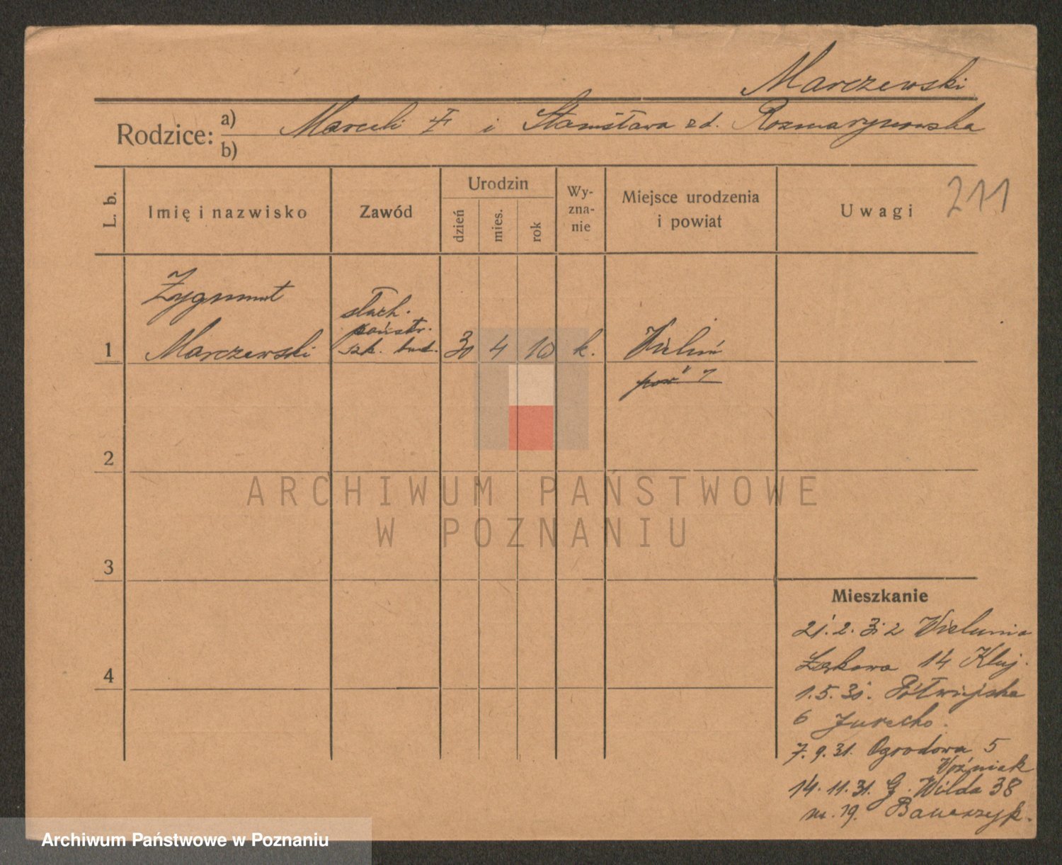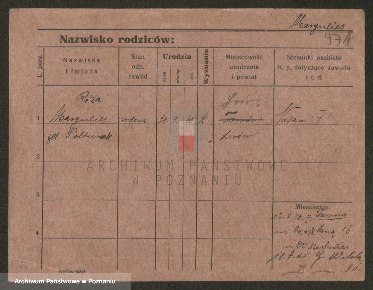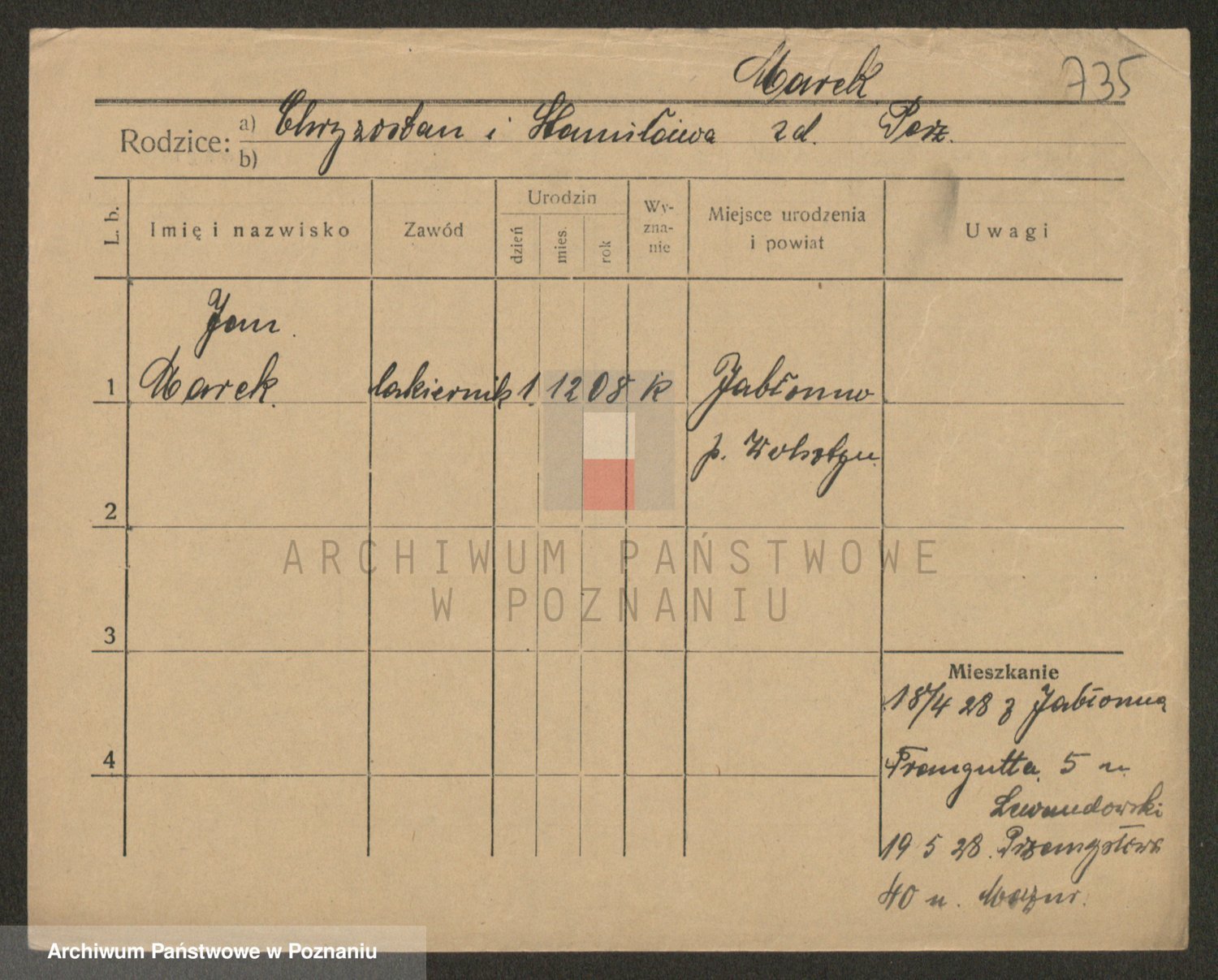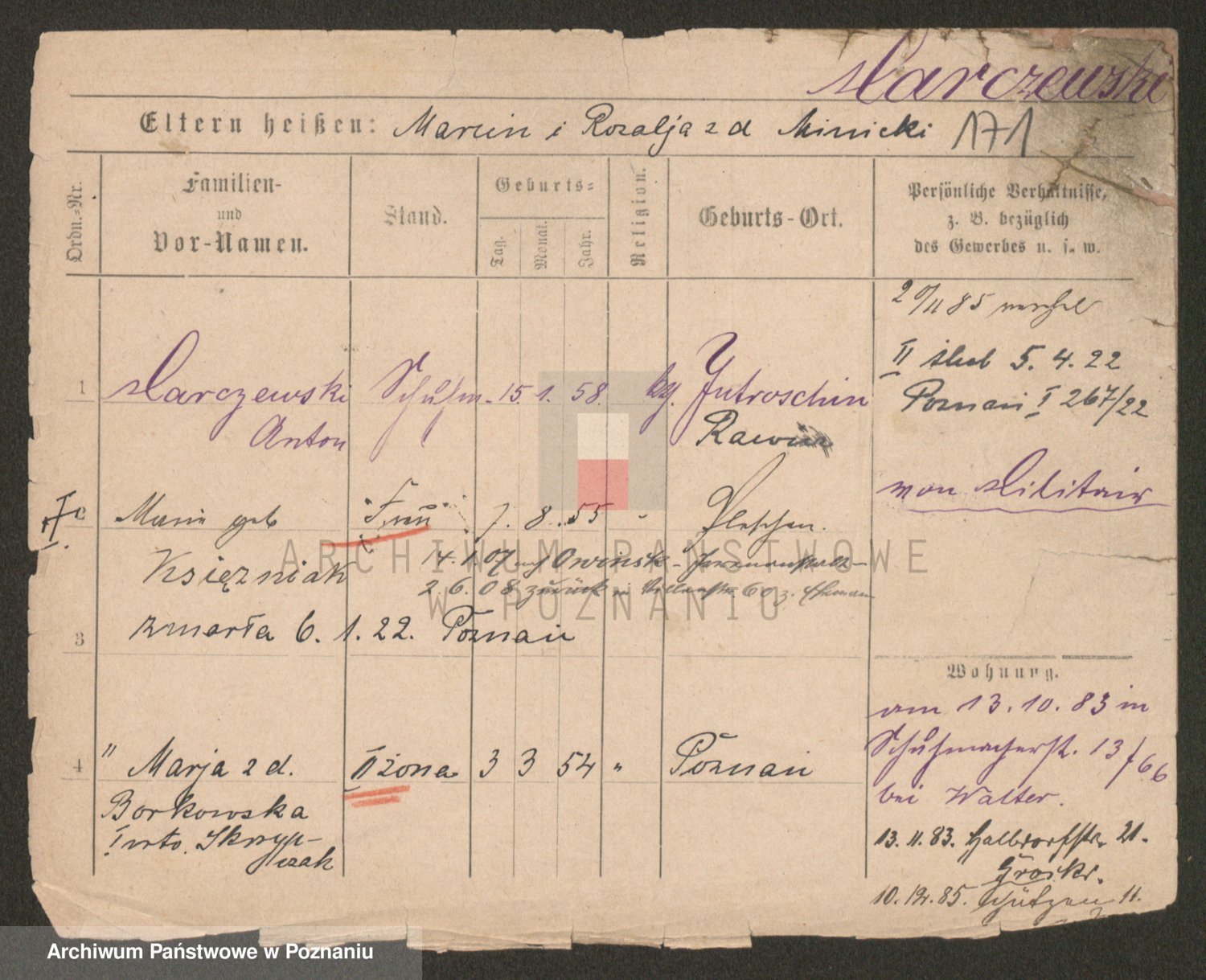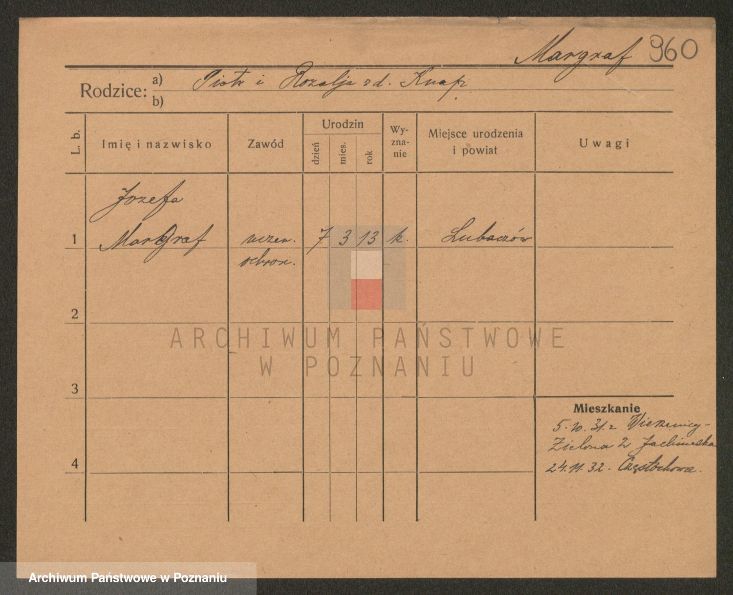 Podgląd karty osobowej dostępny jest po kliknięciu na nazwisko lub ikonkę karty. Można dokonywać powiększenia (ikony na górze) lub przechodzić między kolejnymi skanami (strzałki po bokach).