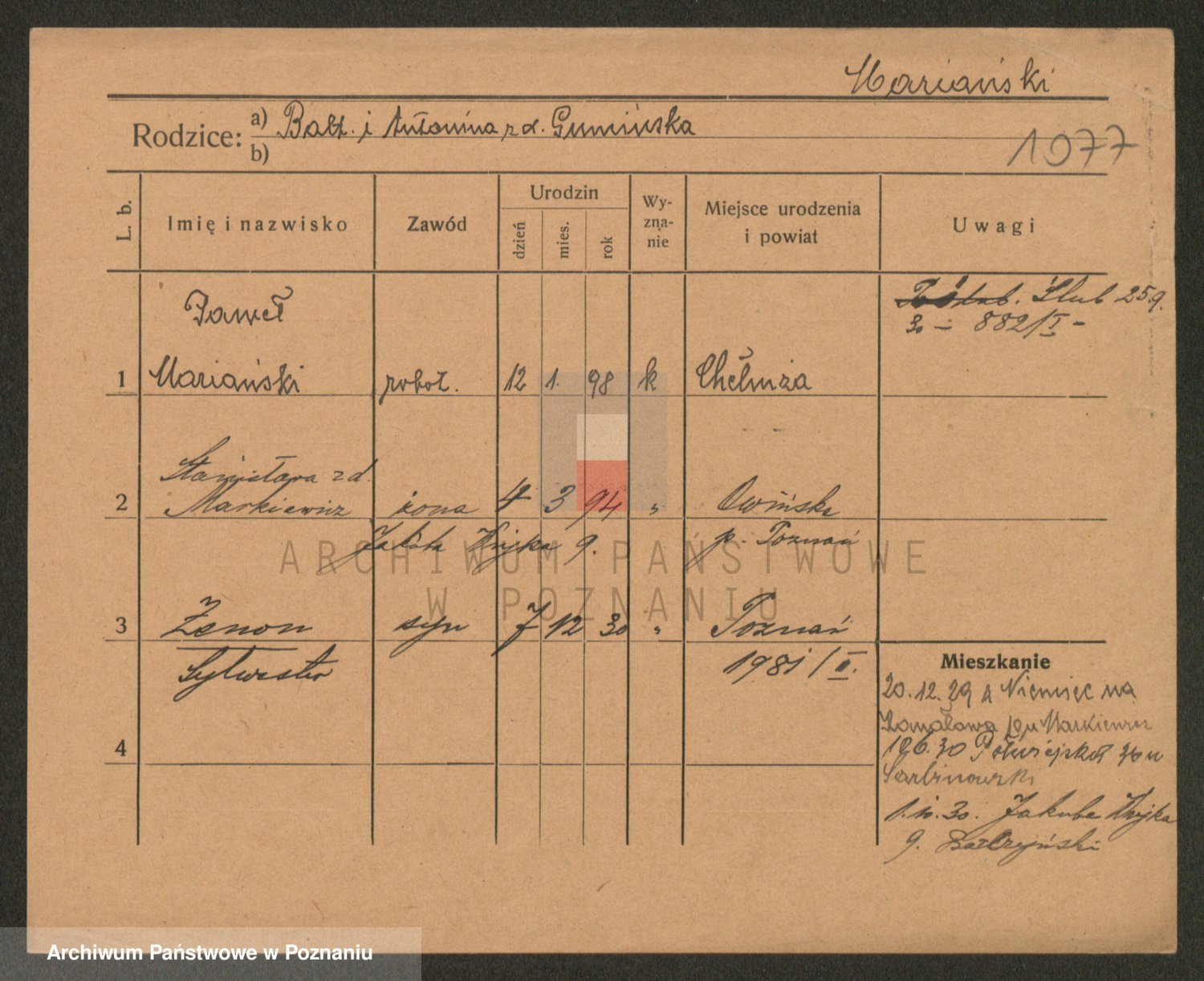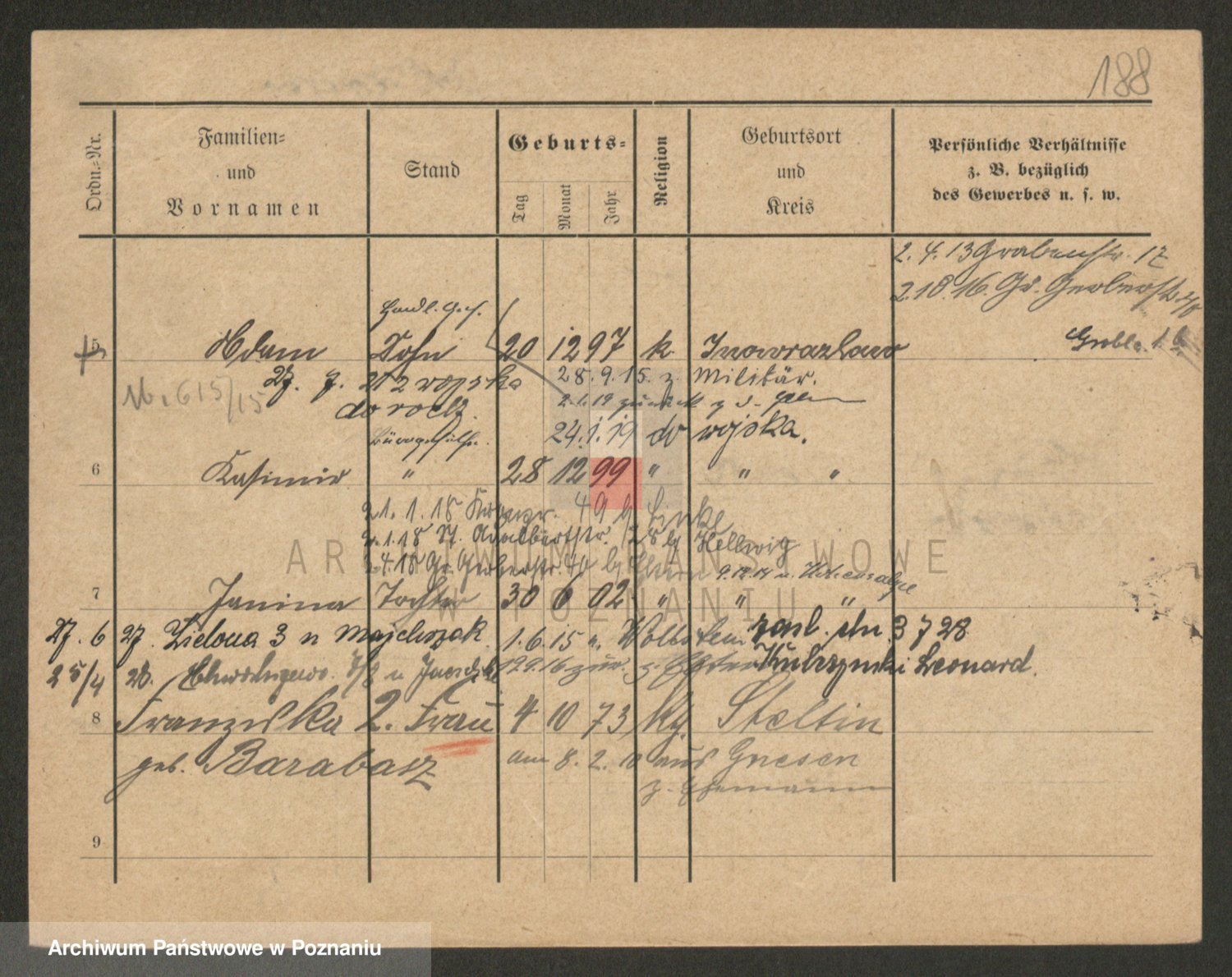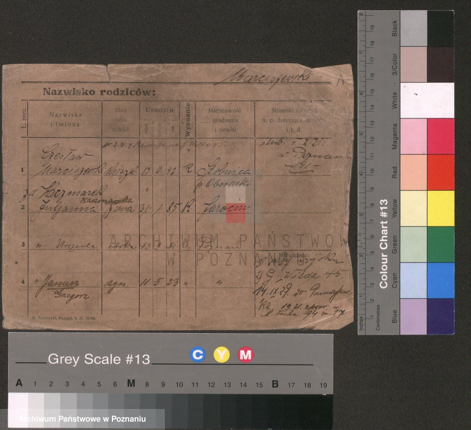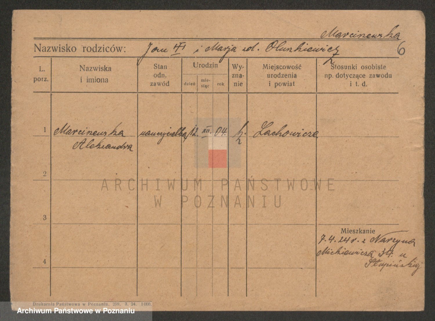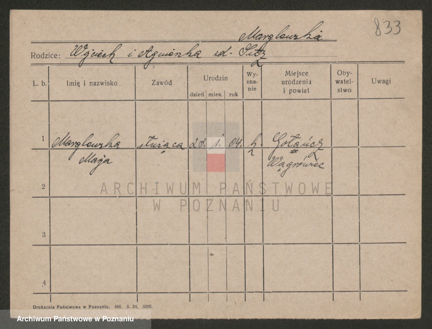Podgląd karty osobowej dostępny jest po kliknięciu na nazwisko lub ikonkę karty. Można dokonywać powiększenia (ikony na górze) lub przechodzić między kolejnymi skanami (strzałki po bokach).