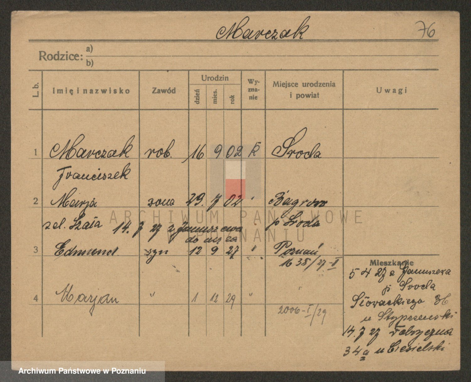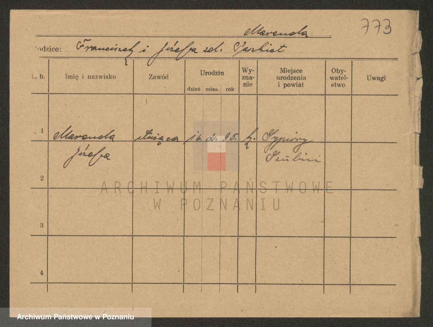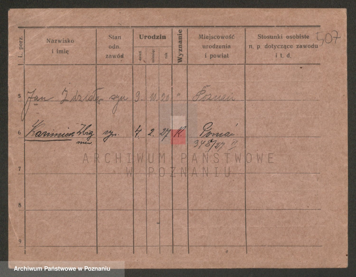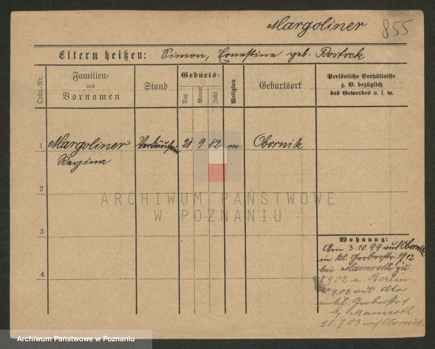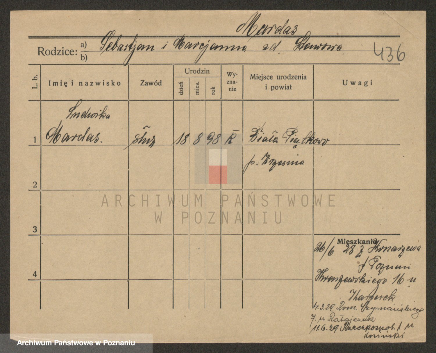Podgląd karty osobowej dostępny jest po kliknięciu na nazwisko lub ikonkę karty. Można dokonywać powiększenia (ikony na górze) lub przechodzić między kolejnymi skanami (strzałki po bokach).