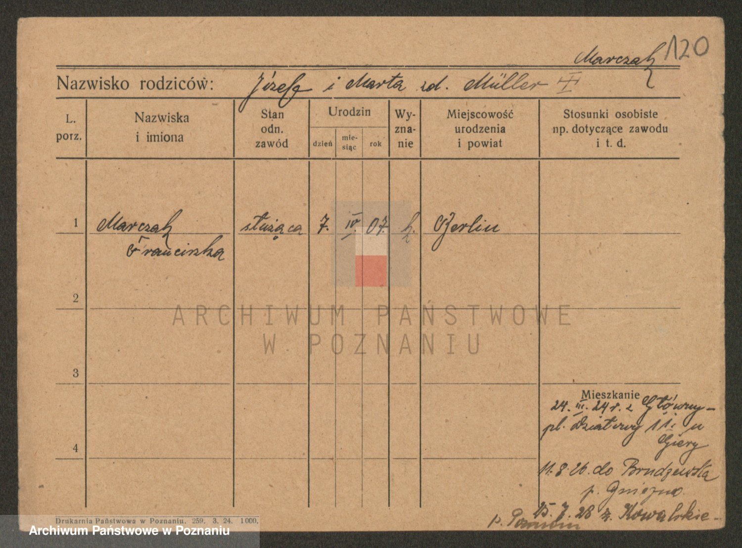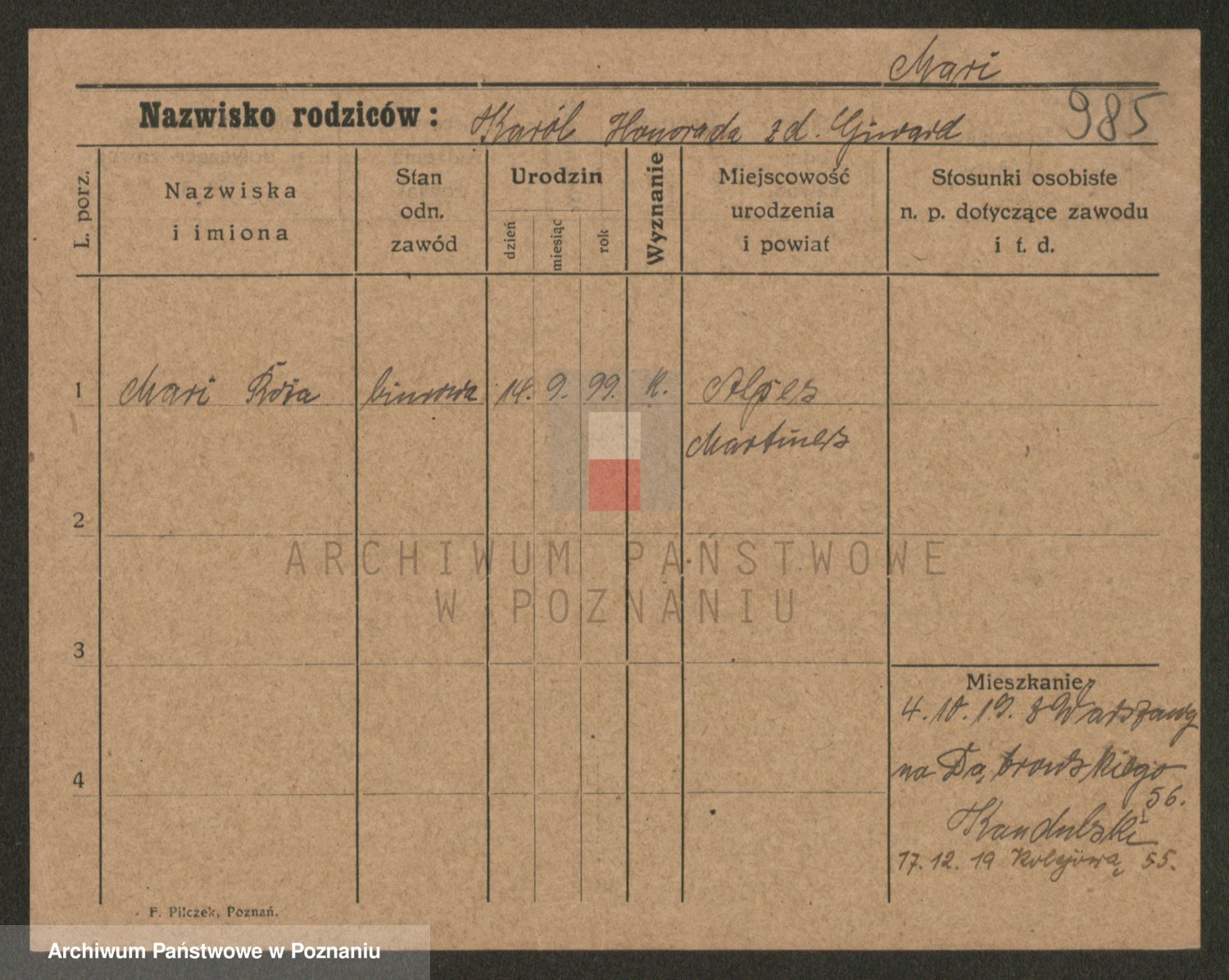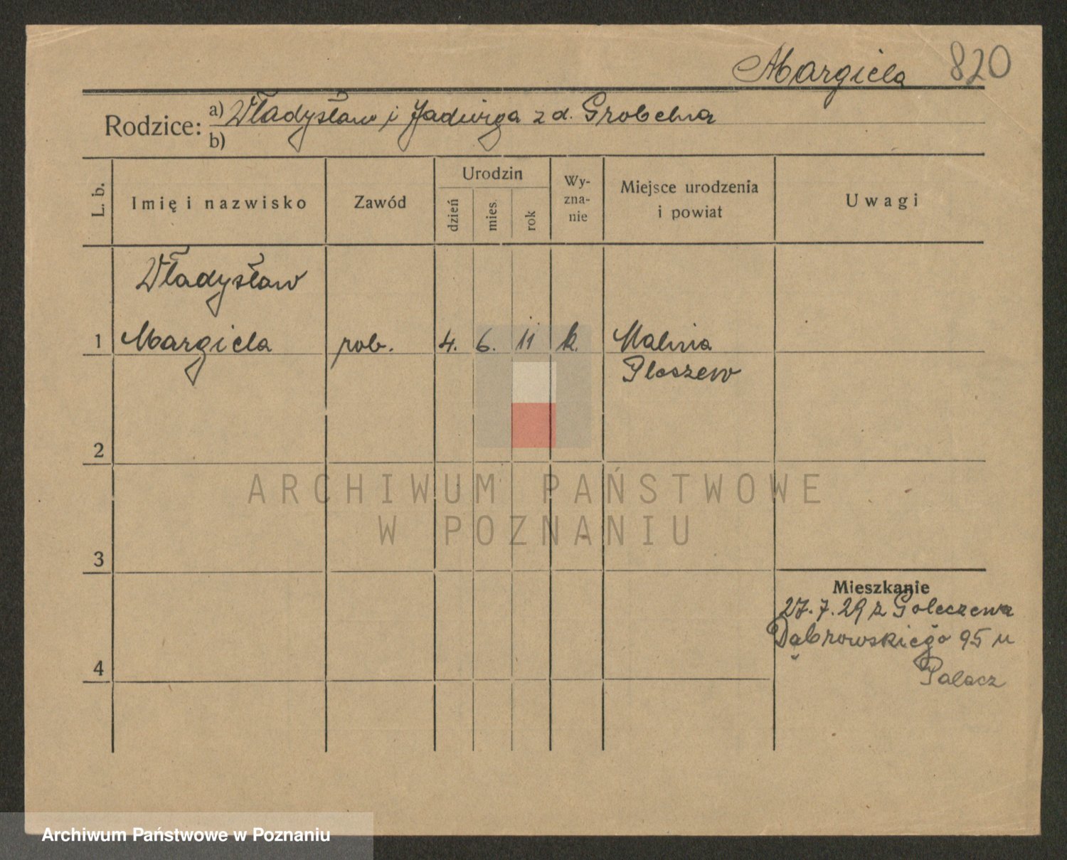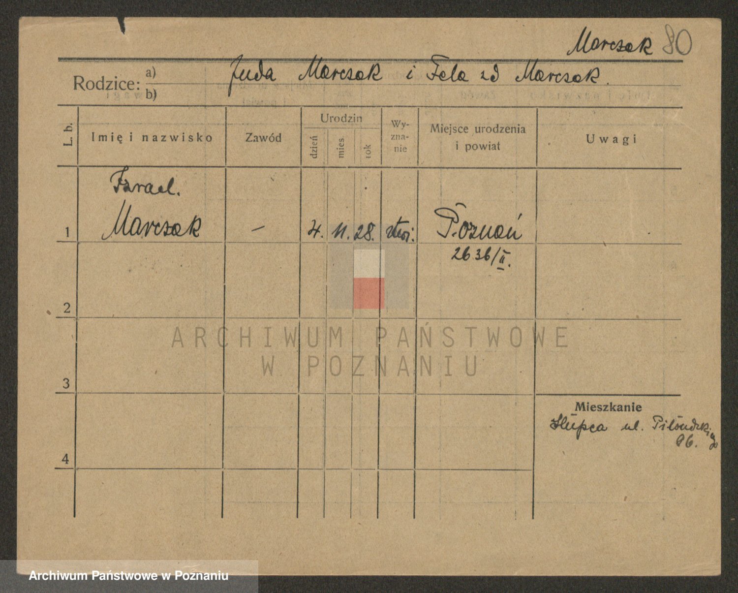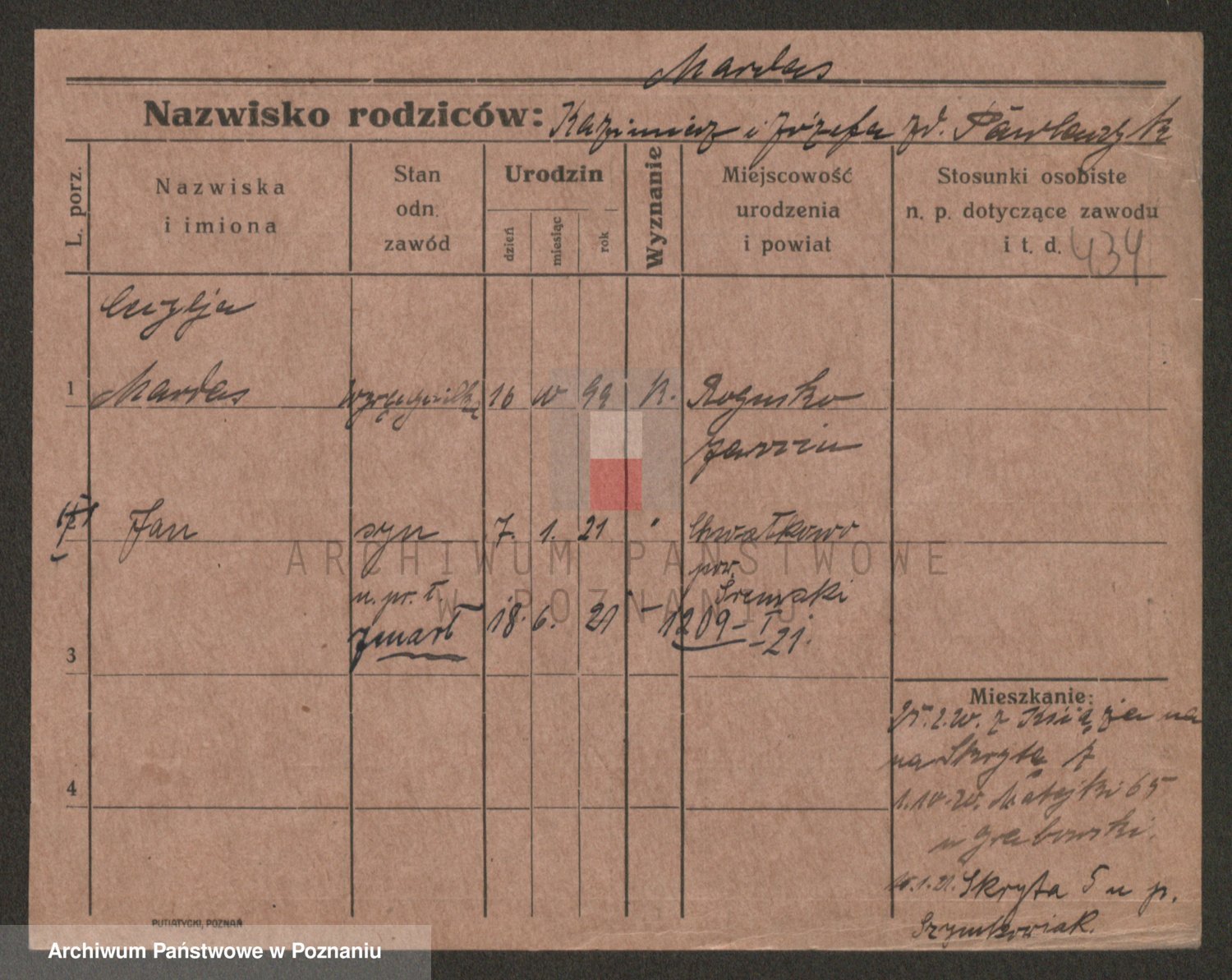 Podgląd karty osobowej dostępny jest po kliknięciu na nazwisko lub ikonkę karty. Można dokonywać powiększenia (ikony na górze) lub przechodzić między kolejnymi skanami (strzałki po bokach).