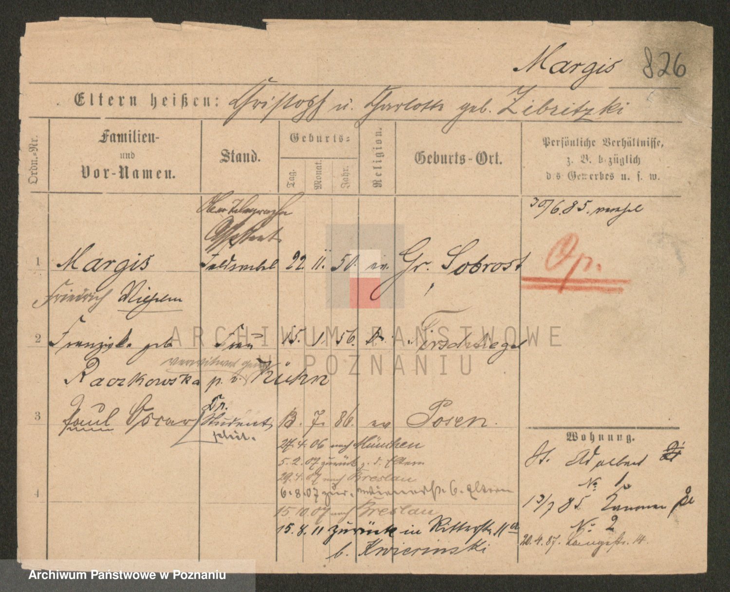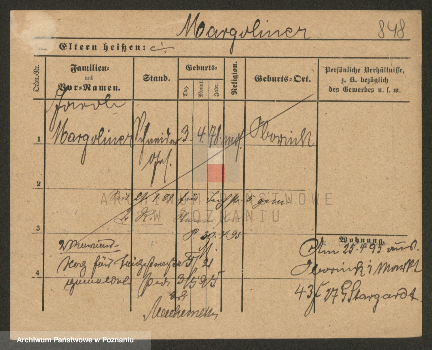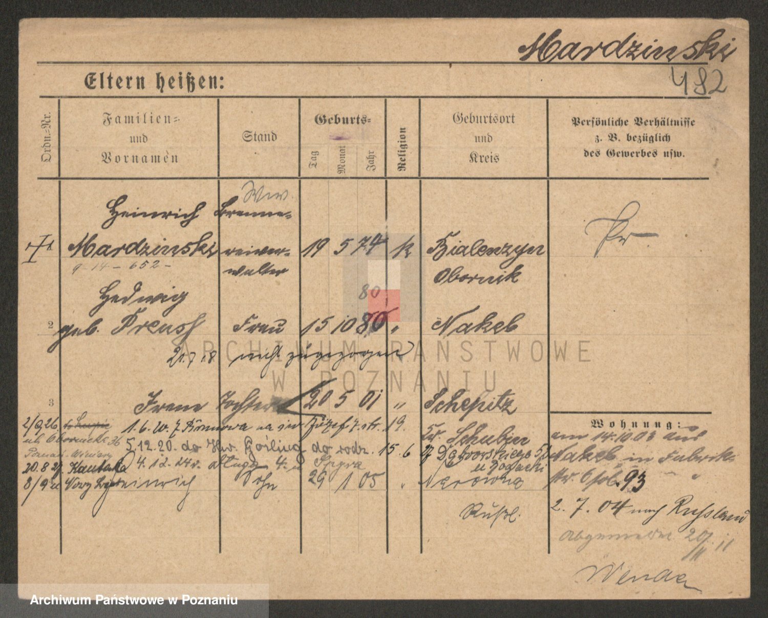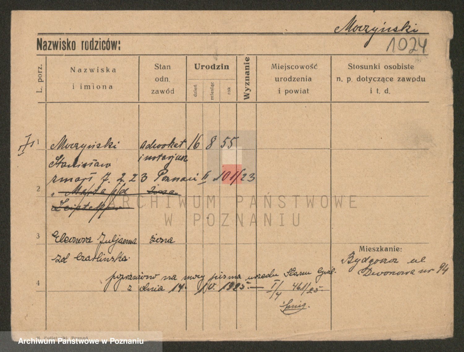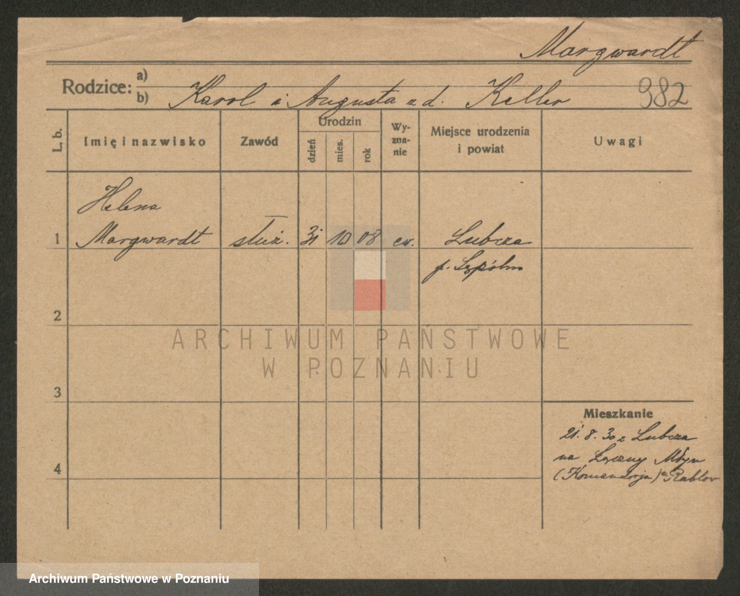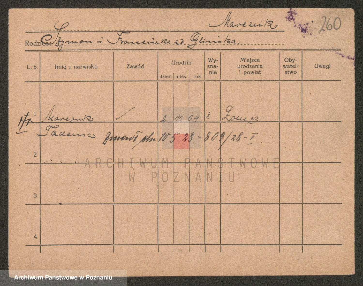 Podgląd karty osobowej dostępny jest po kliknięciu na nazwisko lub ikonkę karty. Można dokonywać powiększenia (ikony na górze) lub przechodzić między kolejnymi skanami (strzałki po bokach).