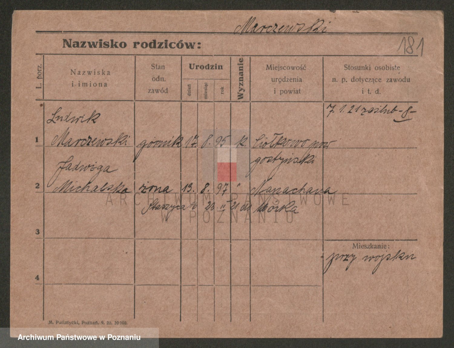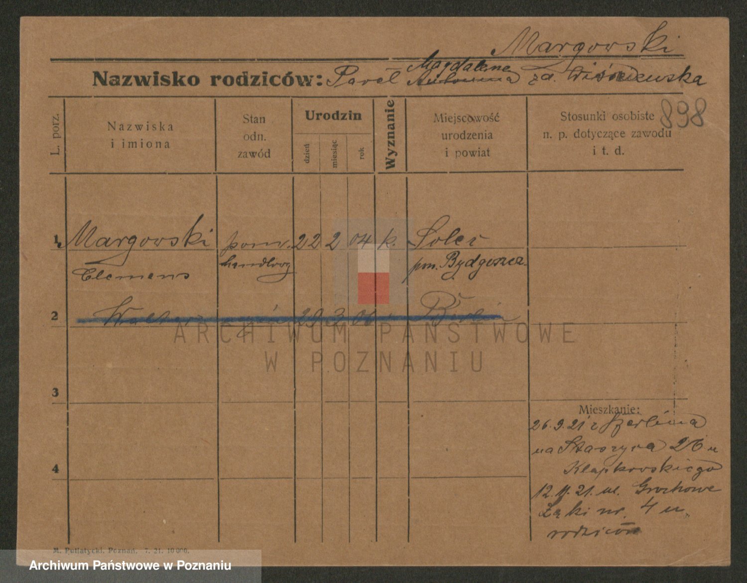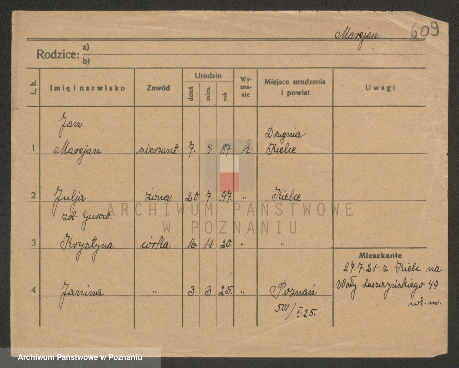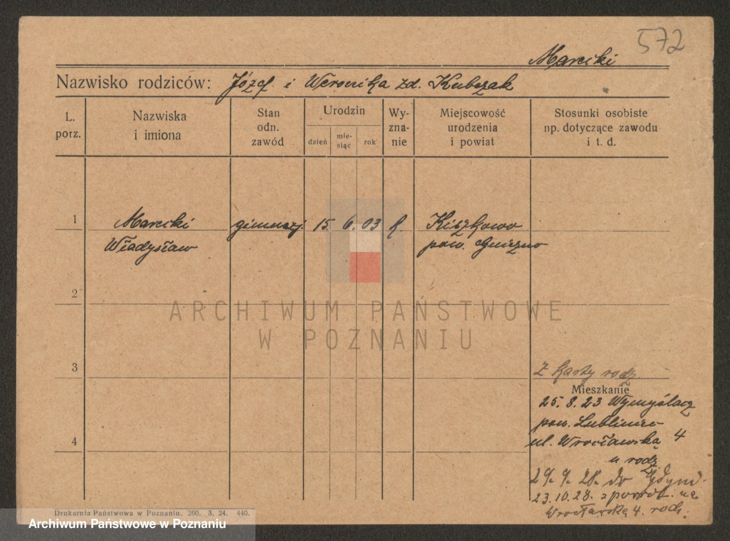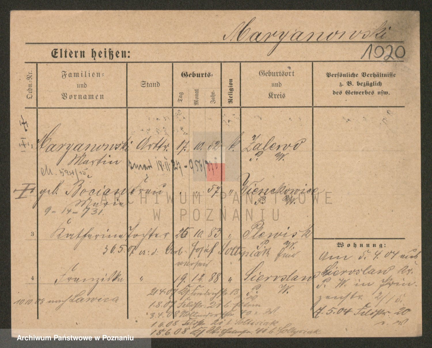 Podgląd karty osobowej dostępny jest po kliknięciu na nazwisko lub ikonkę karty. Można dokonywać powiększenia (ikony na górze) lub przechodzić między kolejnymi skanami (strzałki po bokach).
