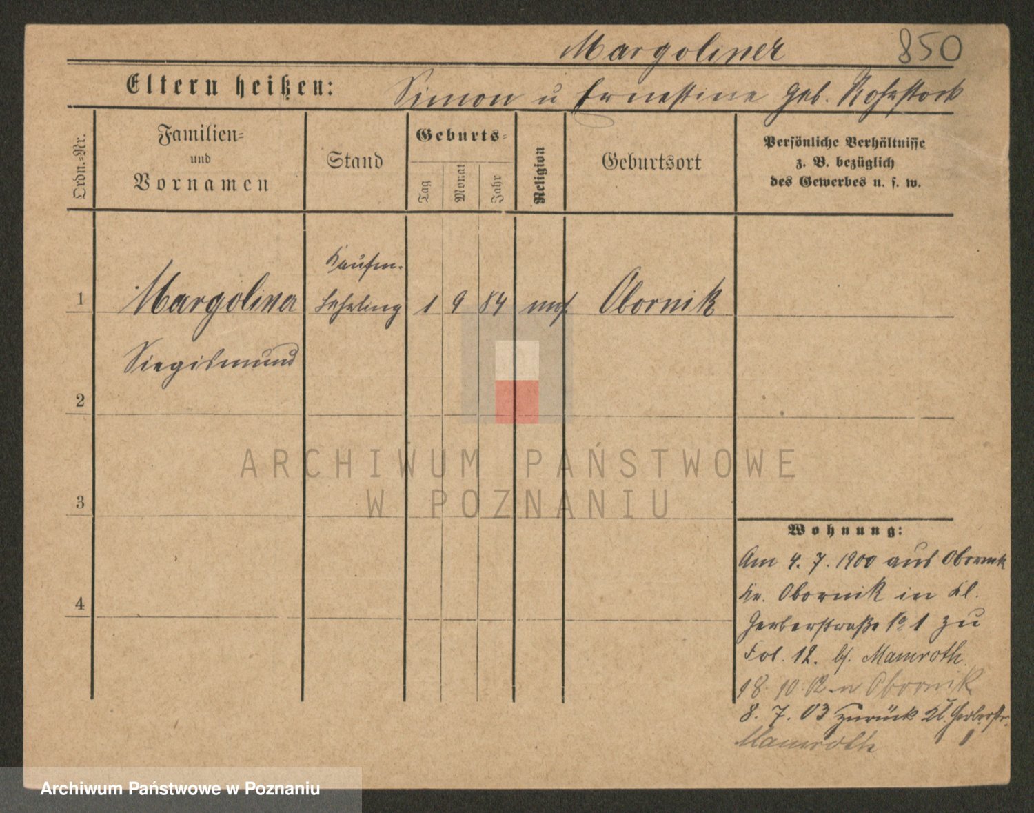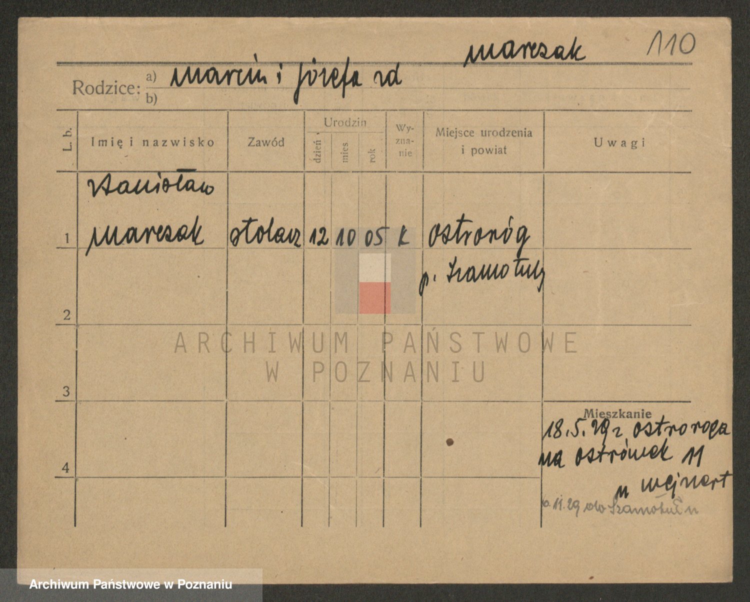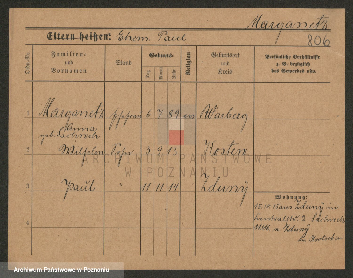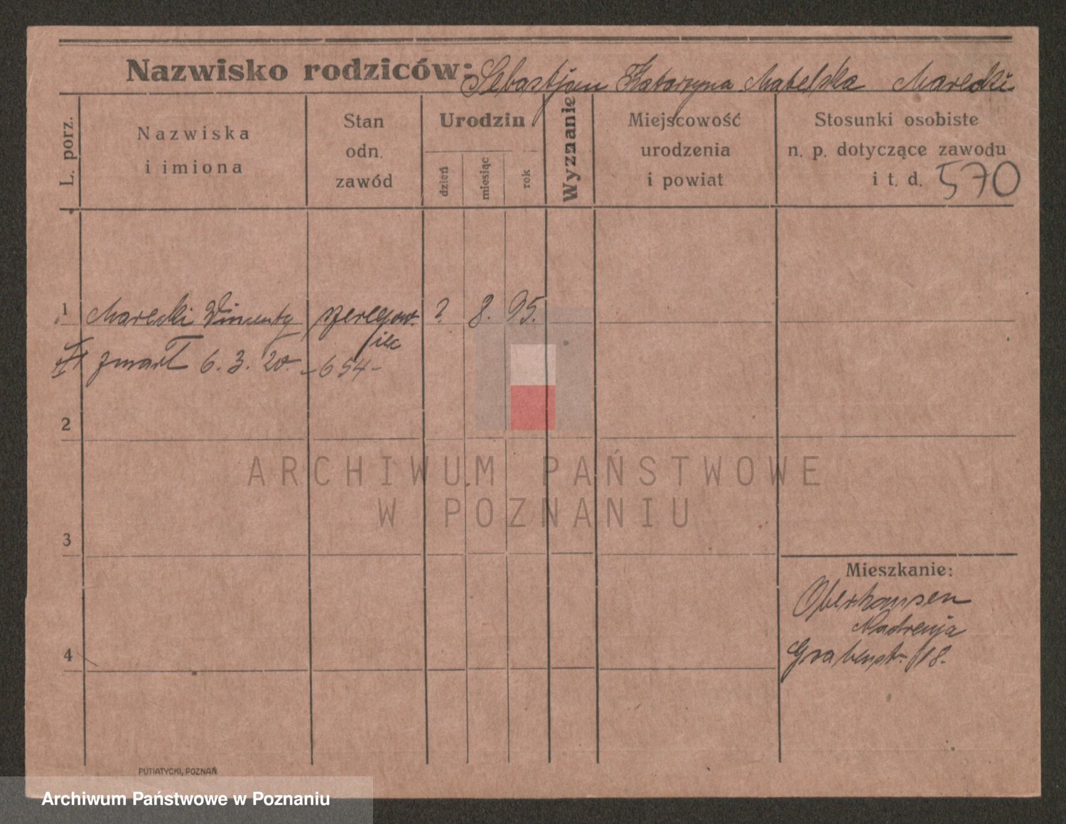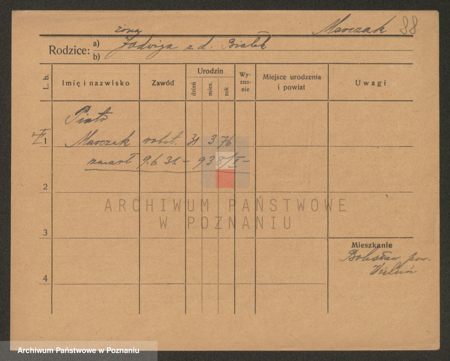 Podgląd karty osobowej dostępny jest po kliknięciu na nazwisko lub ikonkę karty. Można dokonywać powiększenia (ikony na górze) lub przechodzić między kolejnymi skanami (strzałki po bokach).