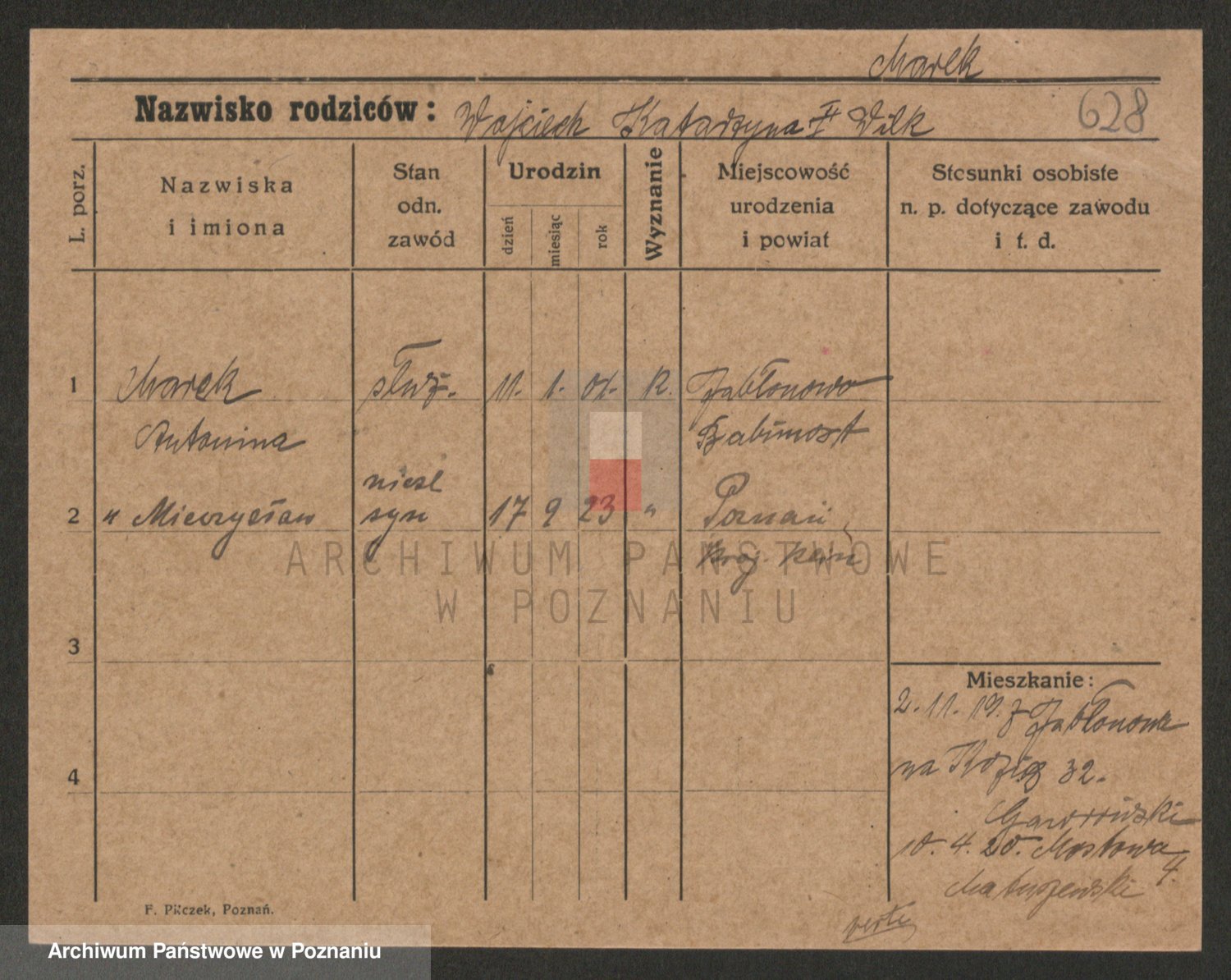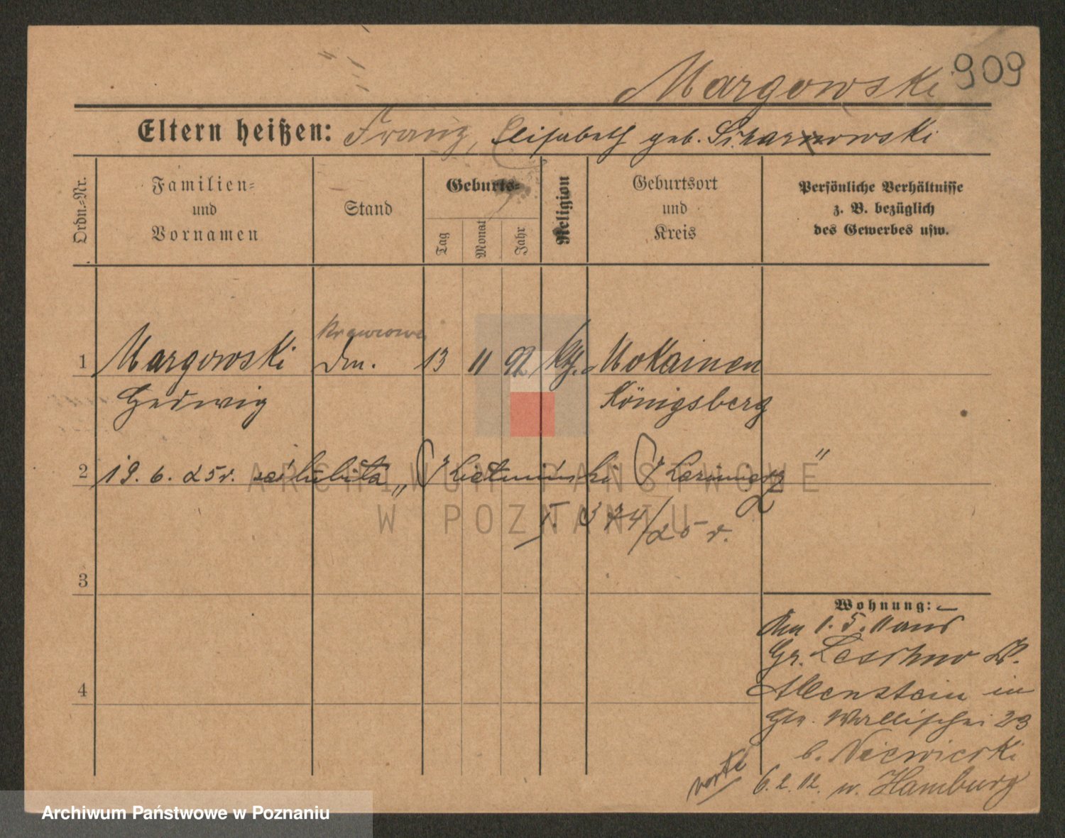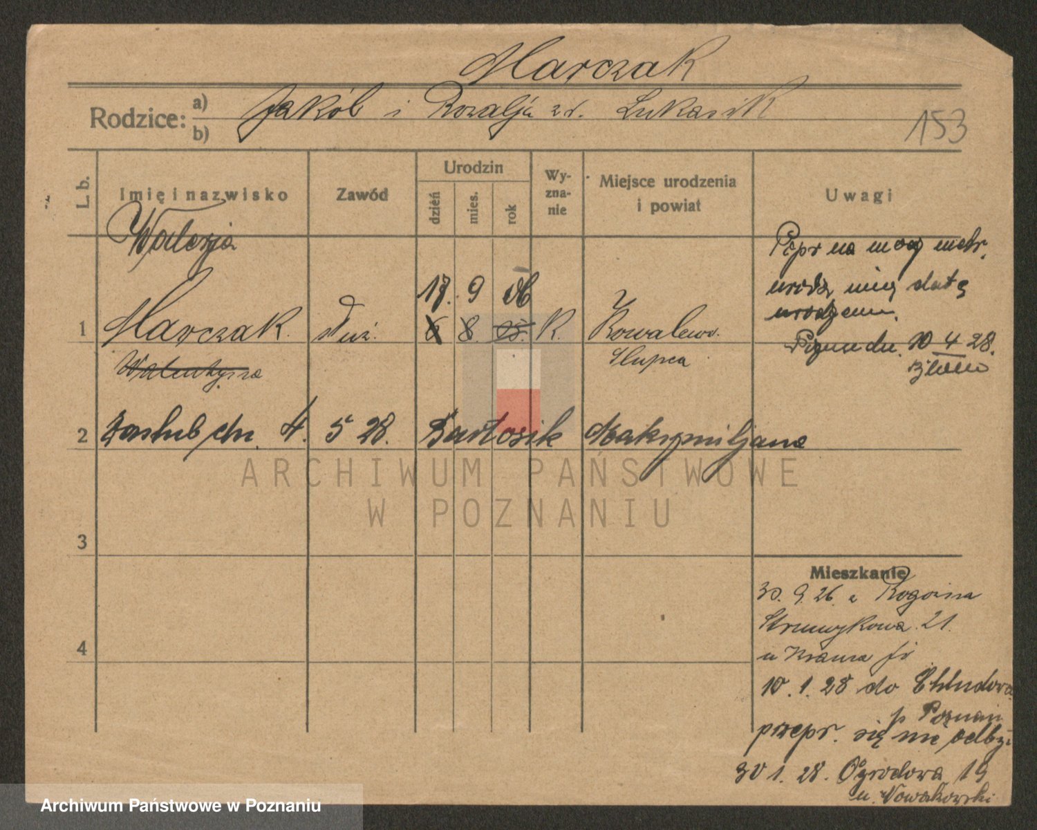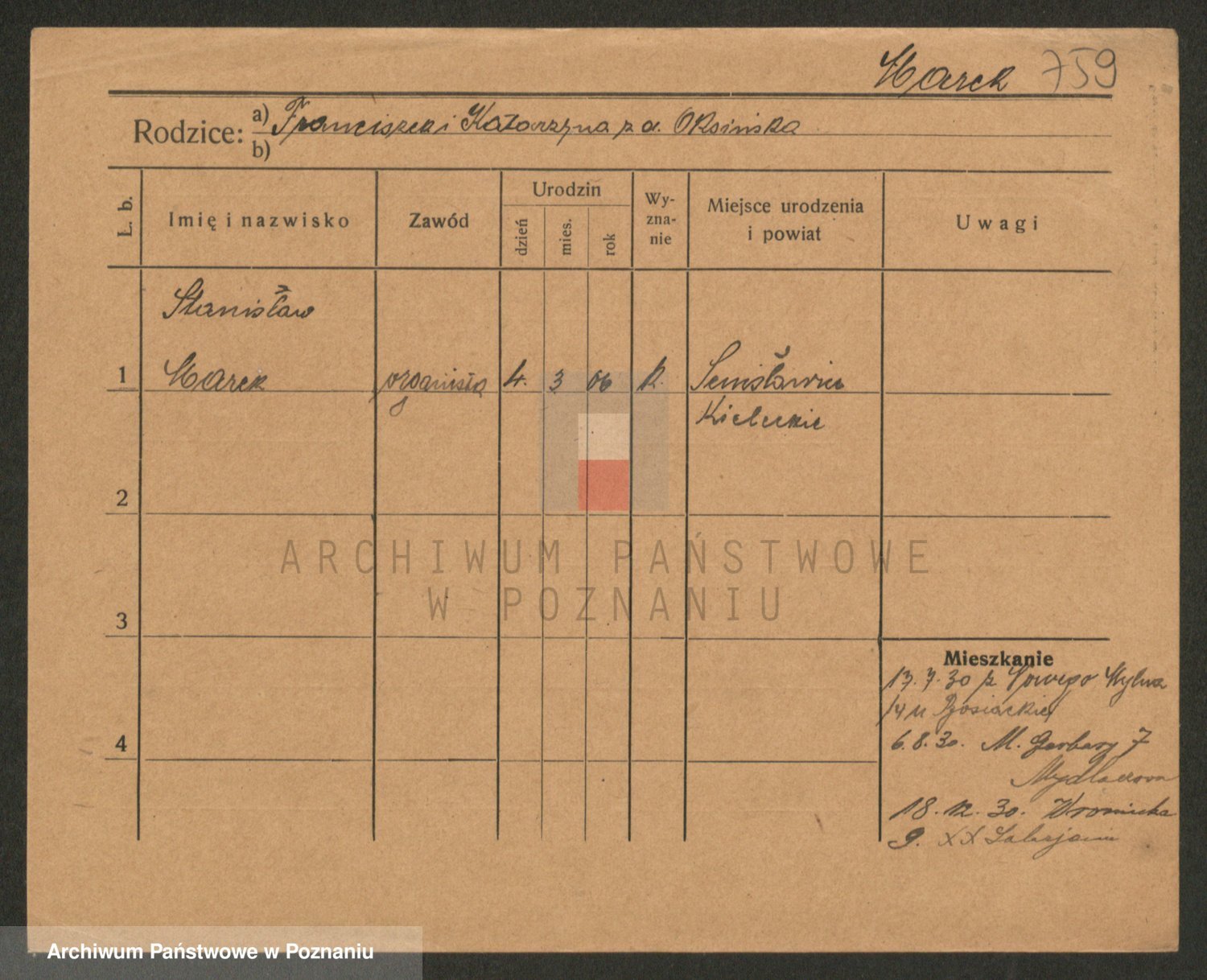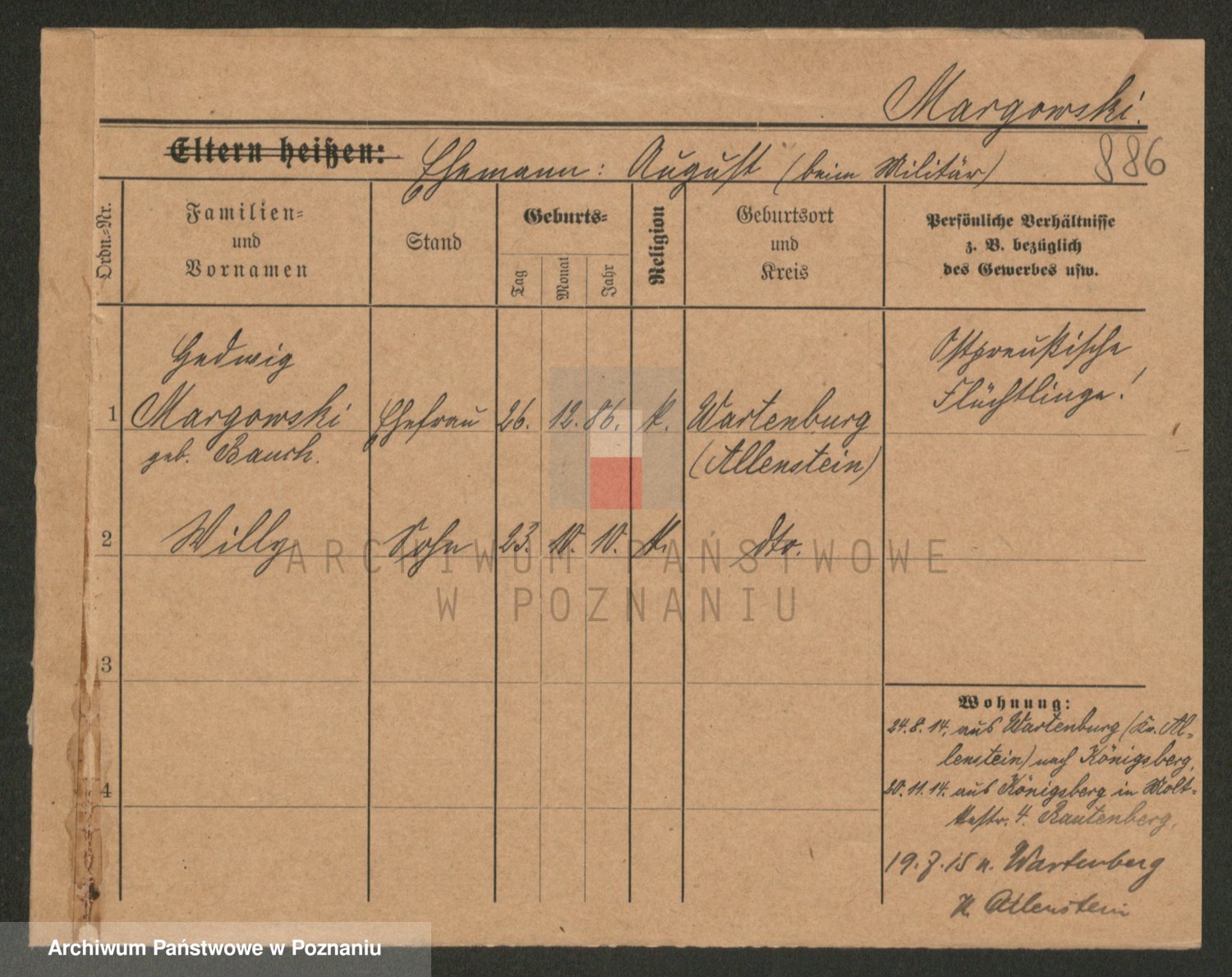 Podgląd karty osobowej dostępny jest po kliknięciu na nazwisko lub ikonkę karty. Można dokonywać powiększenia (ikony na górze) lub przechodzić między kolejnymi skanami (strzałki po bokach).