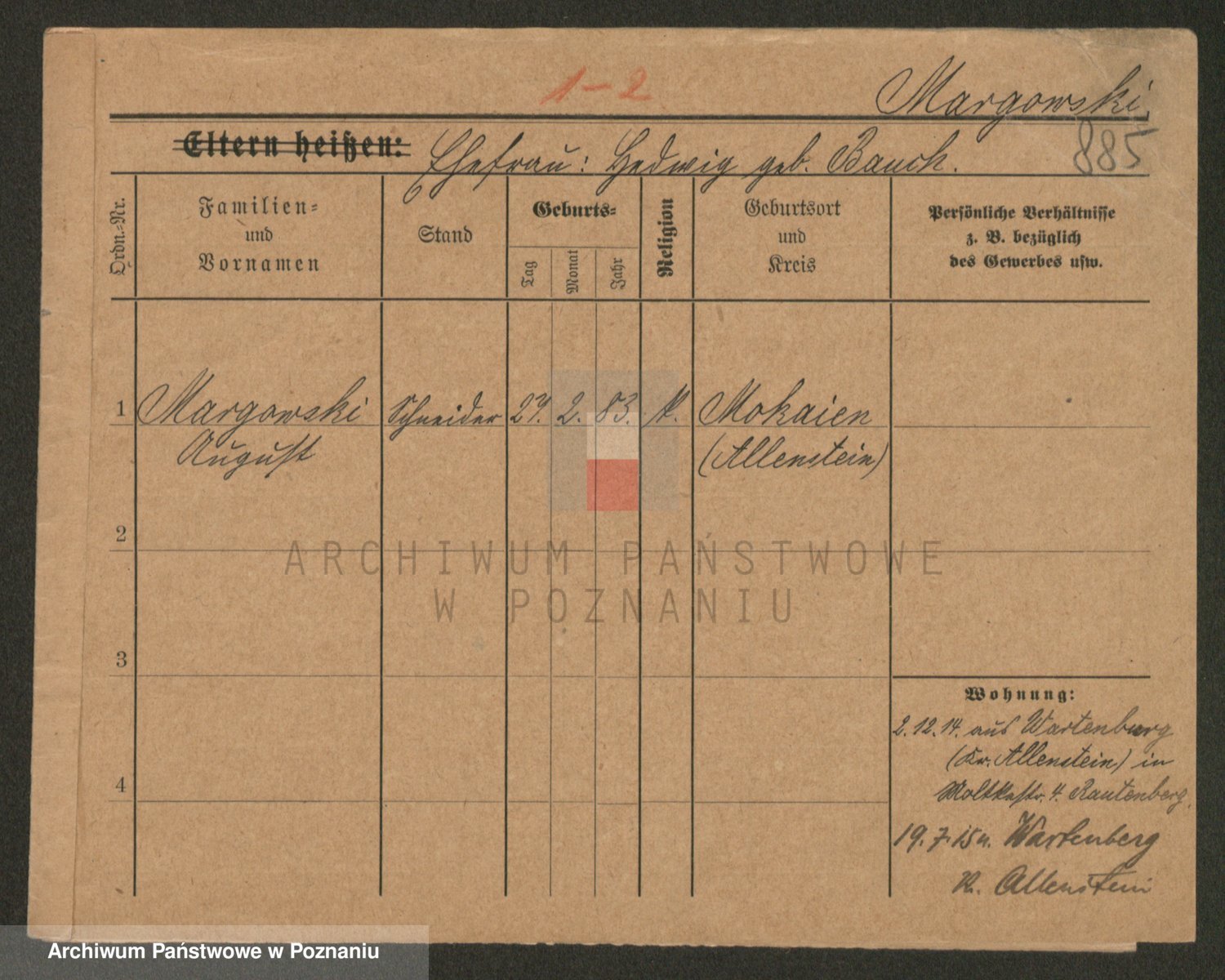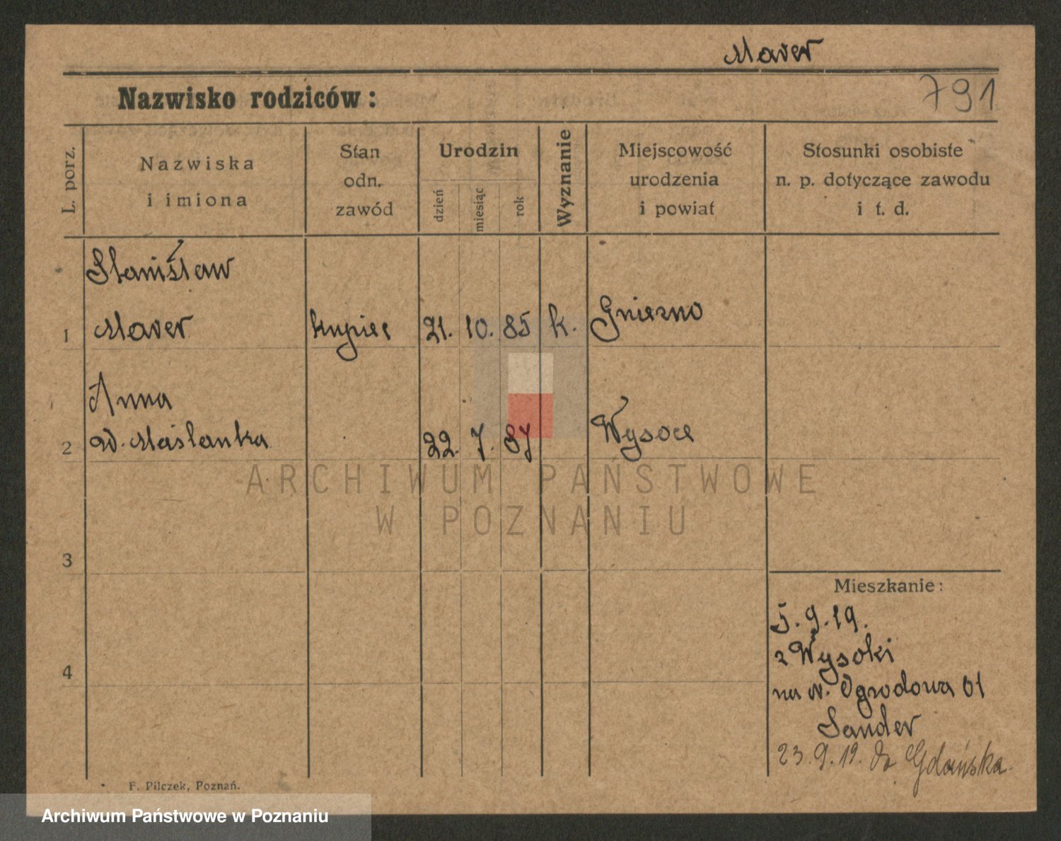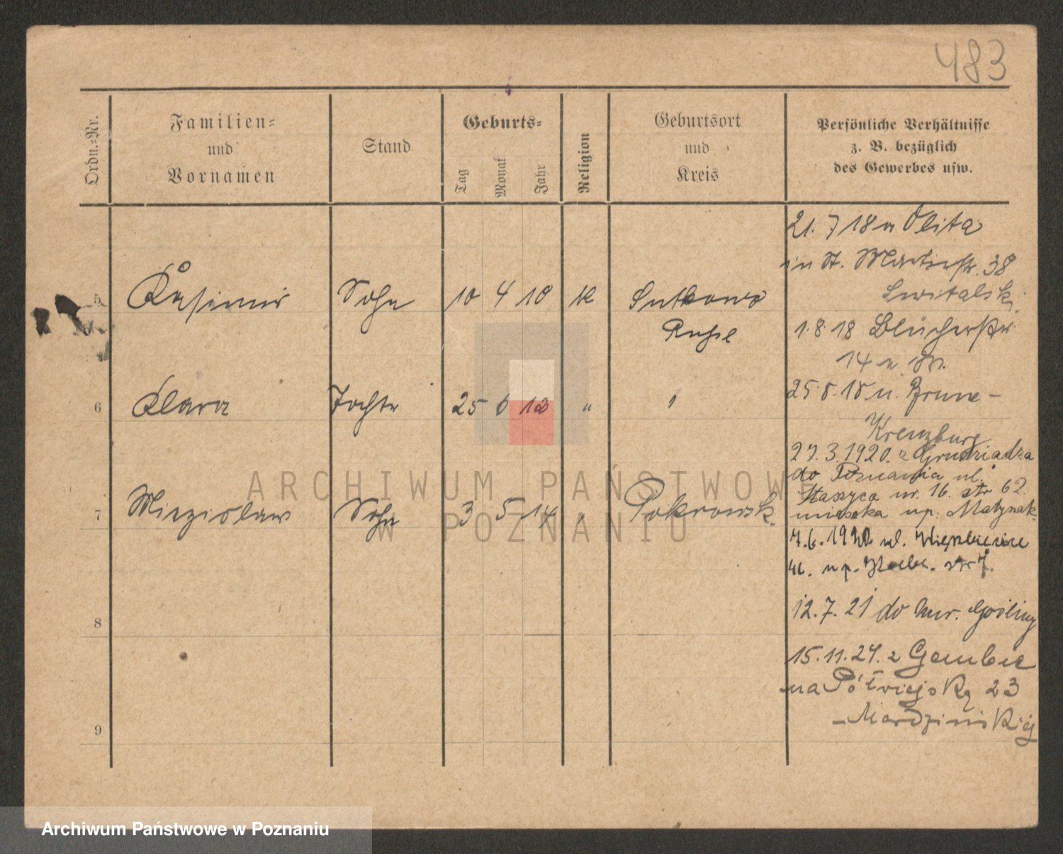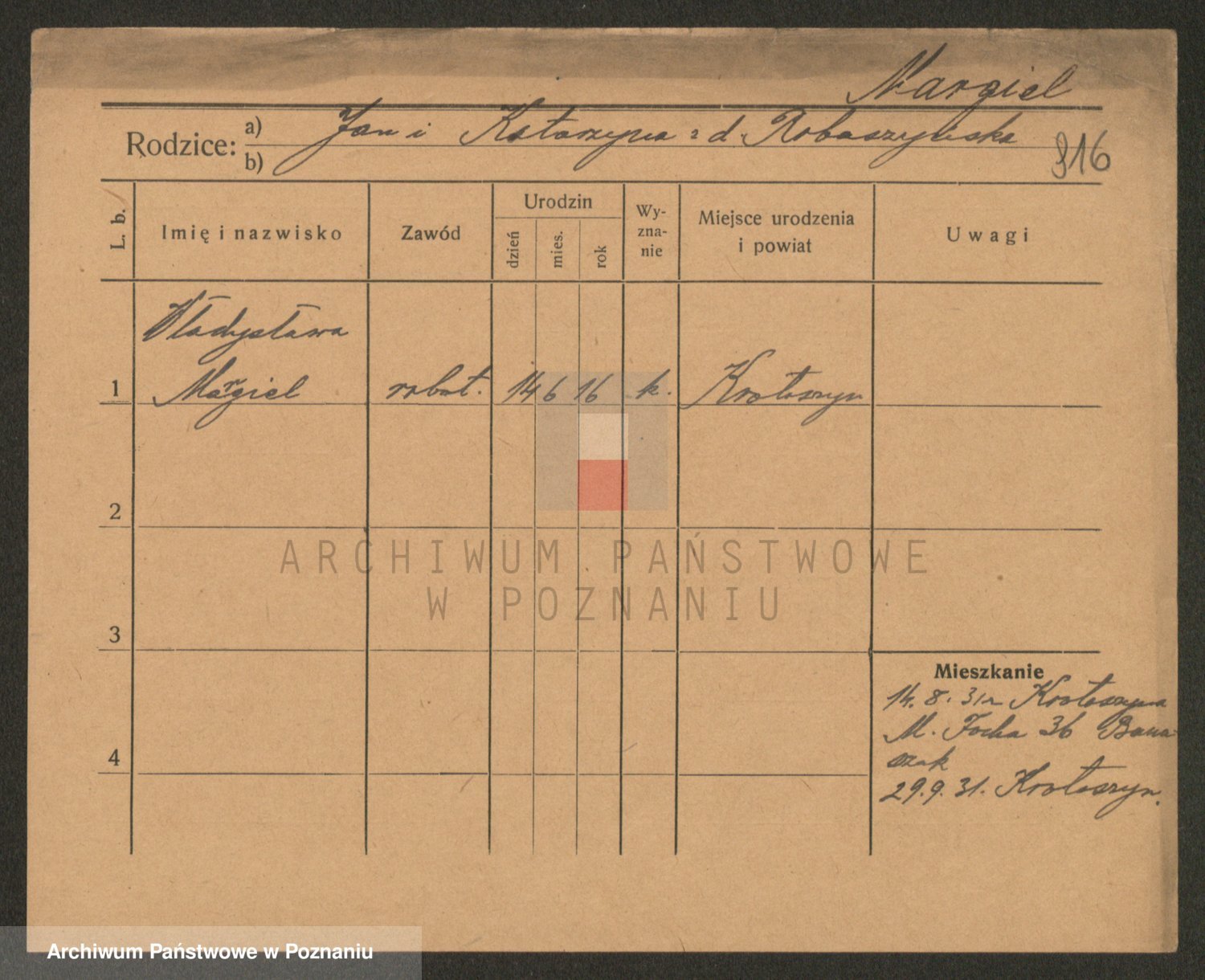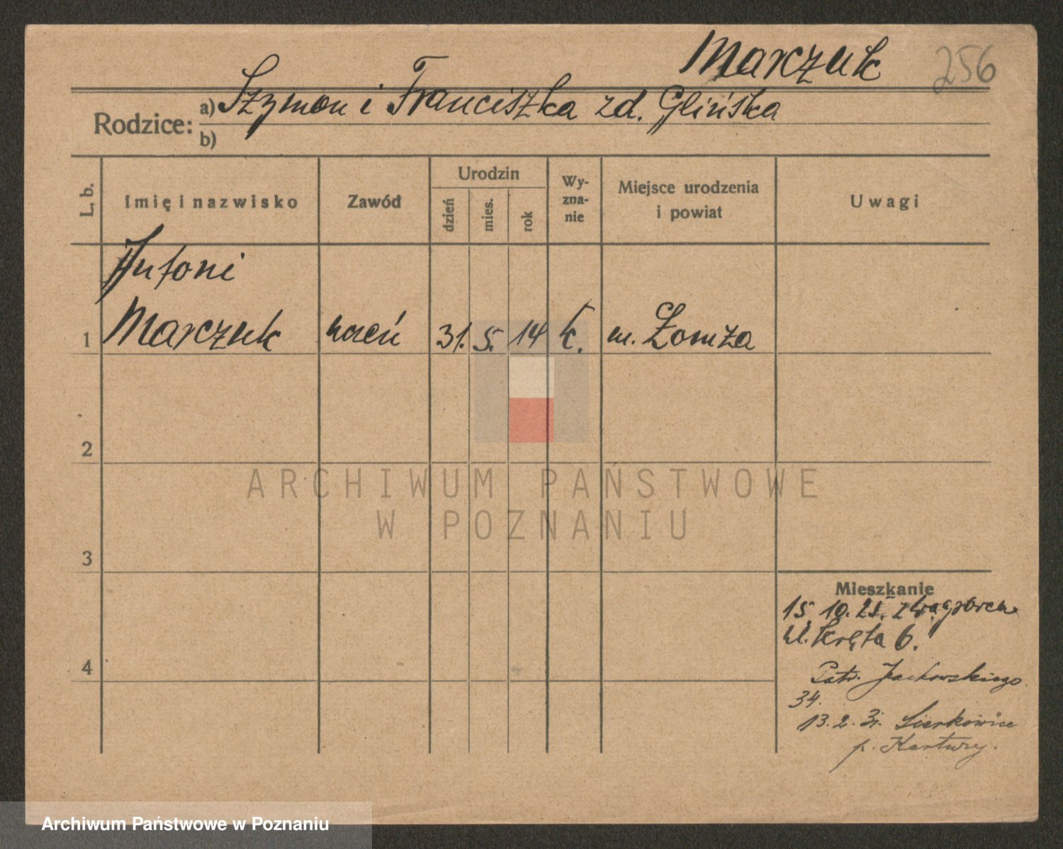 Podgląd karty osobowej dostępny jest po kliknięciu na nazwisko lub ikonkę karty. Można dokonywać powiększenia (ikony na górze) lub przechodzić między kolejnymi skanami (strzałki po bokach).