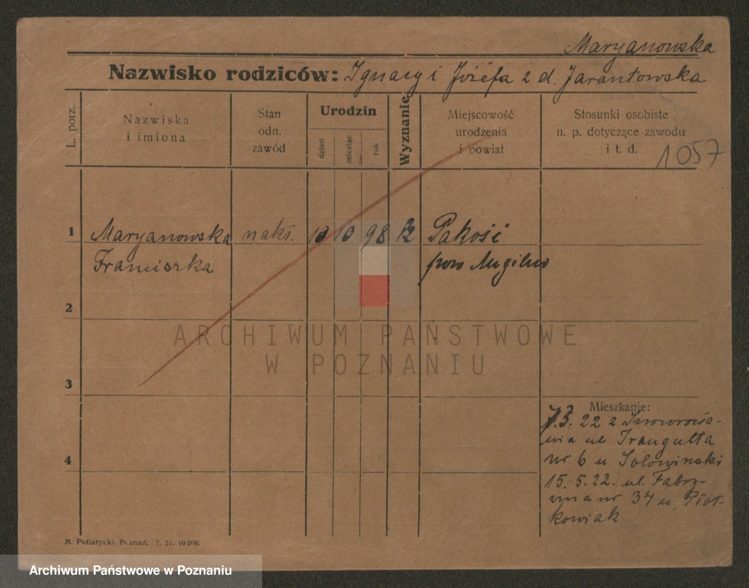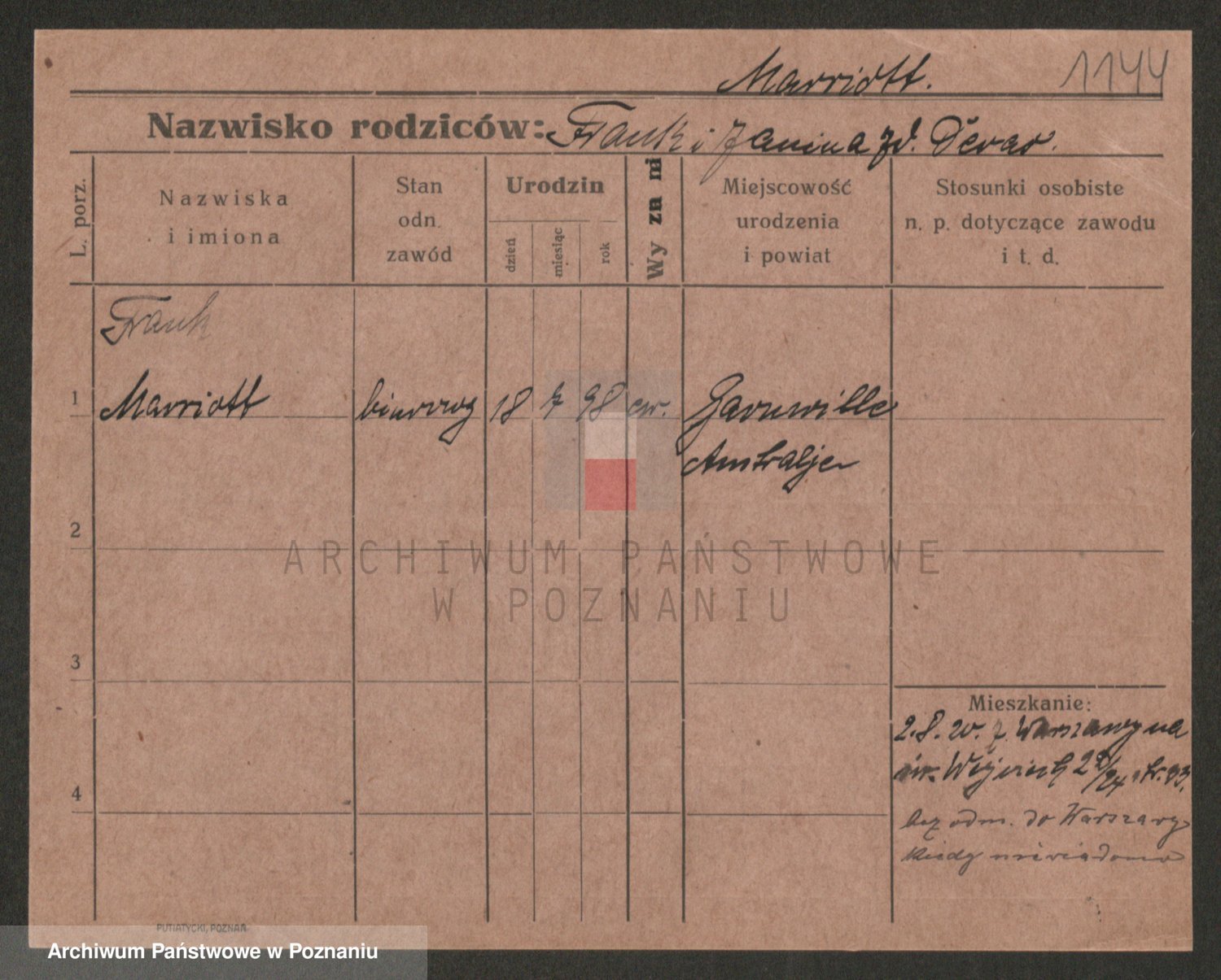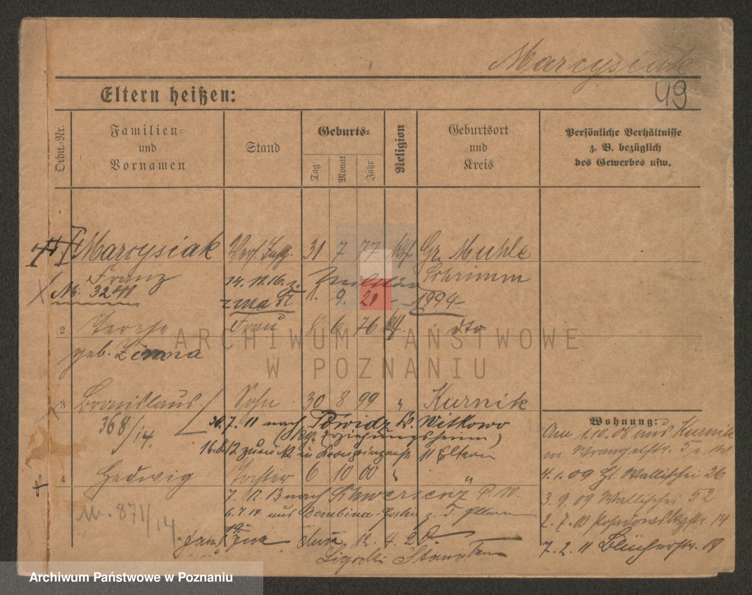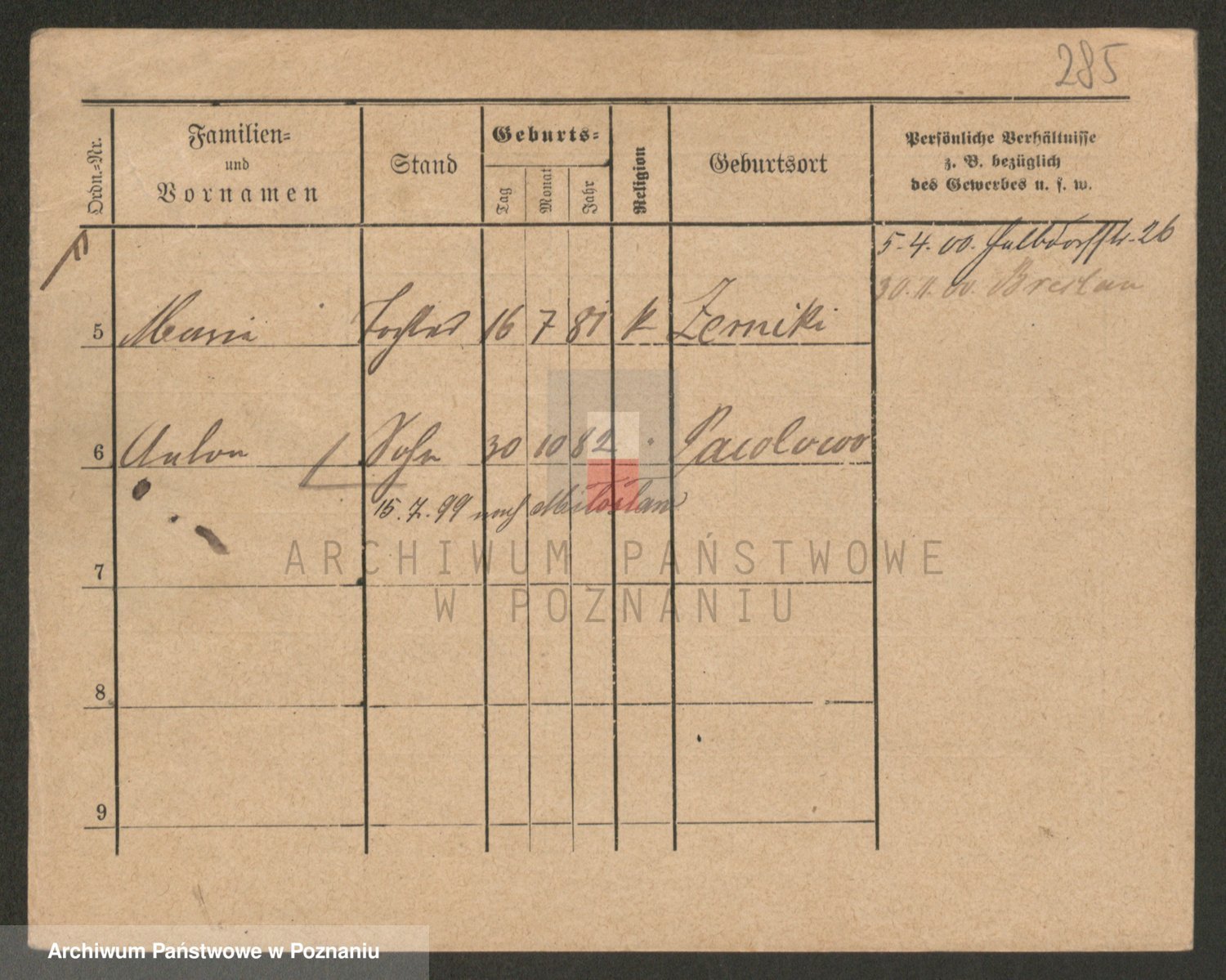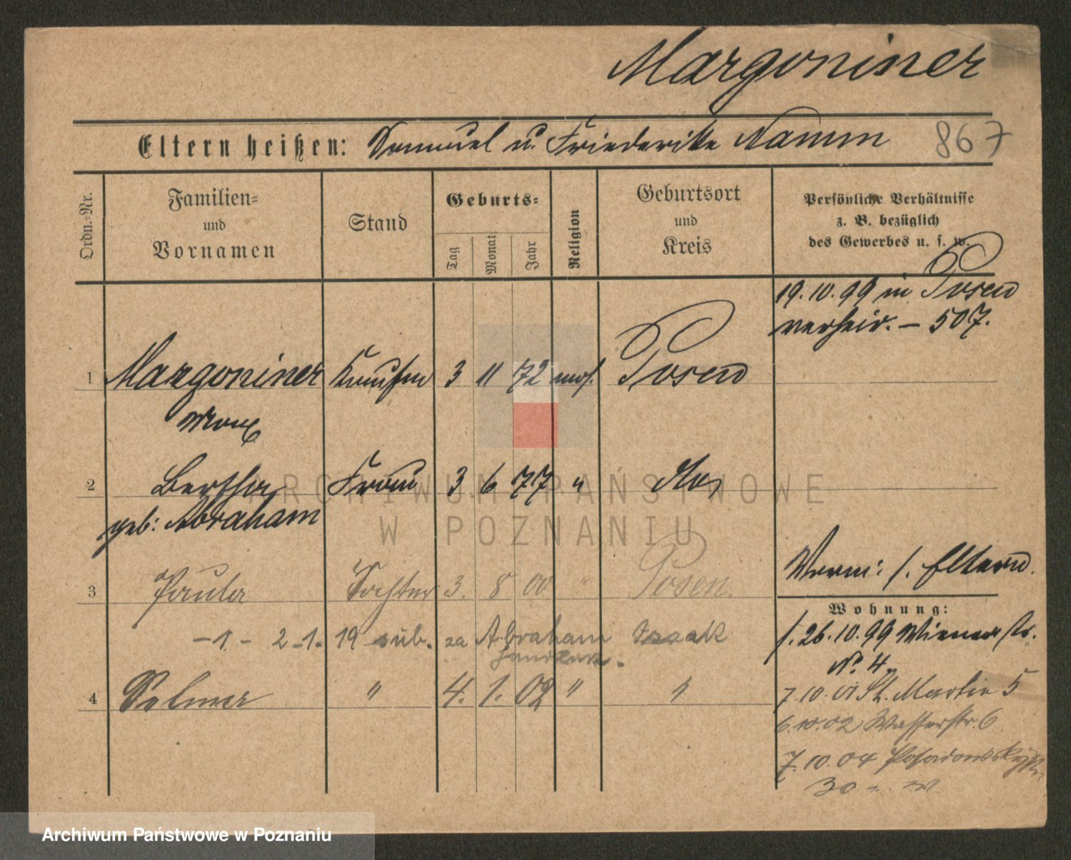 Podgląd karty osobowej dostępny jest po kliknięciu na nazwisko lub ikonkę karty. Można dokonywać powiększenia (ikony na górze) lub przechodzić między kolejnymi skanami (strzałki po bokach).