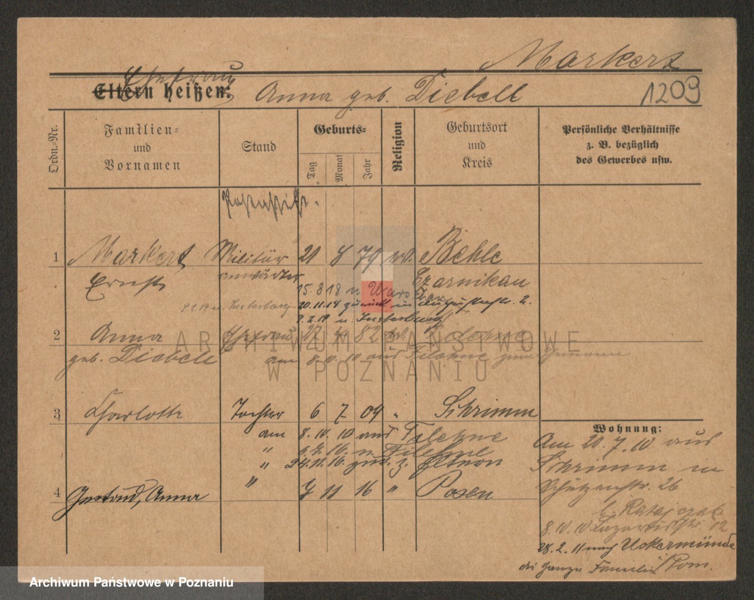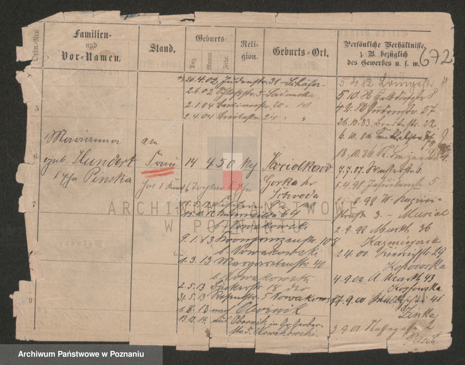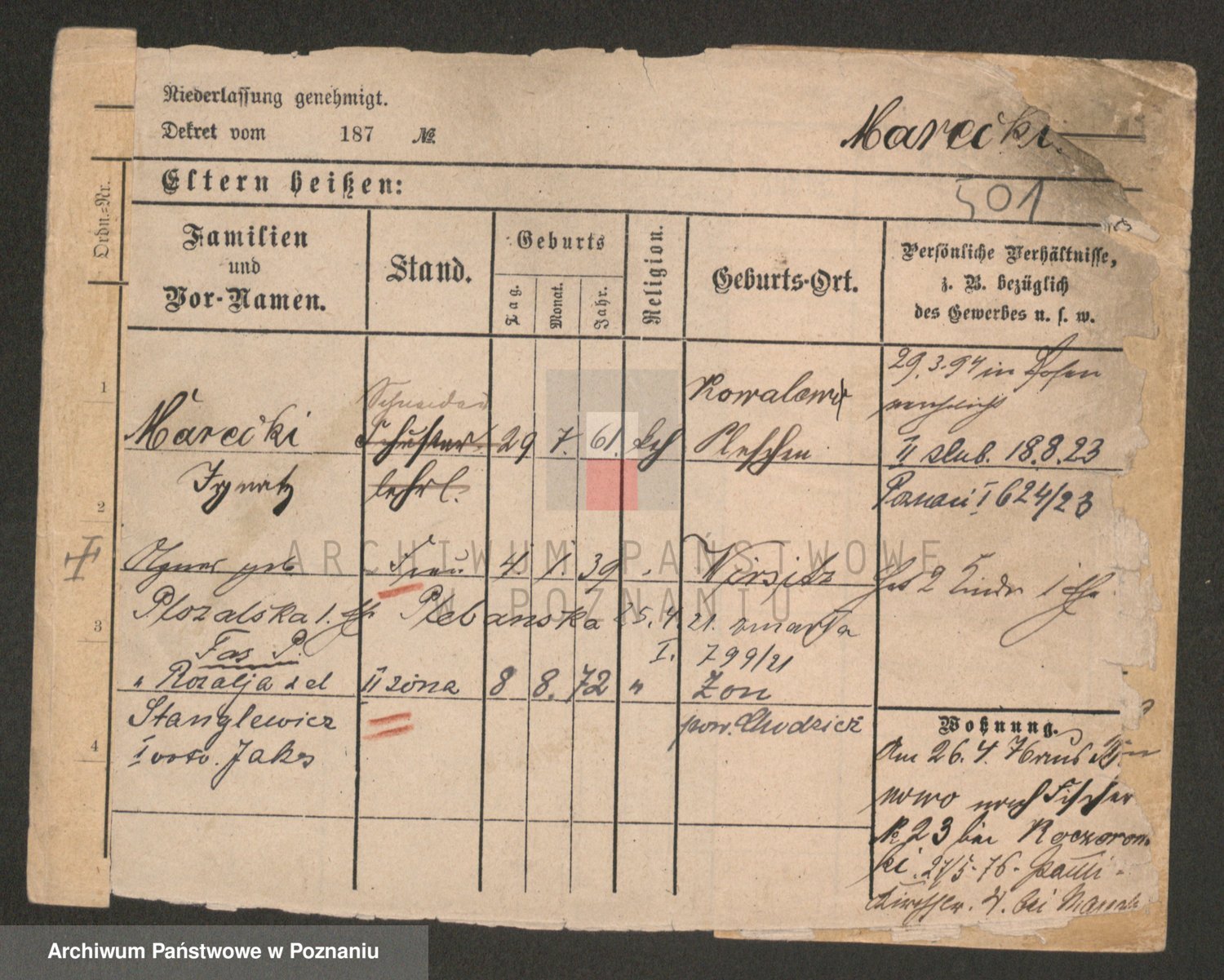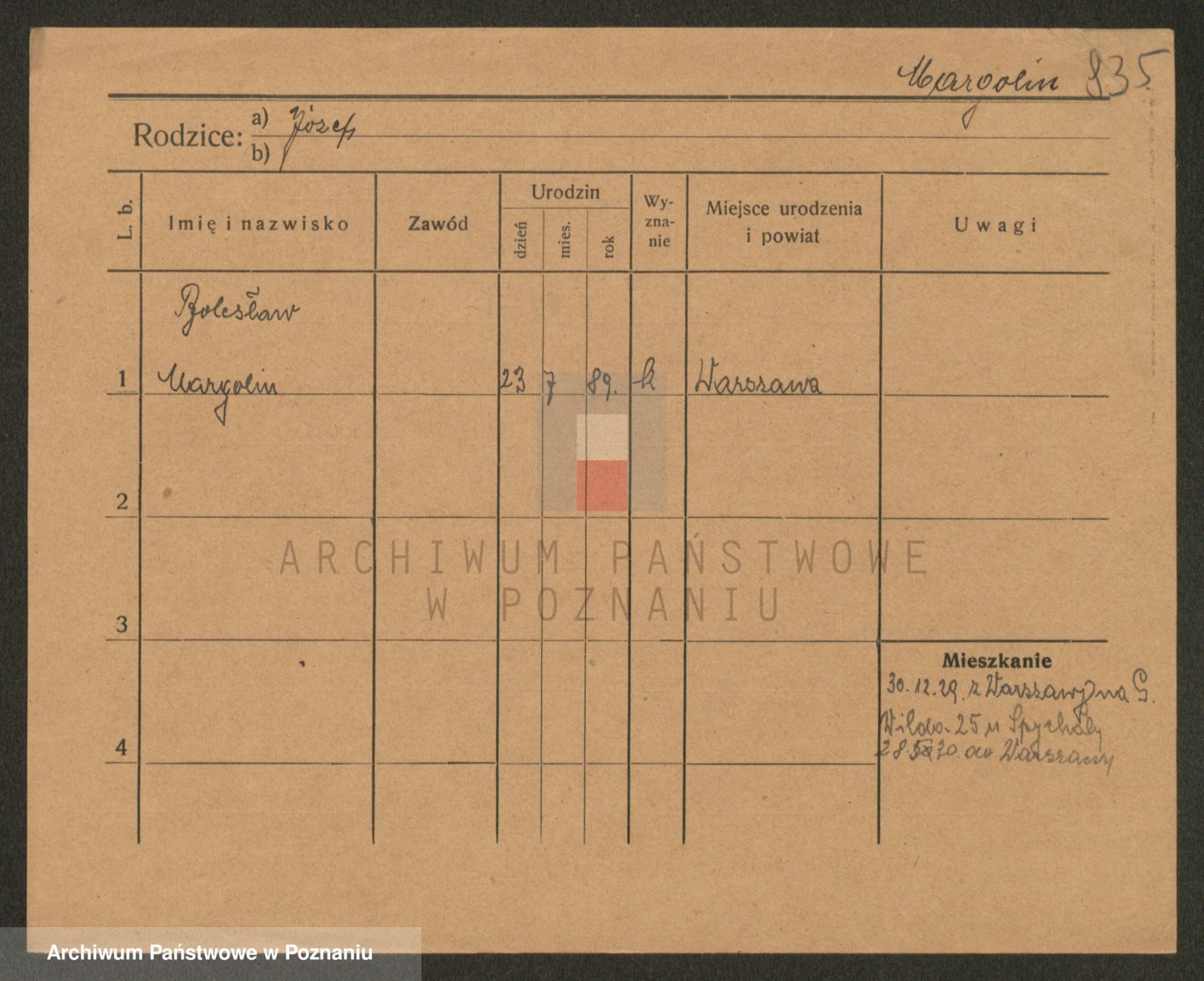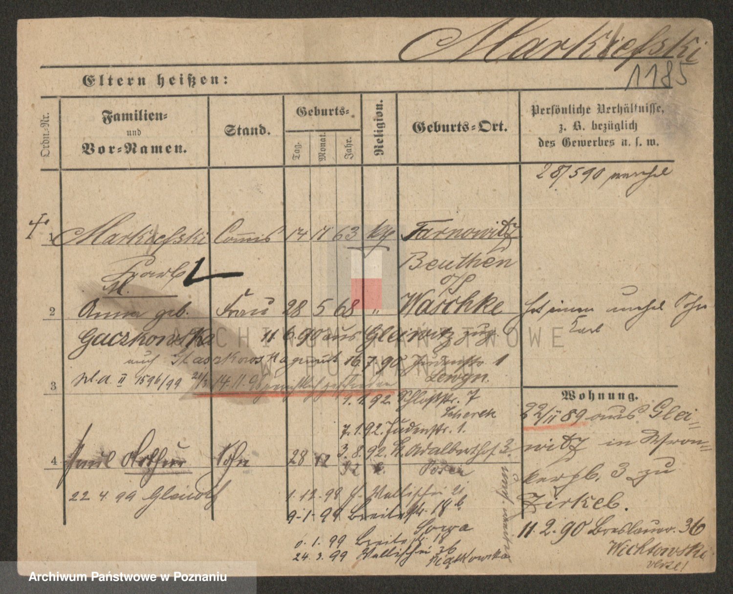 Podgląd karty osobowej dostępny jest po kliknięciu na nazwisko lub ikonkę karty. Można dokonywać powiększenia (ikony na górze) lub przechodzić między kolejnymi skanami (strzałki po bokach).