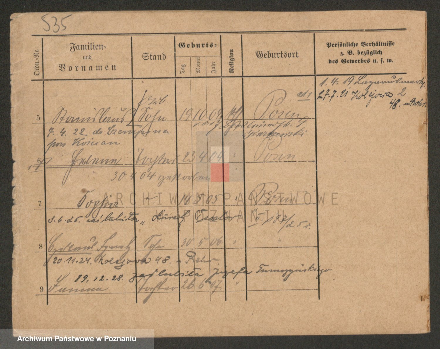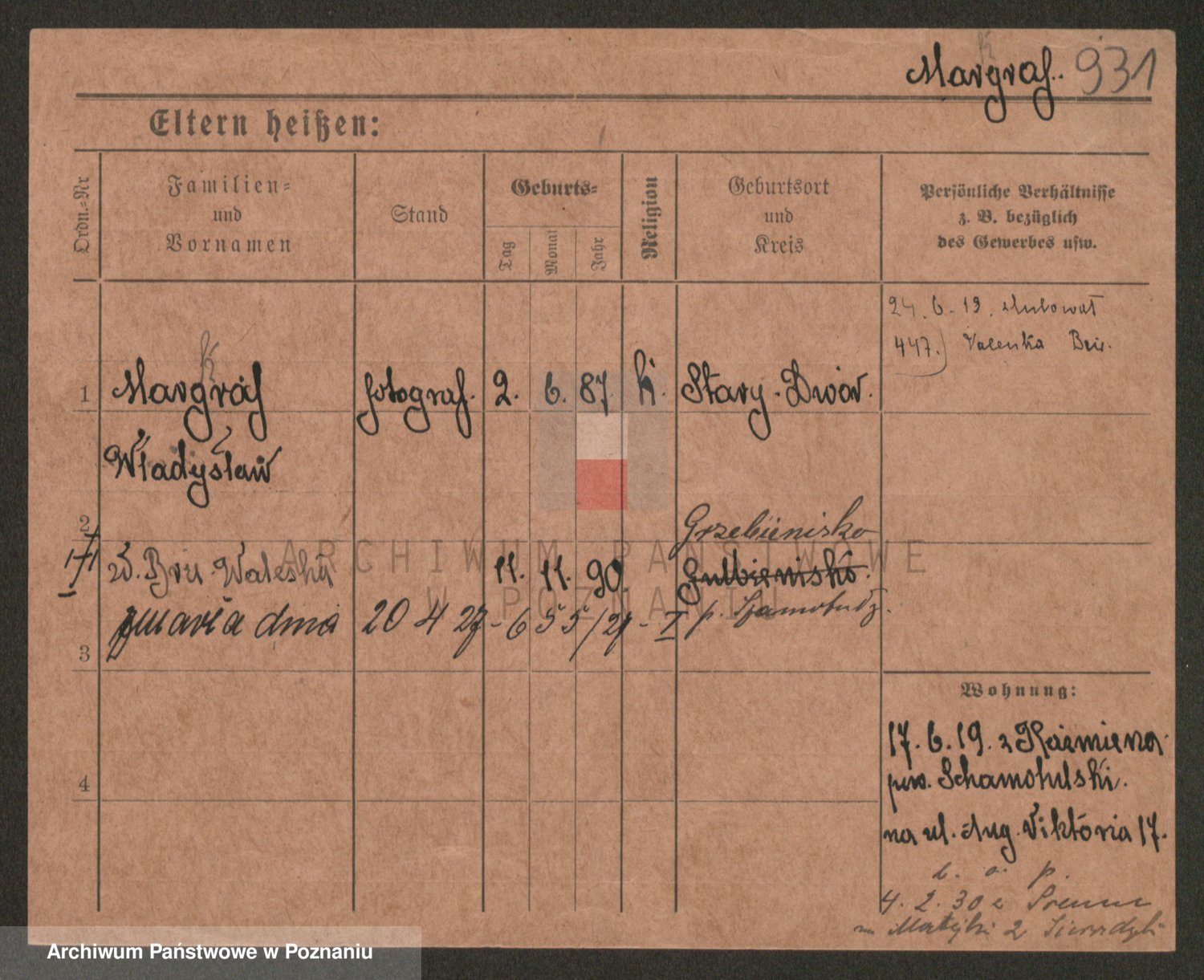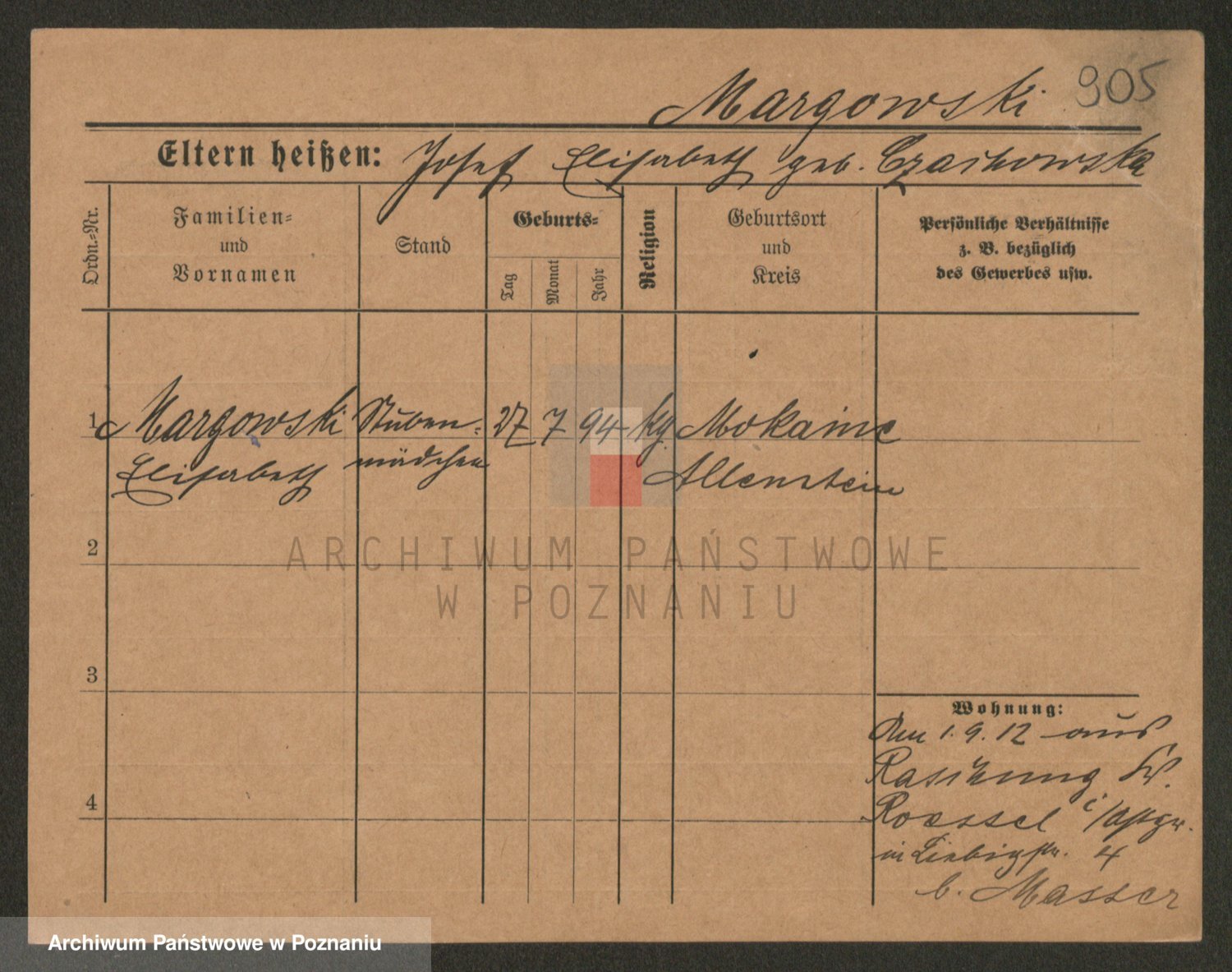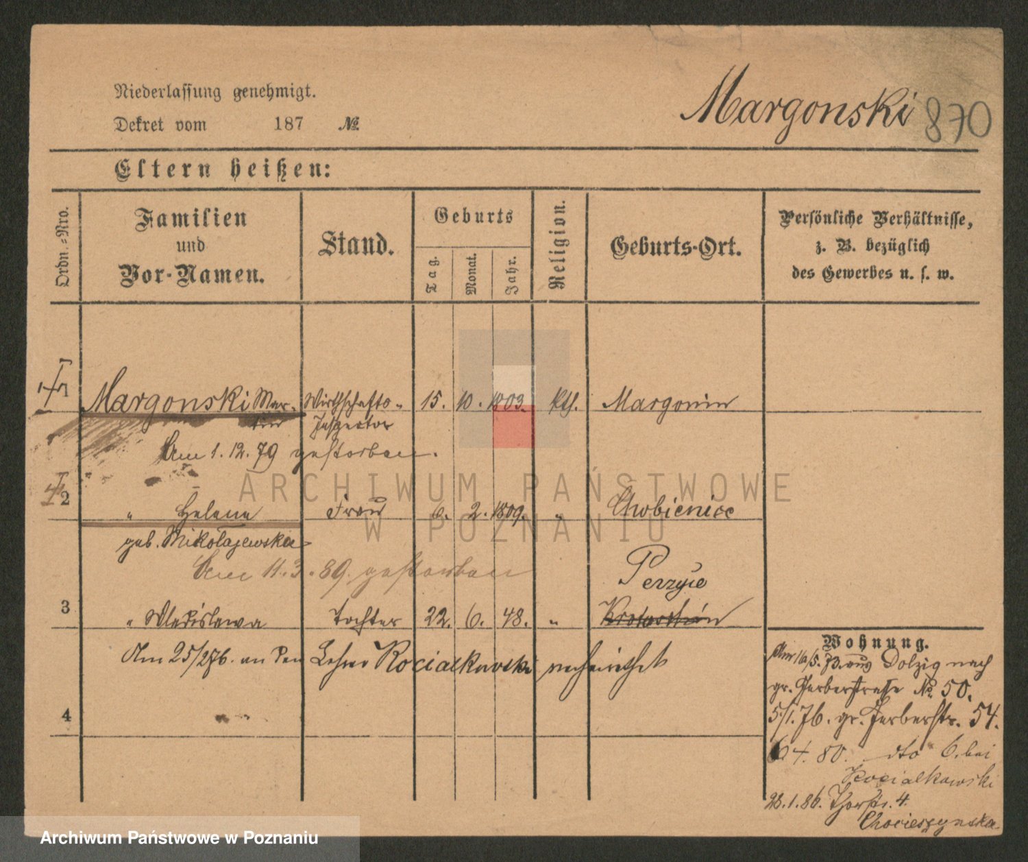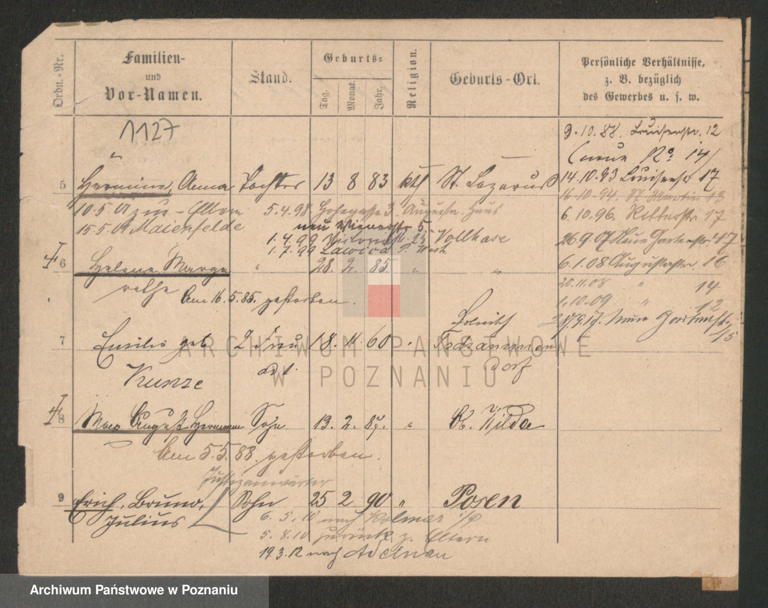 Podgląd karty osobowej dostępny jest po kliknięciu na nazwisko lub ikonkę karty. Można dokonywać powiększenia (ikony na górze) lub przechodzić między kolejnymi skanami (strzałki po bokach).