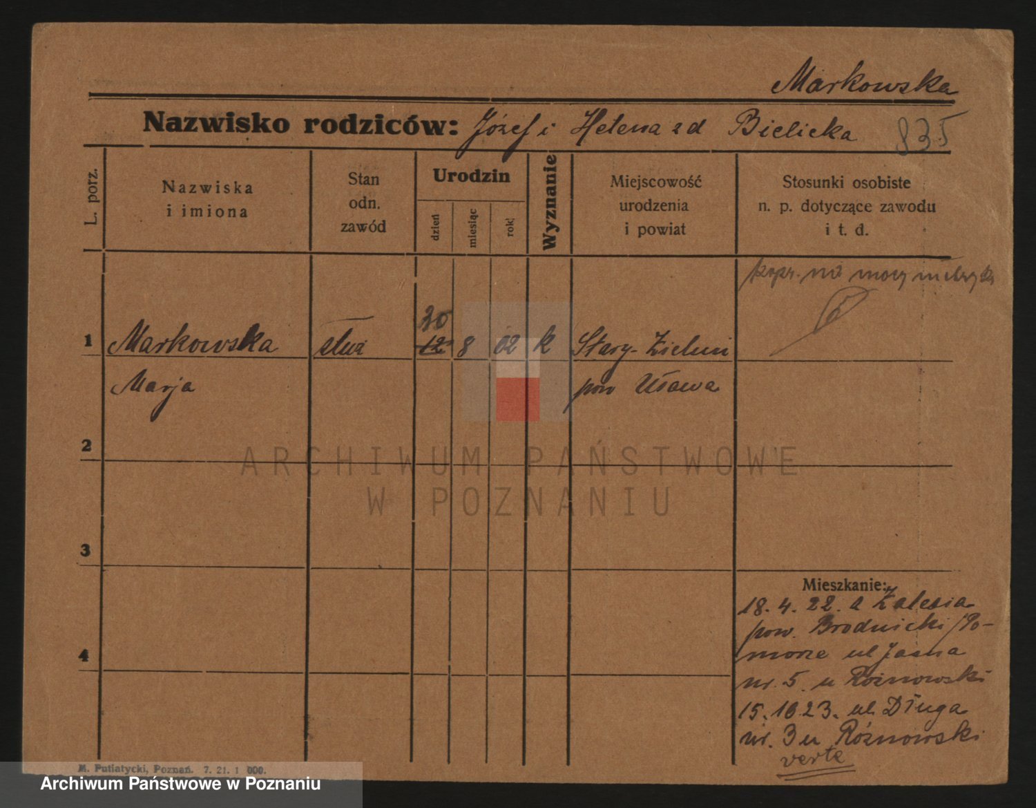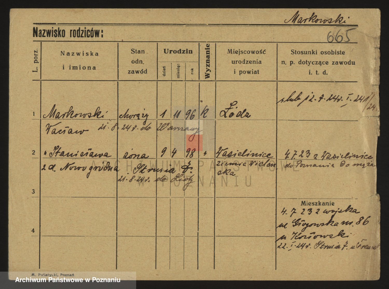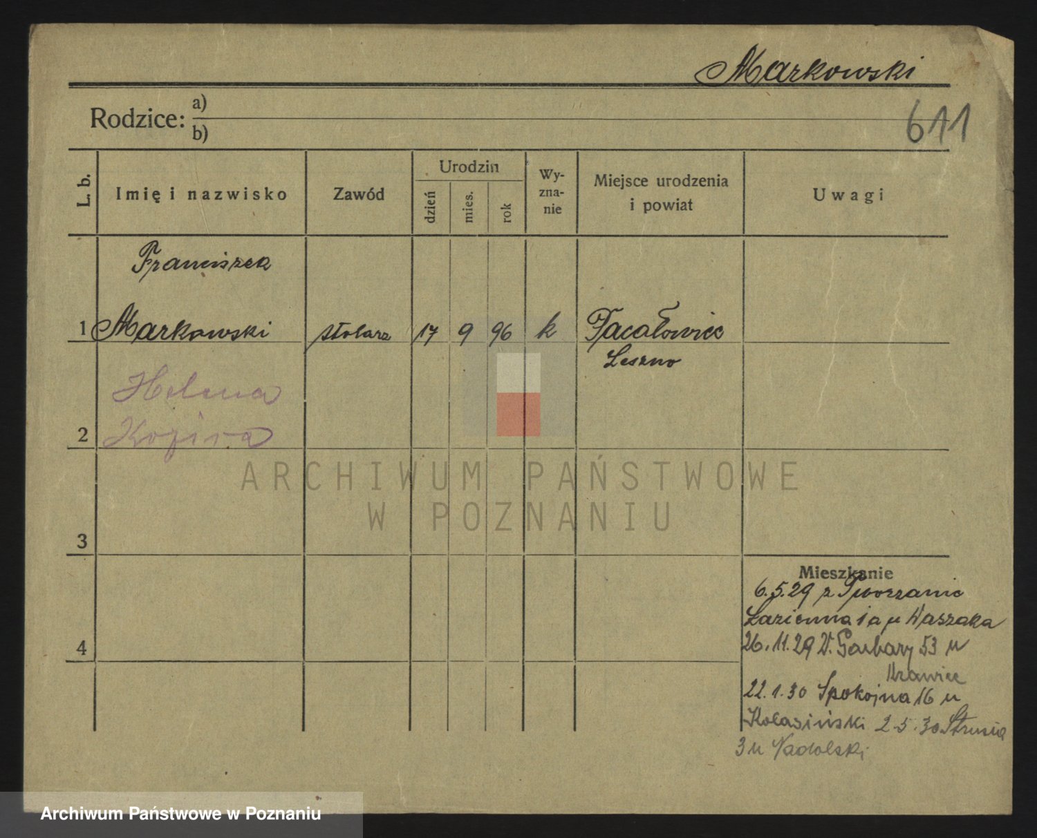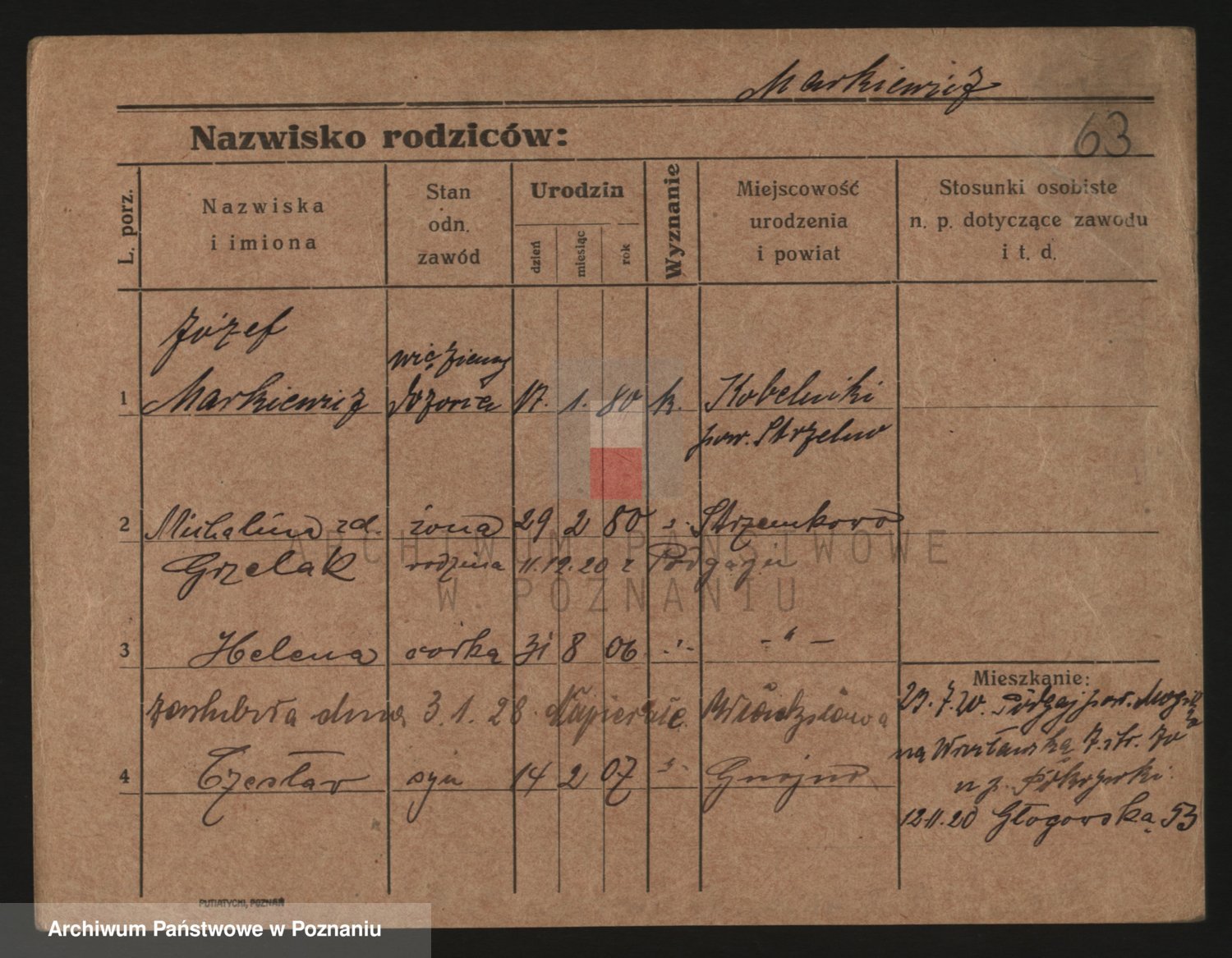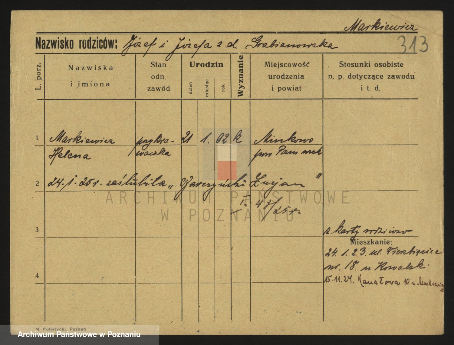Podgląd karty osobowej dostępny jest po kliknięciu na nazwisko lub ikonkę karty. Można dokonywać powiększenia (ikony na górze) lub przechodzić między kolejnymi skanami (strzałki po bokach).