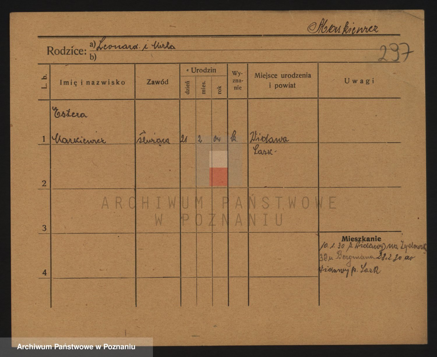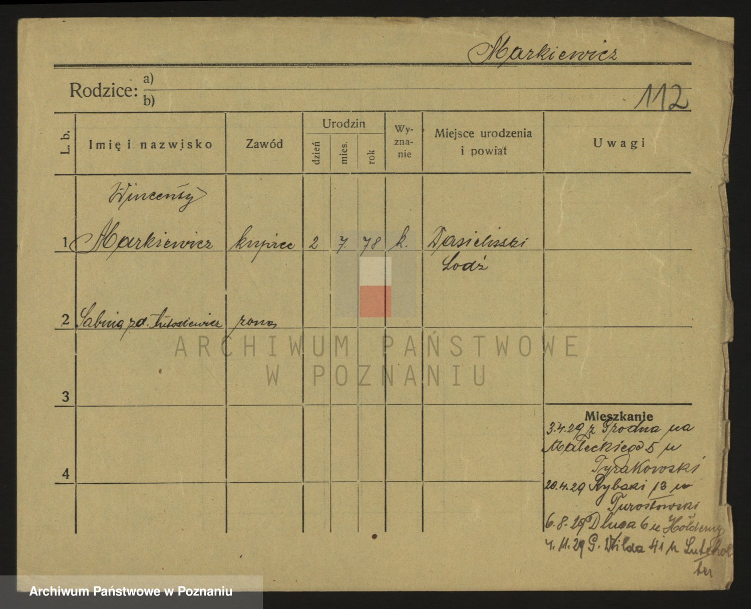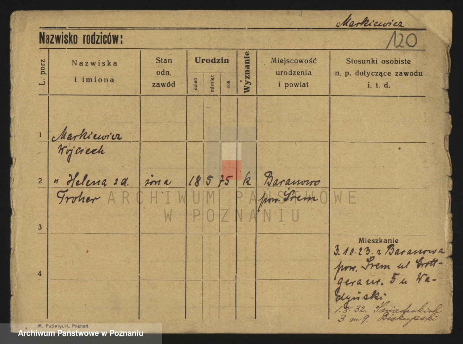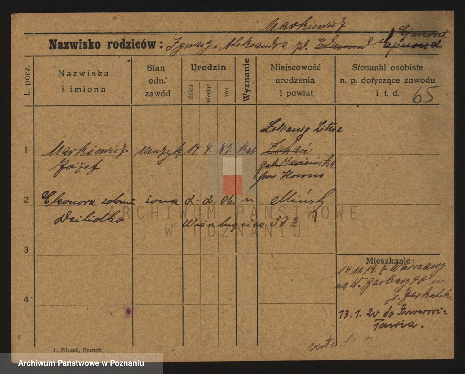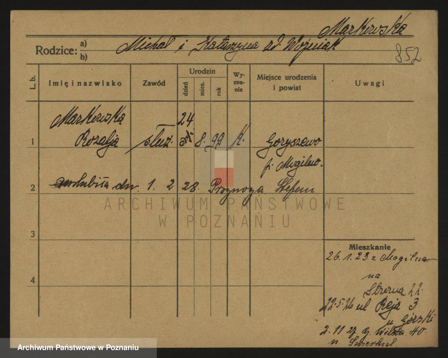Podgląd karty osobowej dostępny jest po kliknięciu na nazwisko lub ikonkę karty. Można dokonywać powiększenia (ikony na górze) lub przechodzić między kolejnymi skanami (strzałki po bokach).