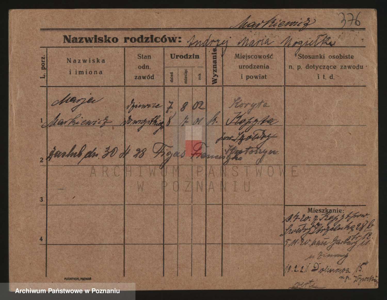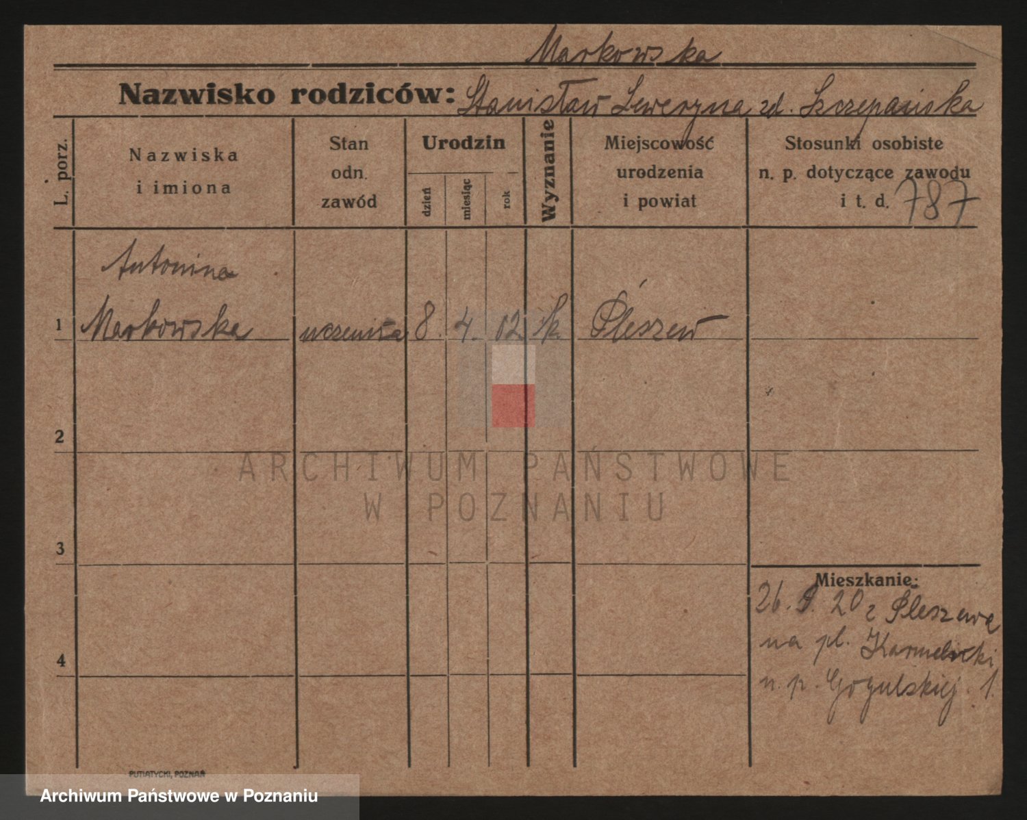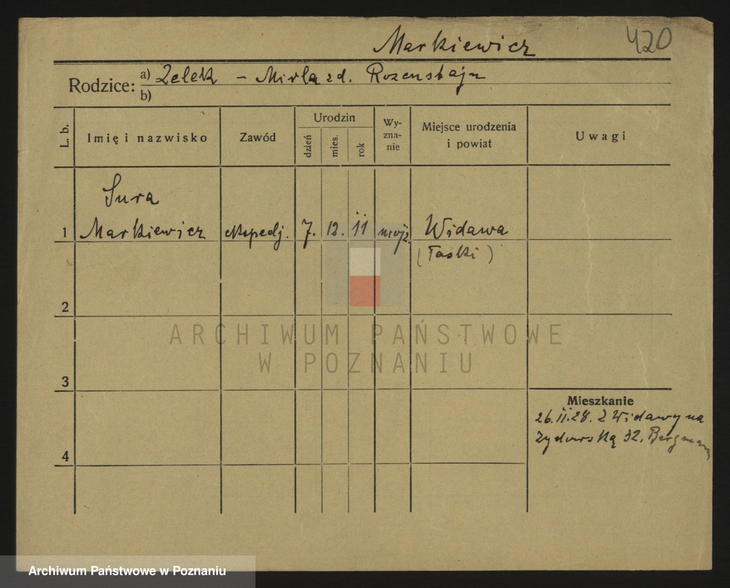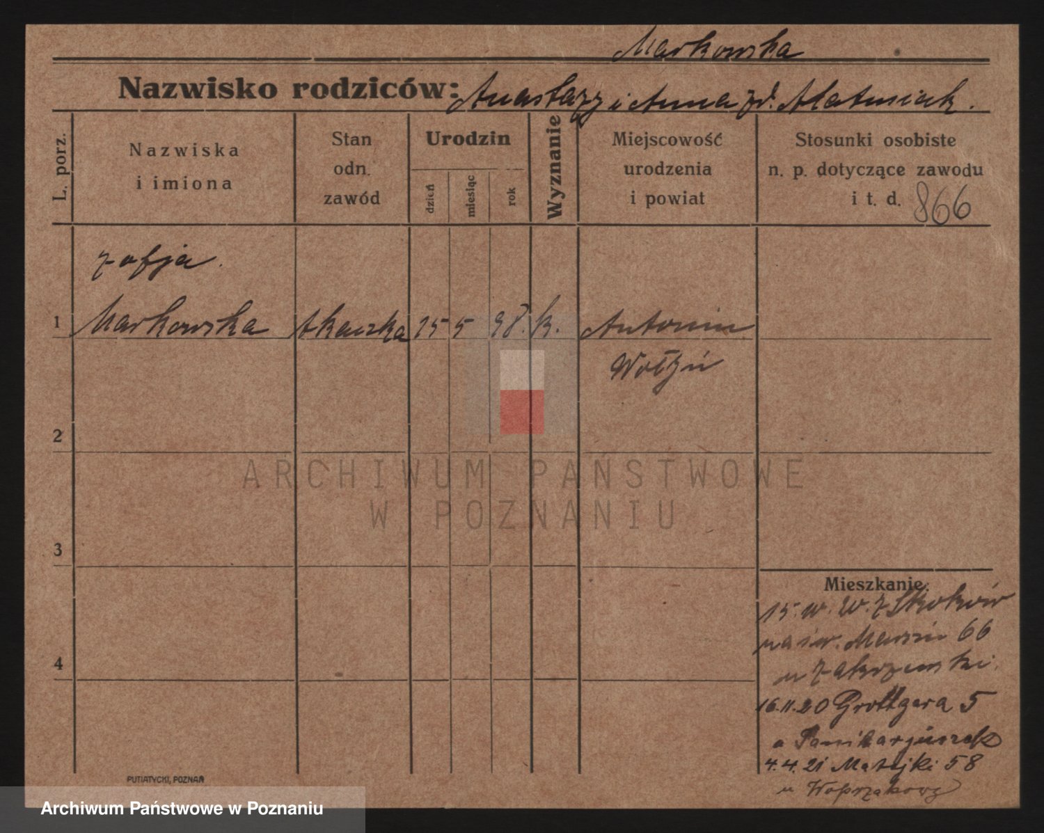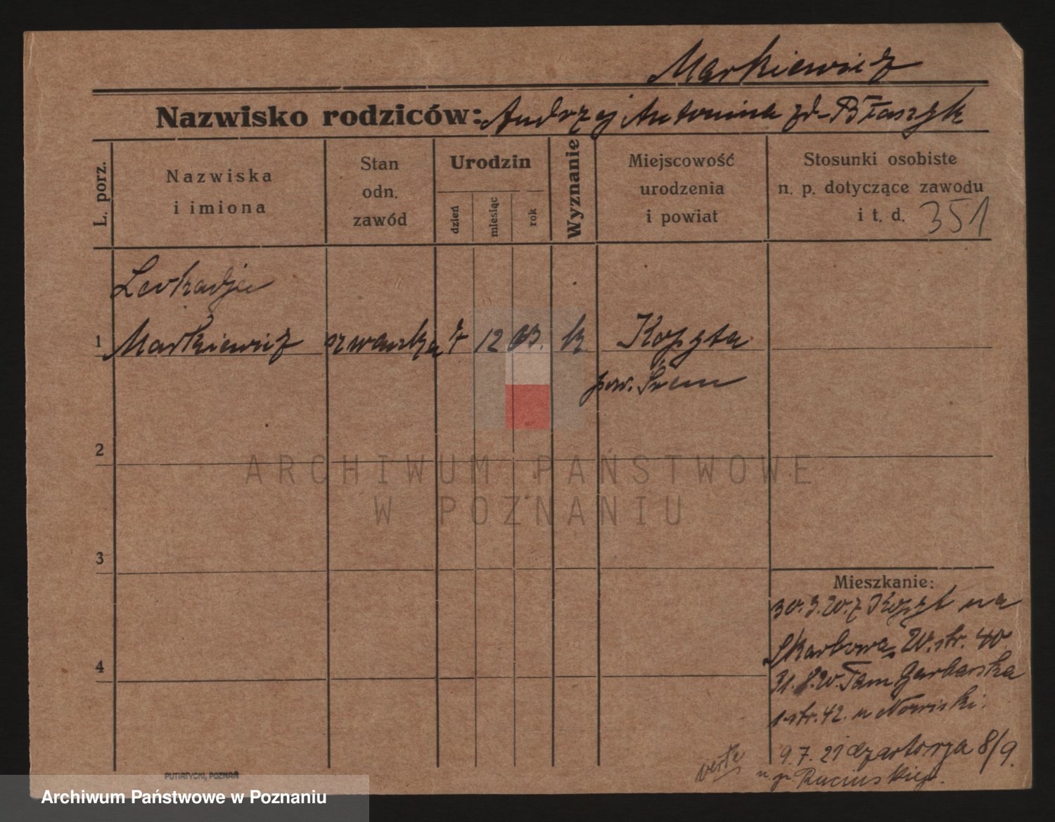 Podgląd karty osobowej dostępny jest po kliknięciu na nazwisko lub ikonkę karty. Można dokonywać powiększenia (ikony na górze) lub przechodzić między kolejnymi skanami (strzałki po bokach).