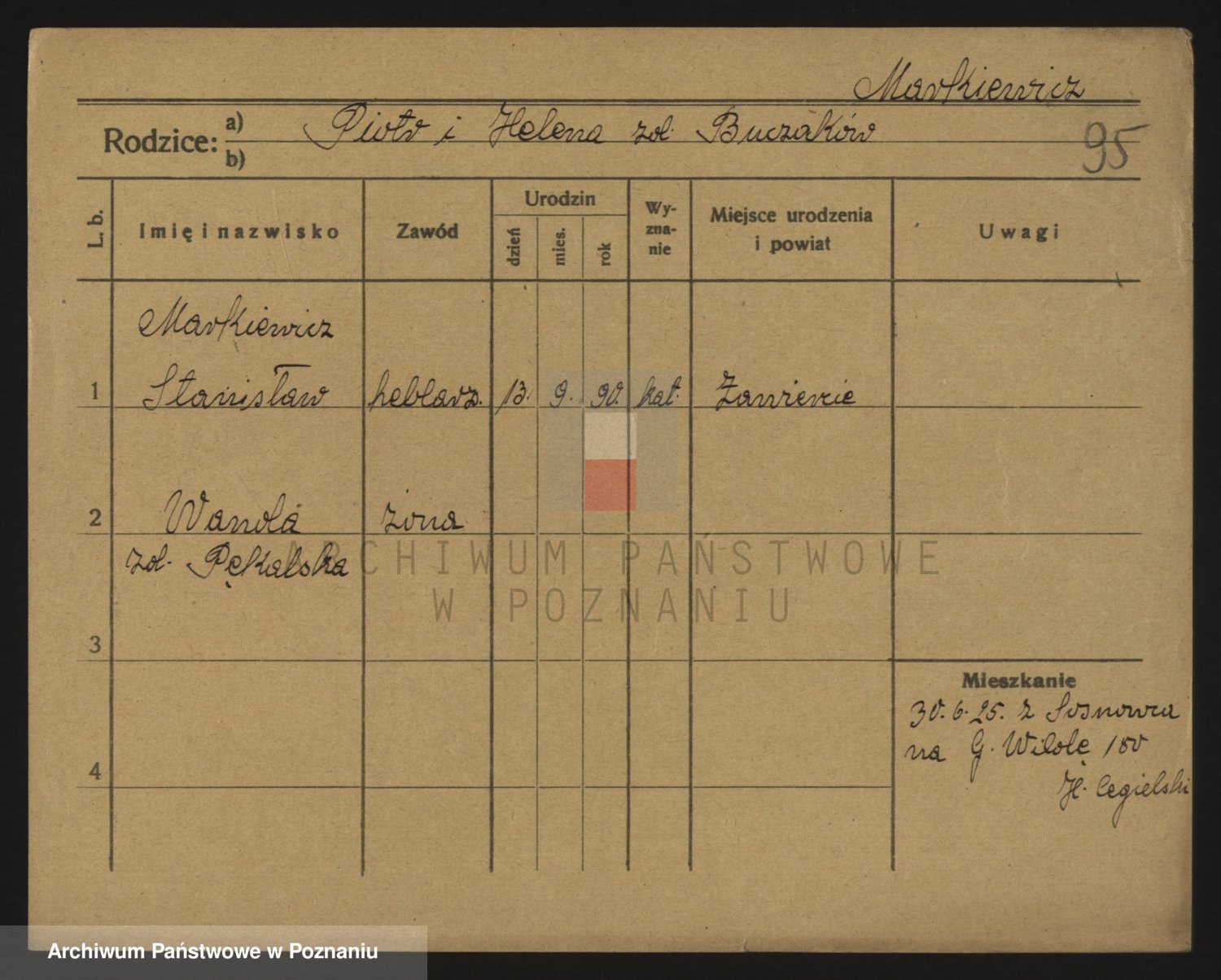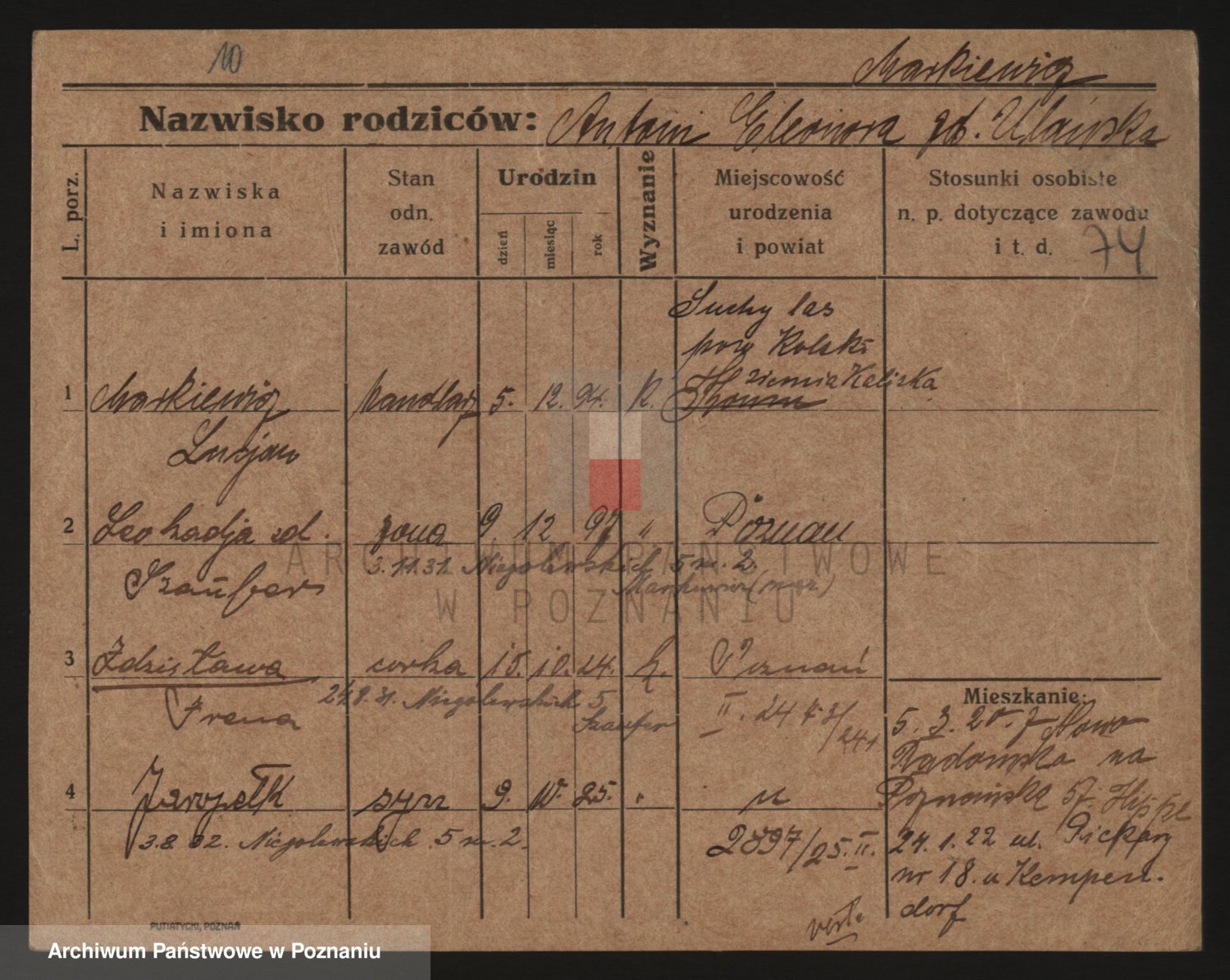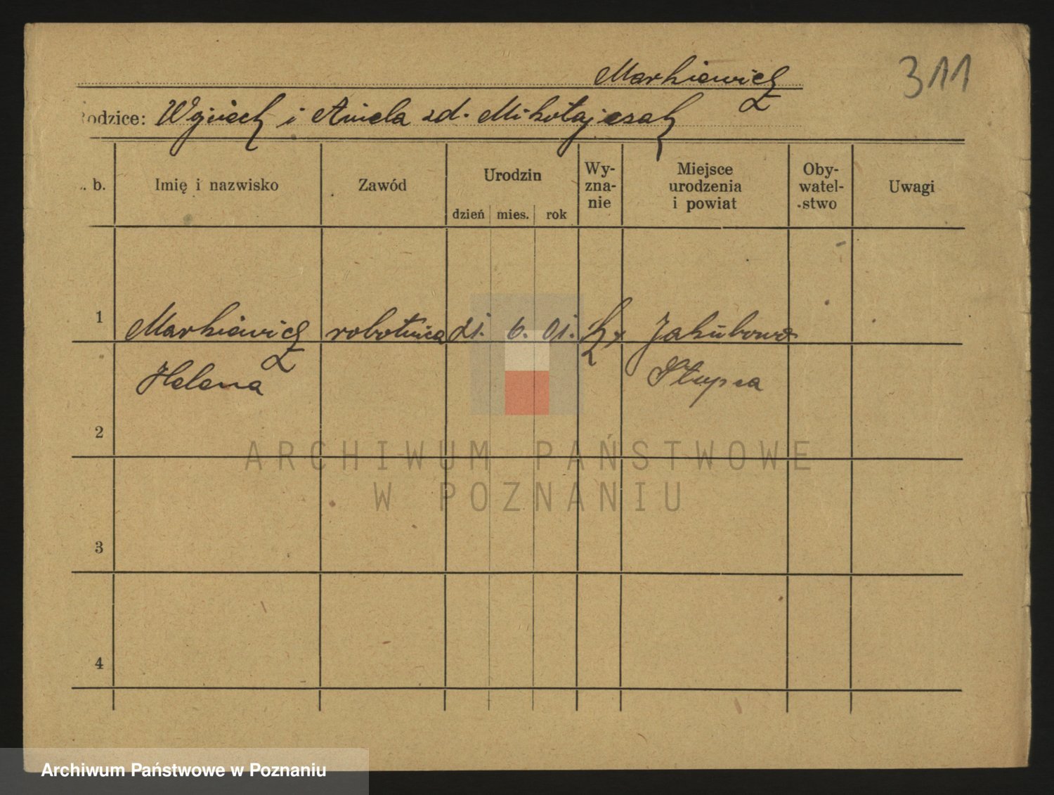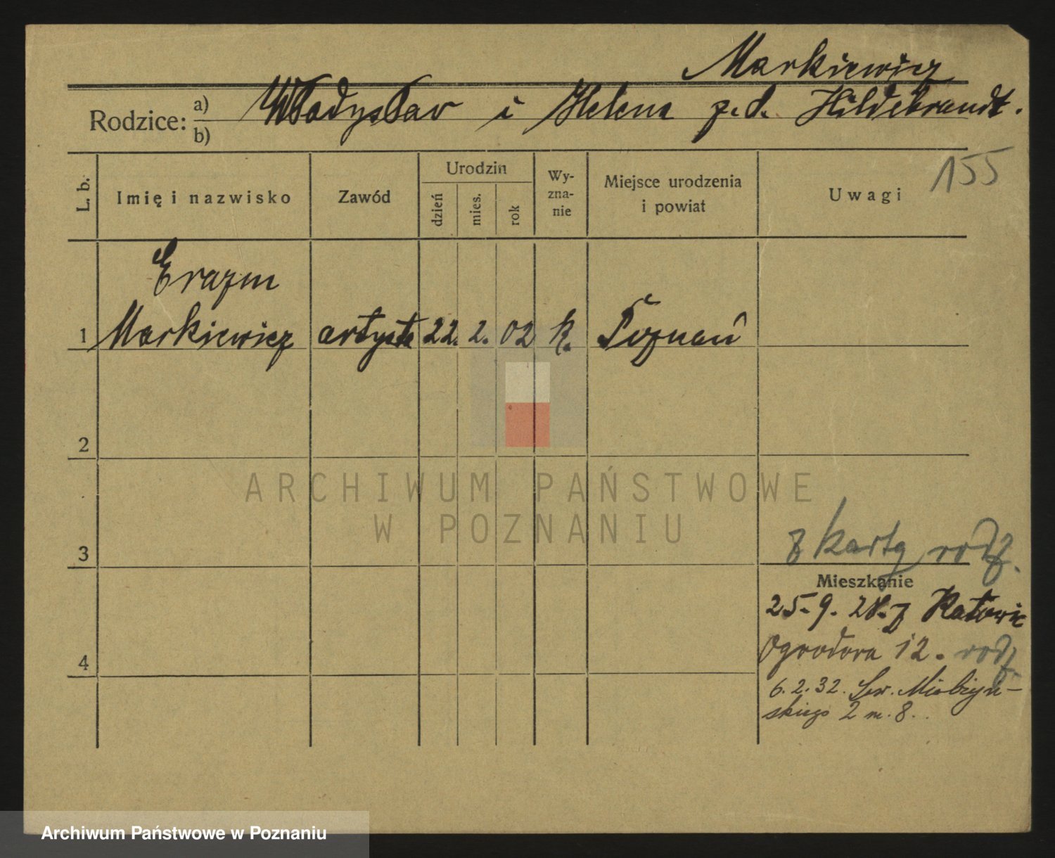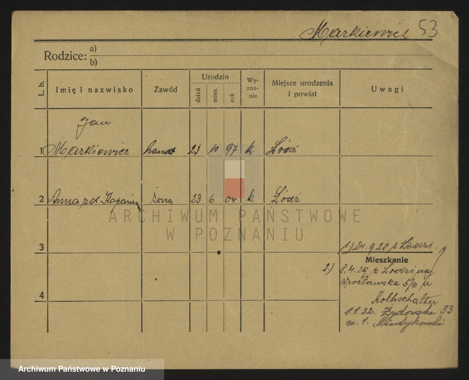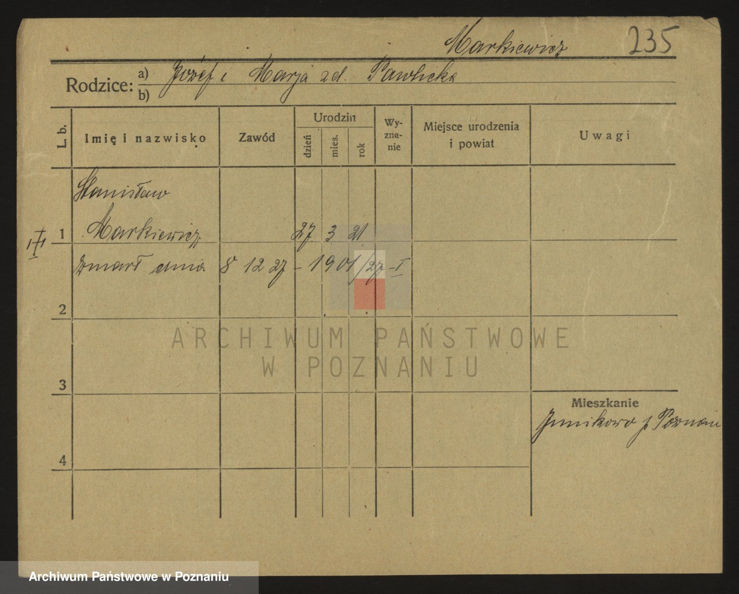 Podgląd karty osobowej dostępny jest po kliknięciu na nazwisko lub ikonkę karty. Można dokonywać powiększenia (ikony na górze) lub przechodzić między kolejnymi skanami (strzałki po bokach).