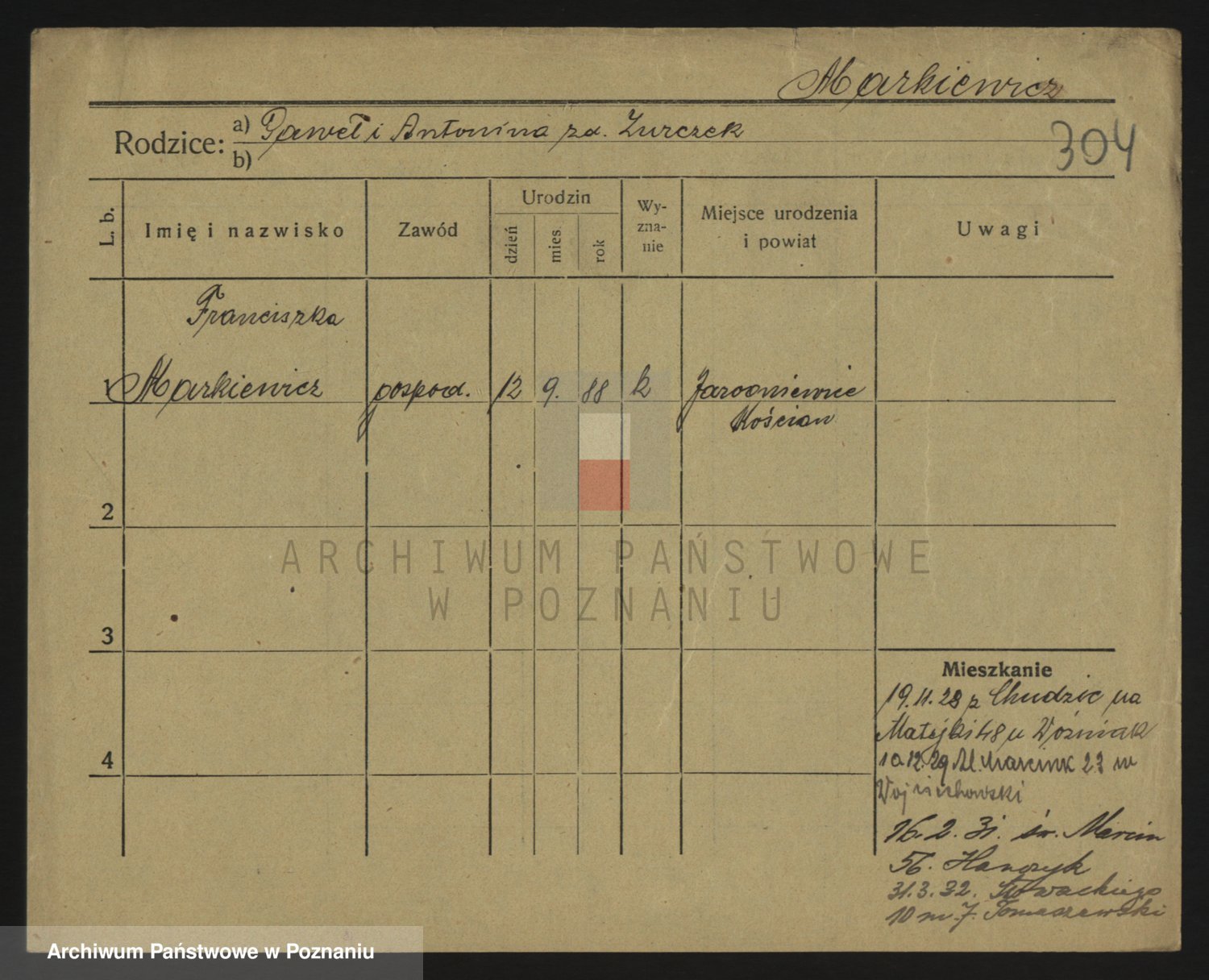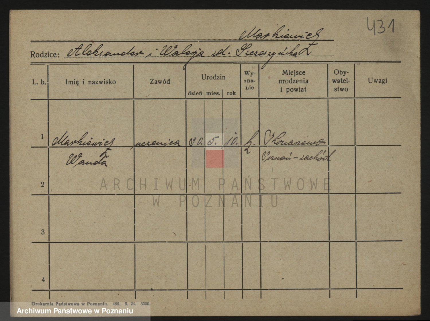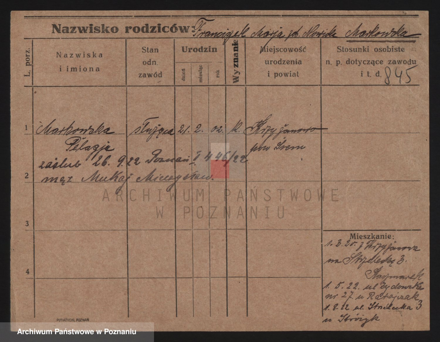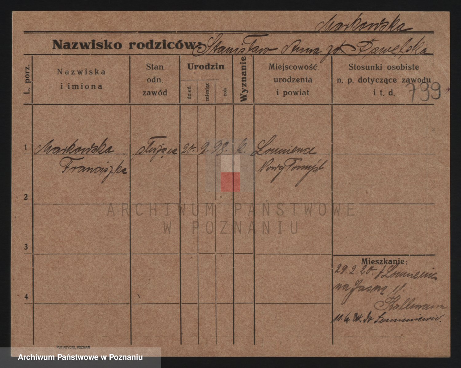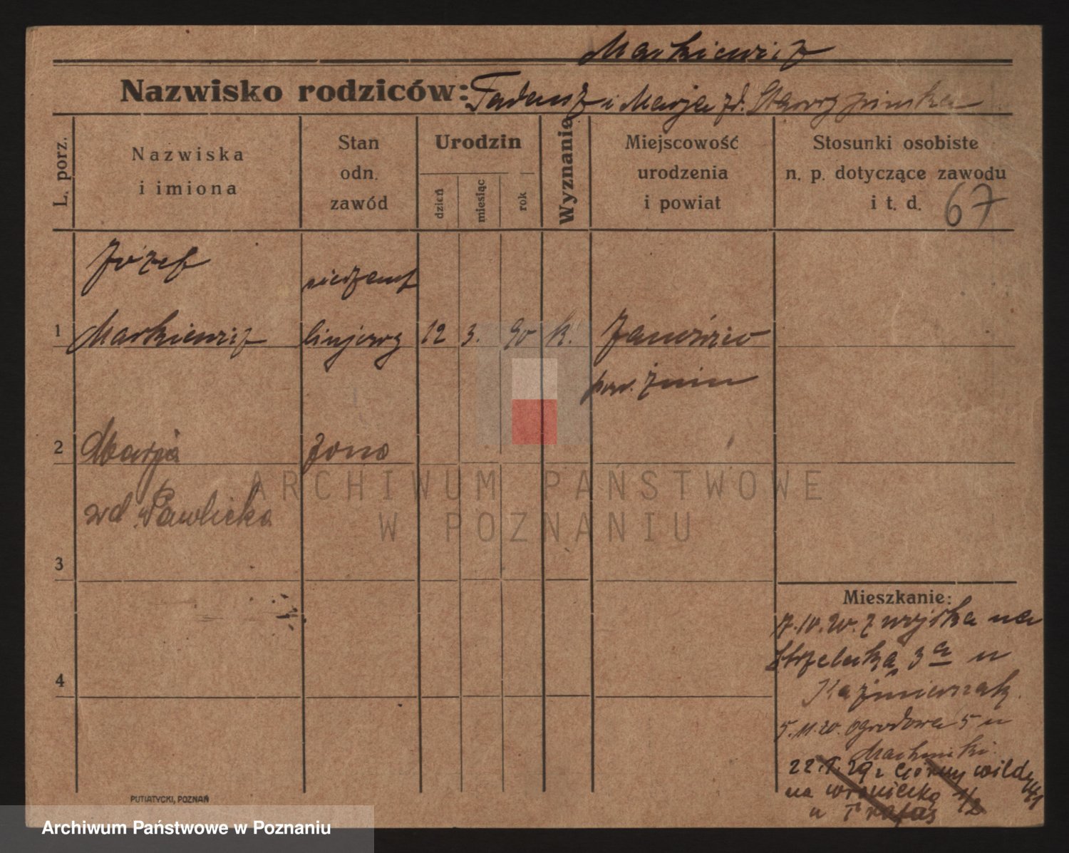 Podgląd karty osobowej dostępny jest po kliknięciu na nazwisko lub ikonkę karty. Można dokonywać powiększenia (ikony na górze) lub przechodzić między kolejnymi skanami (strzałki po bokach).