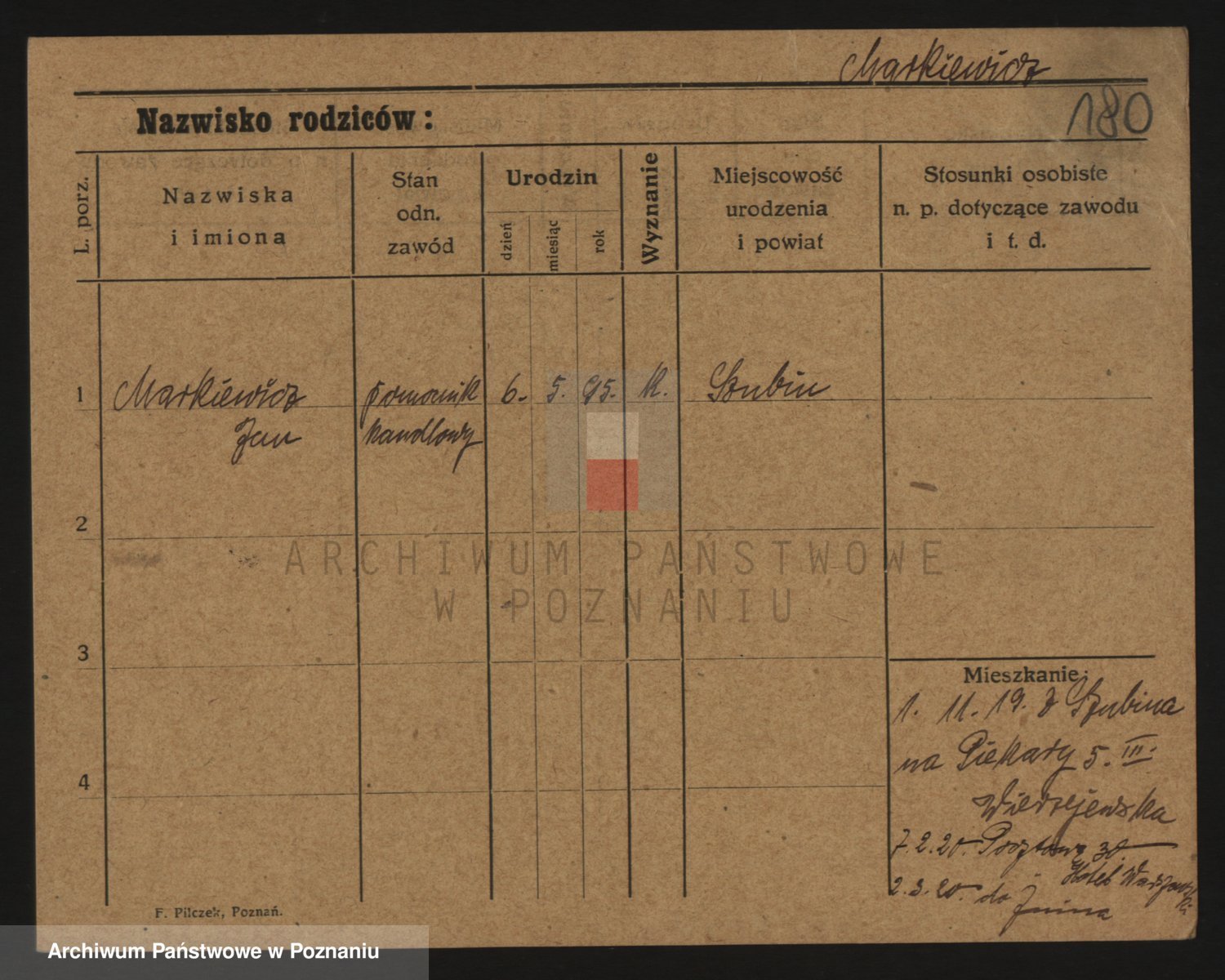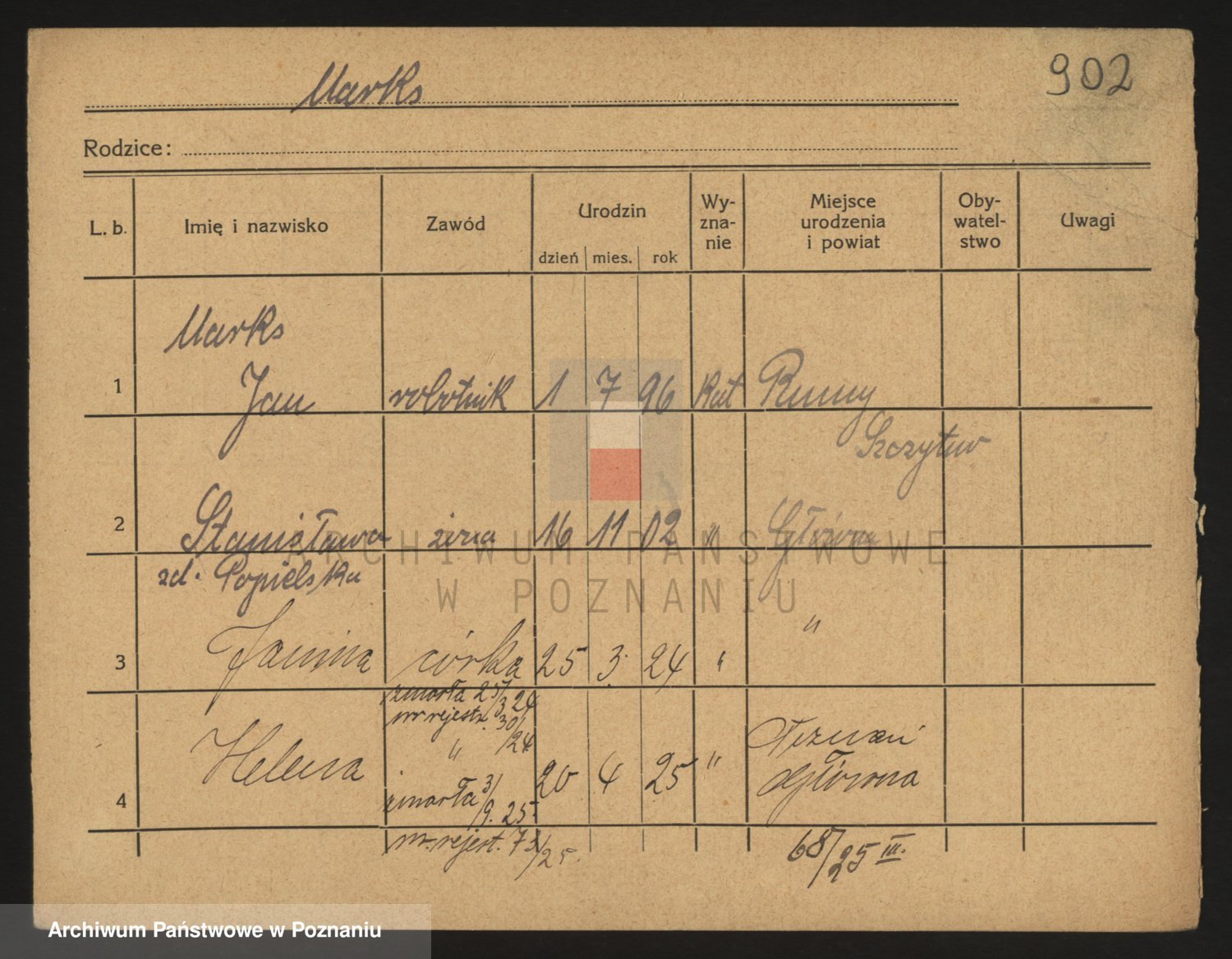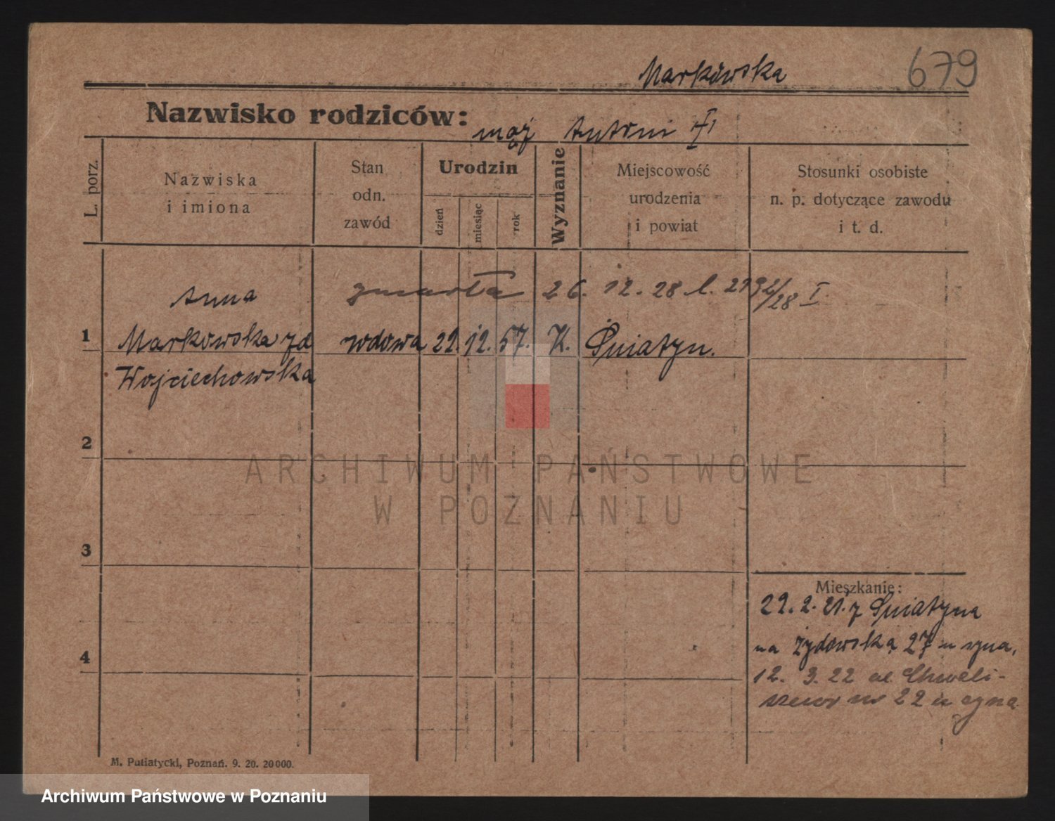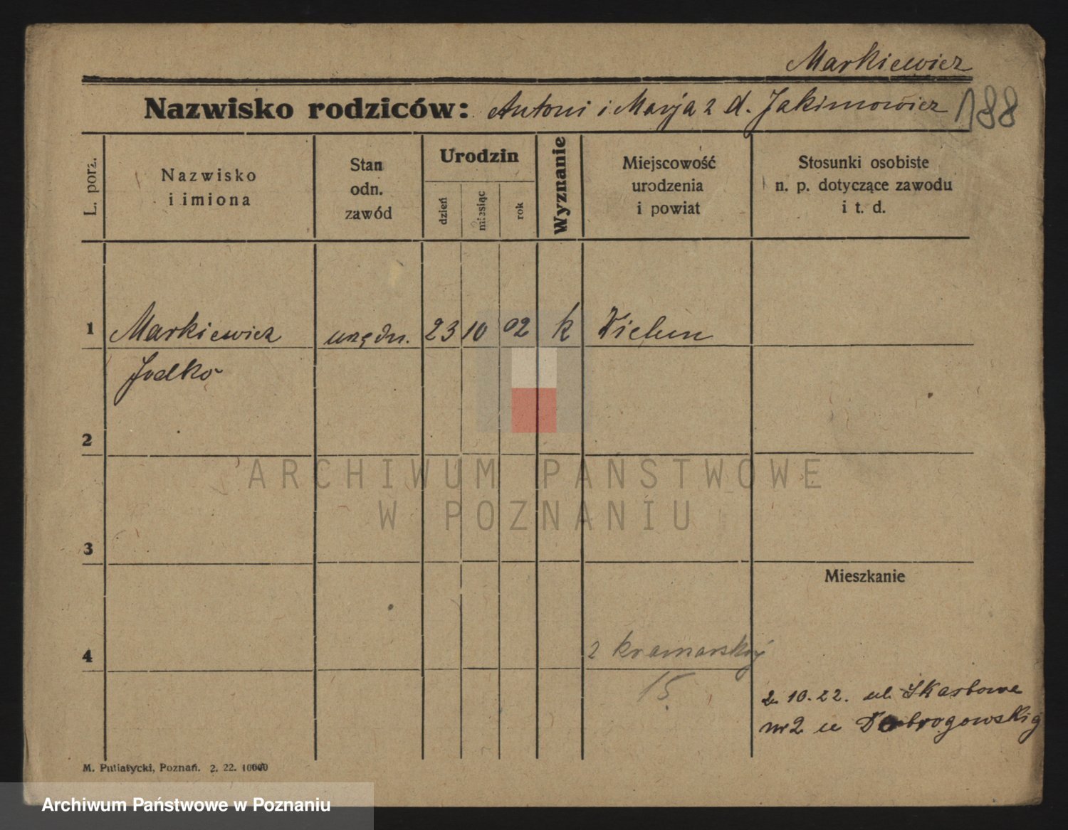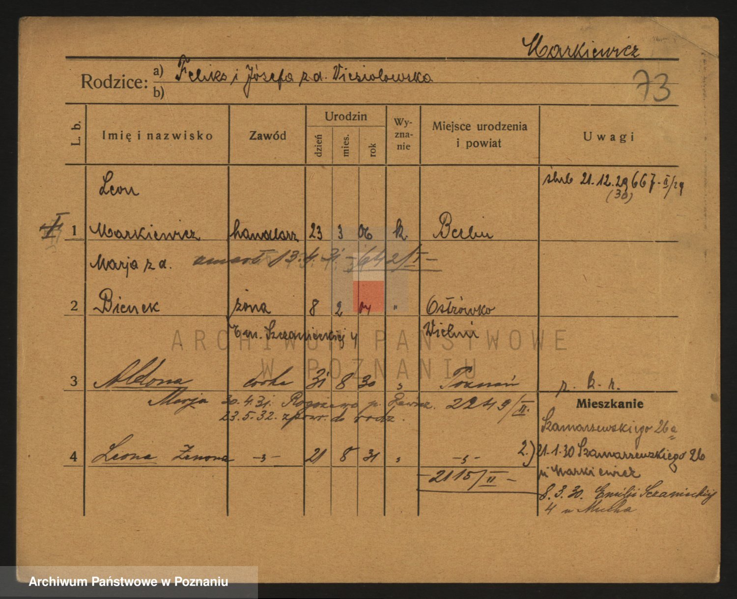 Podgląd karty osobowej dostępny jest po kliknięciu na nazwisko lub ikonkę karty. Można dokonywać powiększenia (ikony na górze) lub przechodzić między kolejnymi skanami (strzałki po bokach).