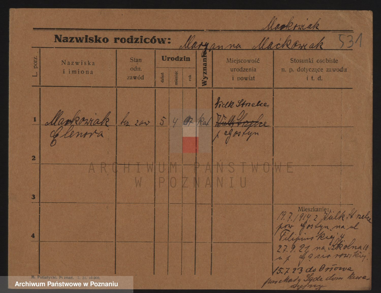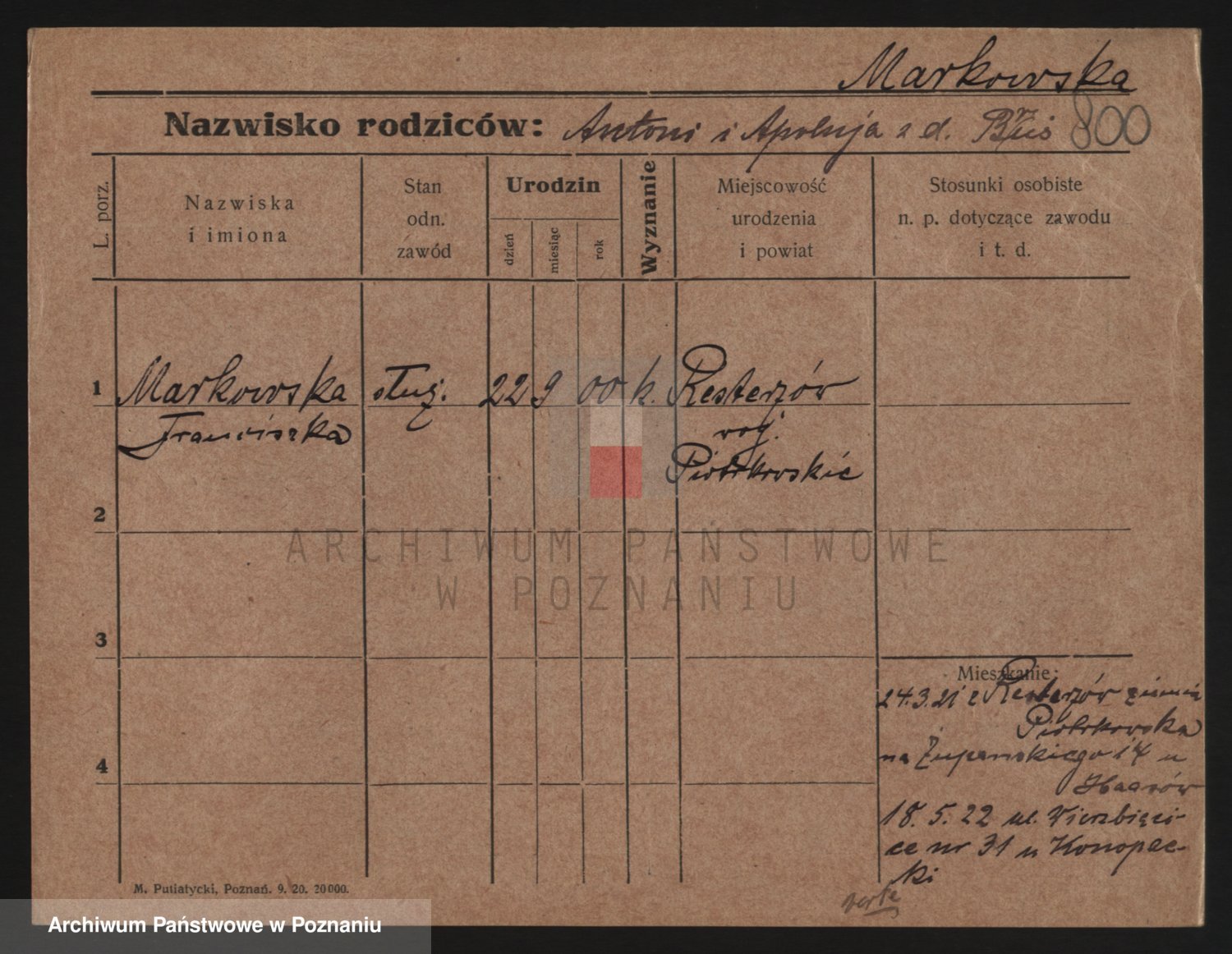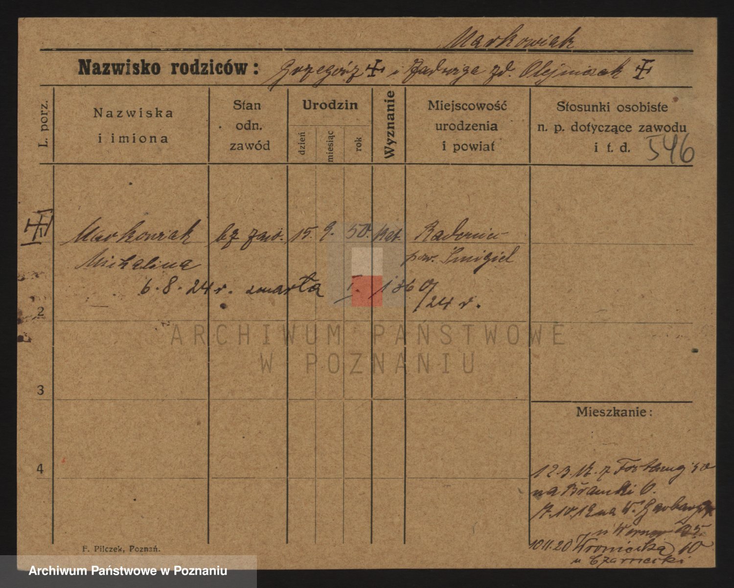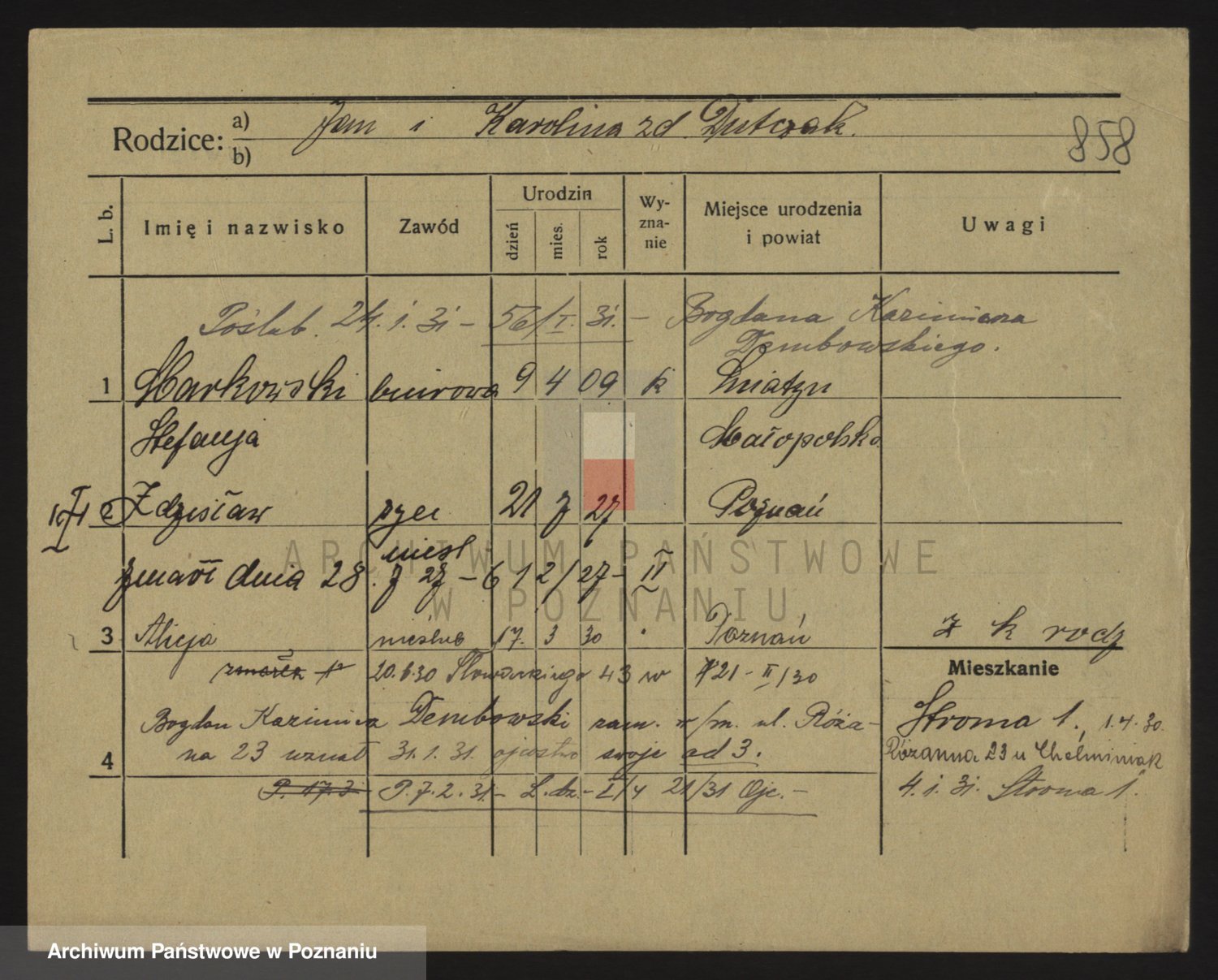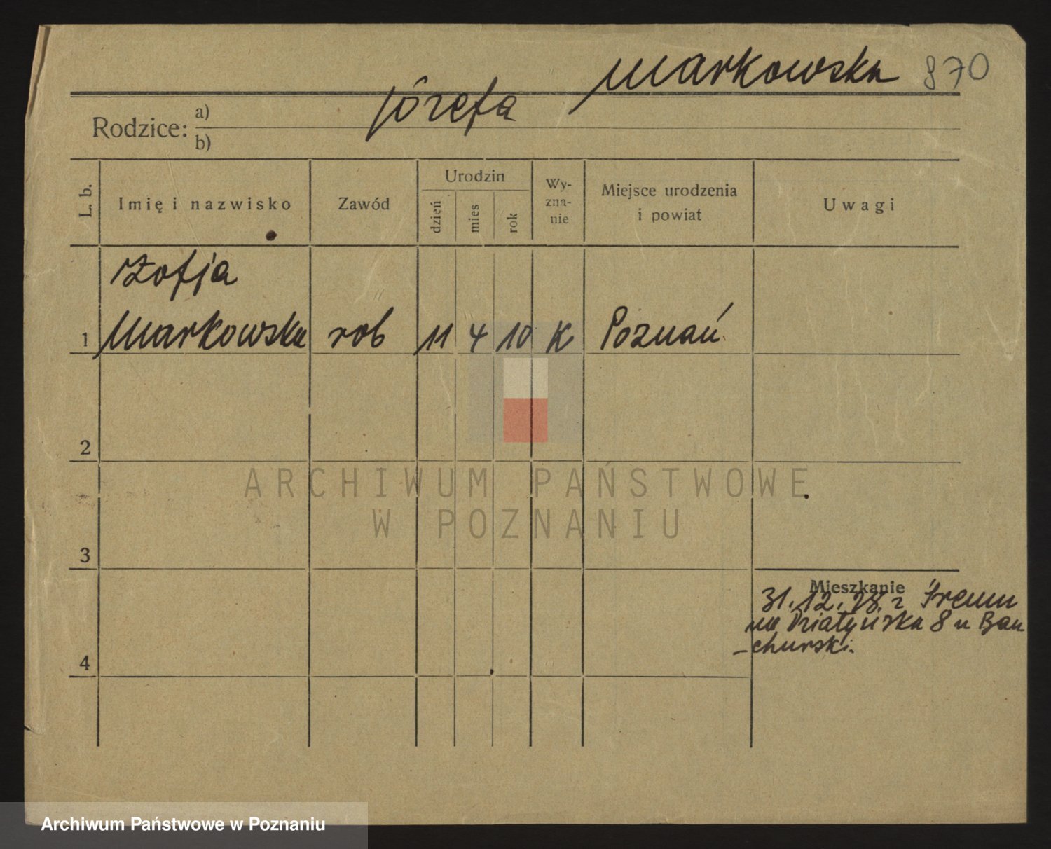 Podgląd karty osobowej dostępny jest po kliknięciu na nazwisko lub ikonkę karty. Można dokonywać powiększenia (ikony na górze) lub przechodzić między kolejnymi skanami (strzałki po bokach).