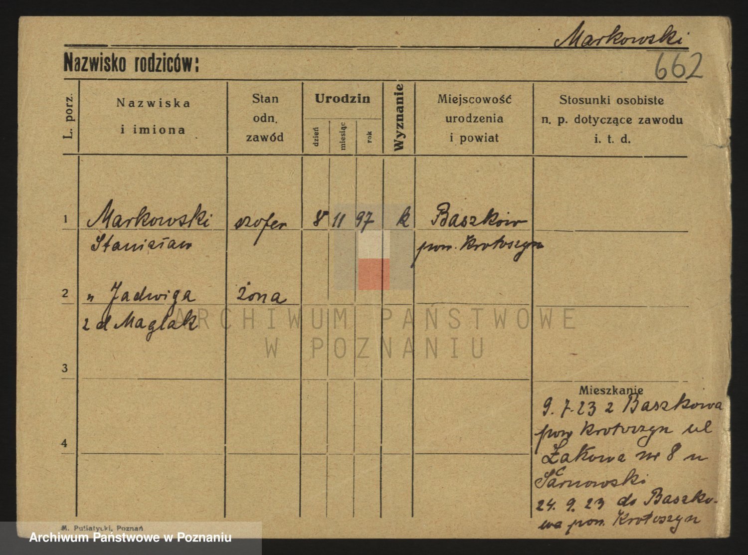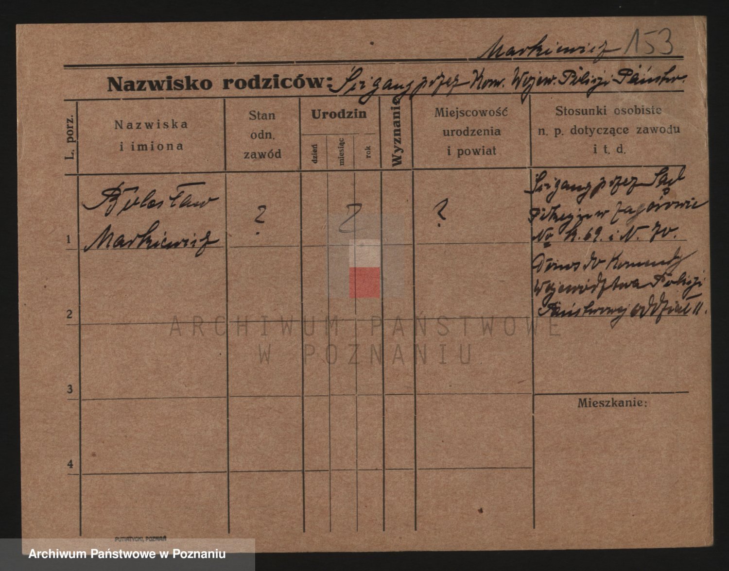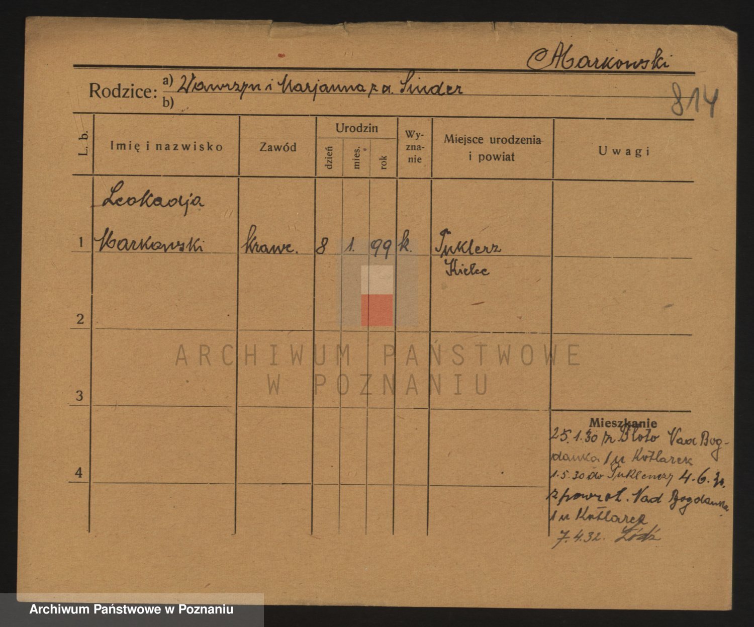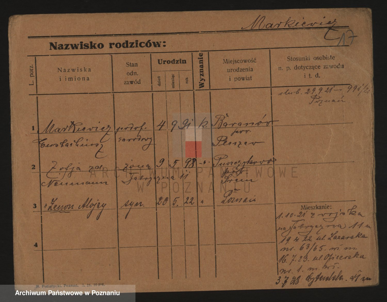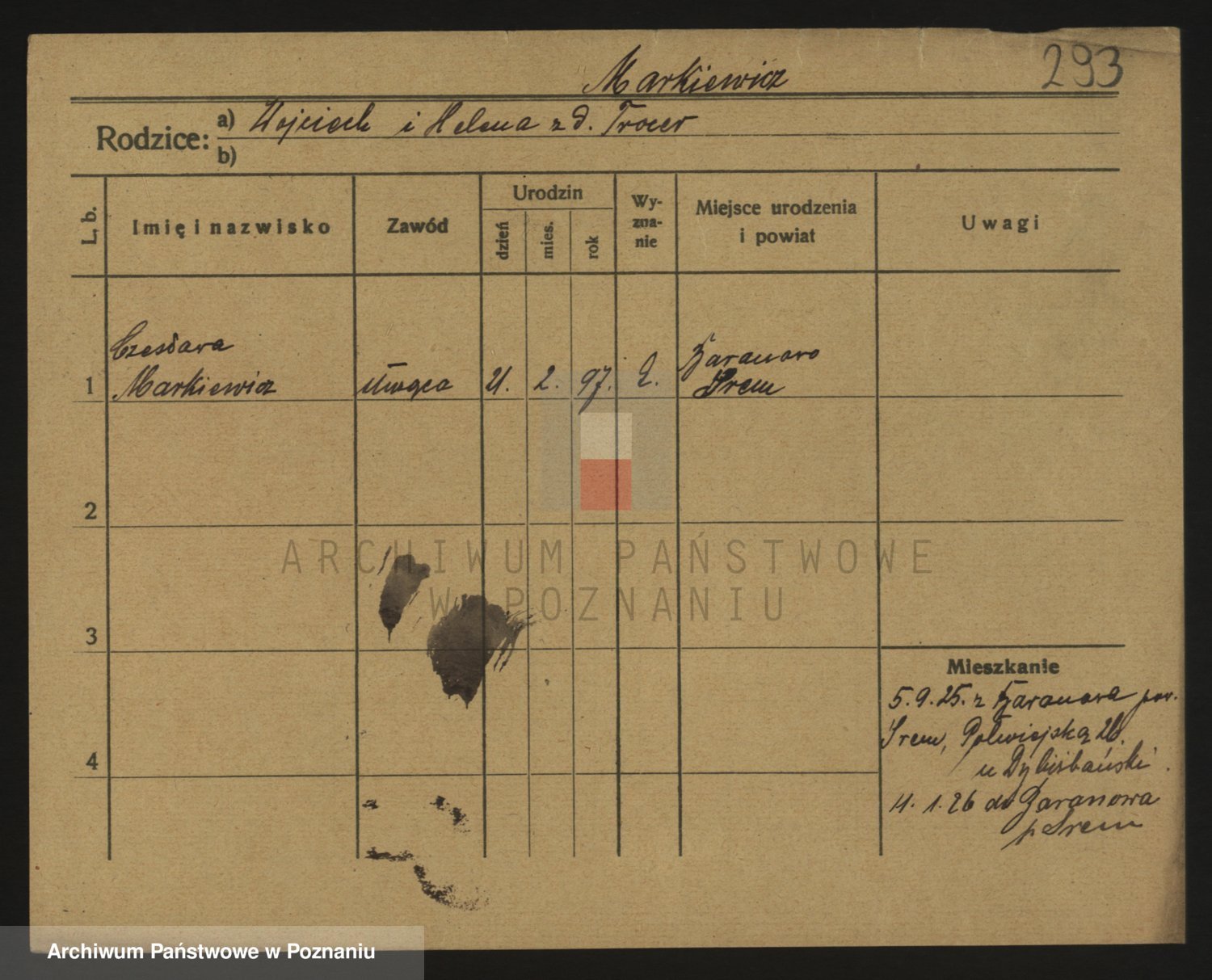 Podgląd karty osobowej dostępny jest po kliknięciu na nazwisko lub ikonkę karty. Można dokonywać powiększenia (ikony na górze) lub przechodzić między kolejnymi skanami (strzałki po bokach).