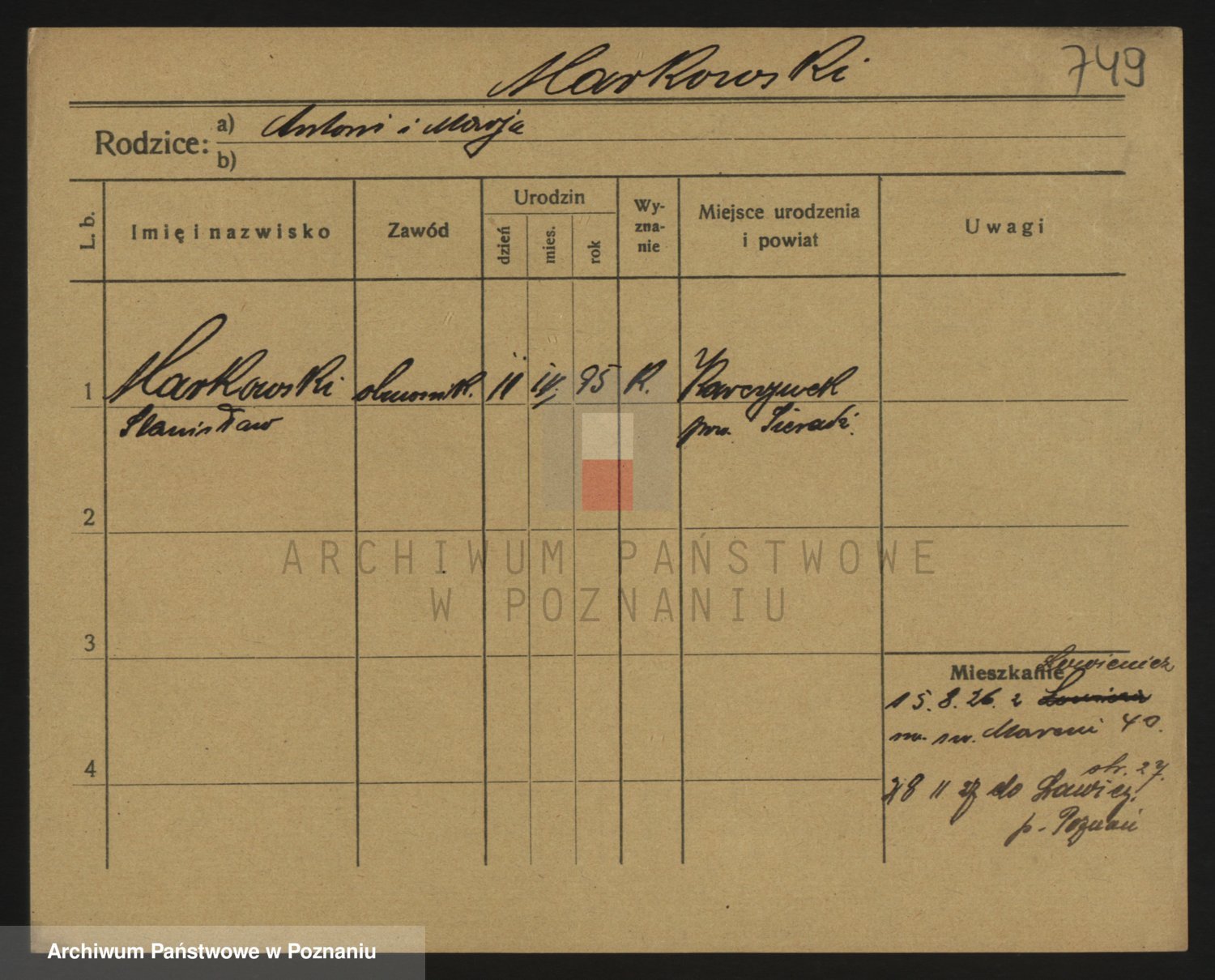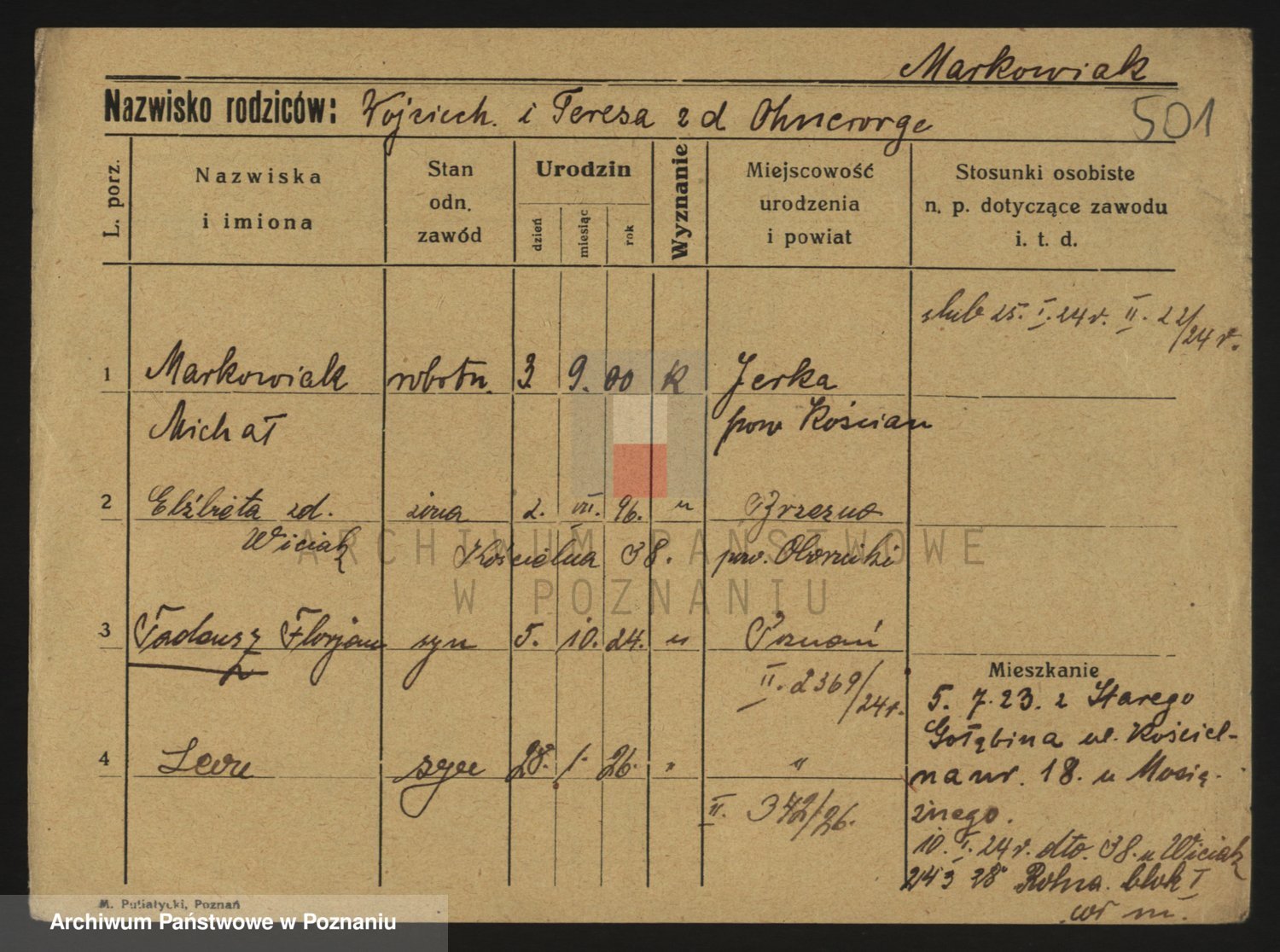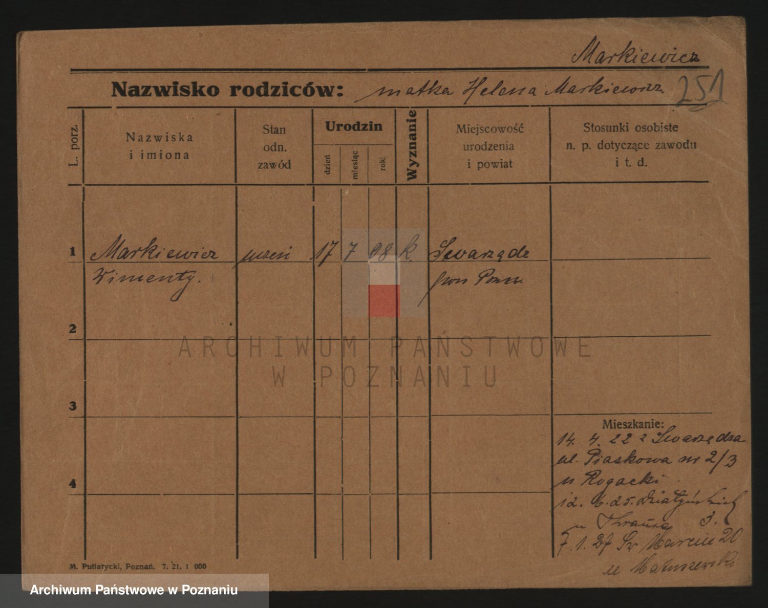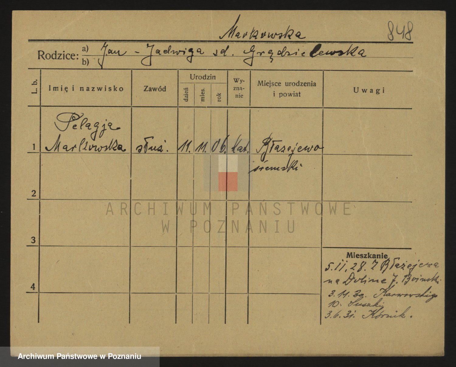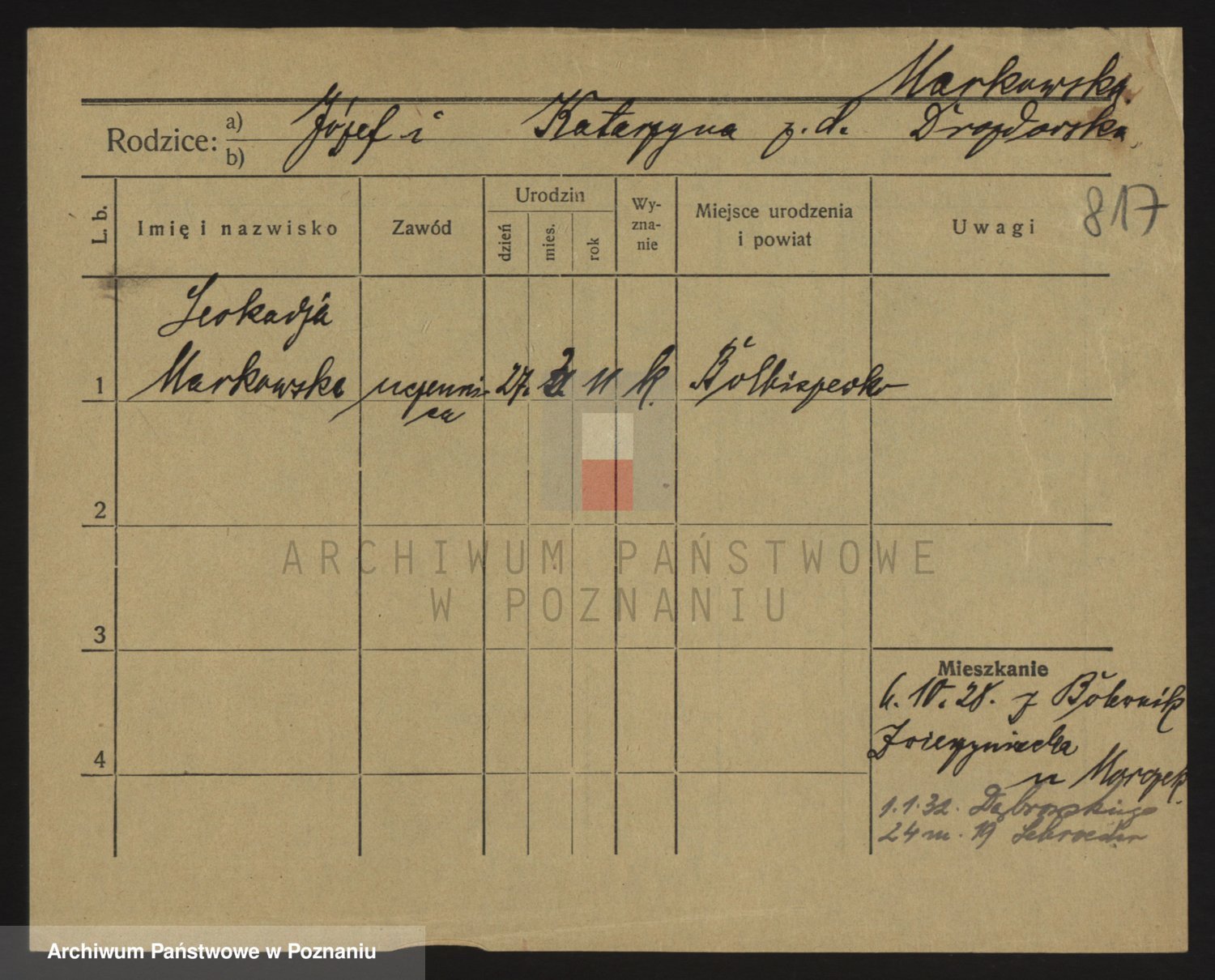 Podgląd karty osobowej dostępny jest po kliknięciu na nazwisko lub ikonkę karty. Można dokonywać powiększenia (ikony na górze) lub przechodzić między kolejnymi skanami (strzałki po bokach).