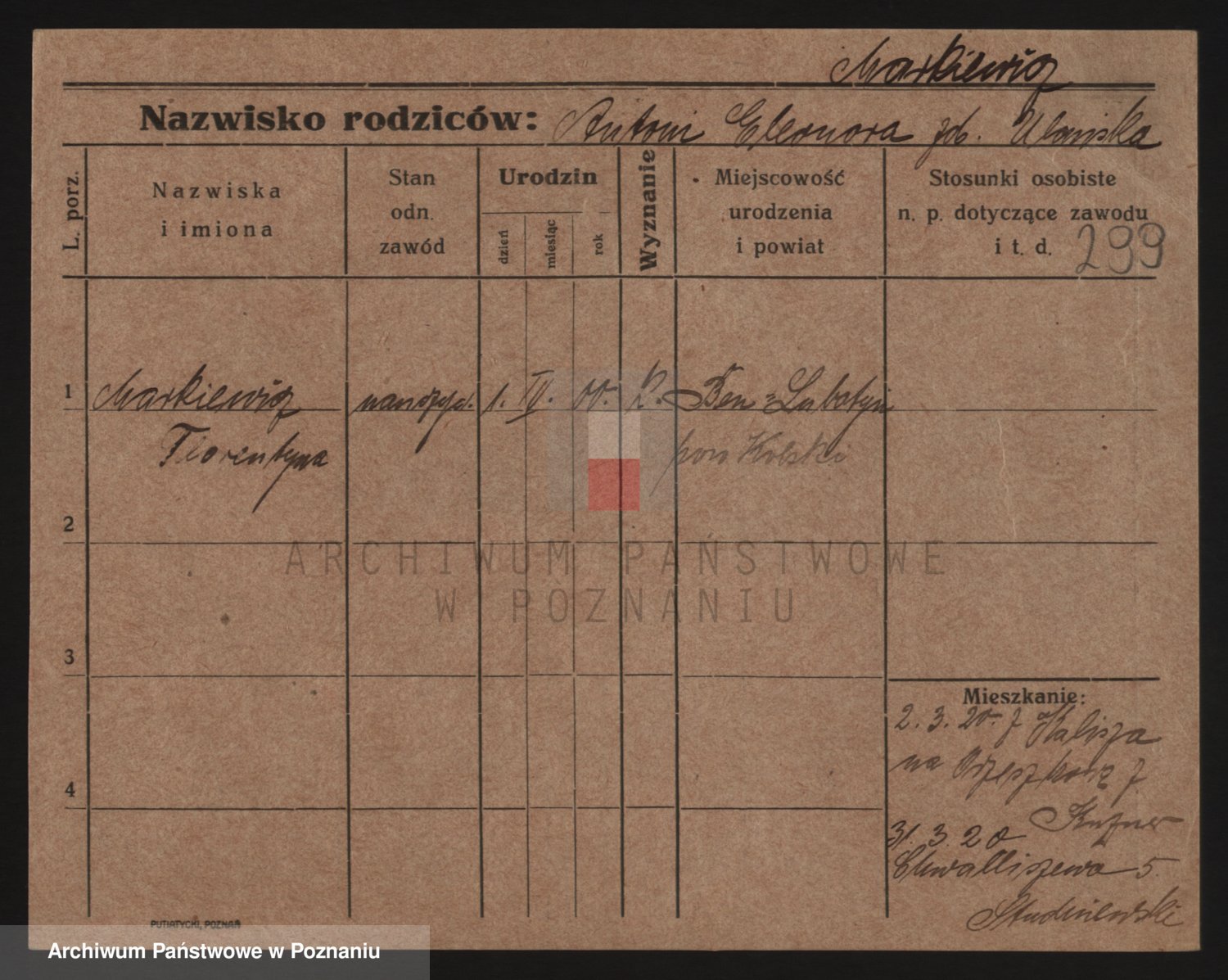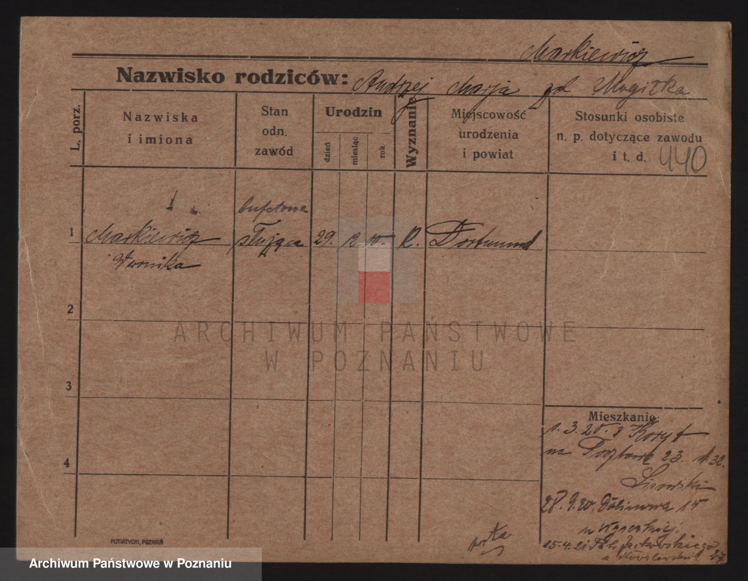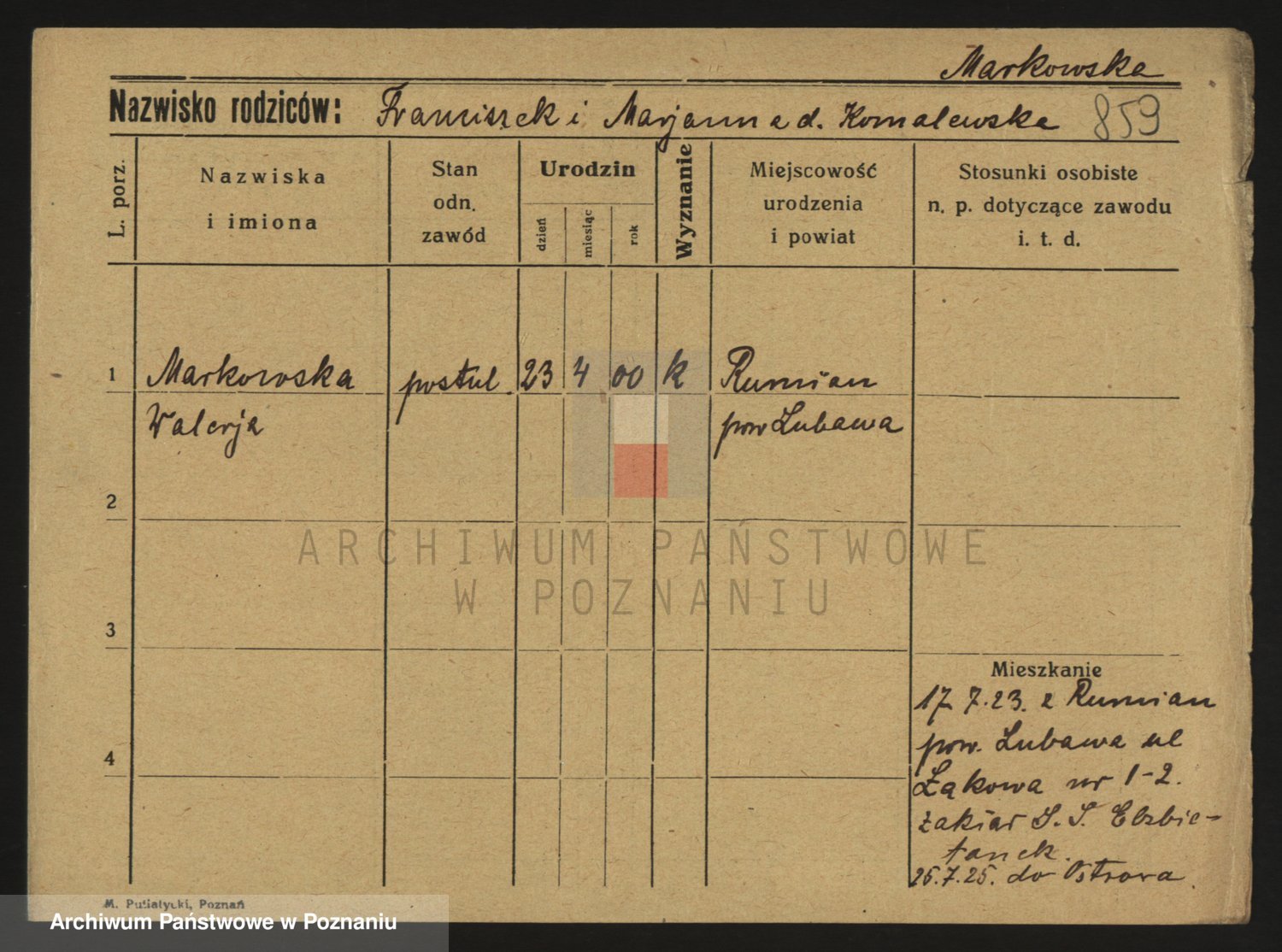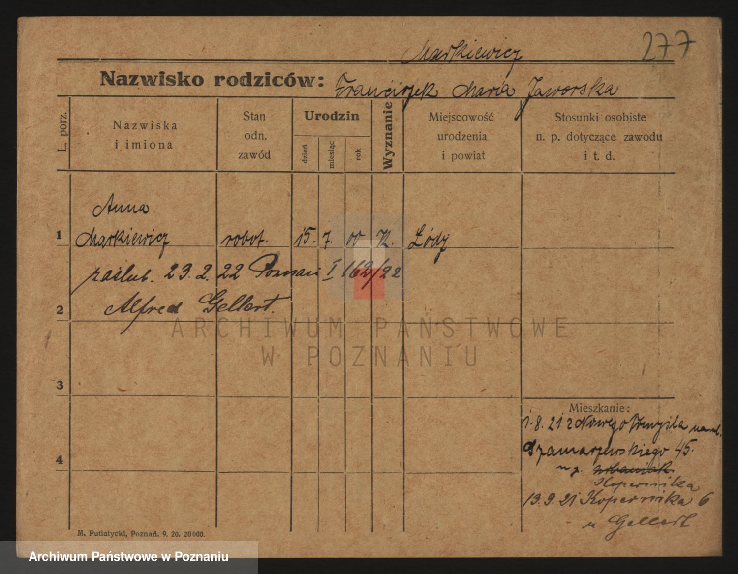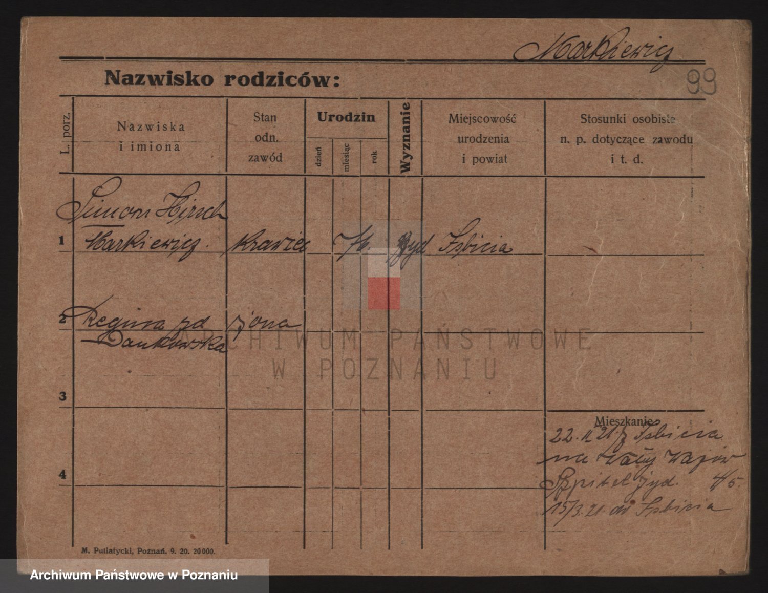 Podgląd karty osobowej dostępny jest po kliknięciu na nazwisko lub ikonkę karty. Można dokonywać powiększenia (ikony na górze) lub przechodzić między kolejnymi skanami (strzałki po bokach).