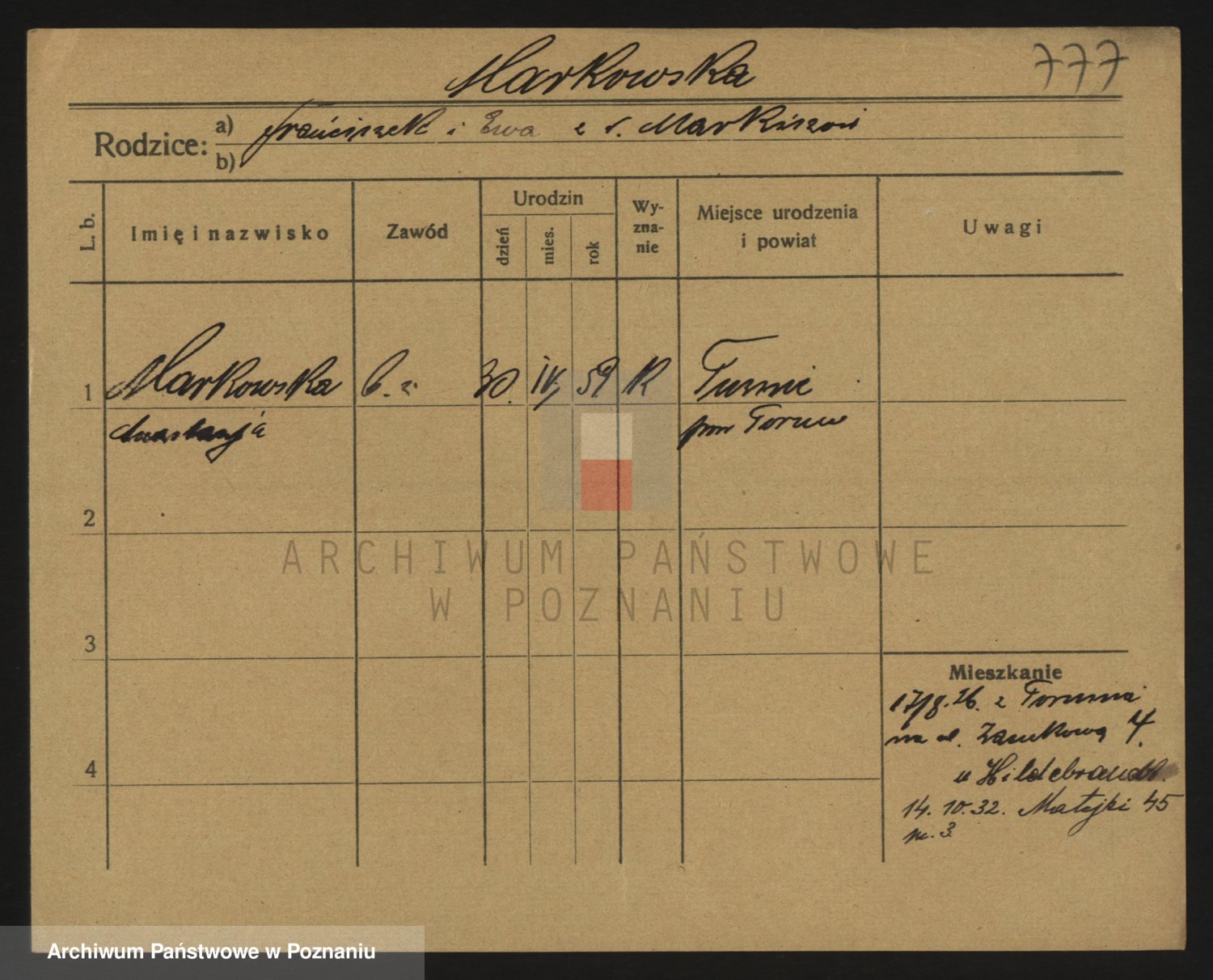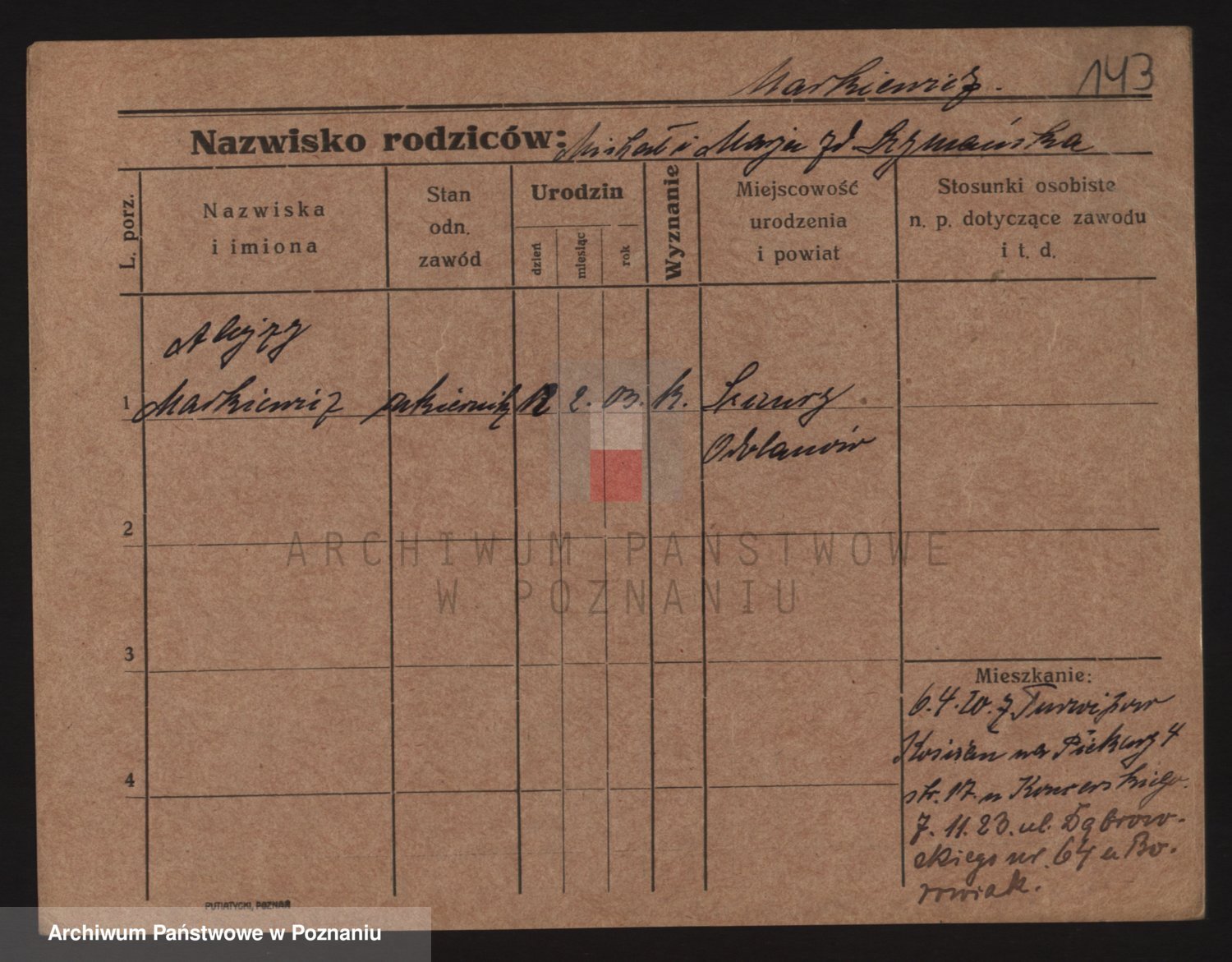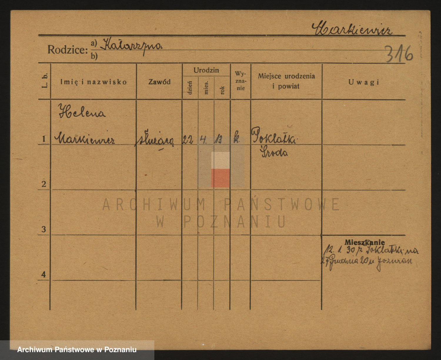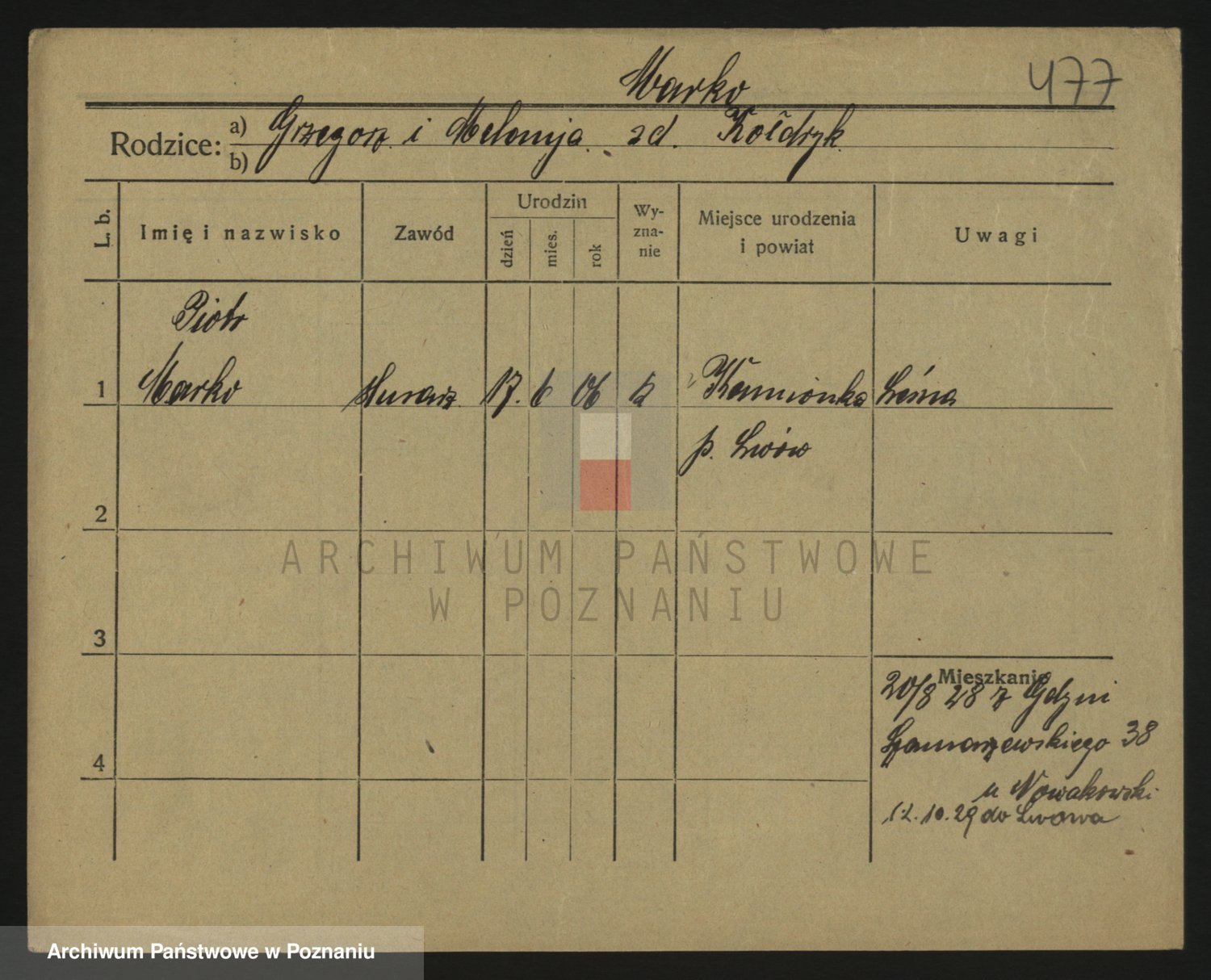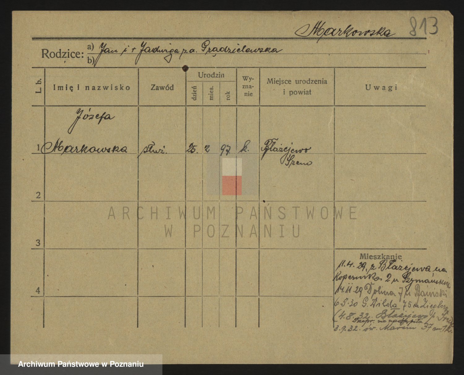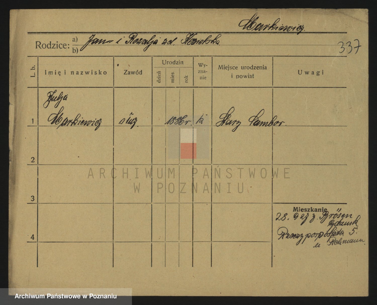 Podgląd karty osobowej dostępny jest po kliknięciu na nazwisko lub ikonkę karty. Można dokonywać powiększenia (ikony na górze) lub przechodzić między kolejnymi skanami (strzałki po bokach).