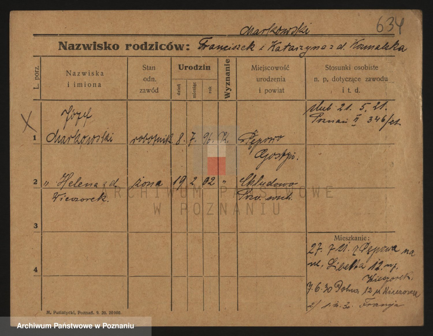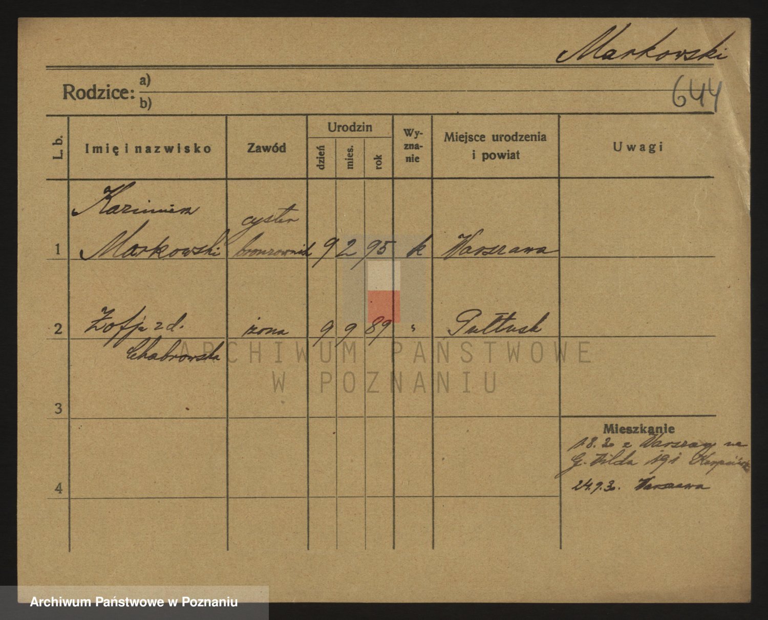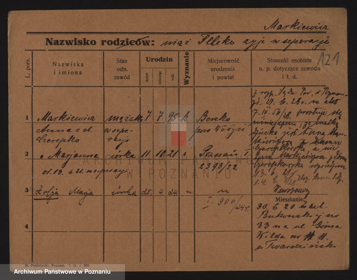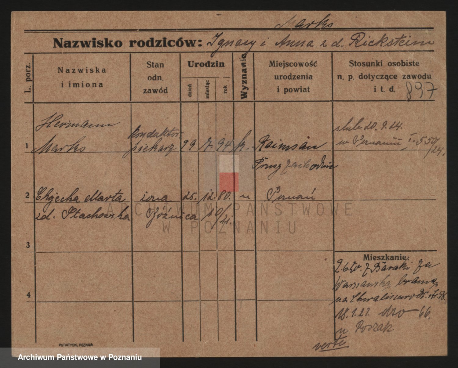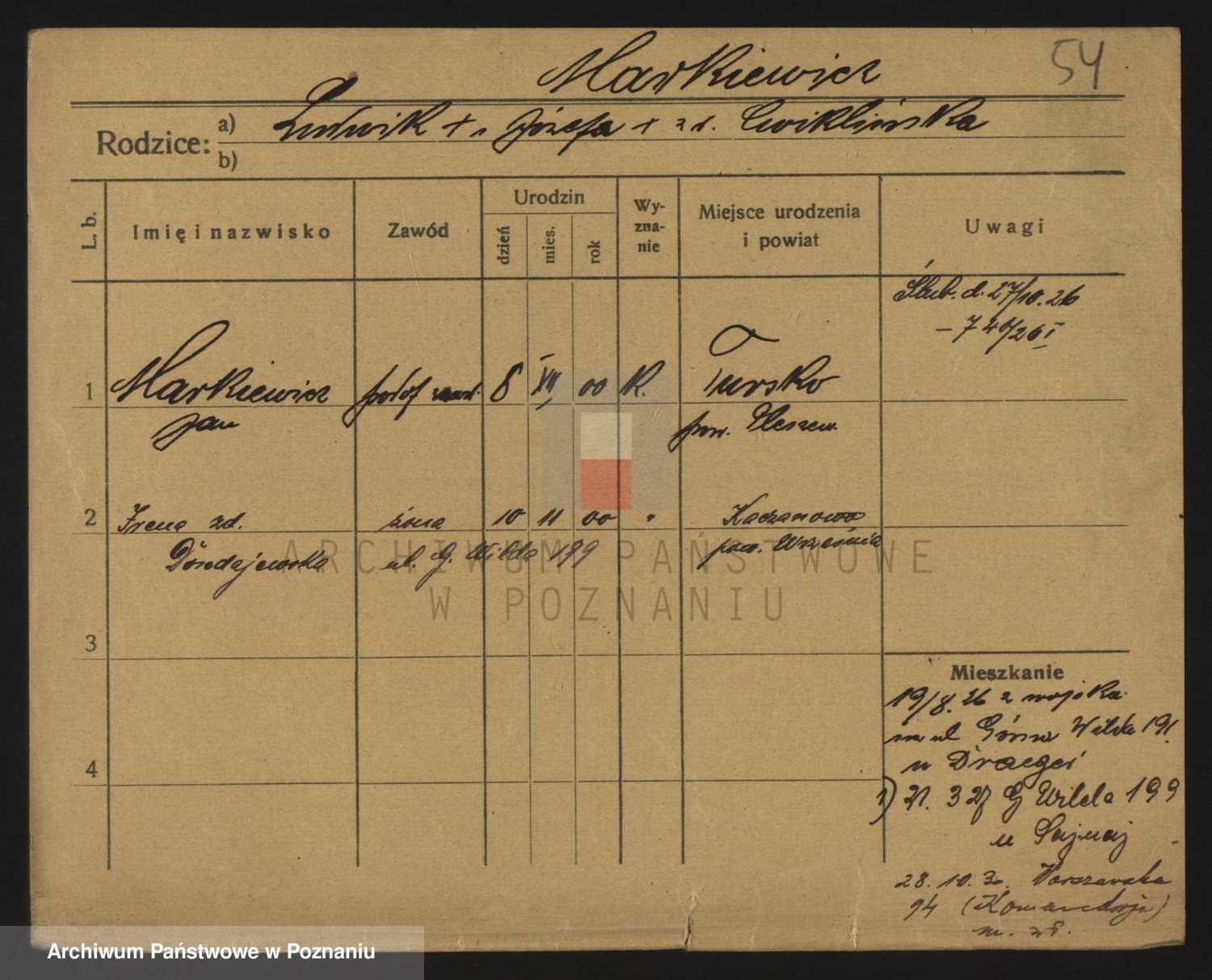 Podgląd karty osobowej dostępny jest po kliknięciu na nazwisko lub ikonkę karty. Można dokonywać powiększenia (ikony na górze) lub przechodzić między kolejnymi skanami (strzałki po bokach).