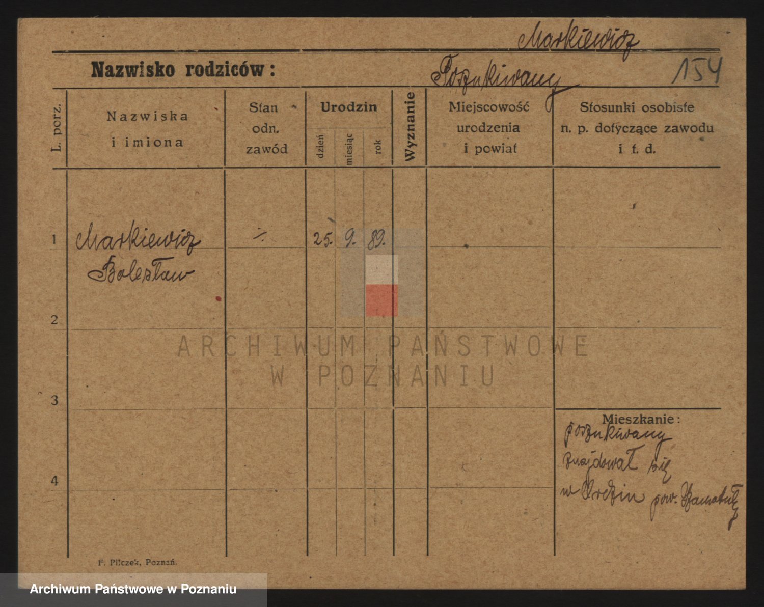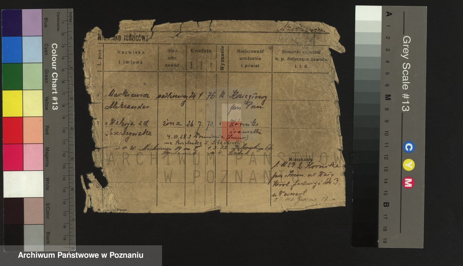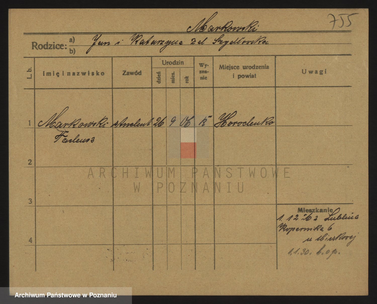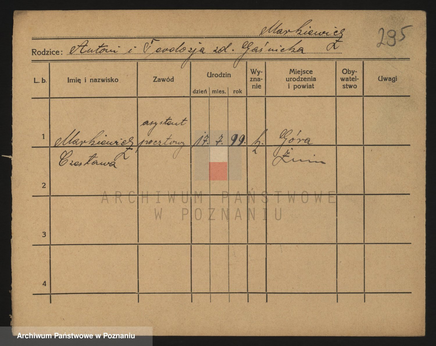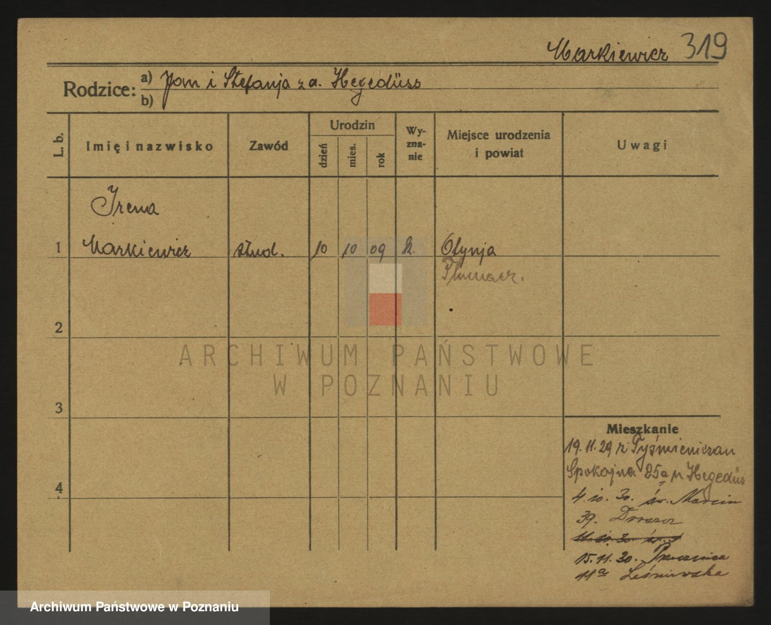 Podgląd karty osobowej dostępny jest po kliknięciu na nazwisko lub ikonkę karty. Można dokonywać powiększenia (ikony na górze) lub przechodzić między kolejnymi skanami (strzałki po bokach).