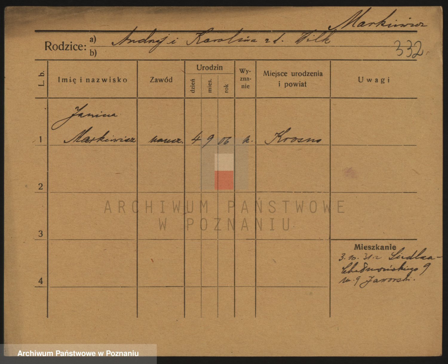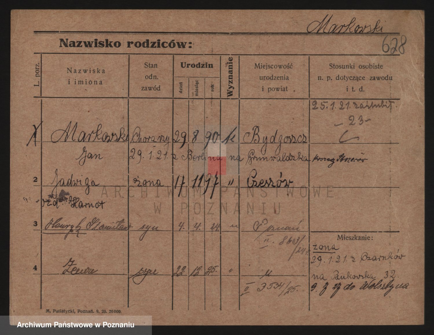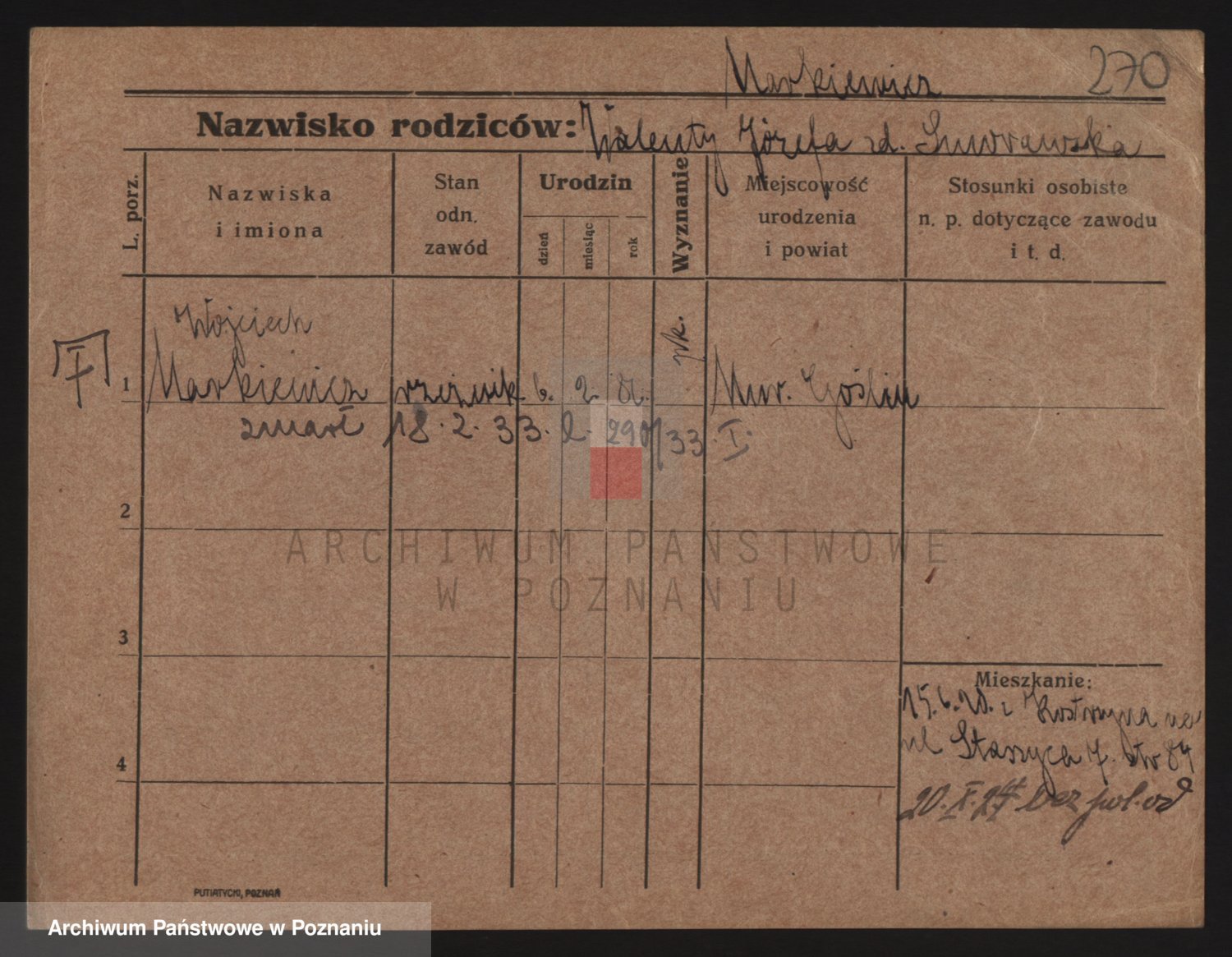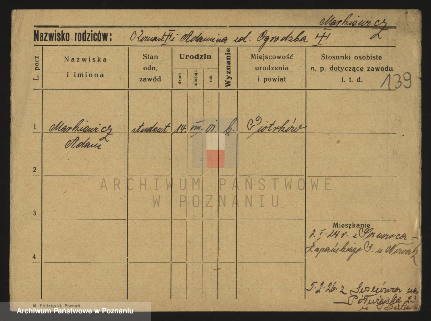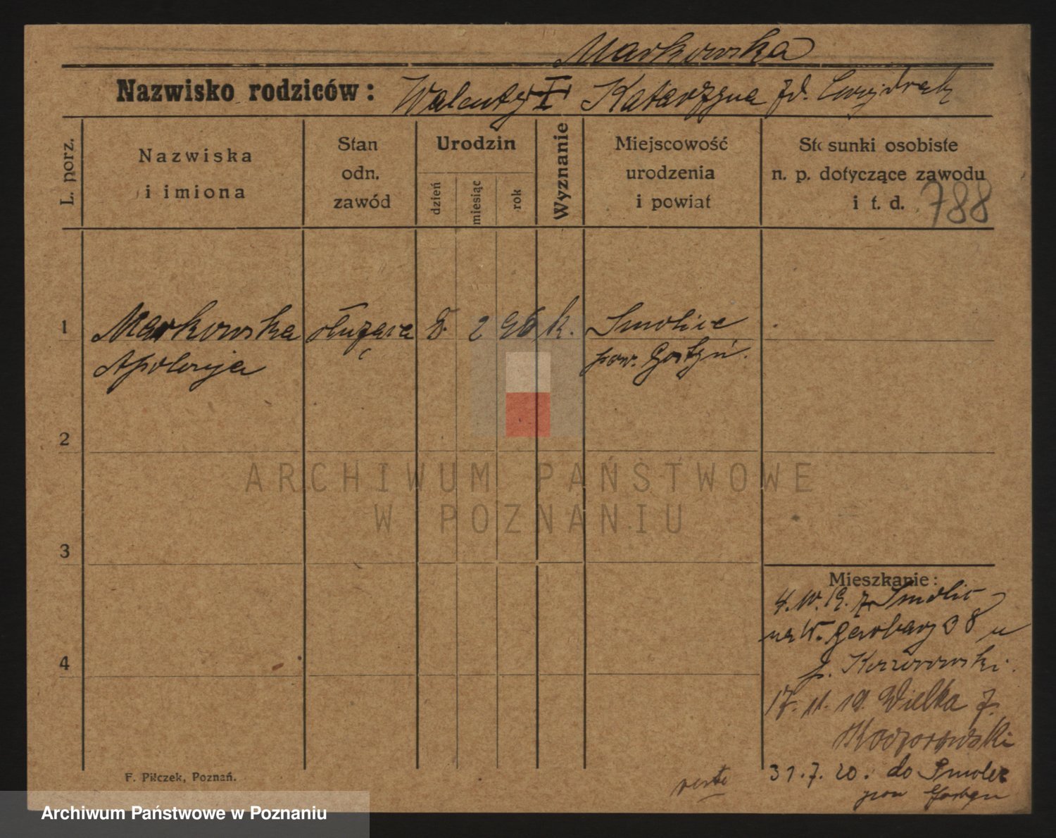 Podgląd karty osobowej dostępny jest po kliknięciu na nazwisko lub ikonkę karty. Można dokonywać powiększenia (ikony na górze) lub przechodzić między kolejnymi skanami (strzałki po bokach).
