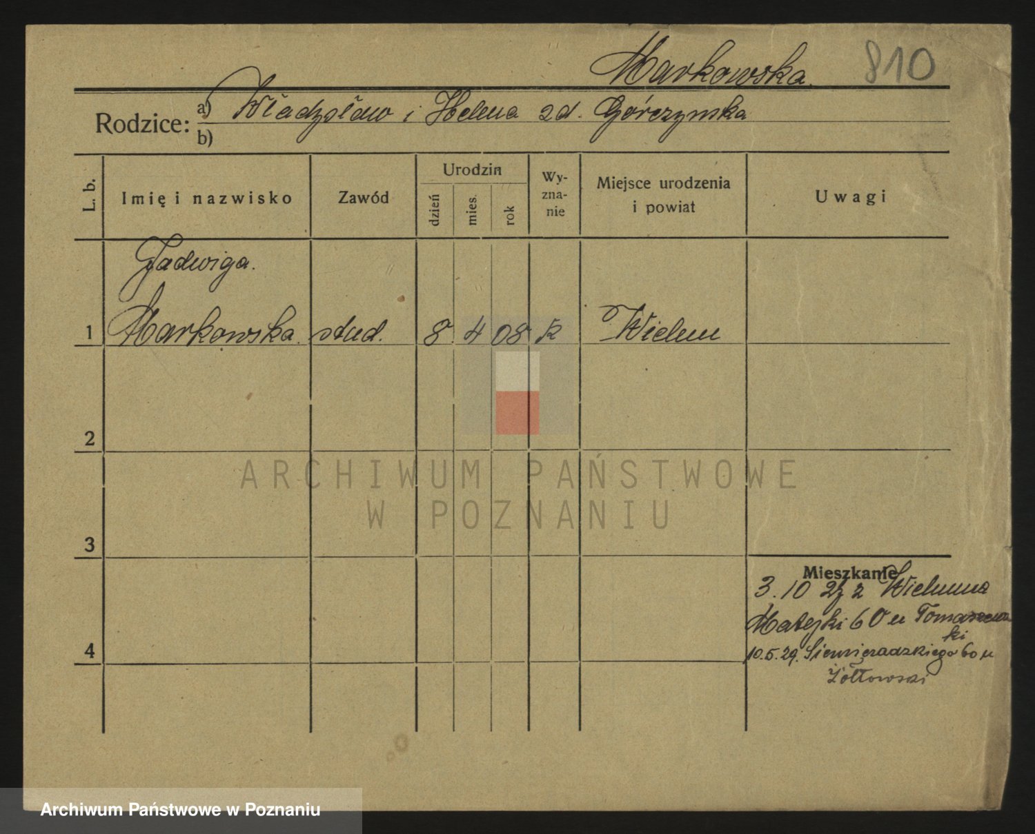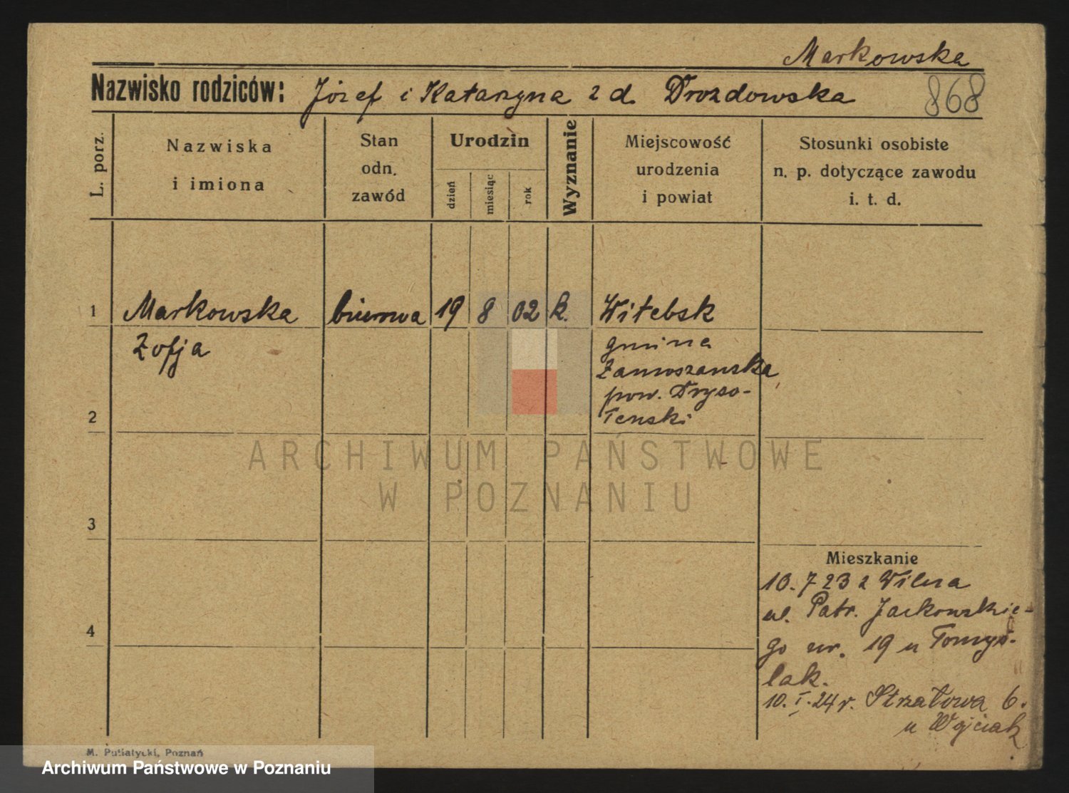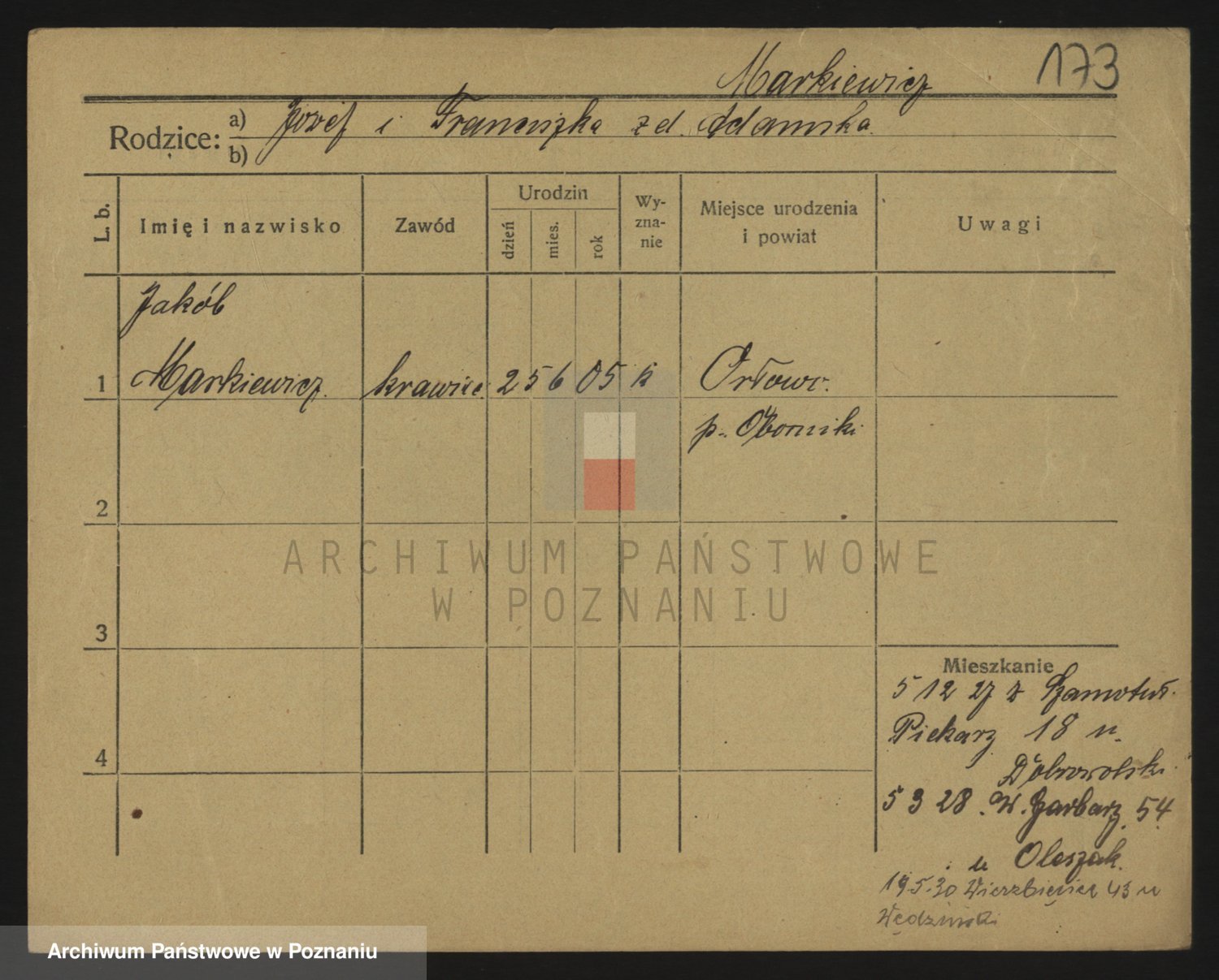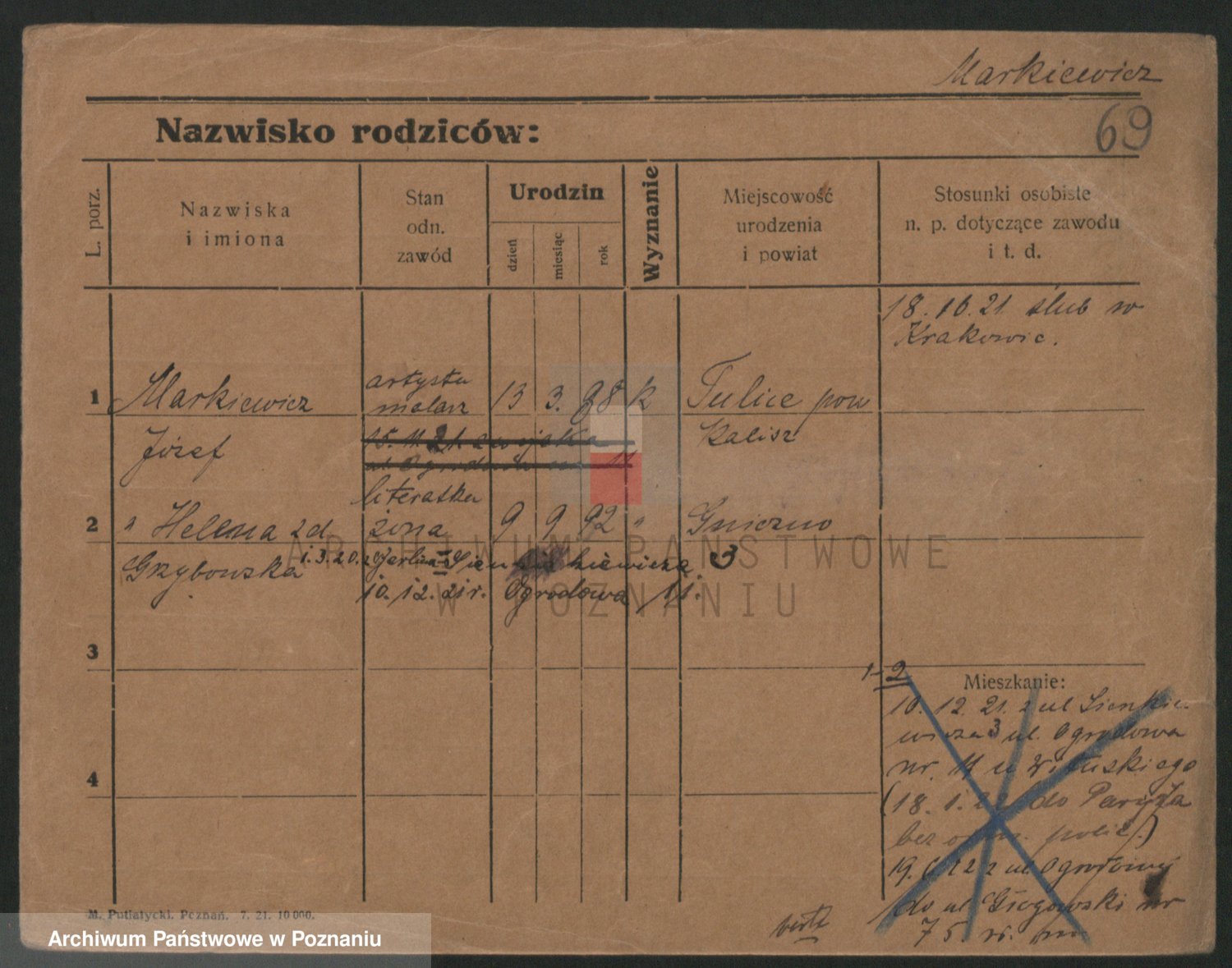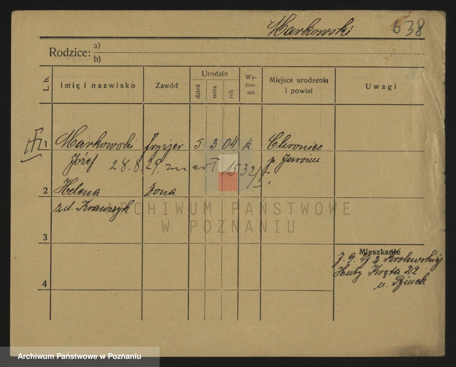 Podgląd karty osobowej dostępny jest po kliknięciu na nazwisko lub ikonkę karty. Można dokonywać powiększenia (ikony na górze) lub przechodzić między kolejnymi skanami (strzałki po bokach).