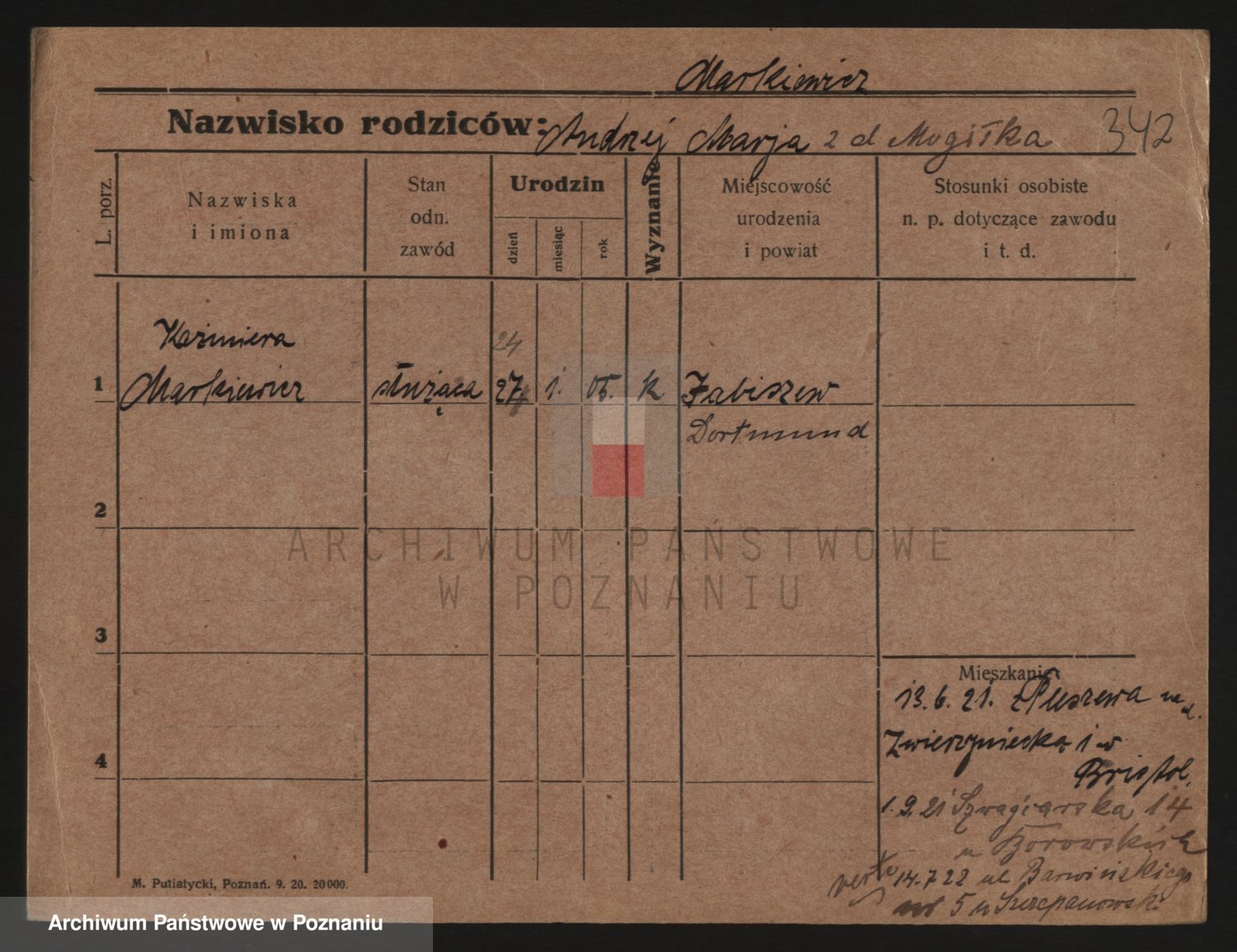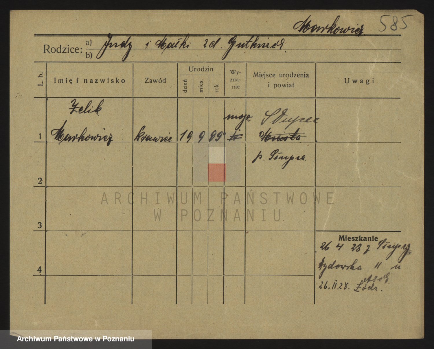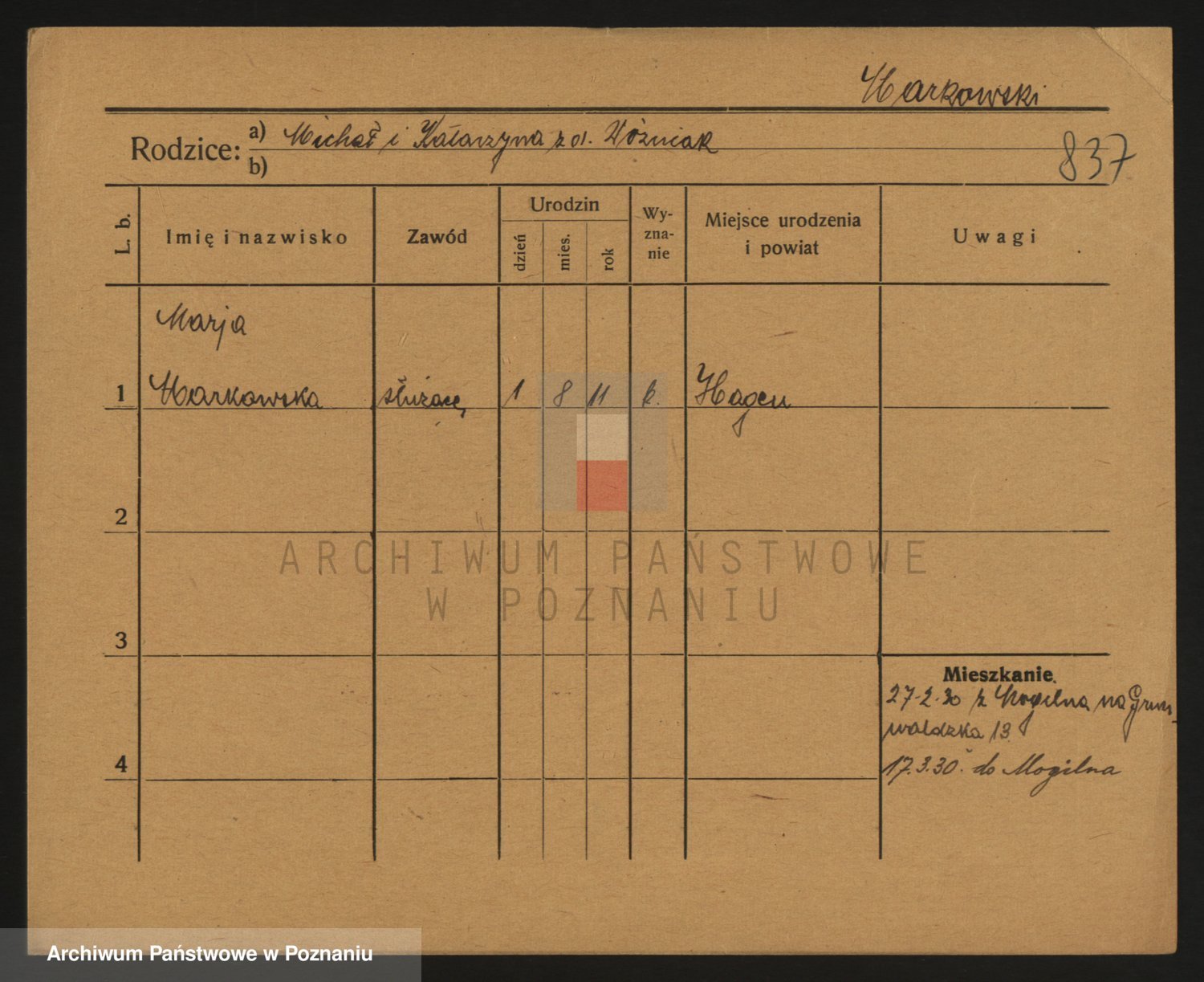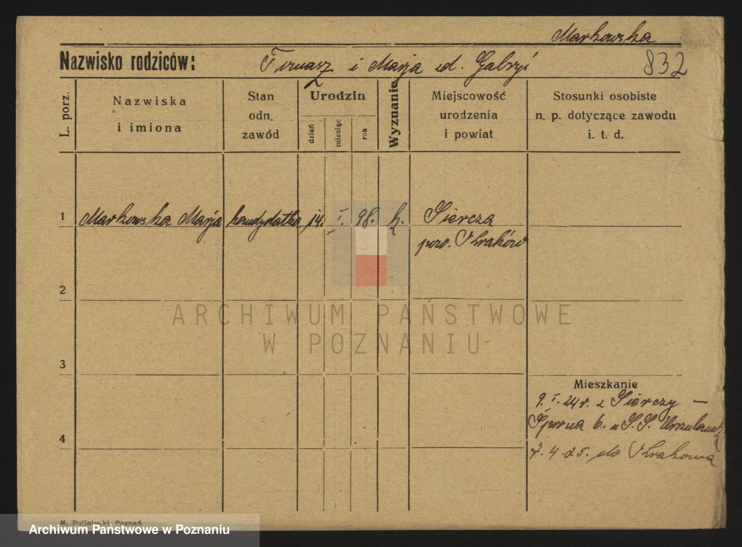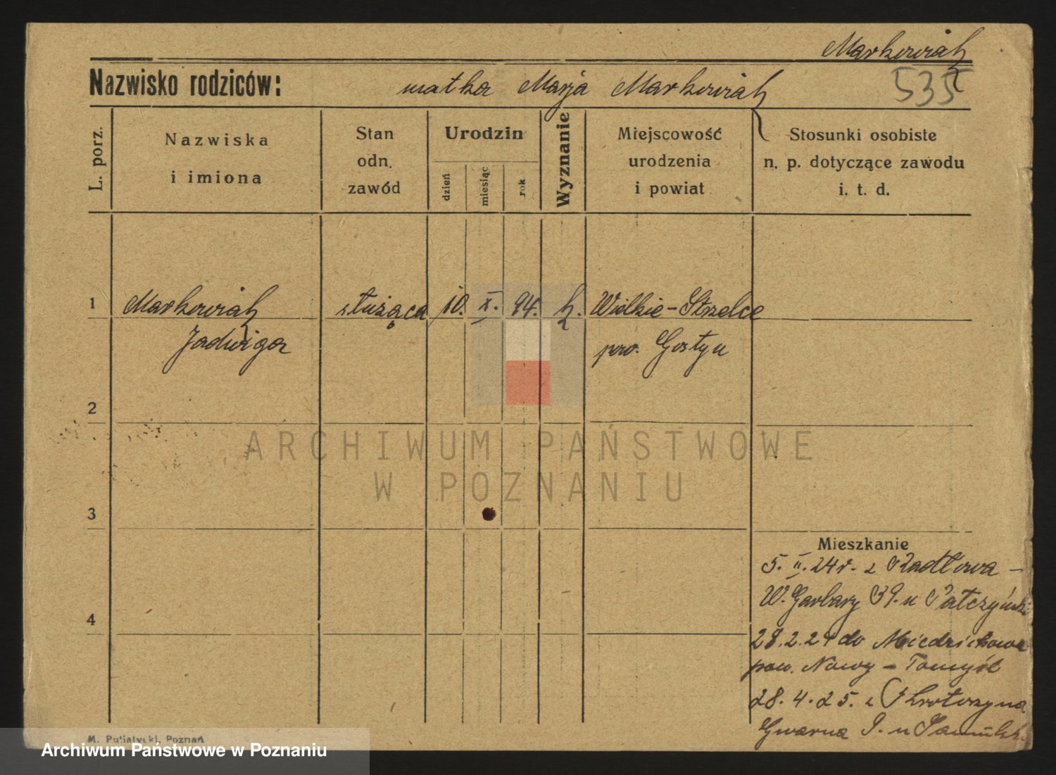 Podgląd karty osobowej dostępny jest po kliknięciu na nazwisko lub ikonkę karty. Można dokonywać powiększenia (ikony na górze) lub przechodzić między kolejnymi skanami (strzałki po bokach).