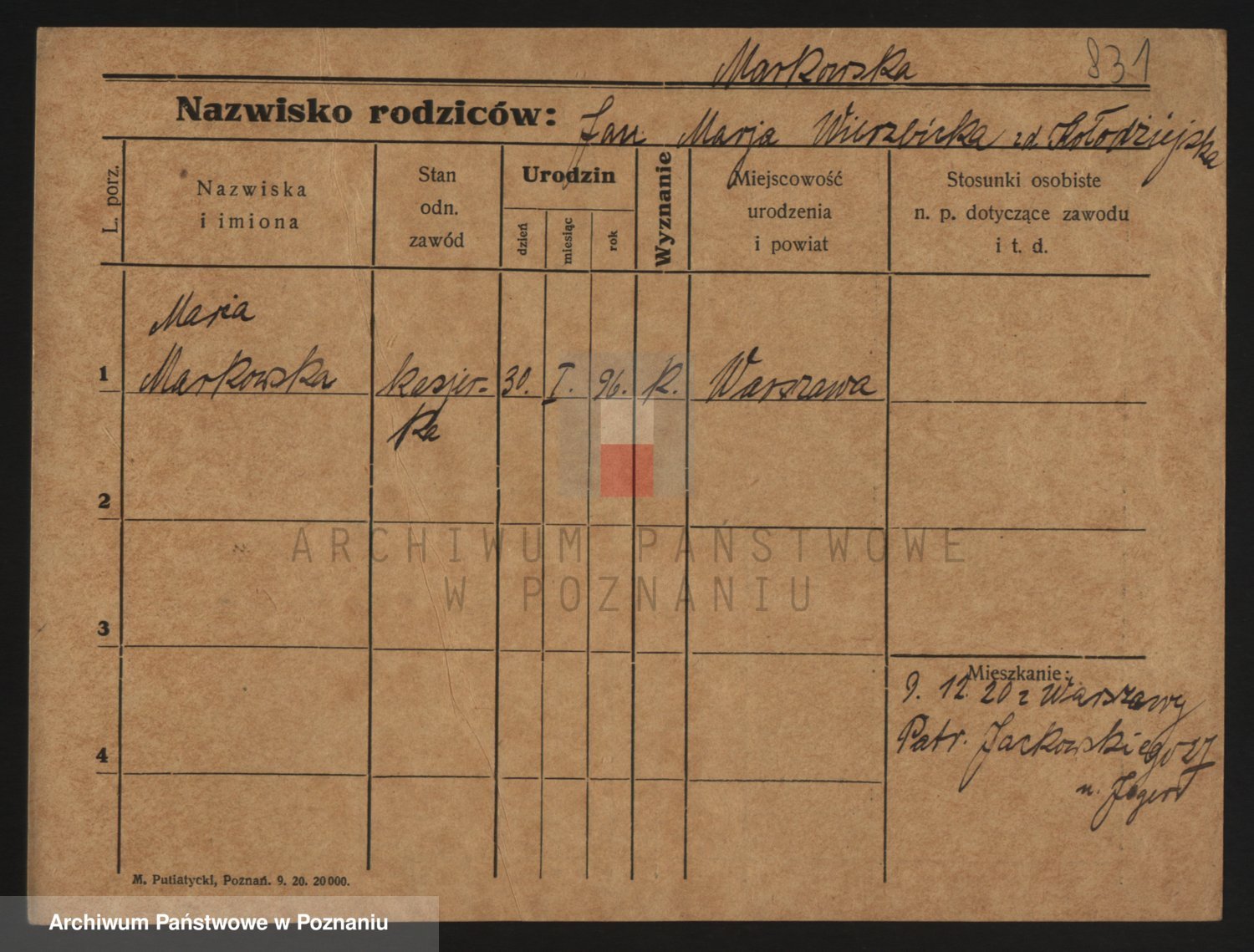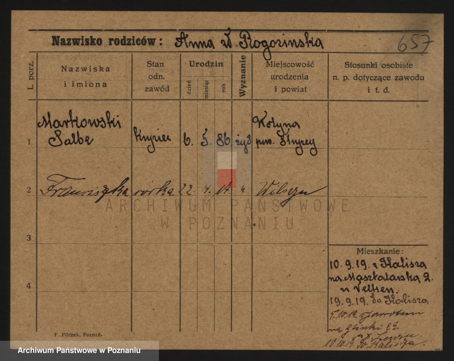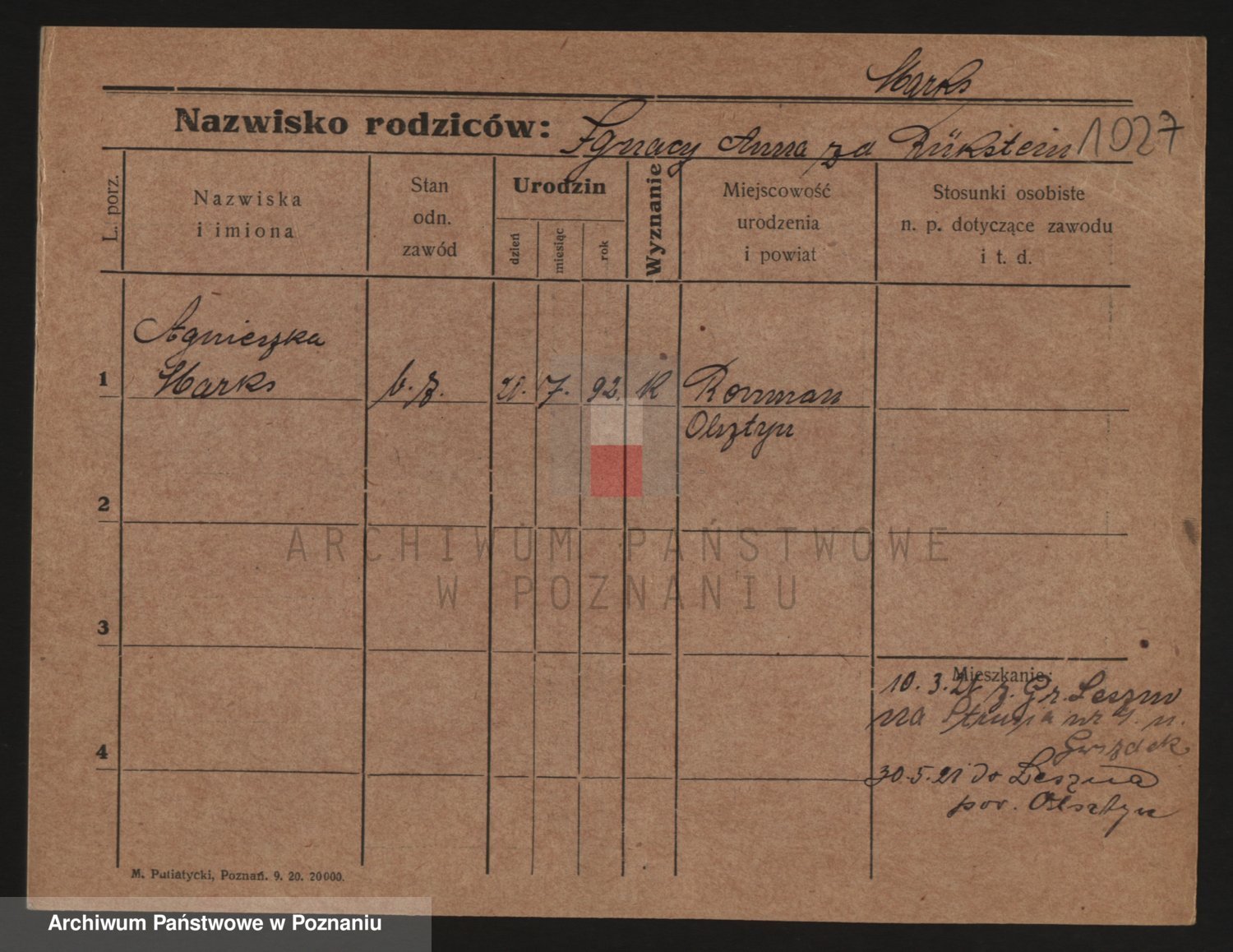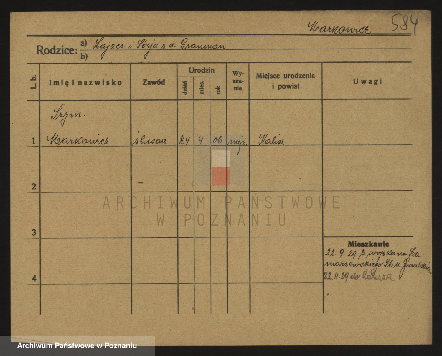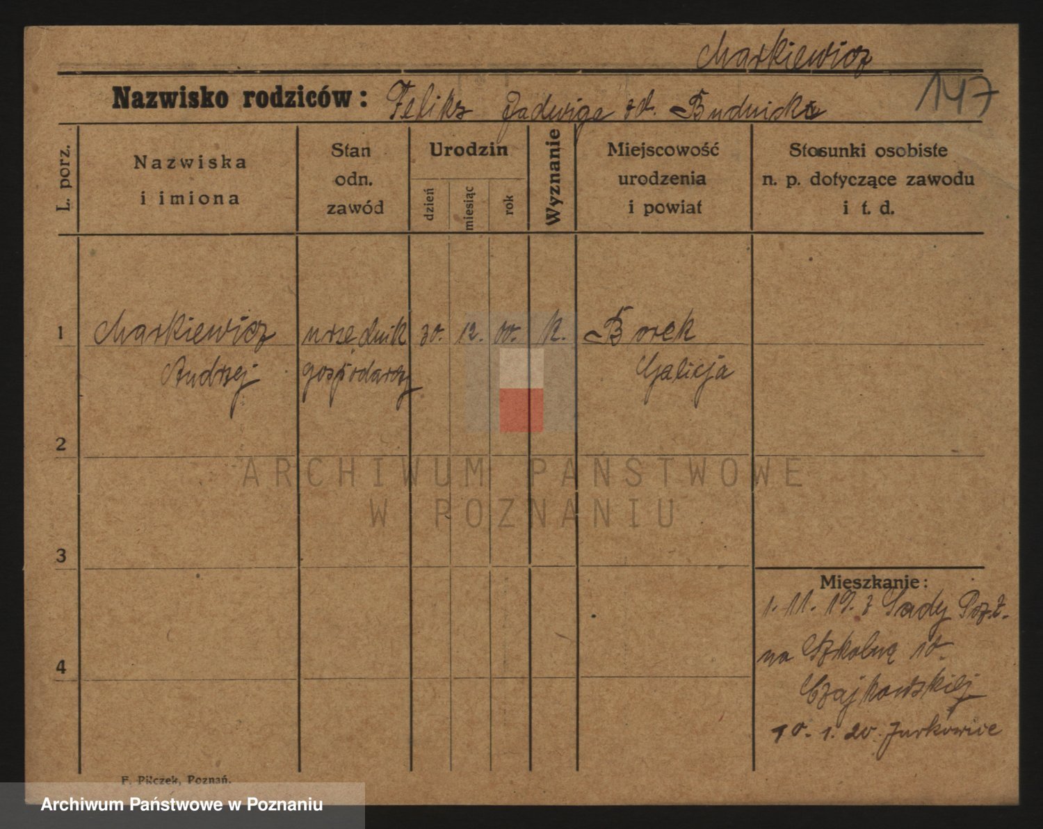 Podgląd karty osobowej dostępny jest po kliknięciu na nazwisko lub ikonkę karty. Można dokonywać powiększenia (ikony na górze) lub przechodzić między kolejnymi skanami (strzałki po bokach).