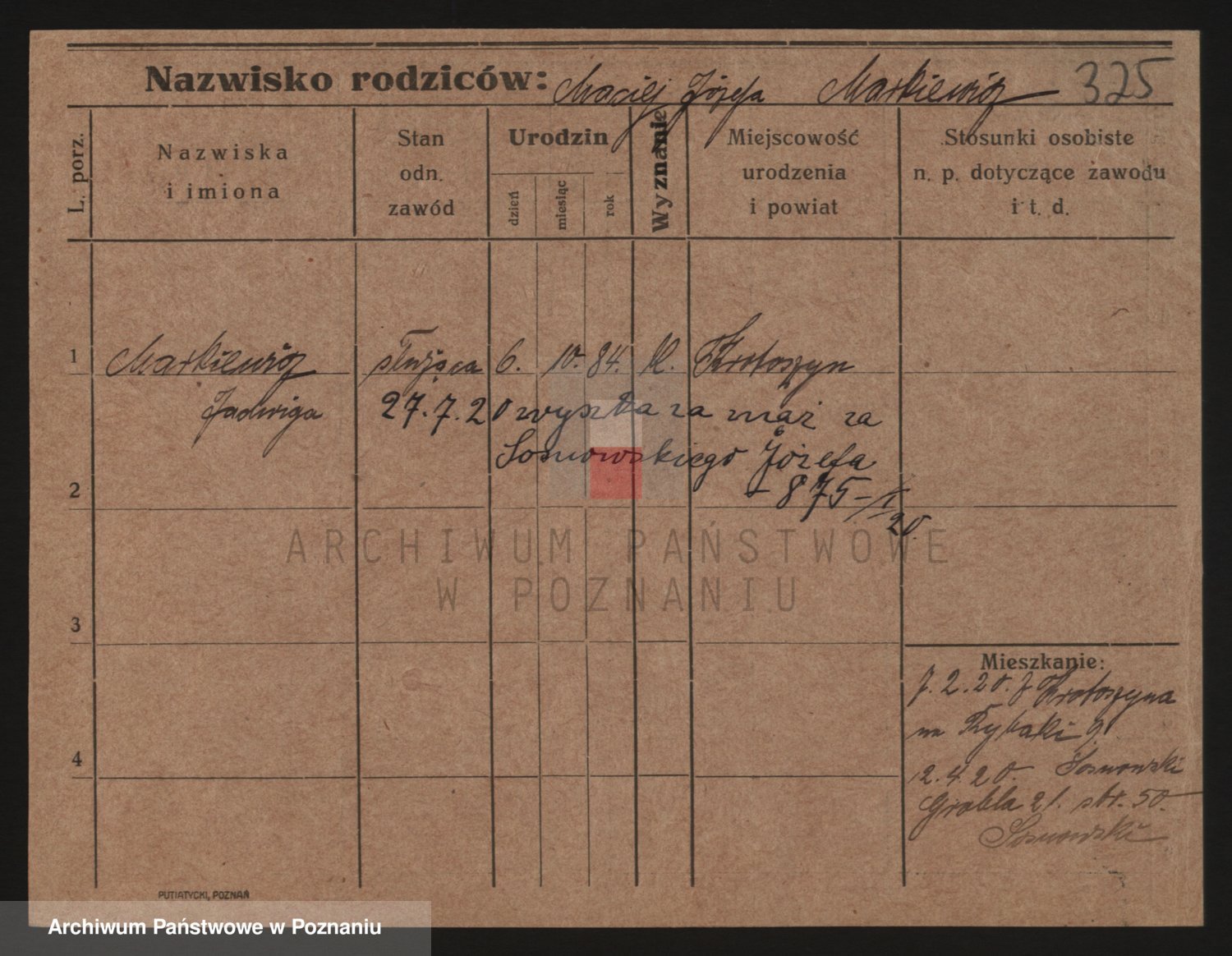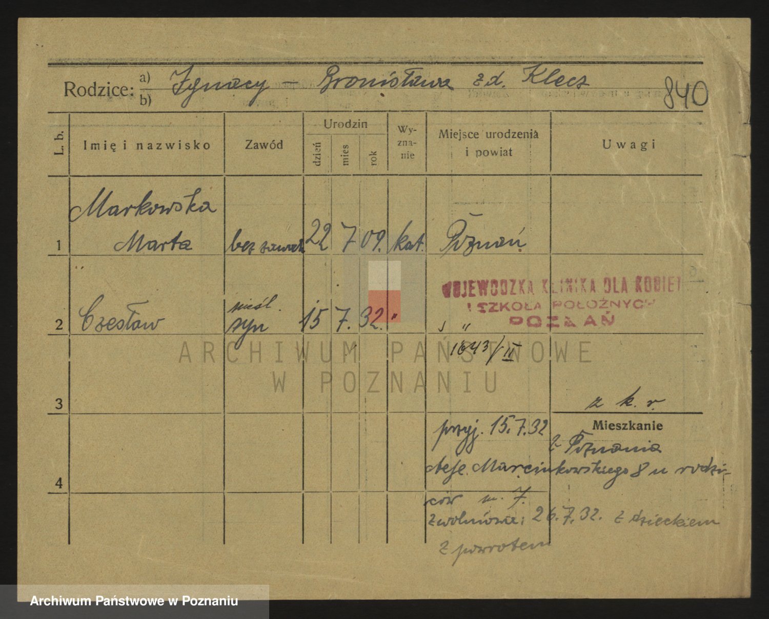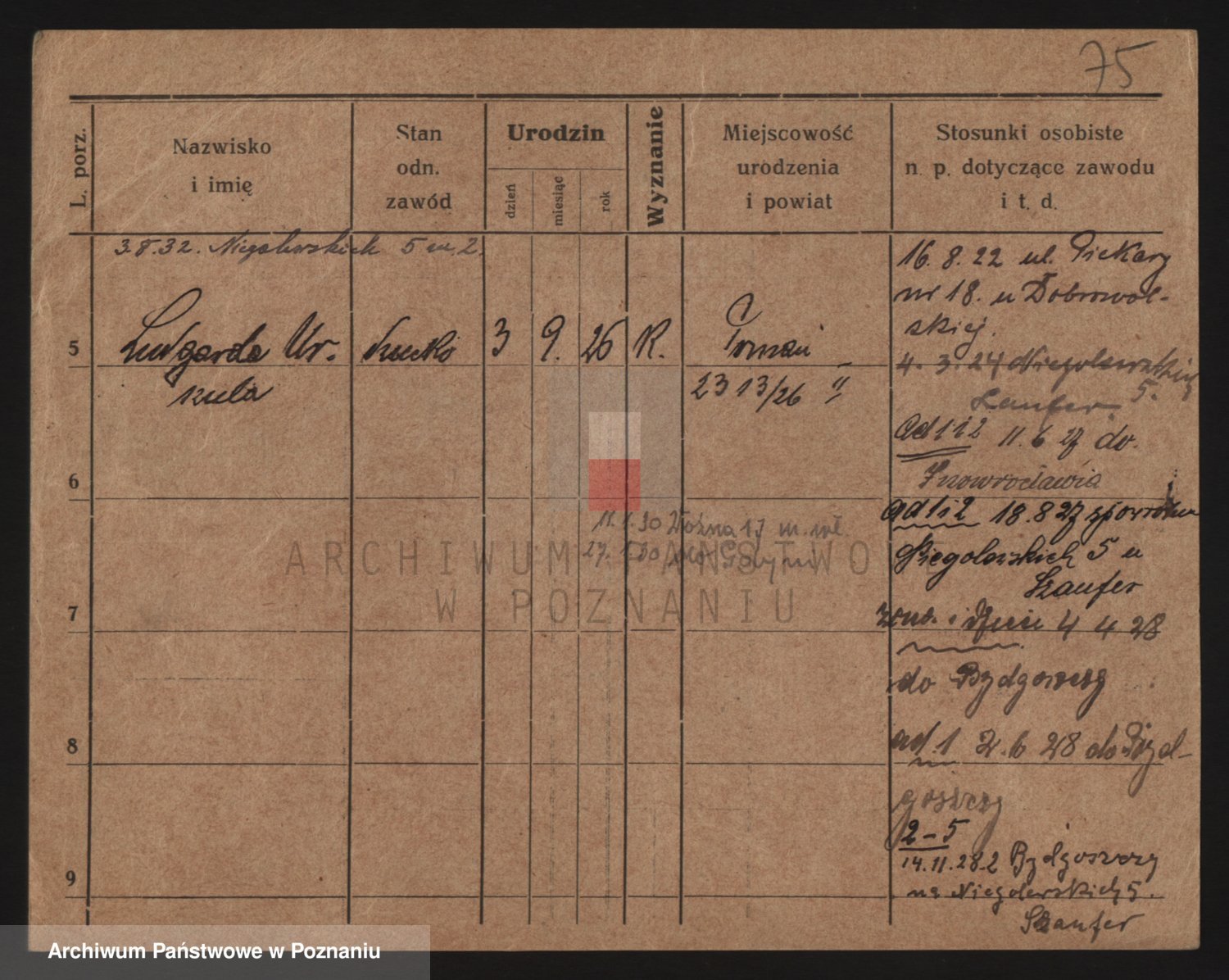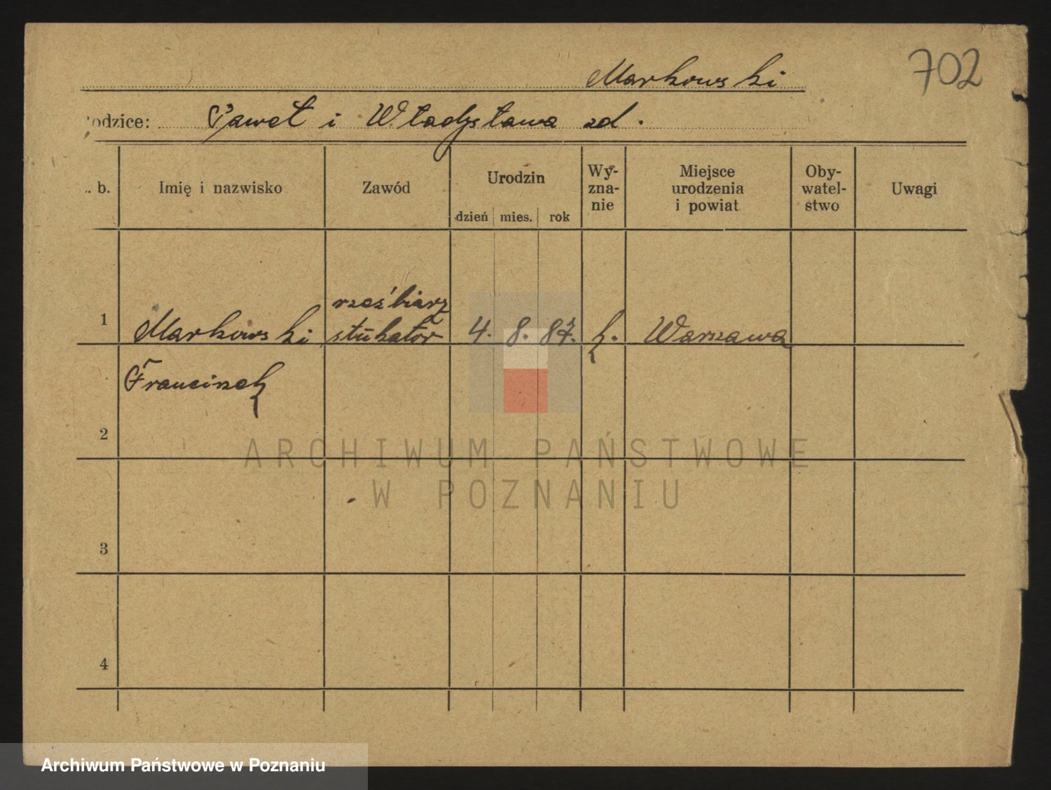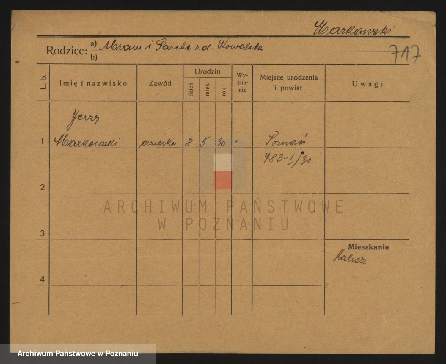 Podgląd karty osobowej dostępny jest po kliknięciu na nazwisko lub ikonkę karty. Można dokonywać powiększenia (ikony na górze) lub przechodzić między kolejnymi skanami (strzałki po bokach).