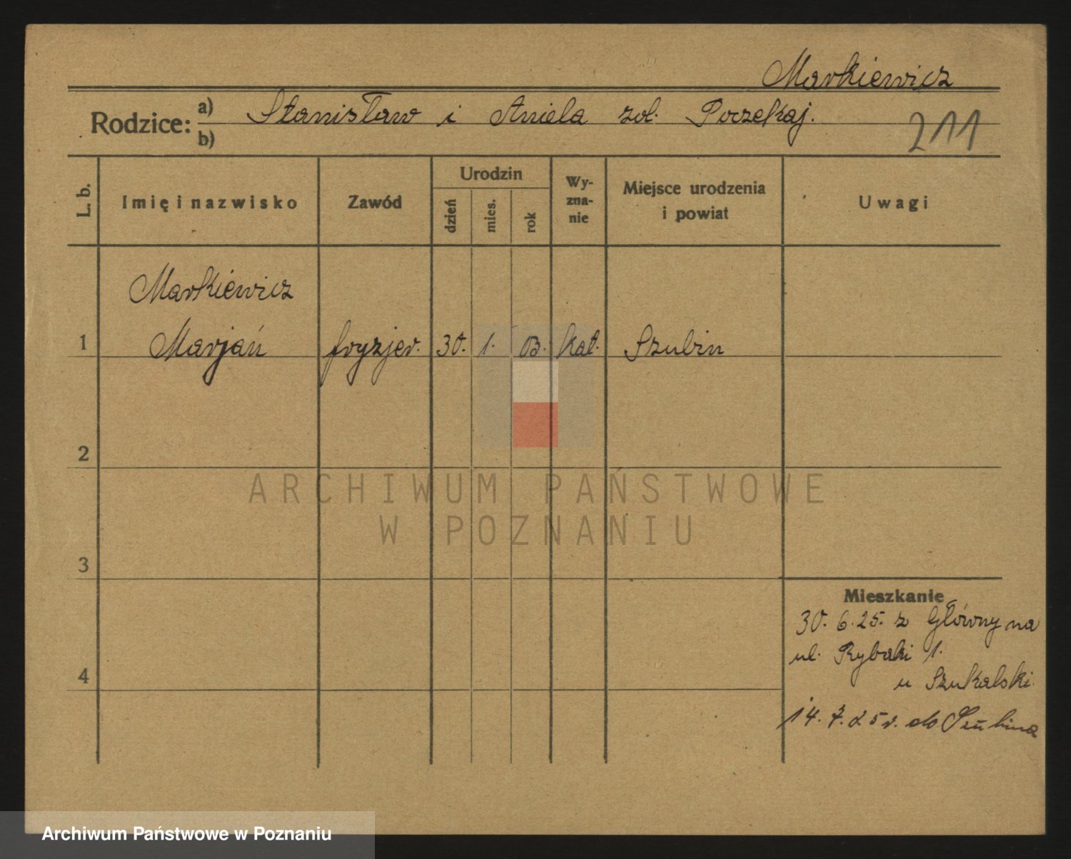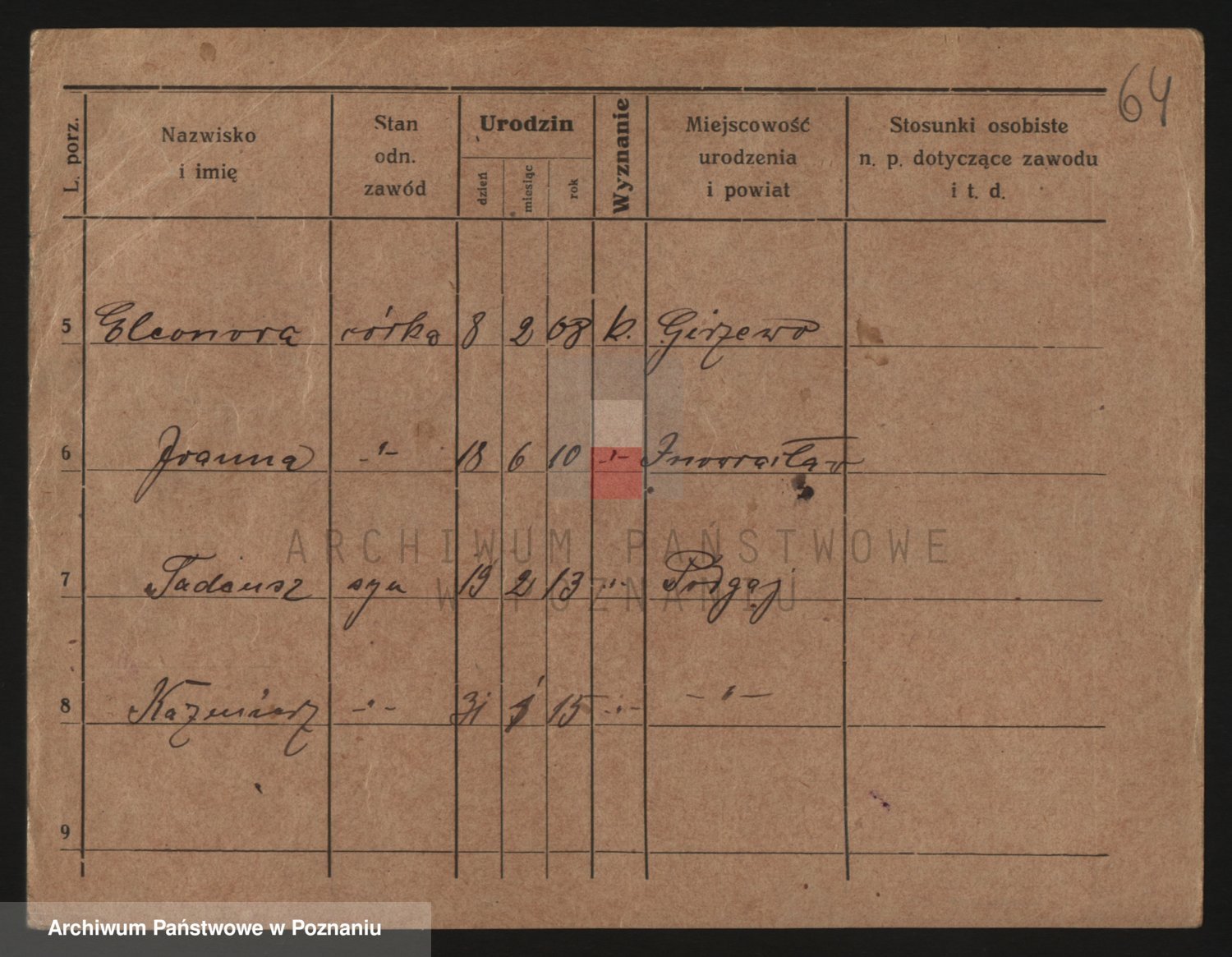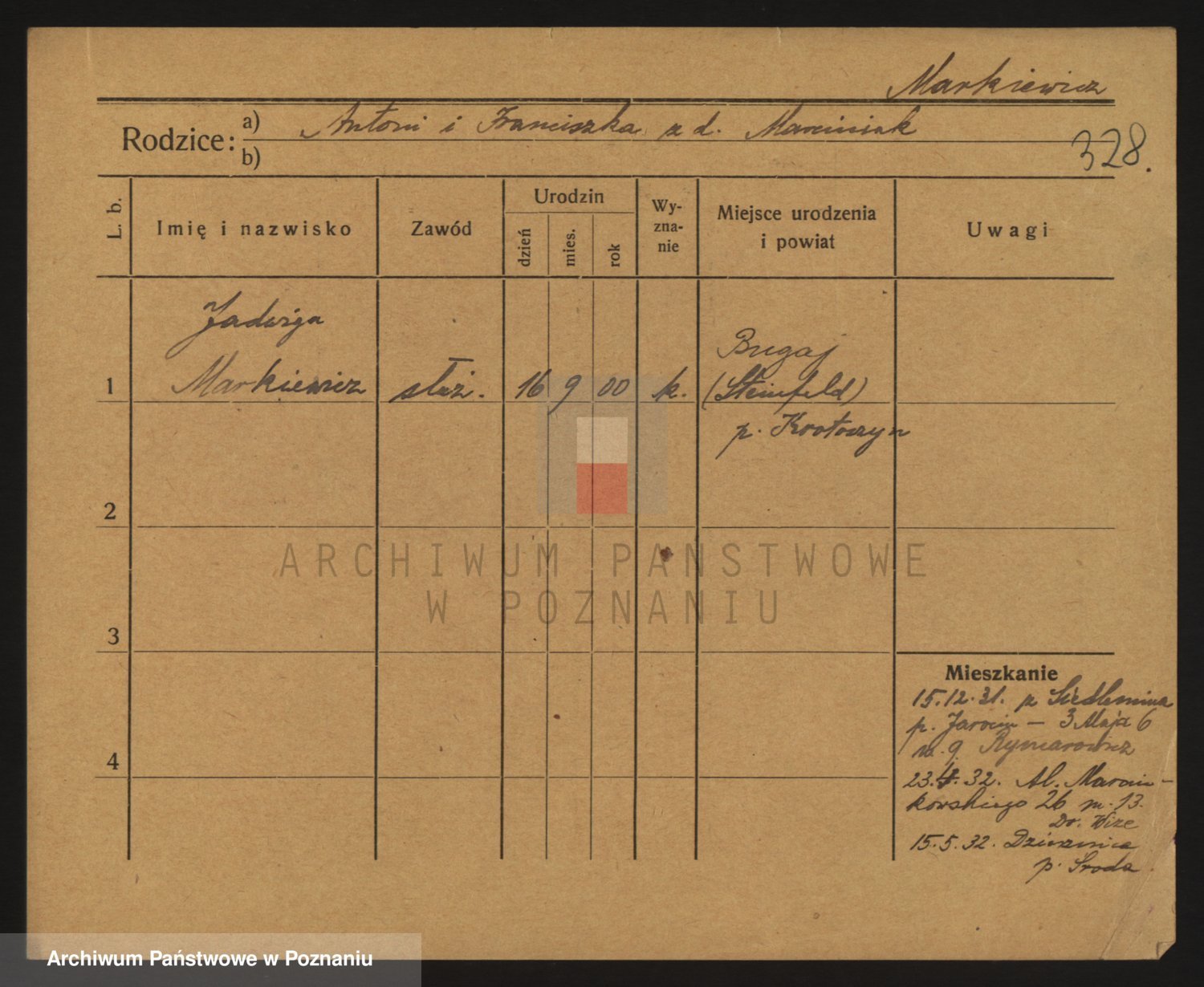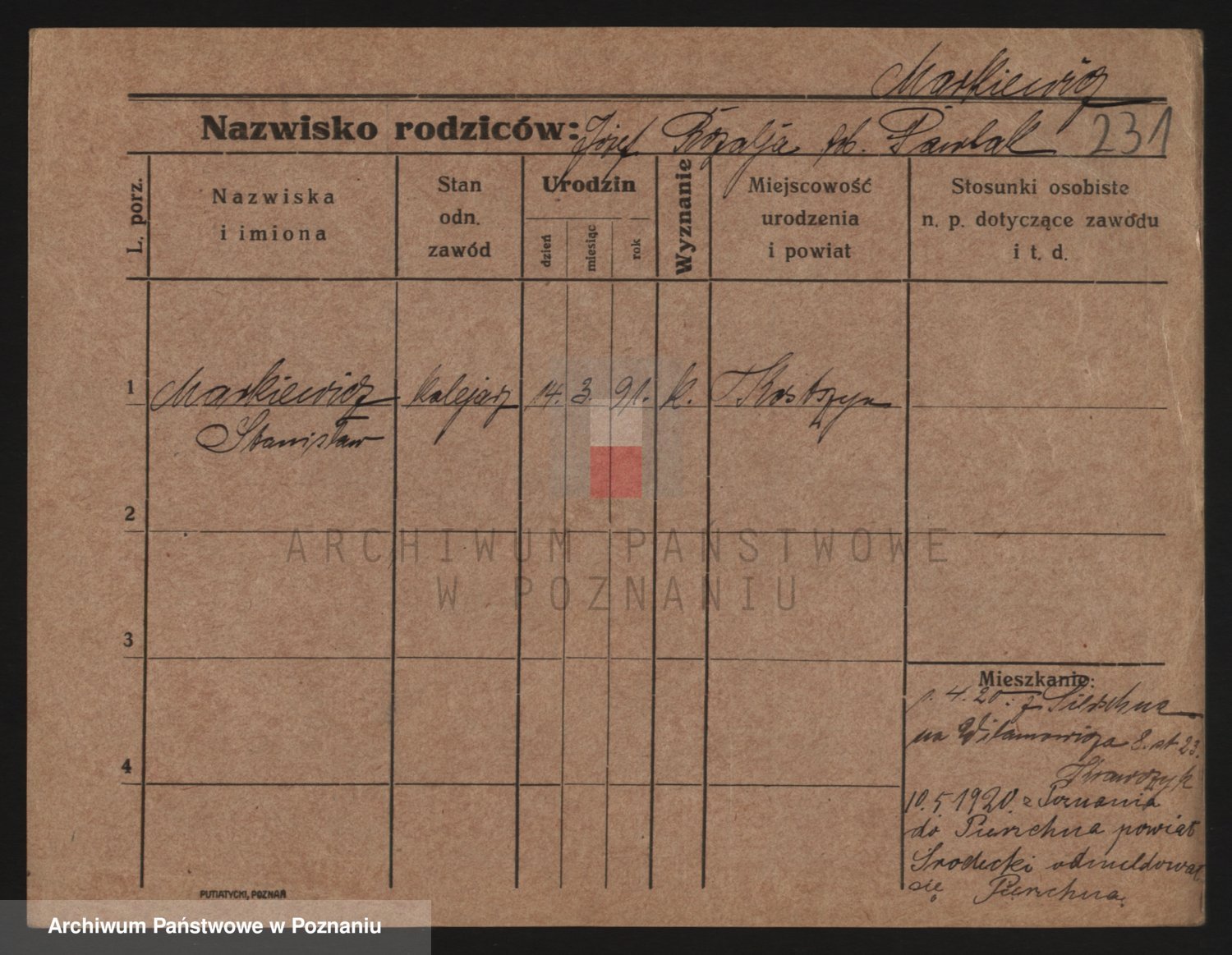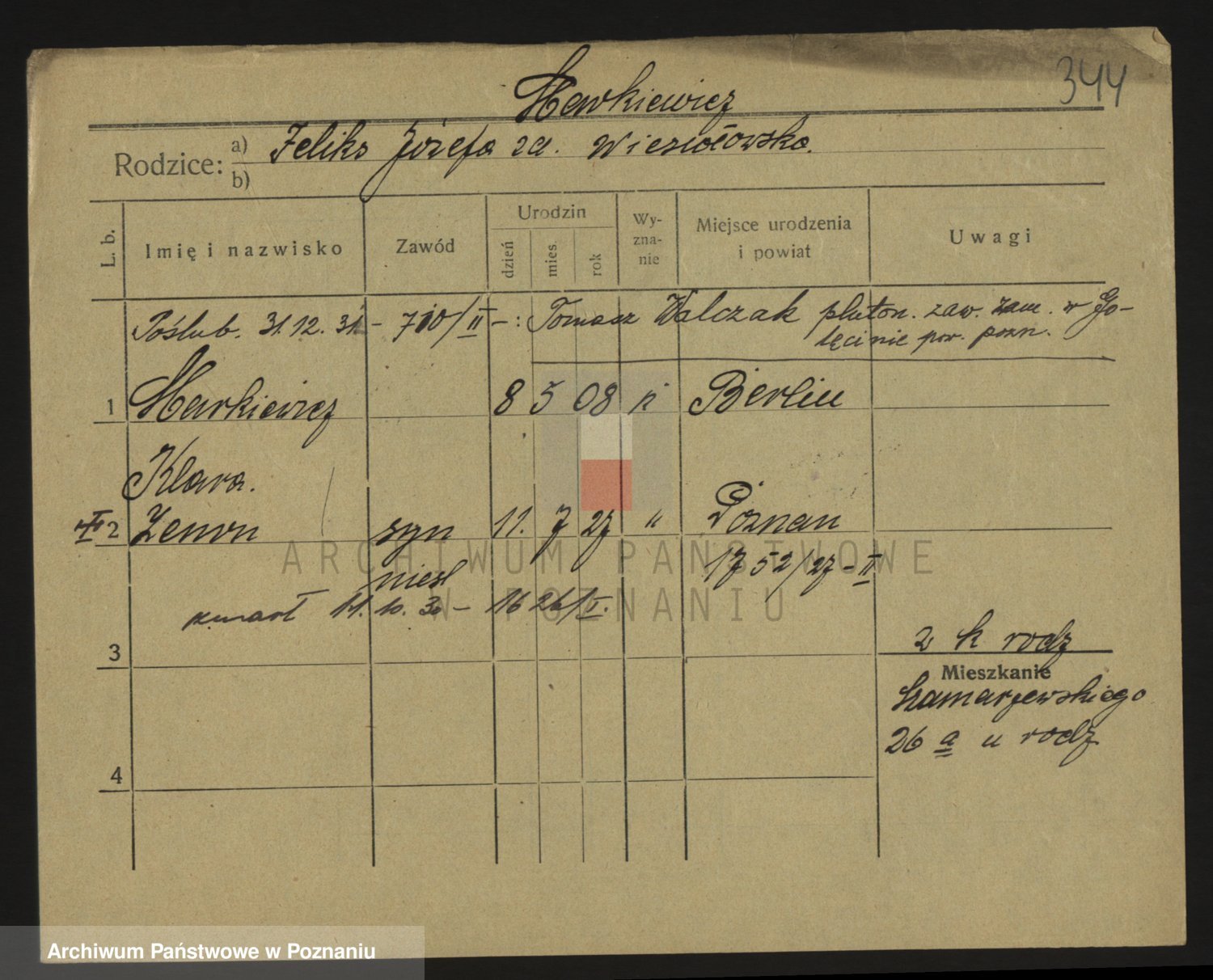 Podgląd karty osobowej dostępny jest po kliknięciu na nazwisko lub ikonkę karty. Można dokonywać powiększenia (ikony na górze) lub przechodzić między kolejnymi skanami (strzałki po bokach).
