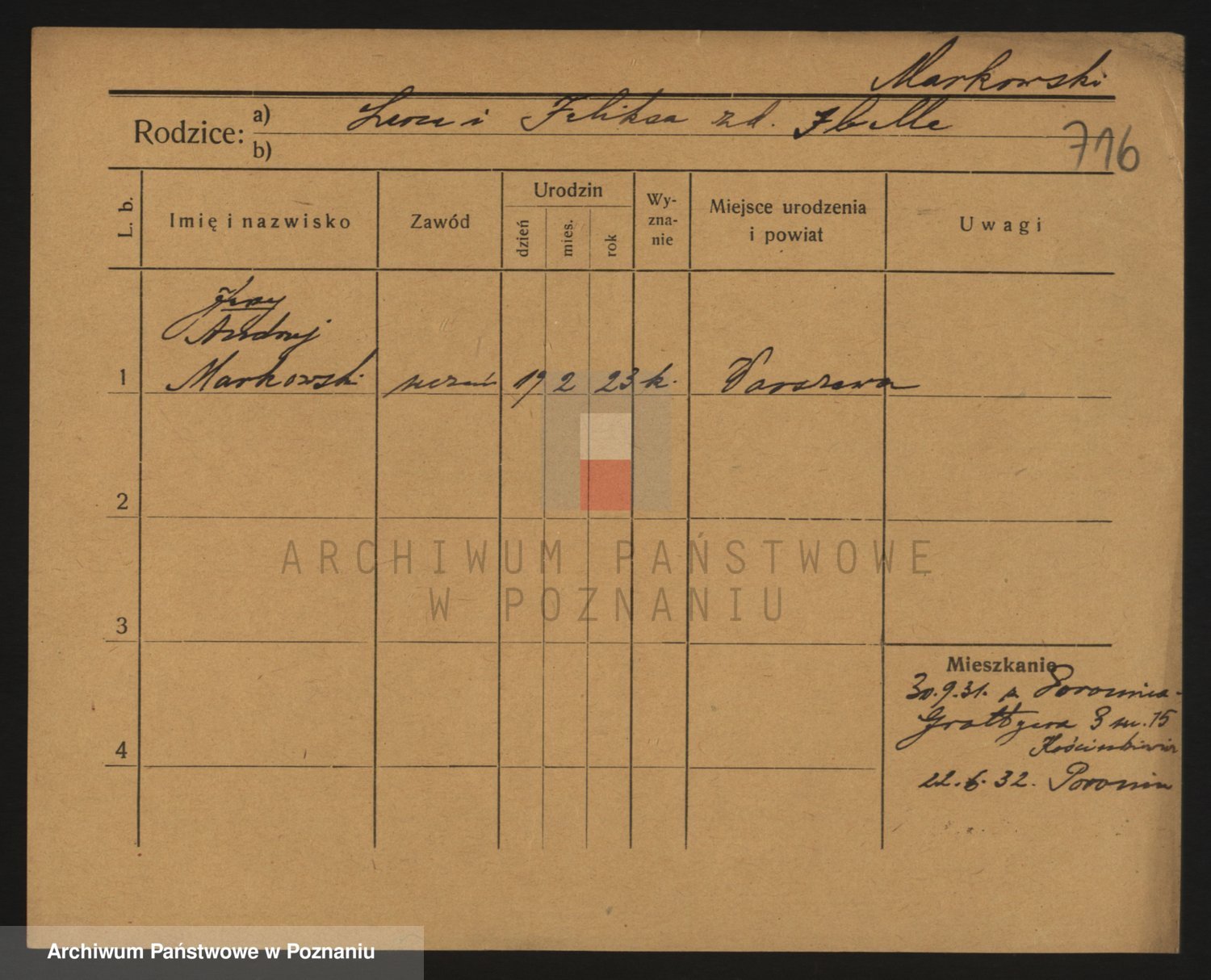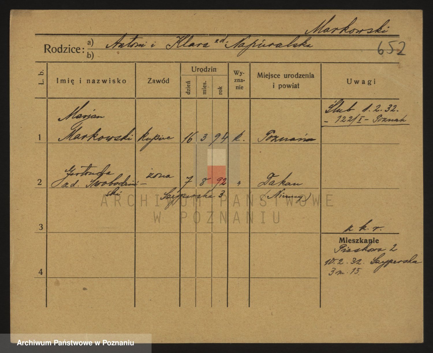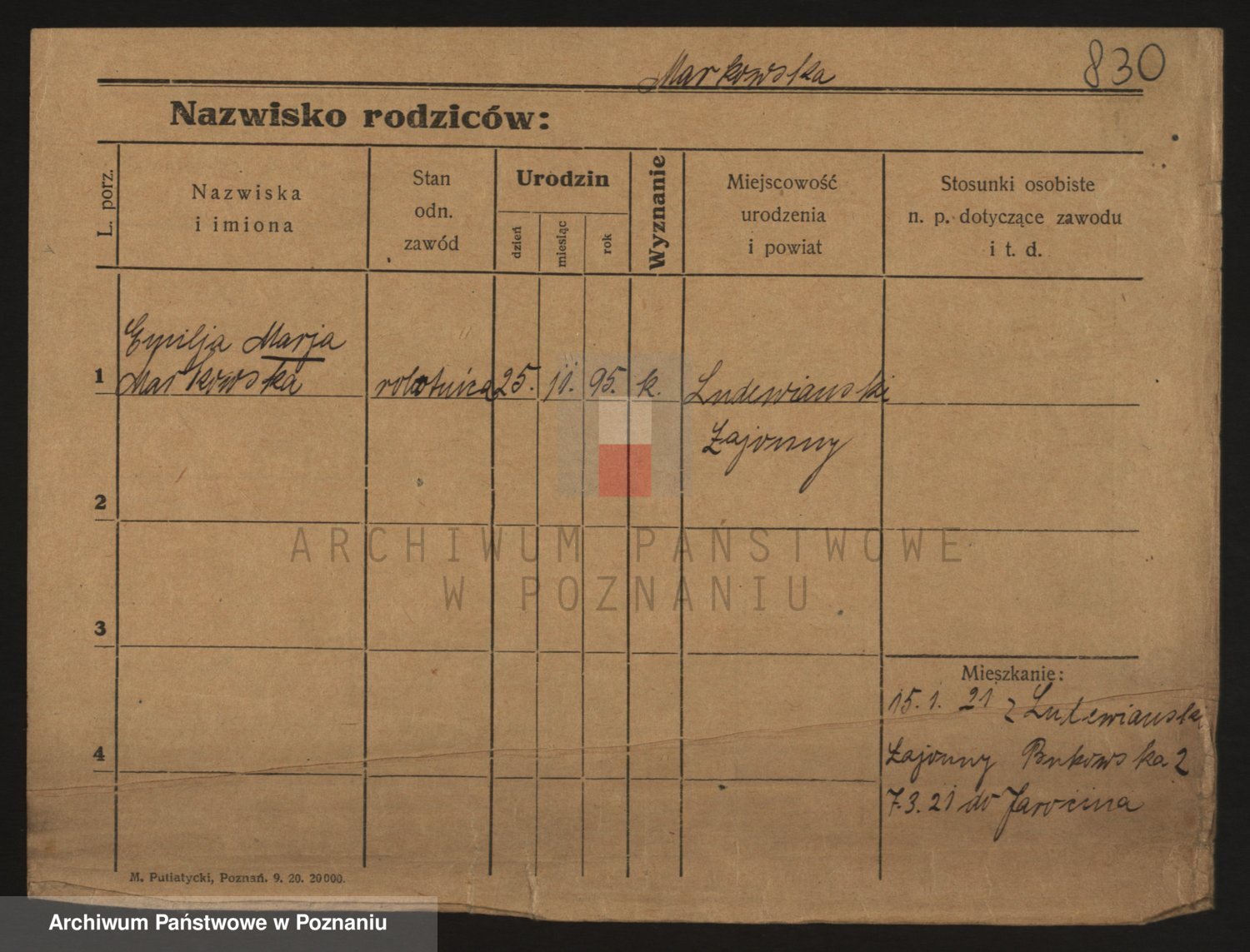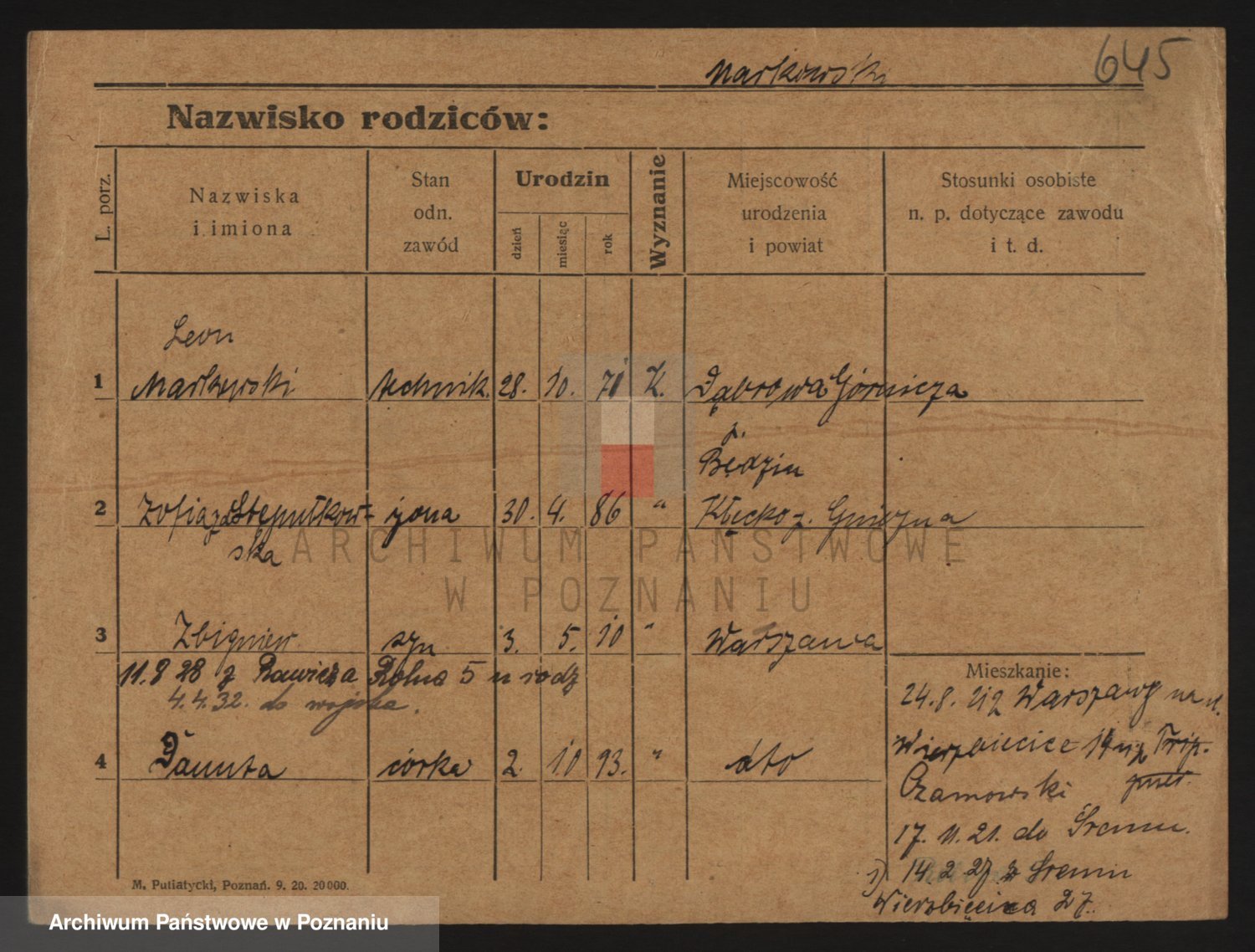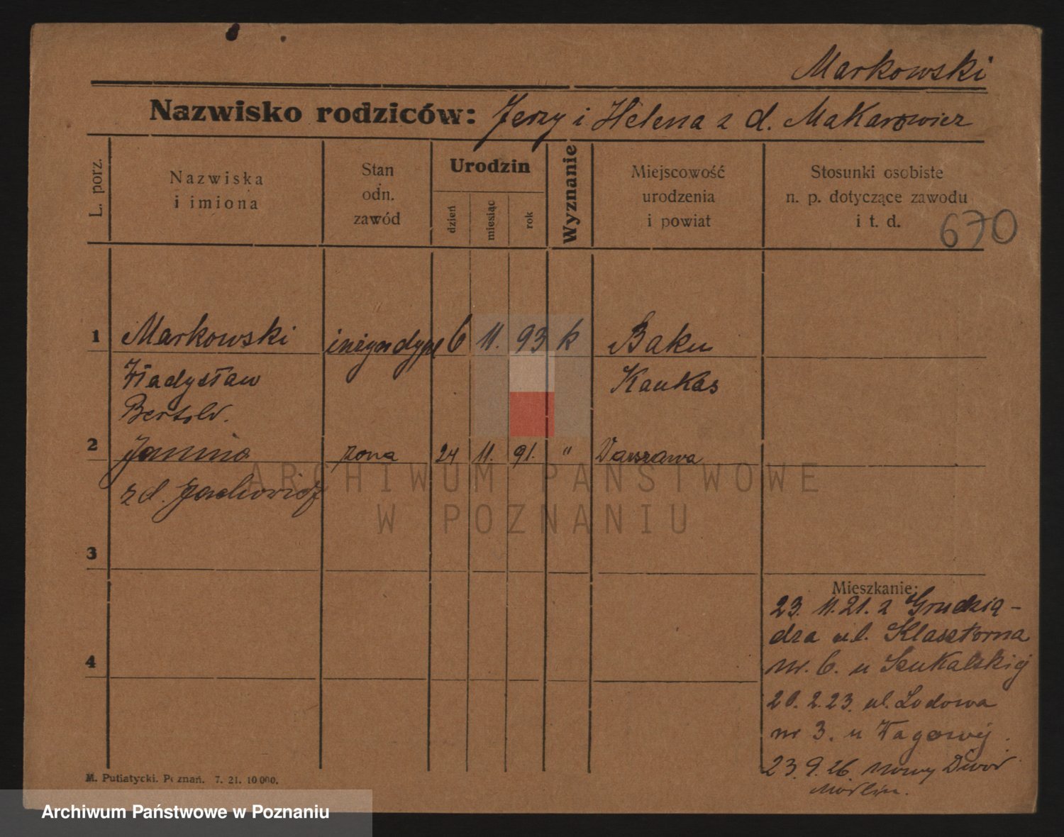 Podgląd karty osobowej dostępny jest po kliknięciu na nazwisko lub ikonkę karty. Można dokonywać powiększenia (ikony na górze) lub przechodzić między kolejnymi skanami (strzałki po bokach).