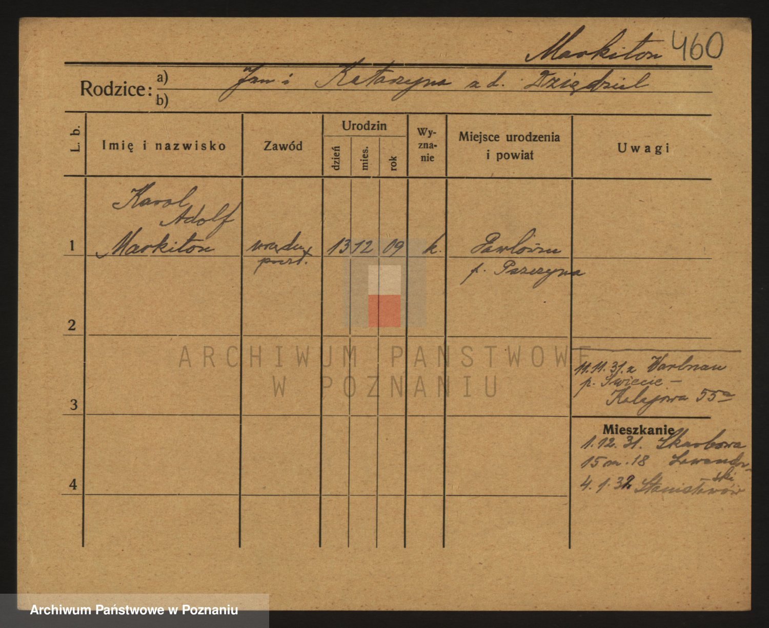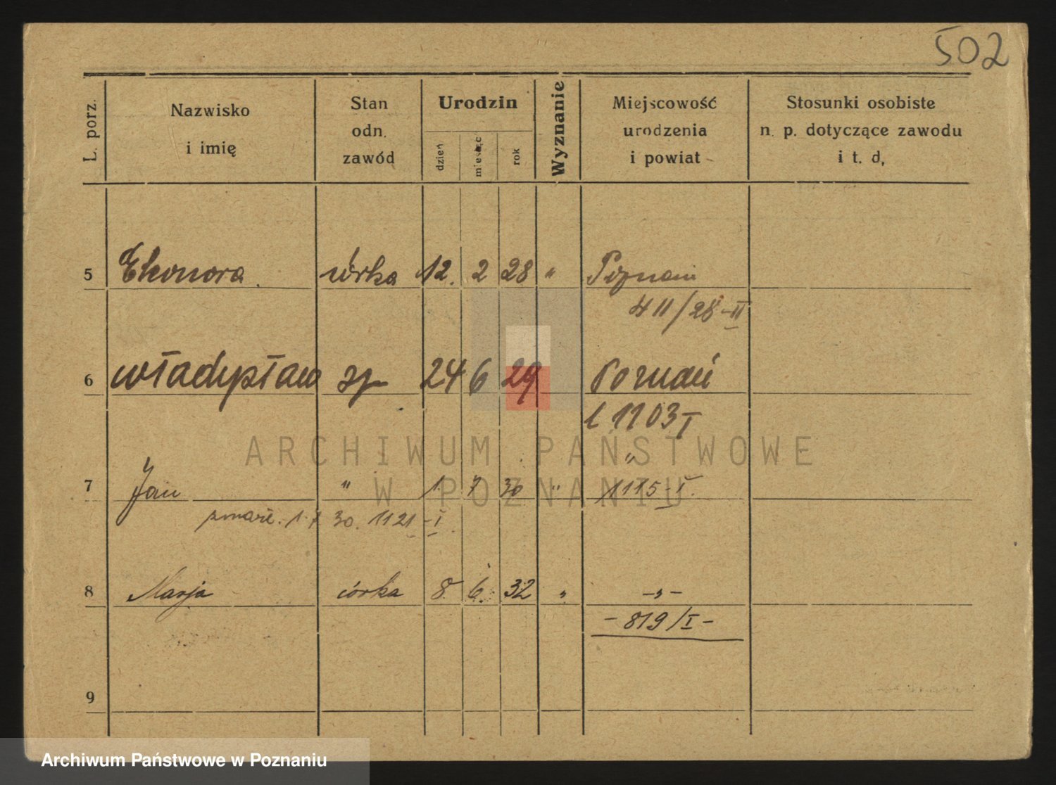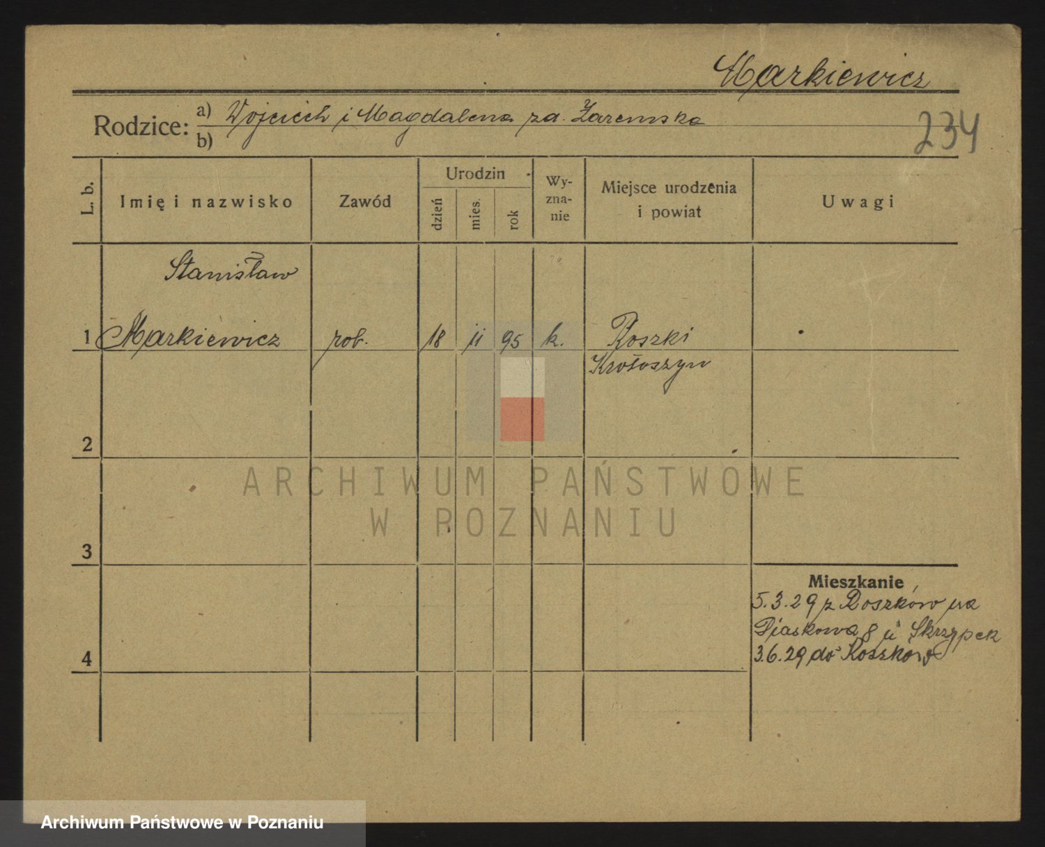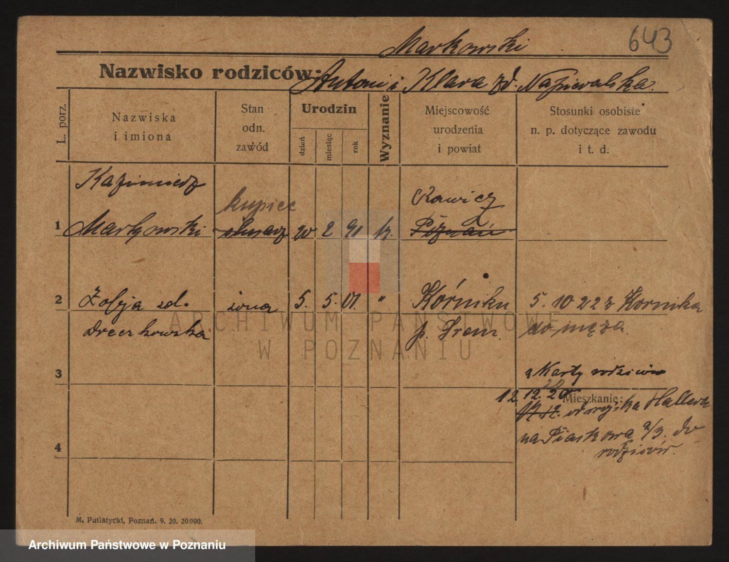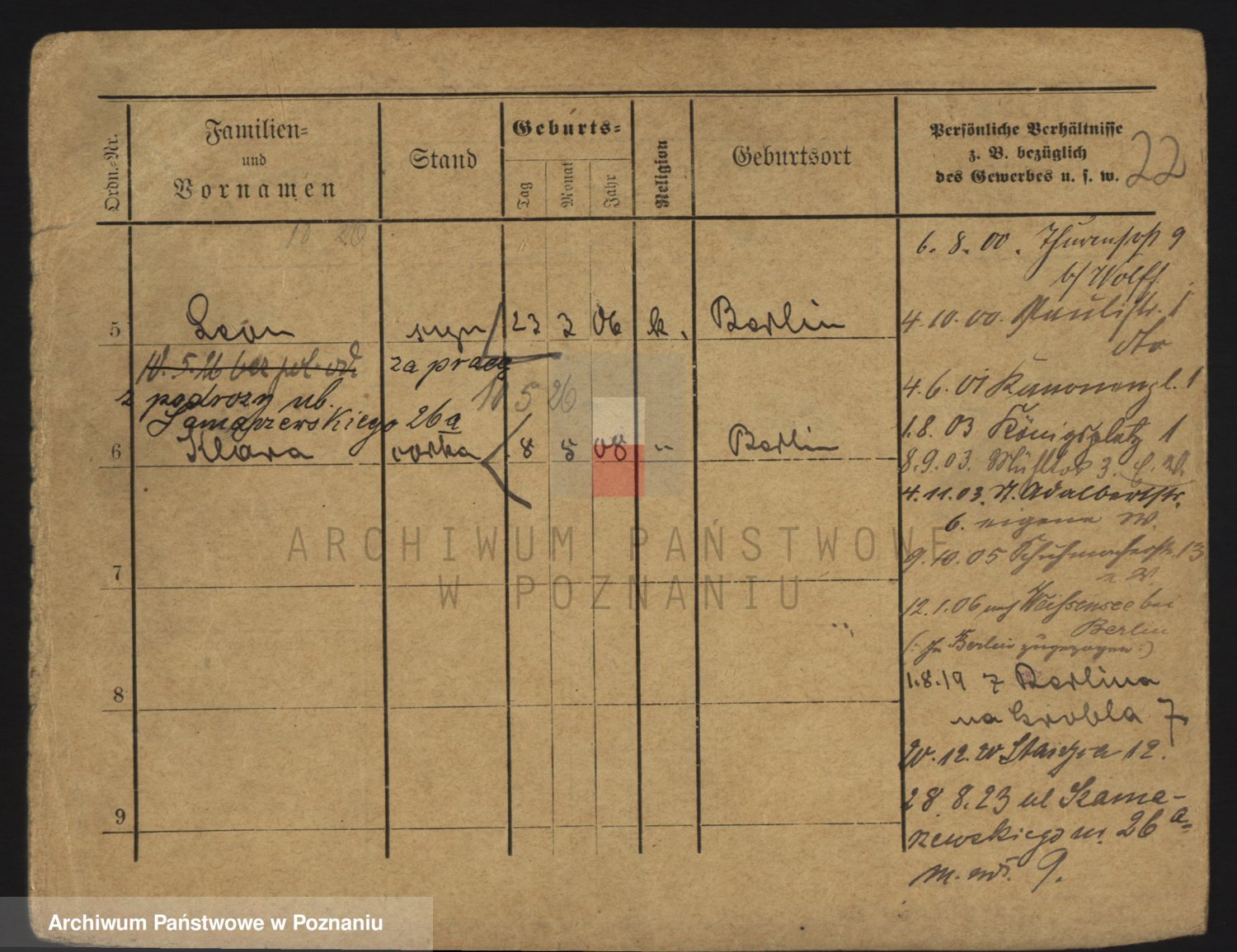 Podgląd karty osobowej dostępny jest po kliknięciu na nazwisko lub ikonkę karty. Można dokonywać powiększenia (ikony na górze) lub przechodzić między kolejnymi skanami (strzałki po bokach).