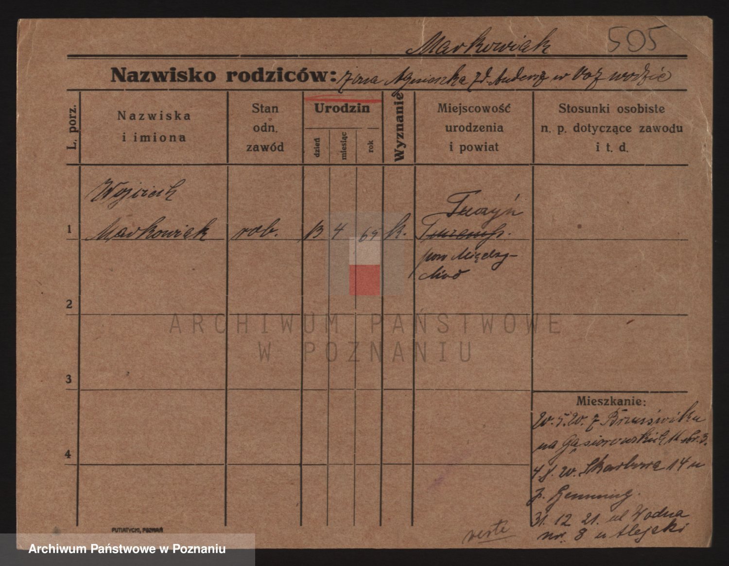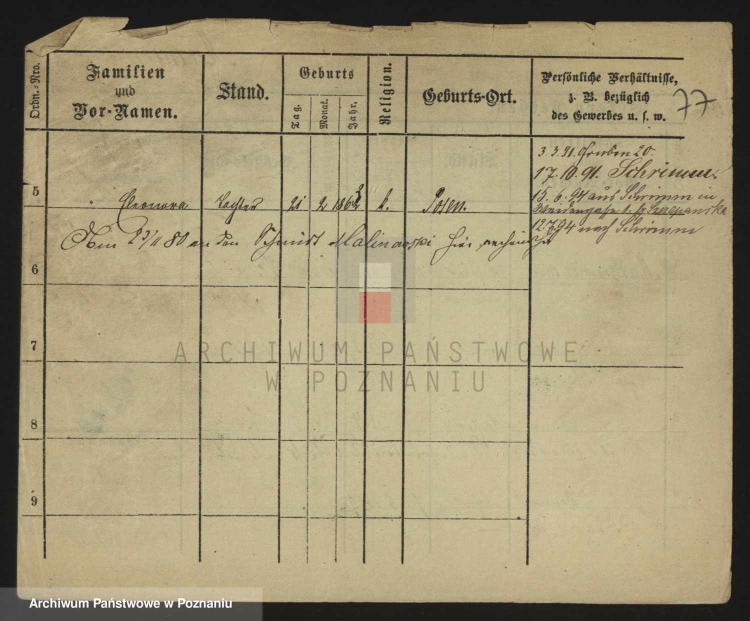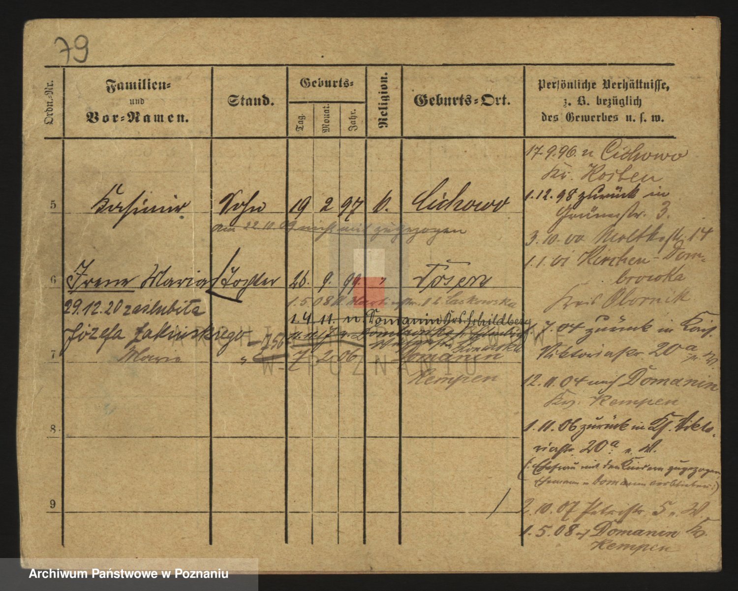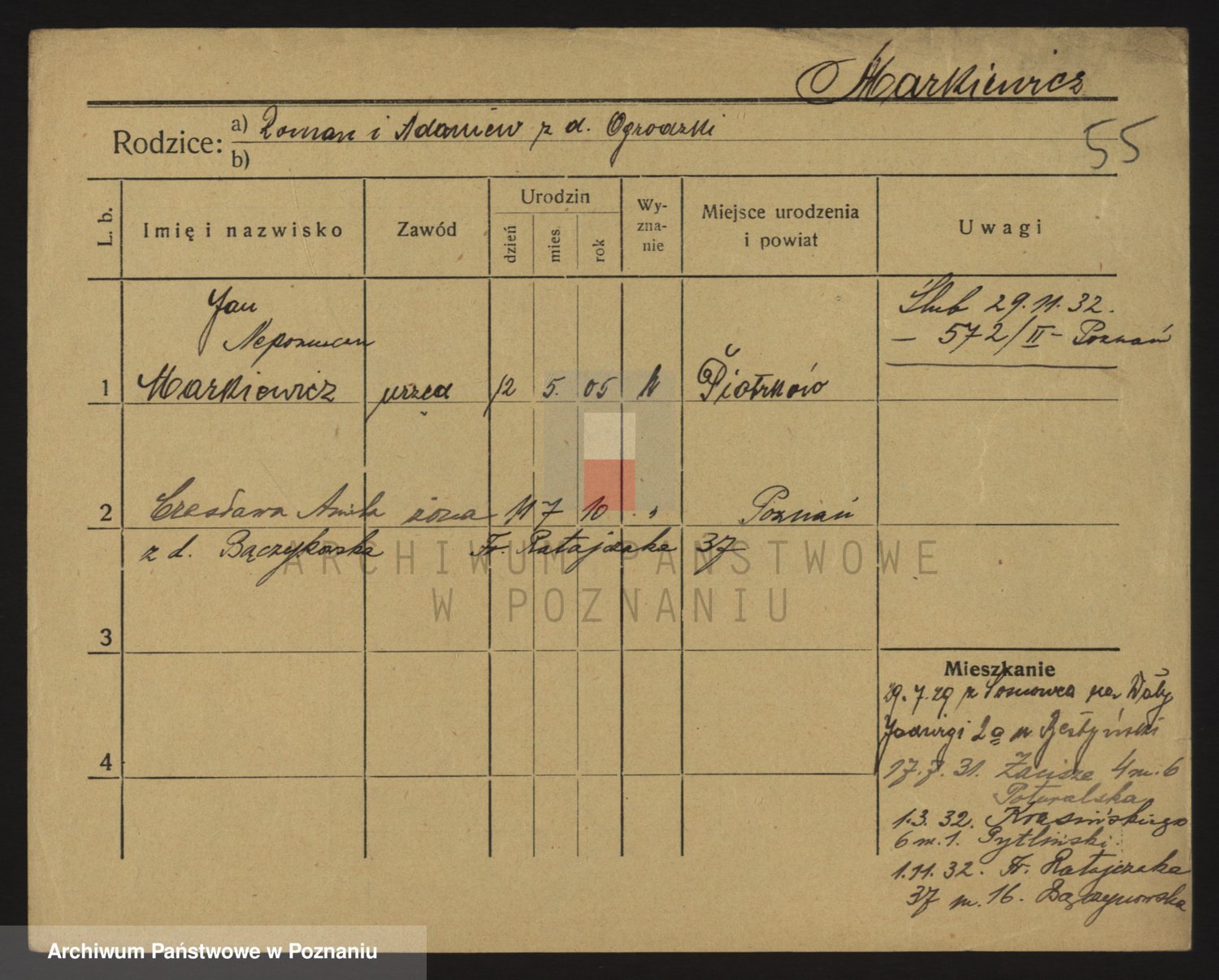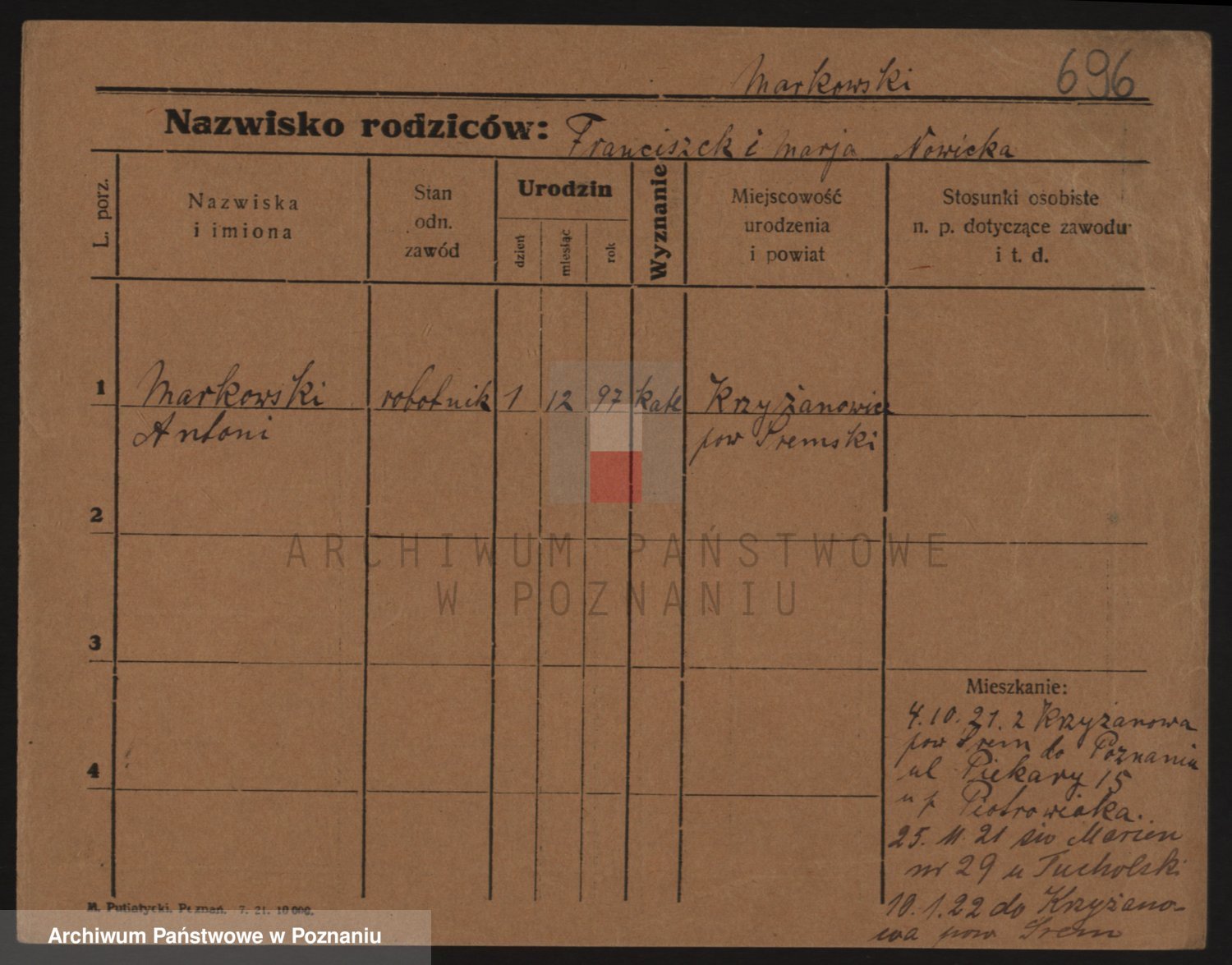 Podgląd karty osobowej dostępny jest po kliknięciu na nazwisko lub ikonkę karty. Można dokonywać powiększenia (ikony na górze) lub przechodzić między kolejnymi skanami (strzałki po bokach).