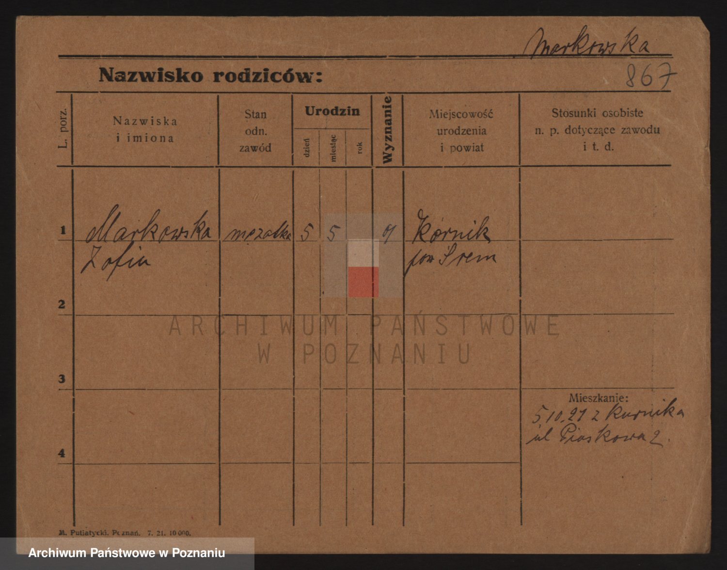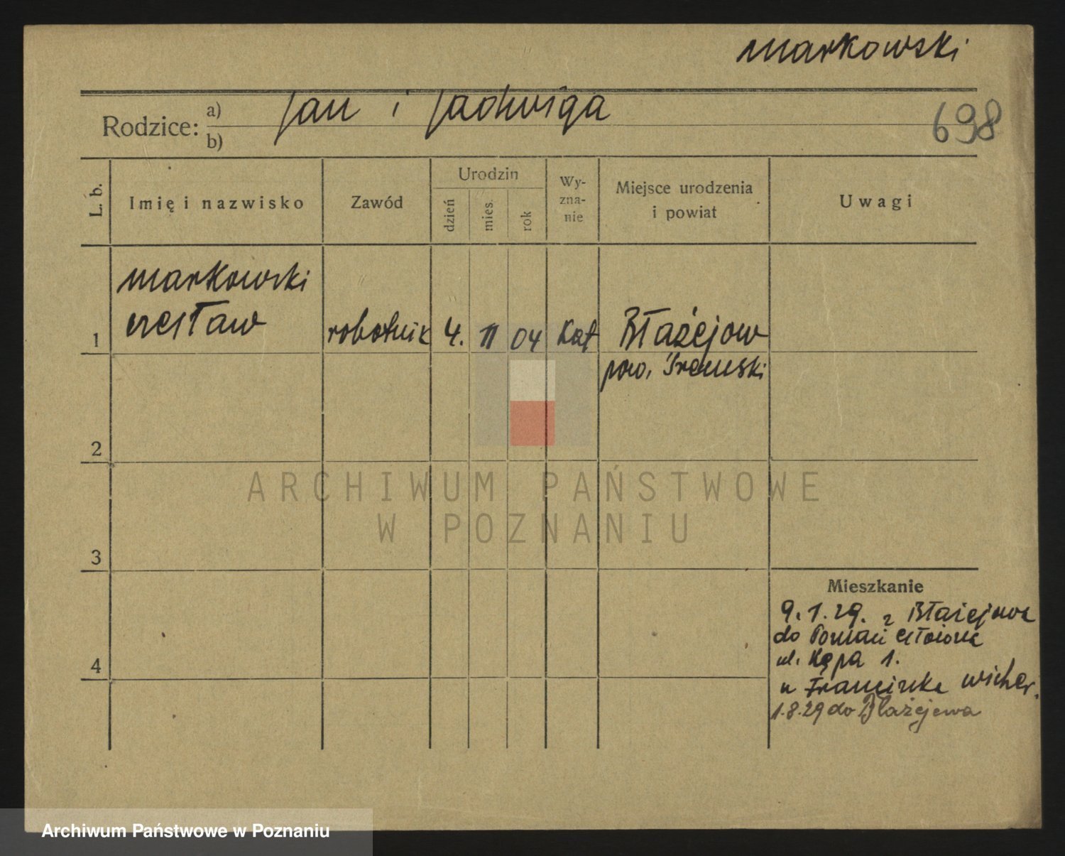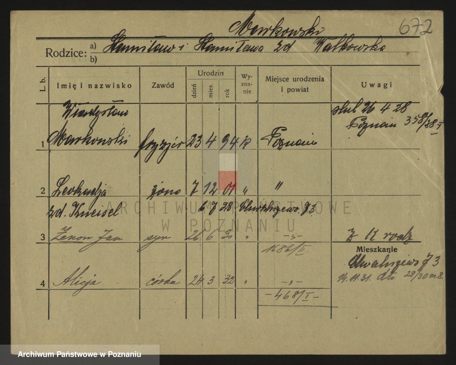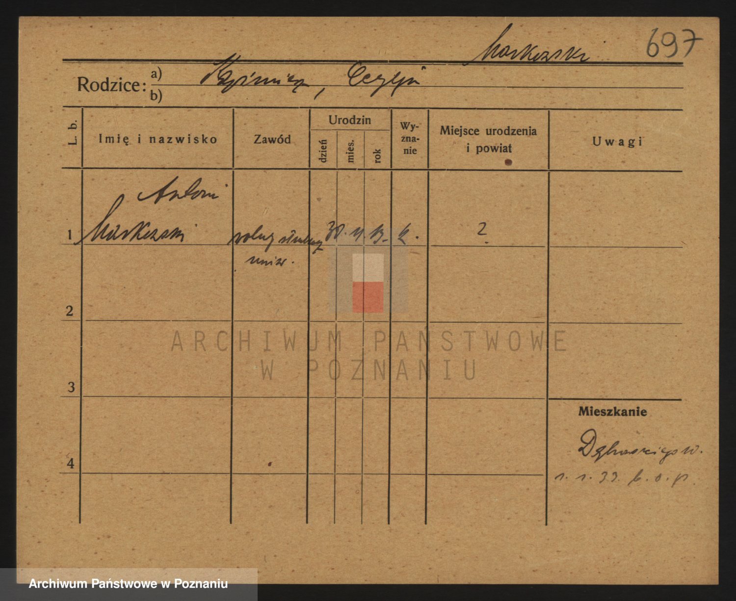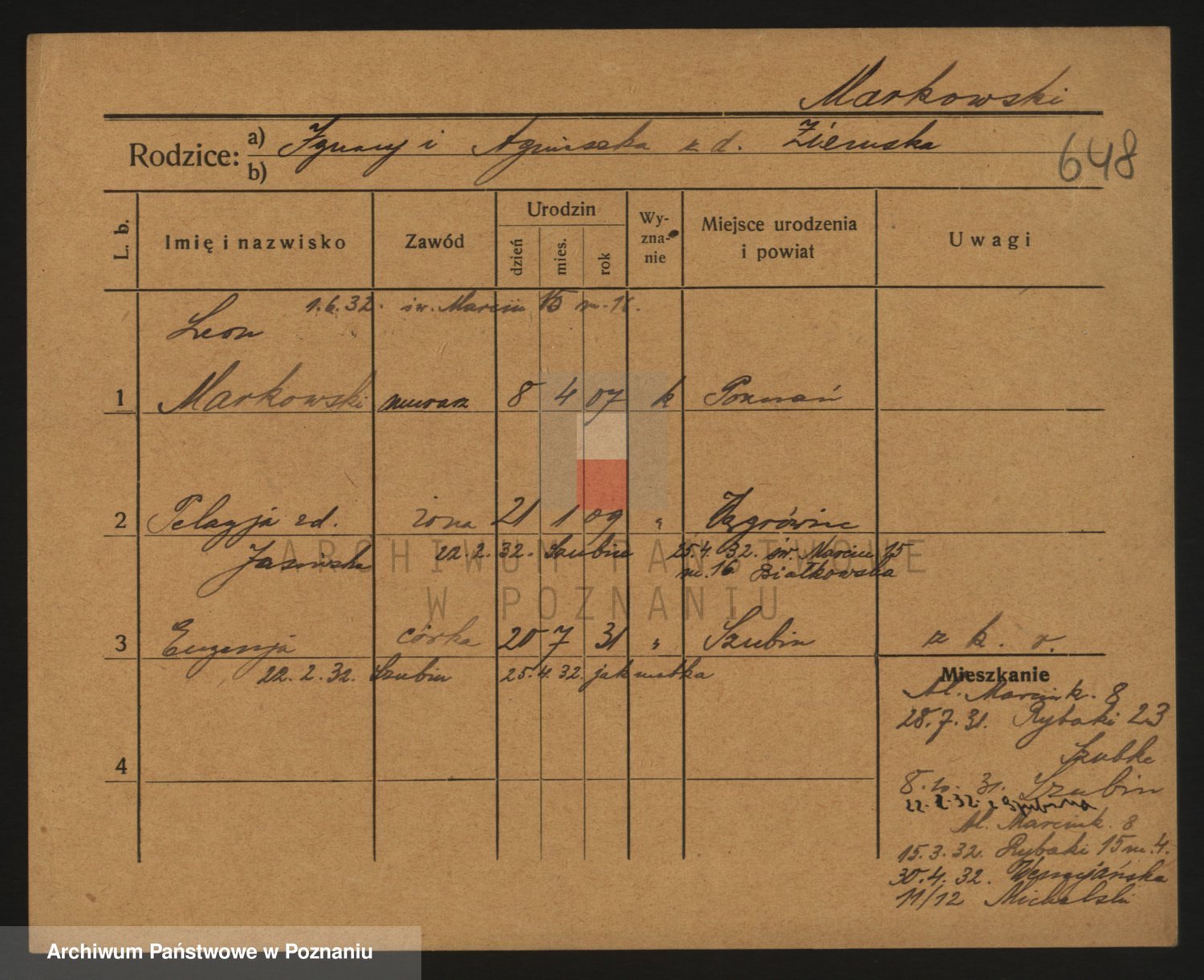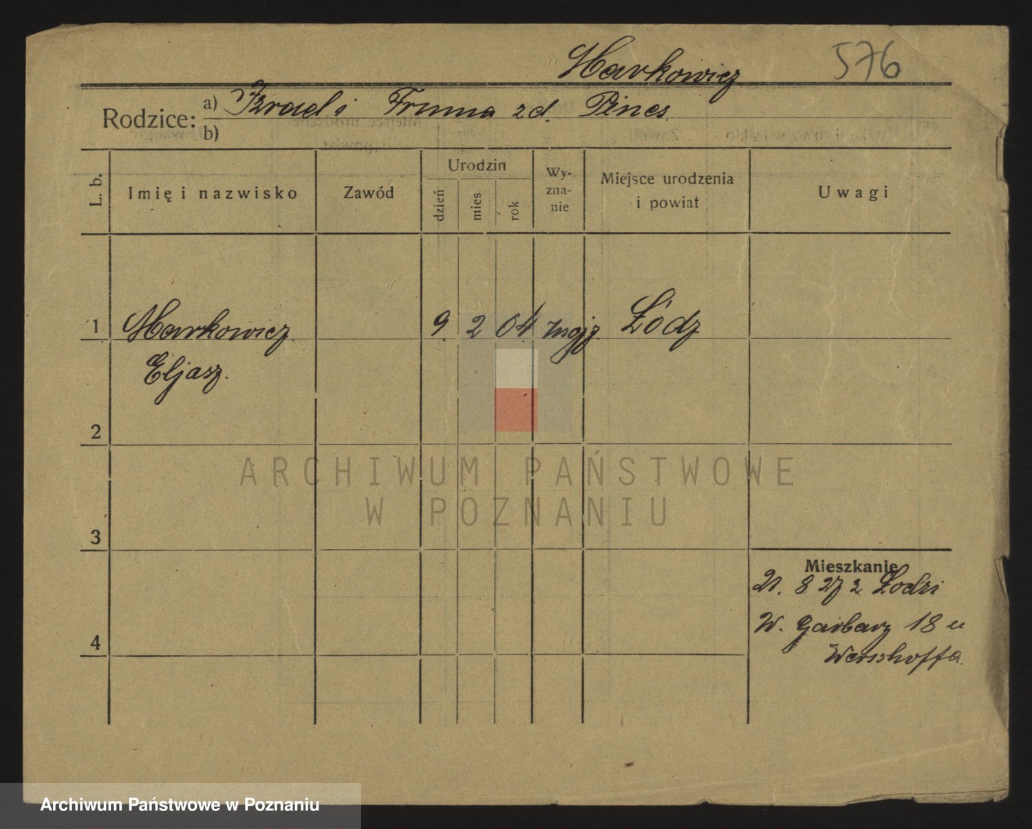 Podgląd karty osobowej dostępny jest po kliknięciu na nazwisko lub ikonkę karty. Można dokonywać powiększenia (ikony na górze) lub przechodzić między kolejnymi skanami (strzałki po bokach).