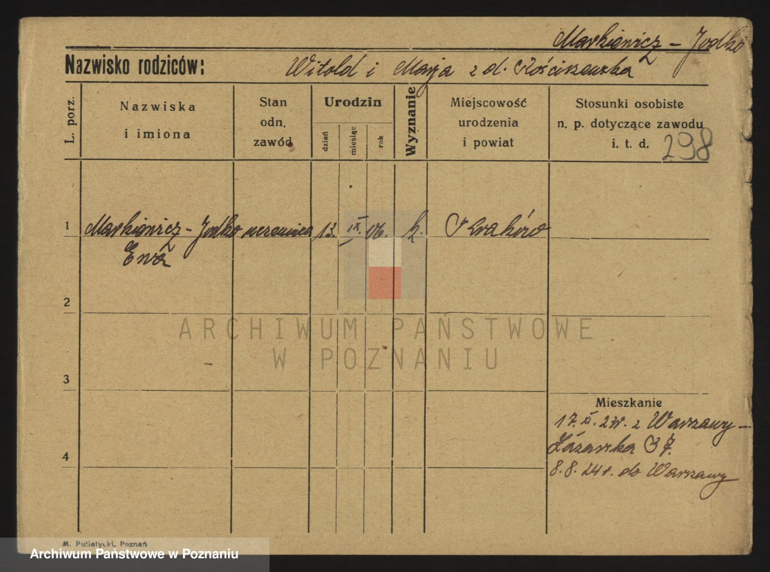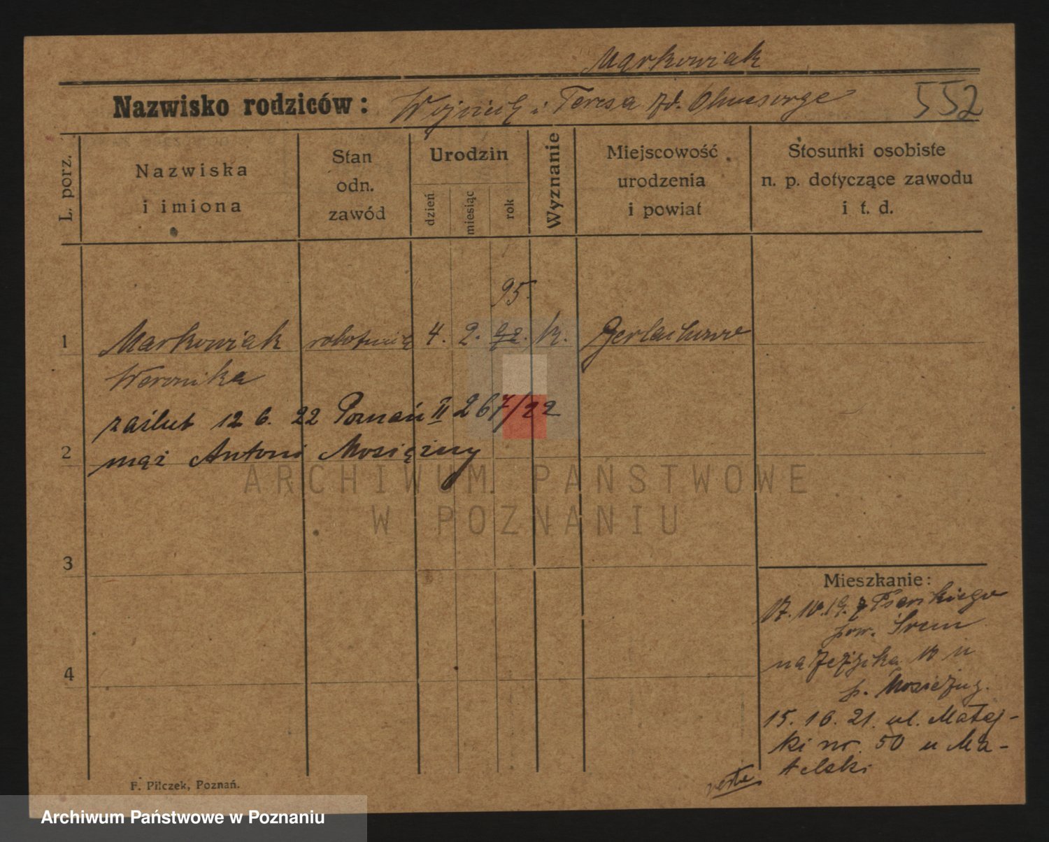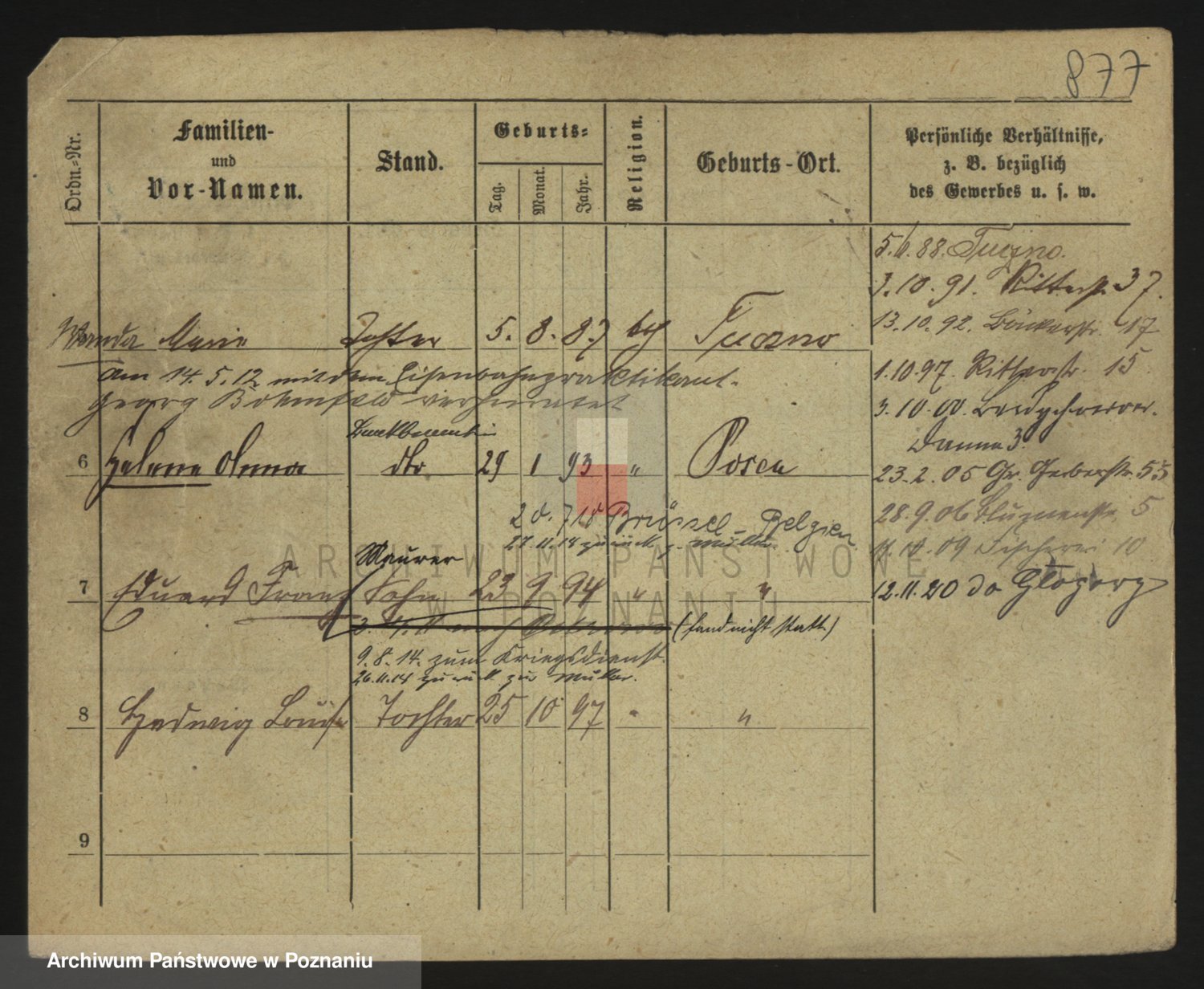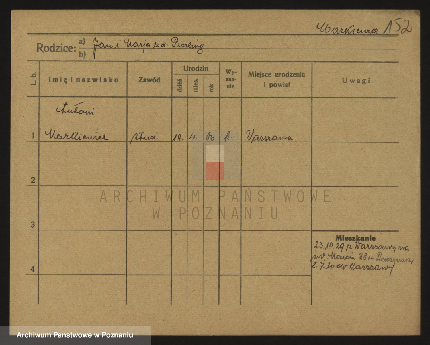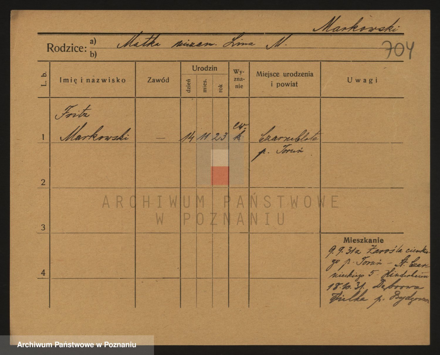 Podgląd karty osobowej dostępny jest po kliknięciu na nazwisko lub ikonkę karty. Można dokonywać powiększenia (ikony na górze) lub przechodzić między kolejnymi skanami (strzałki po bokach).