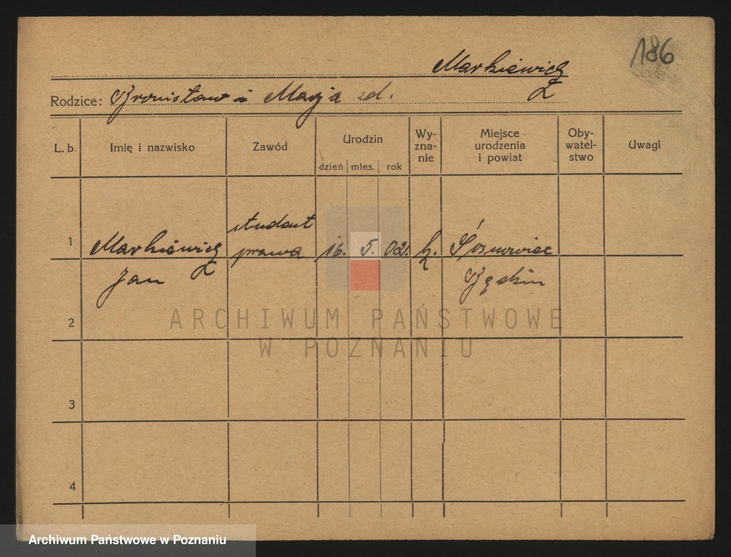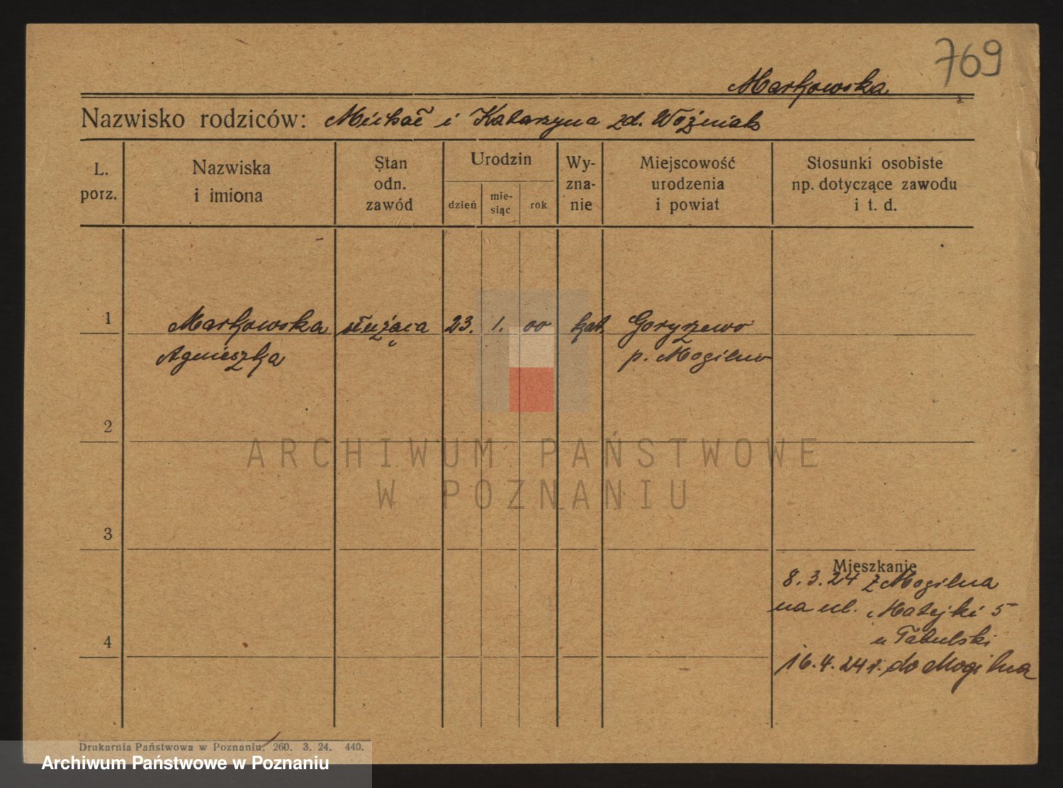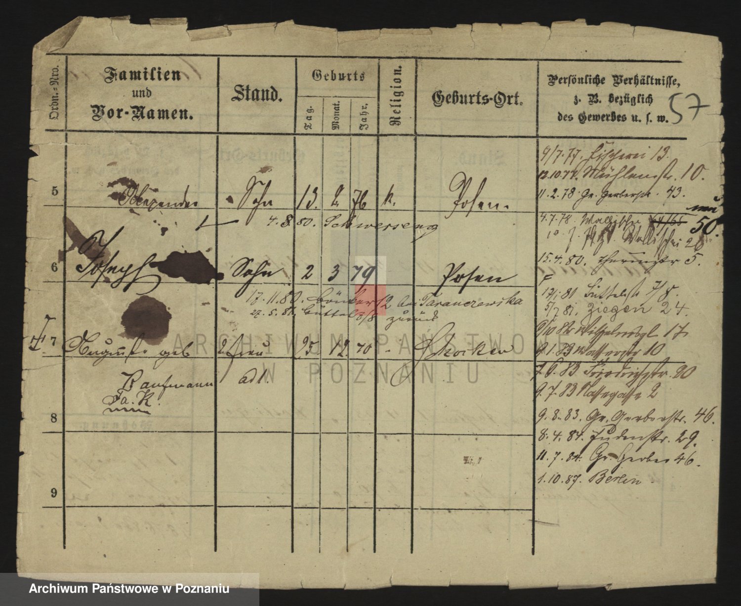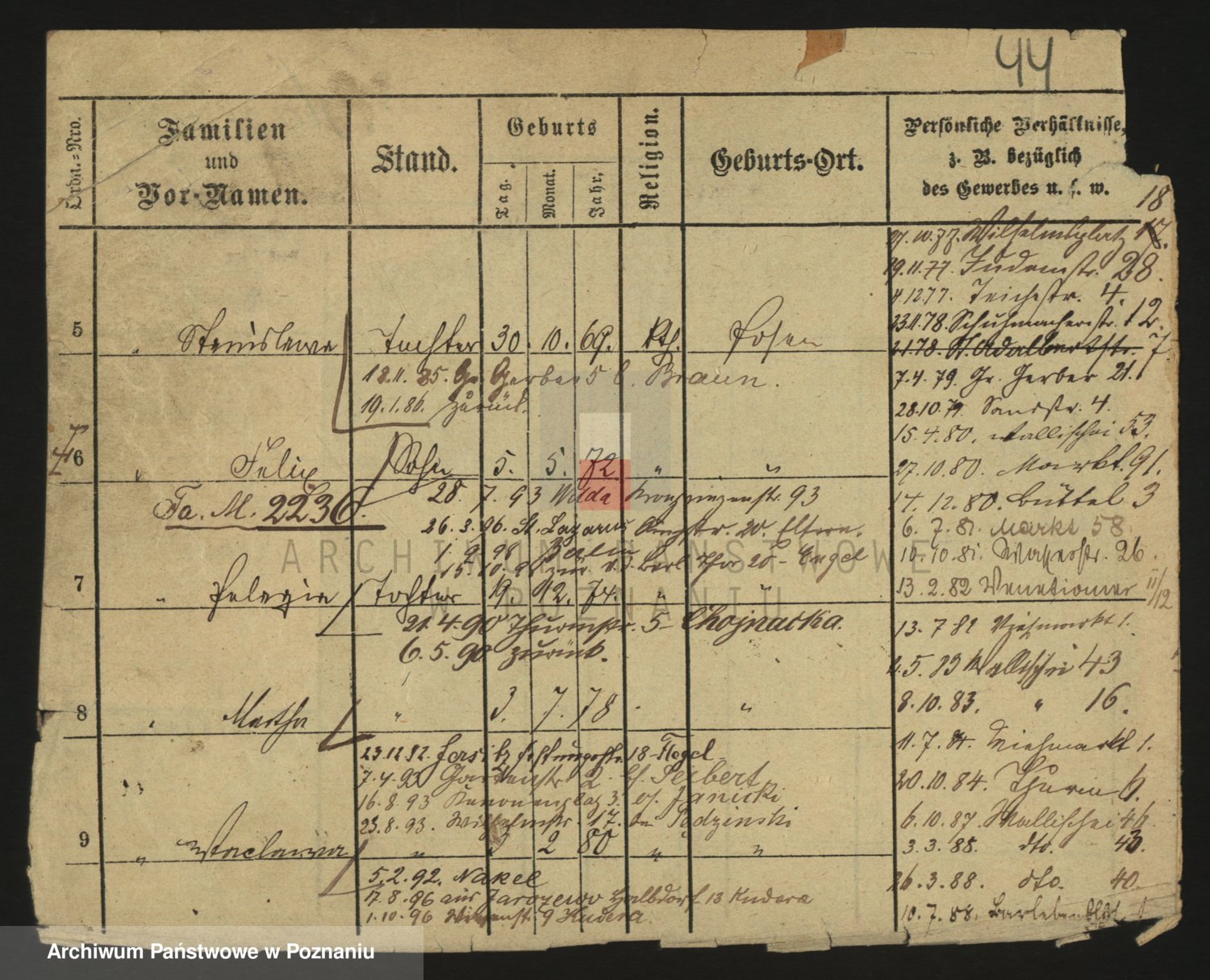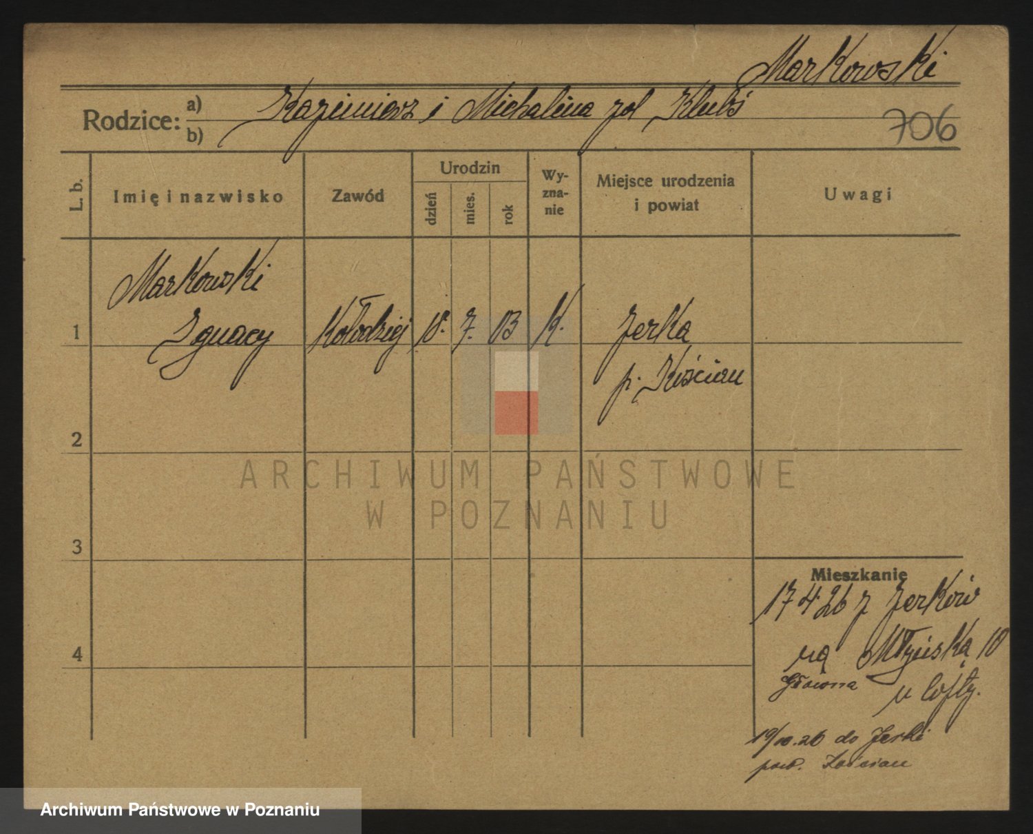 Podgląd karty osobowej dostępny jest po kliknięciu na nazwisko lub ikonkę karty. Można dokonywać powiększenia (ikony na górze) lub przechodzić między kolejnymi skanami (strzałki po bokach).