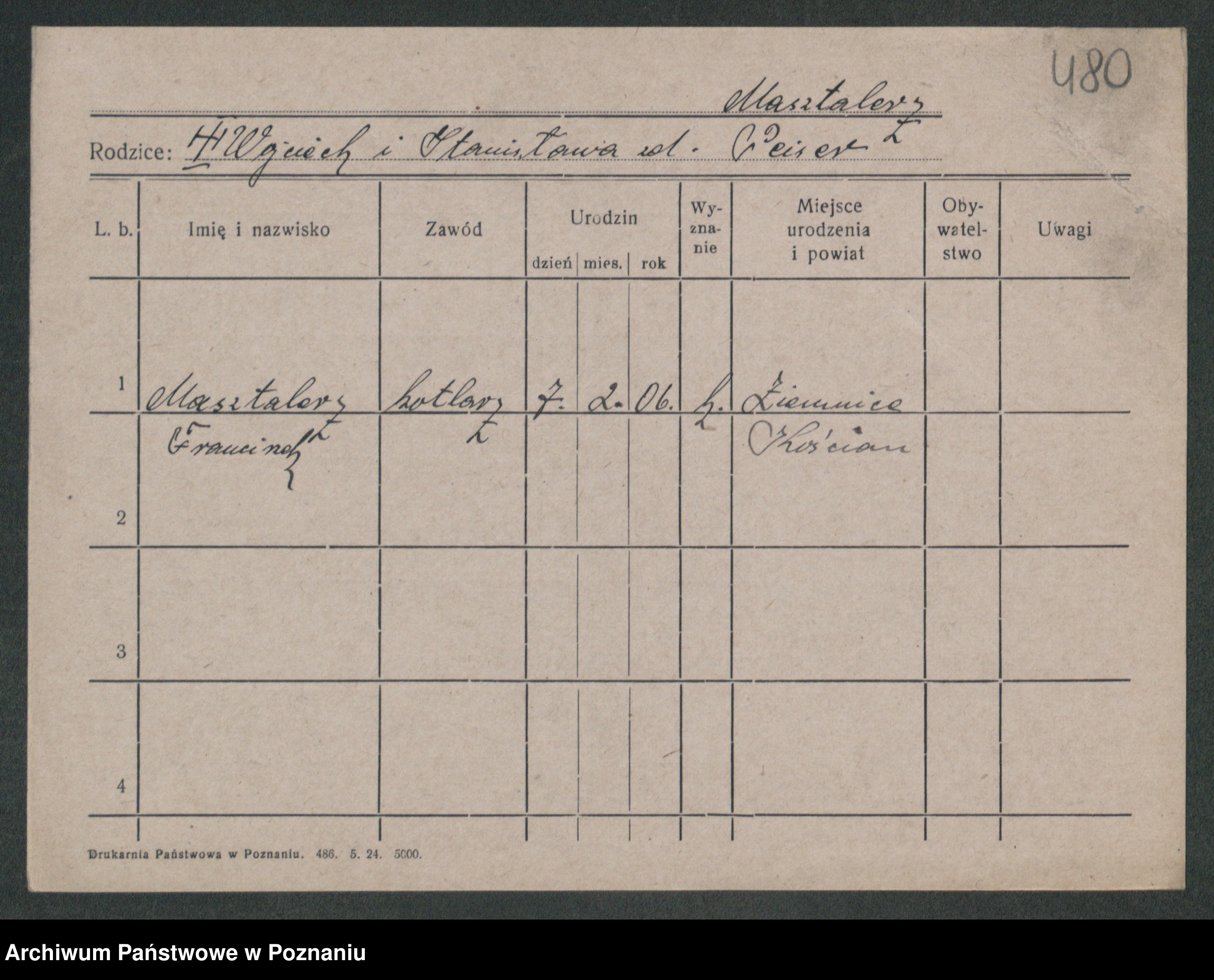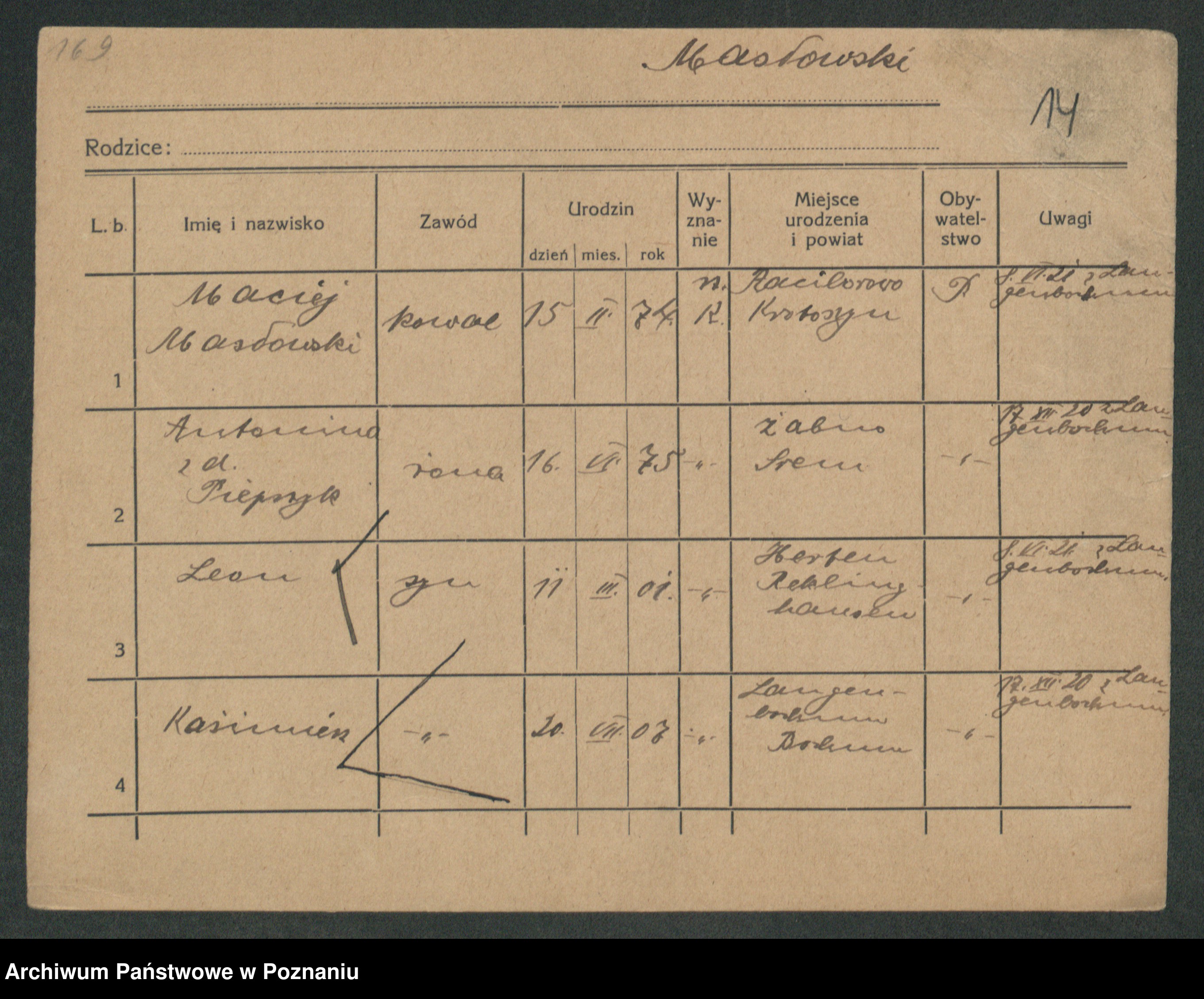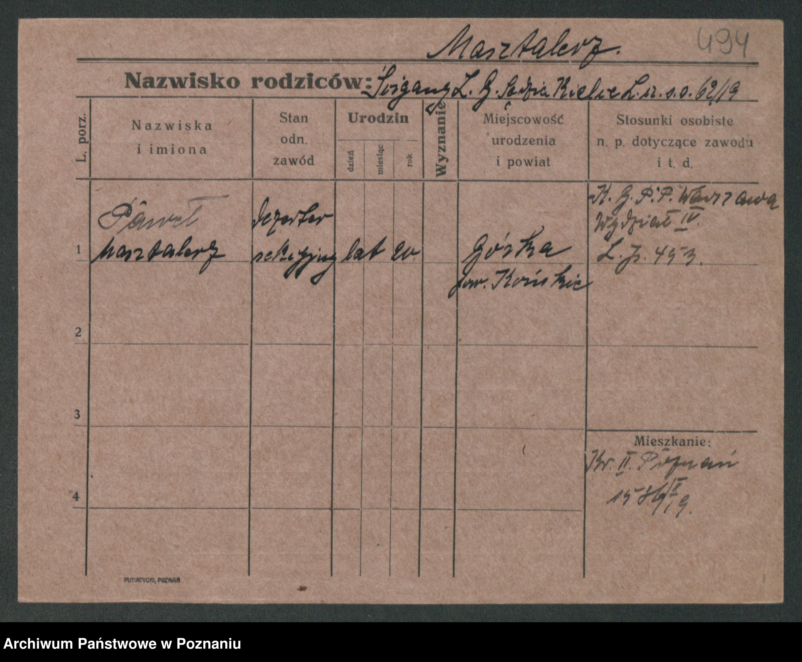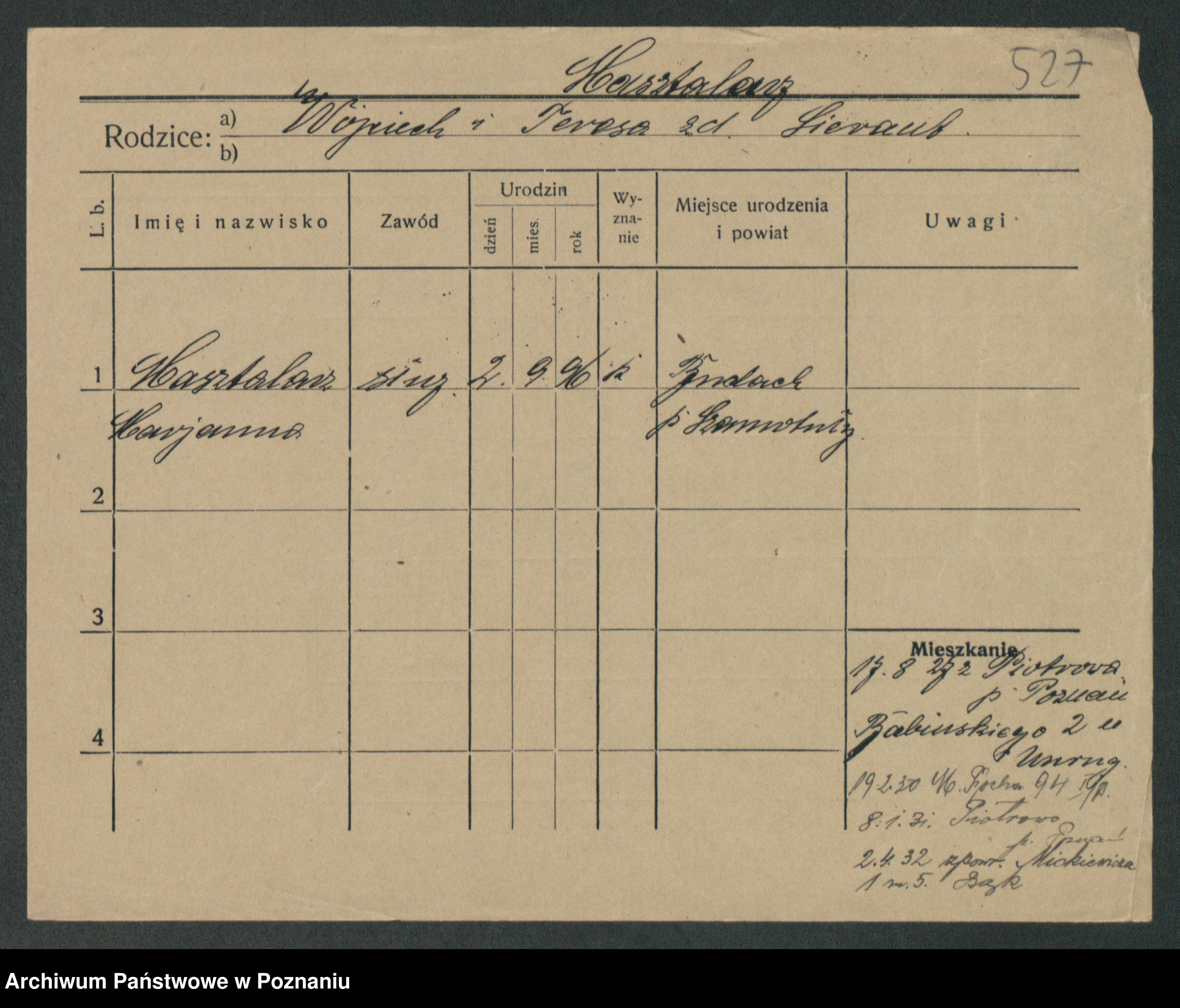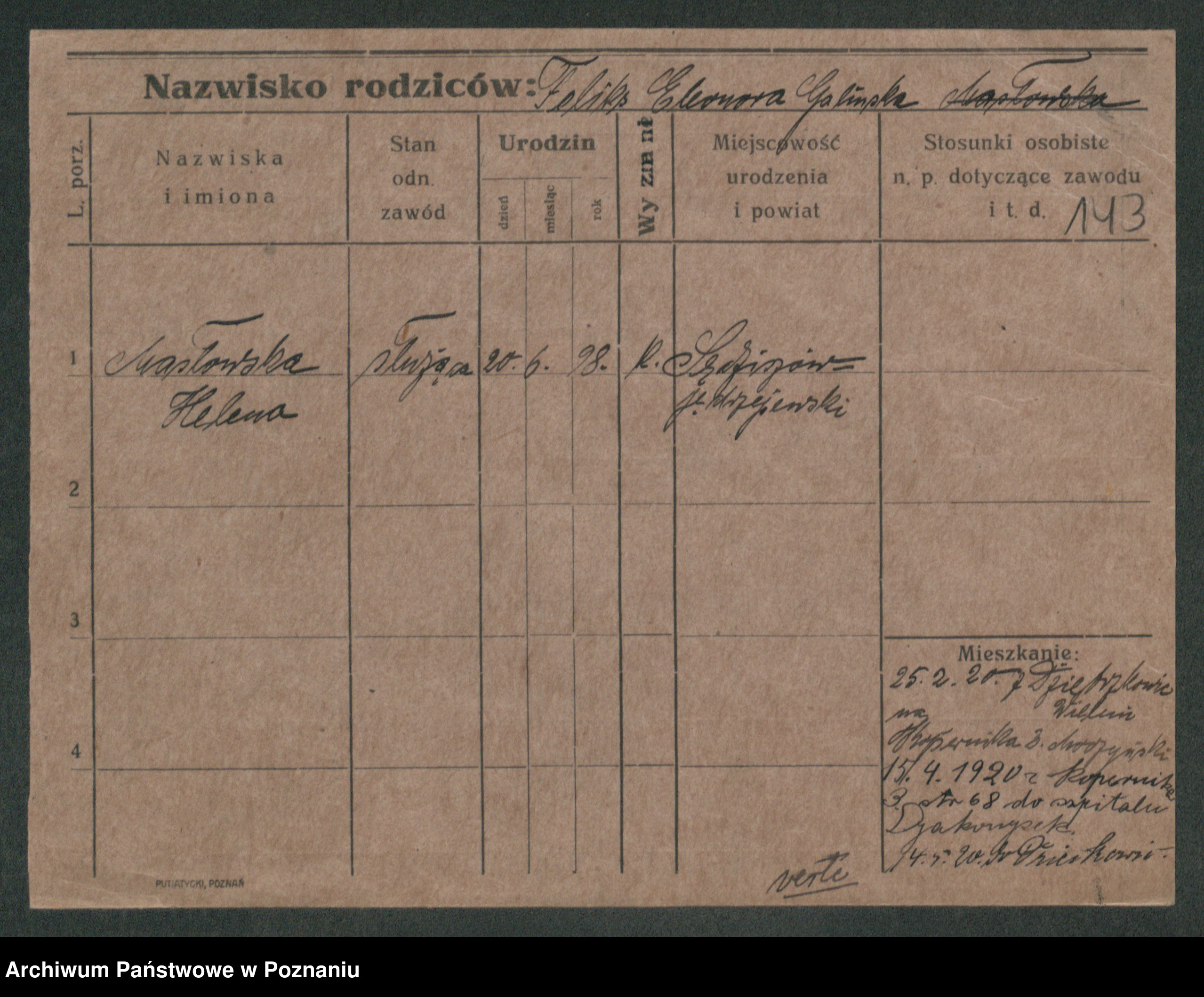Podgląd karty osobowej dostępny jest po kliknięciu na nazwisko lub ikonkę karty. Można dokonywać powiększenia (ikony na górze) lub przechodzić między kolejnymi skanami (strzałki po bokach).