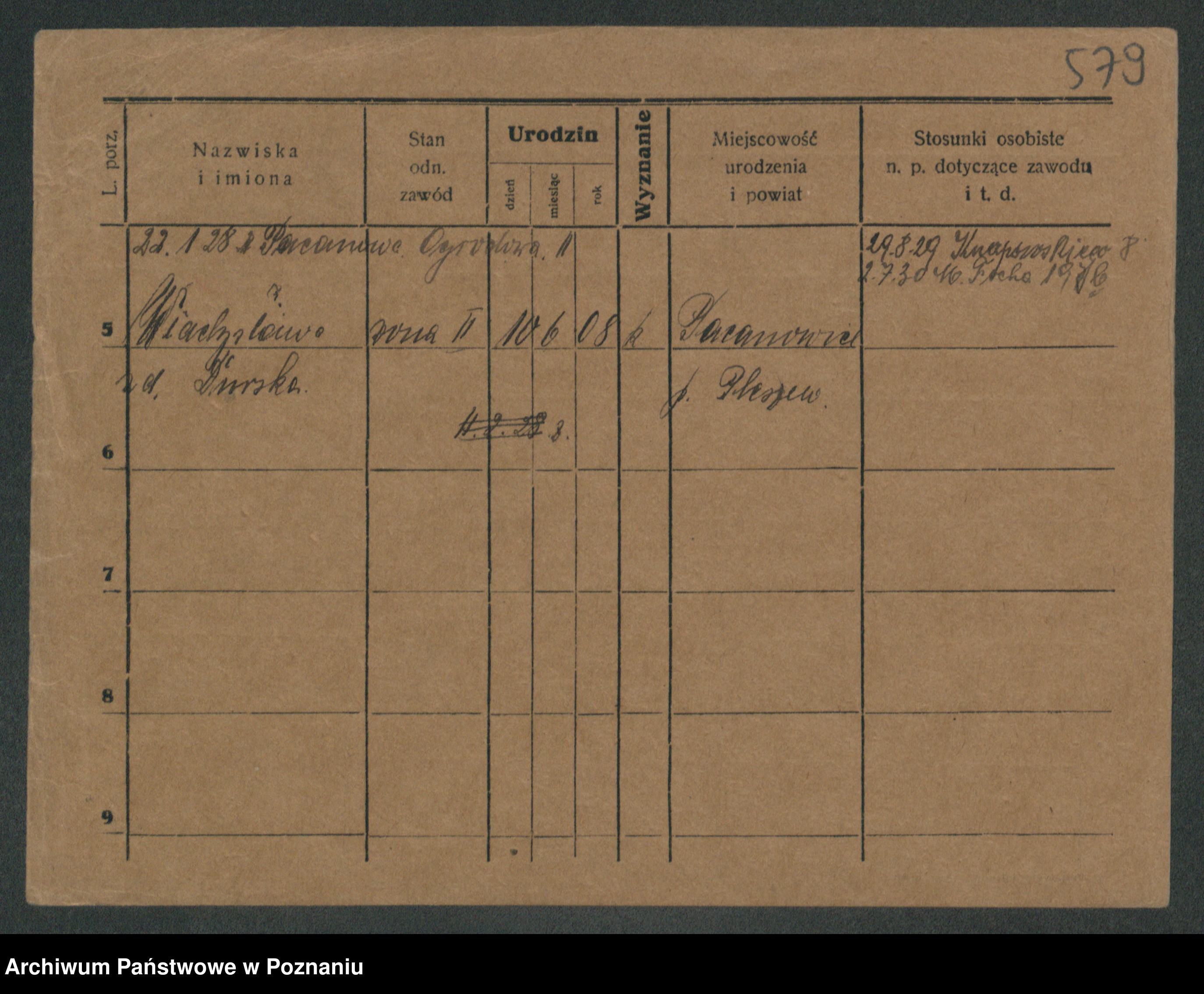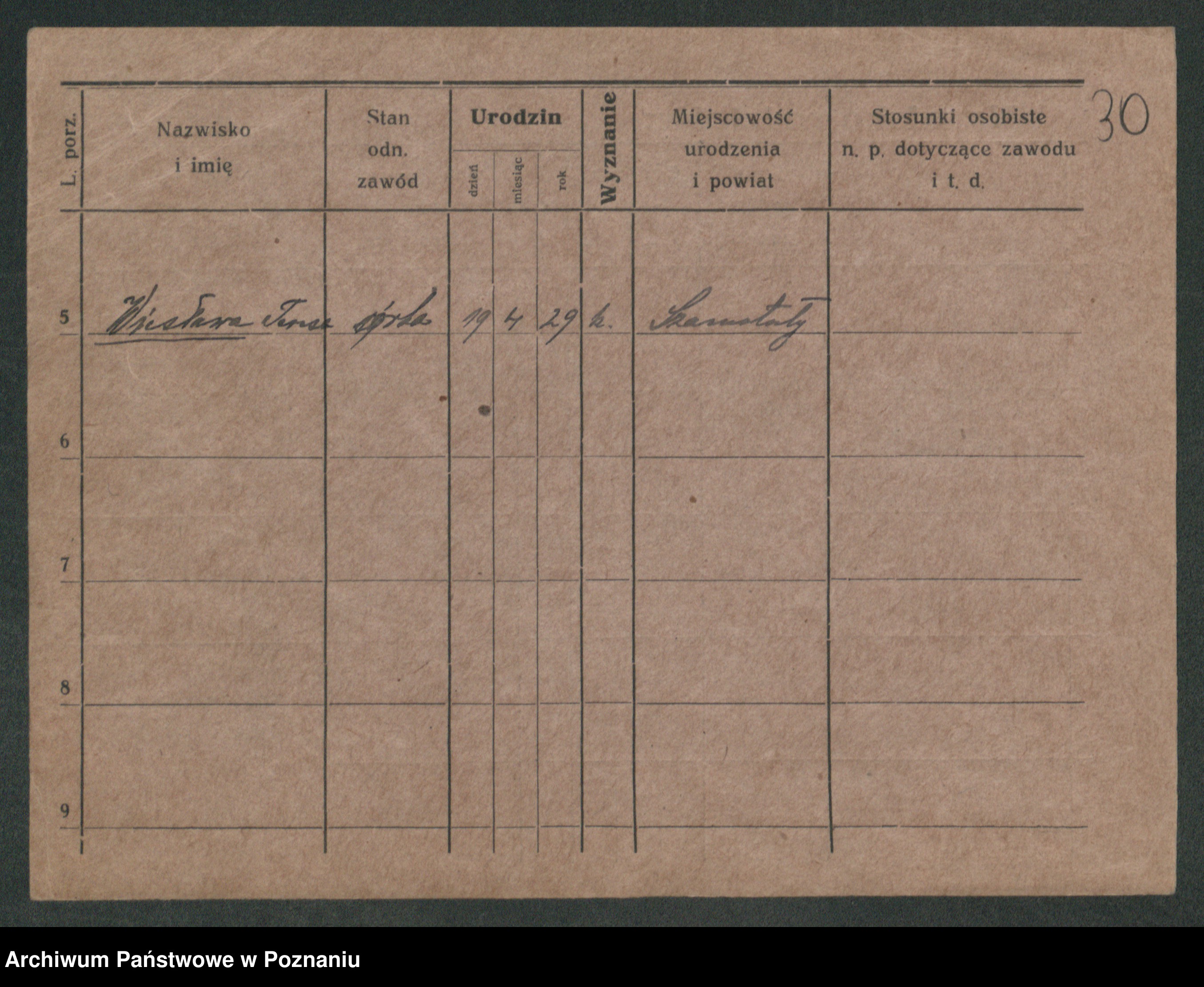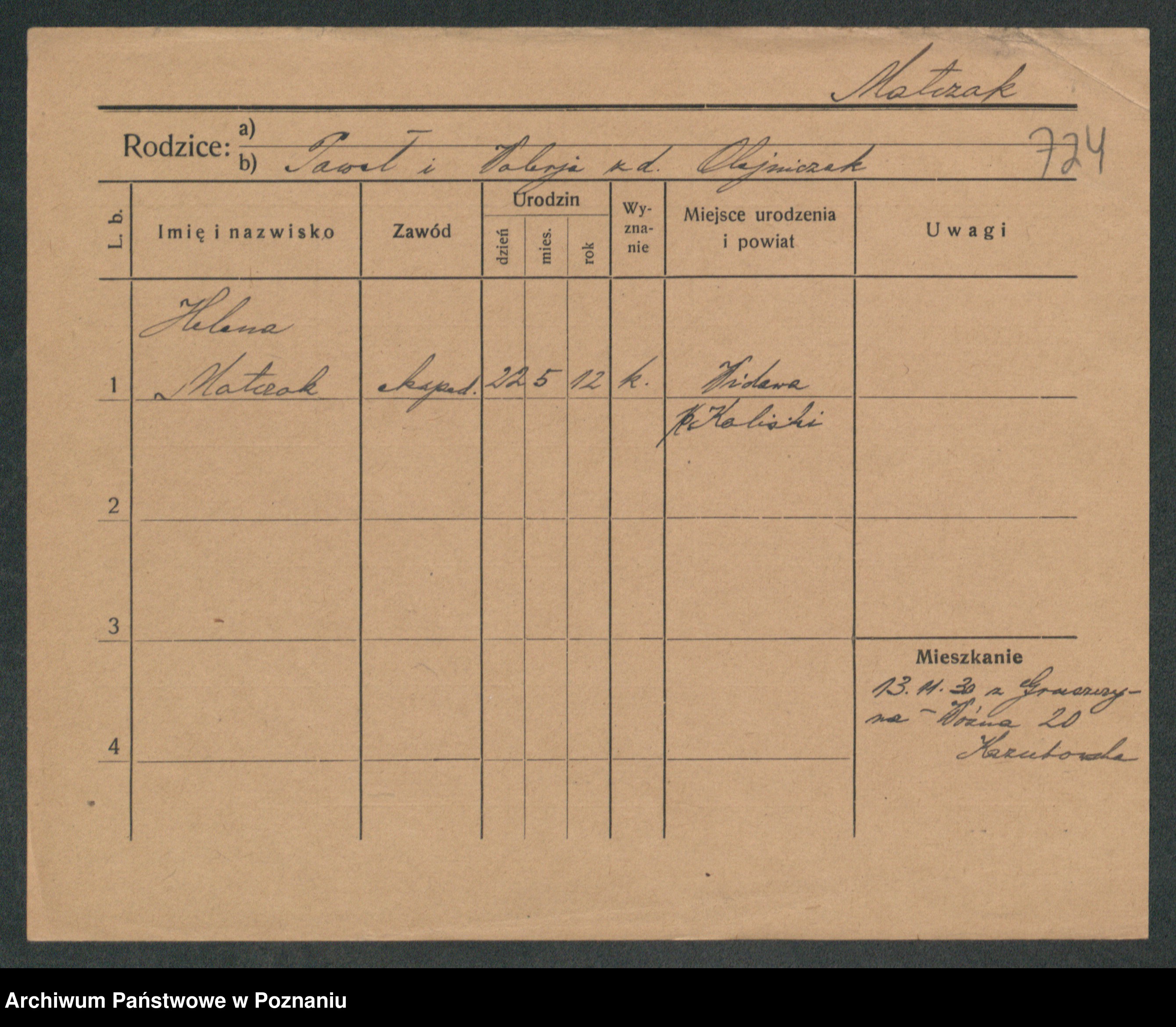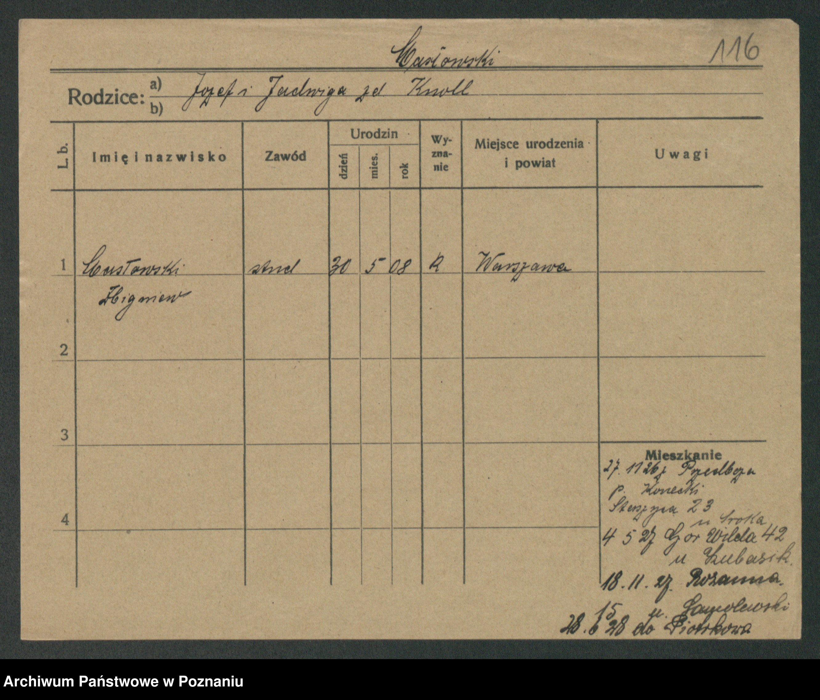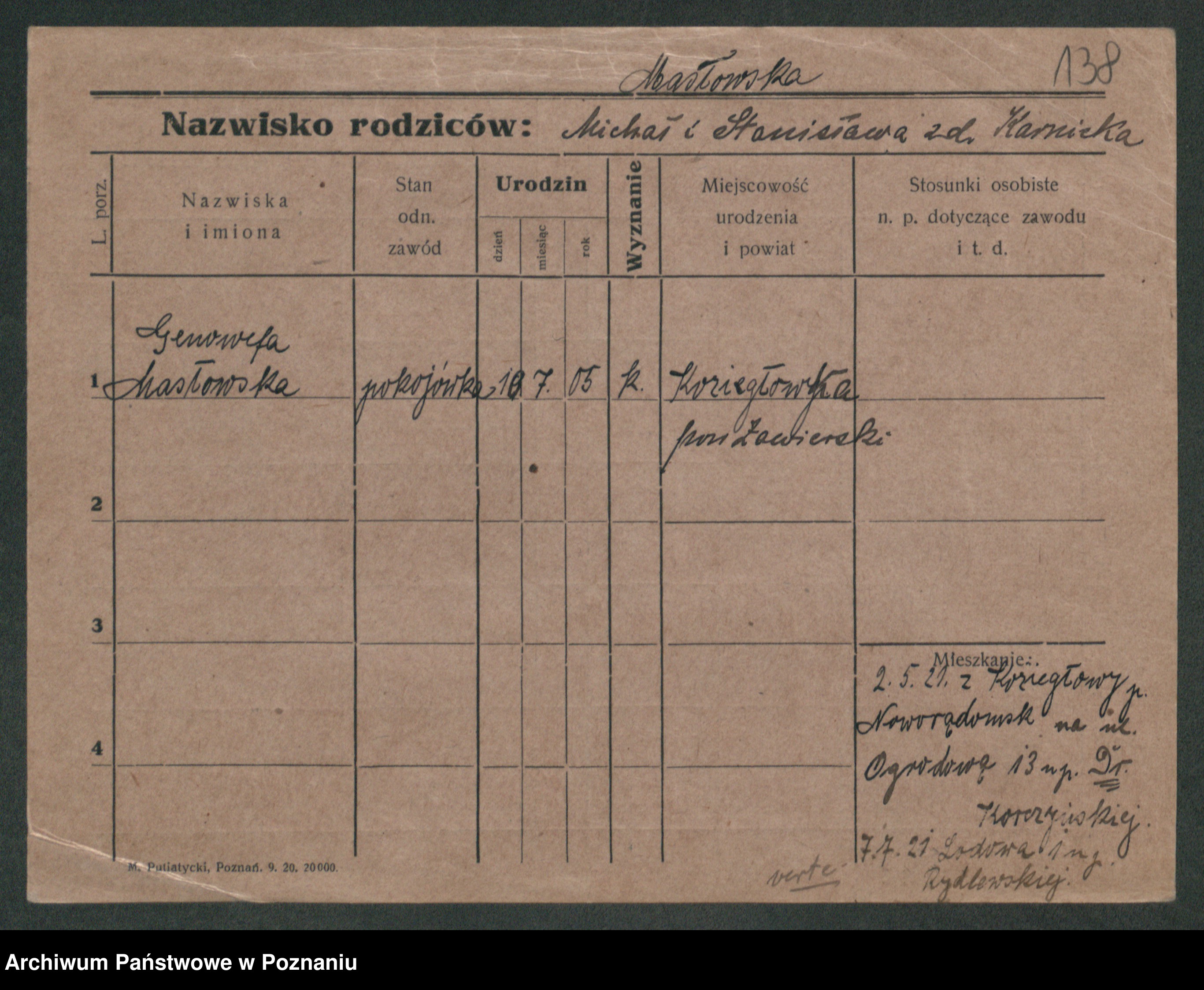 Podgląd karty osobowej dostępny jest po kliknięciu na nazwisko lub ikonkę karty. Można dokonywać powiększenia (ikony na górze) lub przechodzić między kolejnymi skanami (strzałki po bokach).